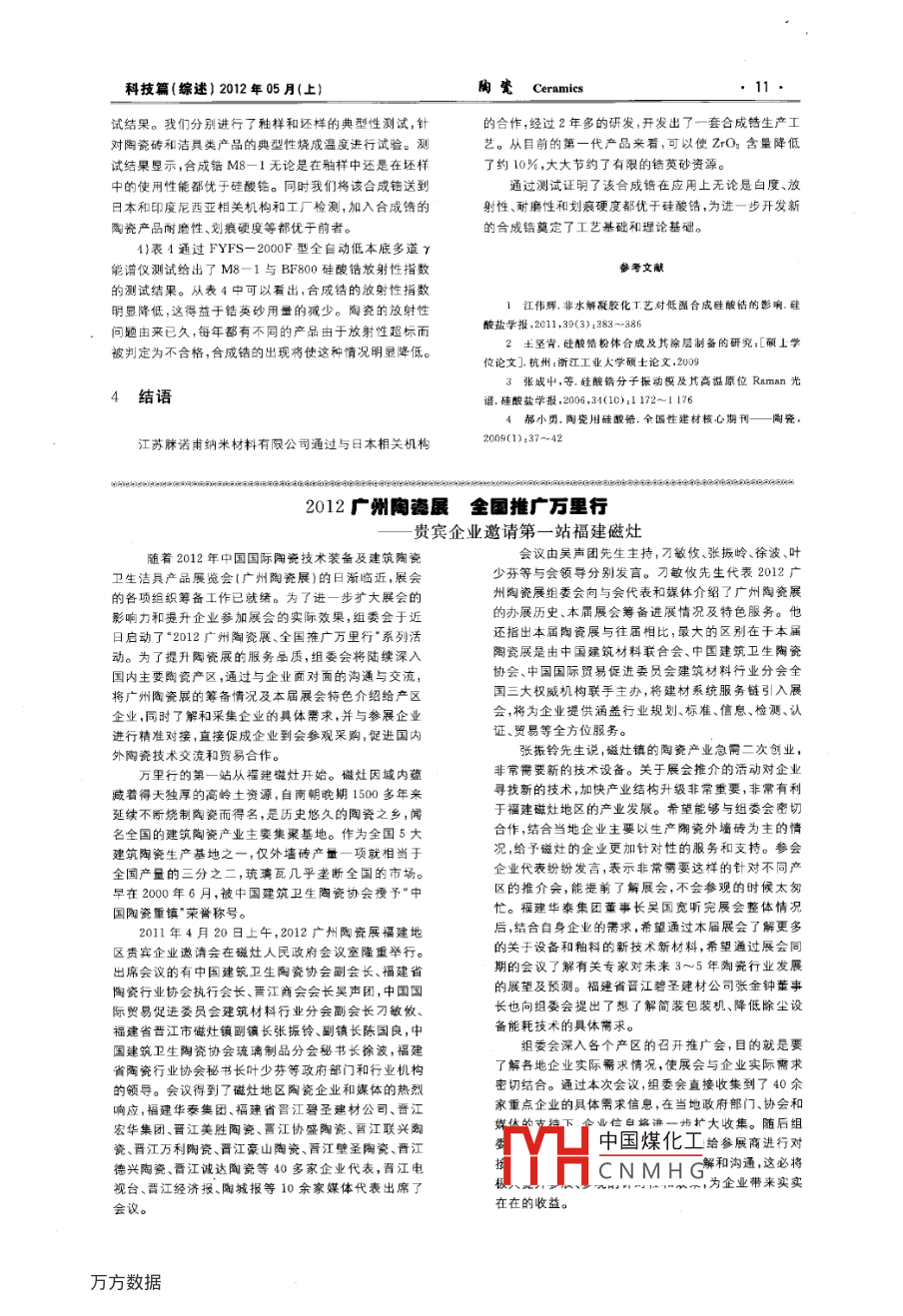 科技篇(綜述) 2012年05月(上)陶瓷Ceramics合成鋯簡介郝小勇(江蘇脒諾甫納米材料有限公司江蘇 宜興214221)摘要介紹一種合威鋯的基本工藝?yán)碚摵脱邪l(fā)后產(chǎn)品的性能.指出皓英砂價格上漲與資源緊缺有關(guān),提出開發(fā)合成鋯產(chǎn)品是在資源緊缺的情況下向陶瓷復(fù)合型乳濁劑近出的第一步,為開發(fā)新產(chǎn)品奠定了理論依據(jù)和工藝方法。關(guān)鍵詞合威鋯硅酸鋯鋯英砂中國分類號:TQ174.75文獻(xiàn)標(biāo)識碼:B 文章編號:1002- 2872(2012)05 0009-03硅酸鋯是陶瓷釉料的一種原料,目前在陶瓷制品中換來的卻是瓷磚質(zhì)量的下降,特別是產(chǎn)品的白度和耐磨特別是建筑衛(wèi)生陶瓷中也常作為一種坯用原料來應(yīng)用。性方面都不可能和原來相媲美。硅酸鋯在陶瓷坯體中的主要作用在于可以起到增白效果30002230 100和提高陶瓷坯體的耐磨性;陶瓷釉料中使用硅酸鋯主要2500750 1950使釉i面乳濁增白同時也可使釉面的耐磨性、劃痕硬度等2000■價格(美元)1500 1160性能得到提高。硅酸鋯主要有以下2種方法制成:1000851)目前普遍使用的一種方法,是用鋯英砂通過研磨制成。這是一種純物理的制成方法,采用該方法制成的硅酸鋯普遍適用于現(xiàn)代陶瓷工業(yè),-般用此方法制成的硅酸鋯的顆粒粒度為1~10 μm,其中含有一定量的圈22010 年進(jìn)口鋯英砂價格走勢圈(不含關(guān)稅和增值稅)FerOs、TiOz和Al2O,。為了解決陶瓷企業(yè)的難題,也為了是我國的硅酸鋯2)化學(xué)合成方法。這種方法是以工業(yè)純無水產(chǎn)品能夠健康順利的發(fā)展,緩解目前我國對國外鋯英砂ZrCL、正硅酸乙酯(Si(OC,Hs),)為前驅(qū)體,LiF為礦化過分依賴的局面,筆者對硅酸鋯的乳濁增白原理方面進(jìn)劑,通過非水解溶膠一凝膠法低溫合成出硅酸鋯粉體"行了研究,通過試驗開發(fā)出一套合成鋯工藝技術(shù)并用于或者利用水/壬基酚聚氧乙烯醚(triton x- 10)/環(huán)2烷生產(chǎn)。研發(fā)的初級產(chǎn)品通過在幾家有影響力的陶瓷企業(yè)所形成的W/O型微乳液獲得了ZrSiO, 前驅(qū)體,通過高試驗,效果良好。我們將繼續(xù)開發(fā)新的第二代和第三代溫?zé)Y(jié)獲得硅酸鋯粉體[”。化學(xué)合成方法制成的硅酸鋯合成鋯產(chǎn)品,使鋯英砂的用量不斷降低,同時進(jìn)-步提高粉體比表面積大,顆粒粒徑較小,一般在0.5 pm左右,其乳濁增白性能、耐磨度和硬度,為陶瓷企業(yè)提供價廉物主要應(yīng)用于金屬材料在腐蝕環(huán)境中的表面保護(hù)等方面。美的產(chǎn)品。我國現(xiàn)使用的硅酸鋯主要為第-種方法制備的硅酸鋯,主要用于建筑衛(wèi)生陶瓷工業(yè)。2010年全國建筑衛(wèi)生陶1合 成鋯的基本原理瓷使用硅酸鋯和錯英粉已達(dá)到42萬t左右,基本上占鋯英砂全年進(jìn)口量的70%。因此,建筑衛(wèi)生陶瓷已成為硅1.1 硅酸錯的結(jié)構(gòu)酸鋯的最大用戶。圖1為國內(nèi)鋯英砂在各個行業(yè)的應(yīng)用分布圖。O原 子Sio,四面體42口陶黨附火材料■化學(xué)情國轉(zhuǎn)快,其它口金屬館圈1國內(nèi)錯英砂應(yīng)用情況分布園圖3 ZrSiO,的晶體結(jié)構(gòu)2010年下半年以來,由于國外原材料鋯英砂進(jìn)口價ZrSiO, 晶體屬于單斜晶系,空間群為141/amd,ao =格的不斷上漲,硅酸鋯價格-路飆升(見圖 2),幾乎使陶bo=6. 604 2 nm,co= 5.9796 nm,a=β=γ=90°,-一個晶瓷企業(yè)無以應(yīng)對。因此,陶瓷企業(yè)只能改變配方或者用體結(jié)構(gòu)如圖3所優(yōu)質(zhì)白土來進(jìn)行部分替代使用,以降低生產(chǎn)成本。但不示。中國煤化工,]四面體:而Zz能從根本上解決,只能起到暫時性的降低成本的作用,而為:rYHC N M H G構(gòu)中[SiO,]四面.作者簡介:都小勇(1968-),本科,教授級高級工程師,主要從事氮化硅結(jié) 合碳化硅材料的研究.陶瓷Ceramies科技篇(綜述) 2012年05月(上)體沒有相互連接,而是被[ZrO,]+二面體分割包圍形成表2 M8-1 與BF800硅酸鉛粒度分析測試島狀結(jié)構(gòu)。[SiO,]四面體的孤立島狀性質(zhì)非常穩(wěn)定,Zr-禪品D50D90D(4.3)SiO,經(jīng)歷射線輻射和高溫退火后[SiO.]四面體也不發(fā)M8-1.117 .2.7941. 613生聚合。因此,ZrSiO,被認(rèn)為是島狀結(jié)構(gòu)正硅酸鹽的典BF-8001.7174. 2472. 122型代表。白度差的測試方法:1.2 物理破碎的局限性坯樣:由各公司提供或用戶提供坯粉,加入10%硅1.2.1從破碎機(jī)理 上分析鋯英砂顆粒粒徑為80~120目,以平均100目(165酸鋯壓制成直徑為50 mm試樣燒成后對比測試。釉樣:使用江蘇拜畜科技有限公司透明熔塊釉um)計算,一個鋯英砂顆粒大約由25 000個硅酸鋯品體BF264加入10%硅酸錯,使用意大利拉釉器均勾拉釉燒組成,顆粒.上存在微小的裂紋,但聚集的小集團(tuán)硅酸鋯晶體結(jié)合緊密,在通過粗碎以后,顆粒上的裂紋不斷減少,成后進(jìn)行測試。當(dāng)顆粒破碎到小集團(tuán)晶體直徑時,破碎功成幾何倍數(shù)增釉片色度值測試采用北京產(chǎn)的全自動白度計。測量儀器使用FYFS- 2000F 型全自動低本底多道加。根據(jù)經(jīng)驗和試驗數(shù)據(jù),雖然不同產(chǎn)地的鋯英砂結(jié)合程度路有不同,但這種小集團(tuán)的直徑一般為1.0~1.2γ能譜儀。表3 M8-1與BF800硅酸錯色度、白度測試μm,即150個硅酸鋯晶體結(jié)合在-起的直徑長度。1.2.2從乳濁機(jī)理 上分析釉樣測試參數(shù)1(1115 C燒成)硅酸錯的乳濁是菲硅酸鋯顆粒對光的折射來實現(xiàn)樣