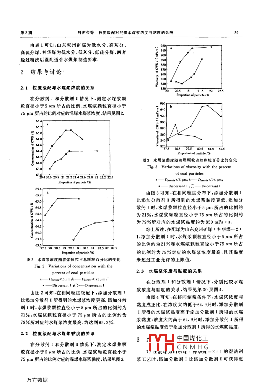 第31卷第2期煤炭轉(zhuǎn)化l.31No.22008年4月COAL CONVERSIONApr.2008粒度級(jí)配對(duì)混煤水煤漿濃度與黏度的影響葉向榮1)劉定平2)陳其中3)蔡泓銘1摘要水煤漿濃度與黏度是衡量水煤漿性能的兩個(gè)重要指標(biāo).粒度級(jí)配是影響水煤漿性能的關(guān)鍵因素,合適的粒度級(jí)配可提高水煤漿性能.以某水煤漿廠所用的精煤和分散劑為實(shí)驗(yàn)基礎(chǔ)研究了在該水煤漿廠常用的混配煤和兩種常用的分散劑條件下,粒度級(jí)配和水煤漿濃度、黏度的關(guān)系,獲得了使用不同分散劑時(shí)水煤漿性能最佳時(shí)所對(duì)應(yīng)的粒度級(jí)配關(guān)鍵詞水煤漿,粒度級(jí)配,濃度,黏度中圖分類號(hào)TQ517.4分散劑I.工藝流程見圖1.0引言Caal k vibratingbucketfeederhlt鬥crus水煤漿CwS( coal water slurry)是煤粉碎成一定粒徑分布的顆粒后,與水、添加劑按比例混合制成高濃度的煤、水分散體系.水煤漿可作為代替石油的液體distributor feedingbunker燃料和化工原料.在水煤漿的制備中,要求工業(yè)所制水Vibration煤漿的濃度大于60%黏度小于1200mPa·s.2影sereen響水煤漿濃度與黏度的主要因素有煤的品種、粒度級(jí)配和分散劑等.其中粒度級(jí)配是控制水煤漿性能Cushioningbucket指標(biāo)重要的參數(shù)之一,研究粒度級(jí)配與水煤漿濃度和黏度之間的關(guān)系對(duì)提高水煤漿性能具有重要意義.35本文以某水煤漿廠所用的精煤和分散劑為基礎(chǔ)開展實(shí)驗(yàn),研究了粒度級(jí)配和水煤漿濃度、黏度的viscosity關(guān)系,得出了使用不同分散劑時(shí)水煤漿性能最佳時(shí)所對(duì)應(yīng)的粒度級(jí)配.811實(shí)驗(yàn)部分圖1濕法制漿工藝流程Fig 1 Processes flow wet method manufacture slurry1.1試劑與儀器1.3煤質(zhì)分析實(shí)驗(yàn)試劑有:山東兗州礦煤、神華煤、分散劑I山東兗州礦煤和神華煤的工業(yè)分析結(jié)果見表1和分散劑I;實(shí)驗(yàn)儀器有:哈克 HAKKE550旋轉(zhuǎn)黏表1山東兗州礦煤和神華煤的工業(yè)分析結(jié)果(%")度計(jì)、鹵素快速水分儀HB43和馬爾文2000激光粒Table 1 Proximate analysis of Yanzhou coal度儀and Shenhua coal(%·)A1.2實(shí)驗(yàn)方法Yanzhou co2.5511.750.7233.94實(shí)驗(yàn)采用濕法制漿工藝,制漿配煤為山東兗州中國煤化工0.3733.06礦煤:神華煤=2:1.分散劑分別采用分散劑I和dHCNMHG1)碩士生;2)副教授華南理工大學(xué)電力學(xué)院,510640廣州;3)工程師,茂名熱電廠,525011廣東茂名收稿H期:2007-12-12;修回日期:2008-0108第2期向榮等粒度級(jí)配對(duì)混煤水煤漿濃度與黏度的影響由表1可知,山東兗州礦煤為低水分、高灰分高硫分煤,神華煤為低水分、低灰分、低硫分煤,兩者經(jīng)過精洗后混配適合水煤漿制造要求2結(jié)果與討論2.1粒度級(jí)配與水煤漿濃度的關(guān)系83220521215225Proportion of particle /在分散劑和分散劑I情況下,測(cè)定水煤漿顆粒直徑小于5m所占的比例、水煤漿顆粒直徑小于75μm所占的比例對(duì)應(yīng)的混煤水煤漿濃度,結(jié)果見圖2.65.0578.5795805815825圖3水煤漿黏度隨著煤顆粒占總顆粒百分比的變化Fig 3 Variations of viscosity with the percent6324206208212122142162182224of coal particlesProportion of particle/%Dpartc,<5 um:b--Dpartil <75 umDispersant I iO-Dispersant I654y easy由圖3可知,在相同粒度分布下,添加分散劑I比添加分散劑I所得到的水煤漿黏度更低.添加分散劑I時(shí),水煤漿顆粒直徑小于5μm所占的比例約為21%水煤漿顆粒直徑小于75μm所占的比例約為79%所對(duì)應(yīng)的水煤漿黏度約為850mPa·s綜上所述,在配煤為山東兗州礦煤:神華煤=2:1,添加分散劑I時(shí),水煤漿顆粒直徑小于5m所占的比例約為21%和水煤漿顆粒直徑小于75μm所占775787857979580805885828Proportion of particle/%的比例約為79%對(duì)應(yīng)的水煤漿濃度最高,且其黏度圖2水煤漿濃度隨著煤顆粒占總顆粒百分比的變化未超過工業(yè)允許的上限值Fig 2 Variations of concentration with thepercent of coal particles2.3水煤漿濃度與黏度的關(guān)系Partick<5 um:b--Dparticl,<75 Hmr在分散劑I和分散劑I情況下,分別比較水煤Dispersant 1 :O-Dispersant由圖2可知,在相同粒度級(jí)配下,添加分散劑1漿濃度與黏度的關(guān)系,結(jié)果見第30頁圖比添加分散劑所得到的水煤漿濃度更高.添加分散由圖4可知,在相同制漿條件下,水煤漿濃度與劑I時(shí),水煤漿顆粒直徑小于5pm所占的比例約為黏度成正比在濃度大約低于6.9%時(shí),添加分散劑21%,水煤漿顆粒直徑小于75pm所占的比例約為所得的水煤漿黏度高于添加分散劑1所得的水煤79%所對(duì)應(yīng)的水煤漿濃度最高,約達(dá)到65.2%漿黏度;濃度大約高于64.9%時(shí),添加分散劑I所得的水煤漿黏度低于添加分散劑I所得的水煤漿黏度2.2粒度級(jí)配與水煤漿黏度的關(guān)系在分散劑I和分散劑I情況下,測(cè)定水煤漿顆3ArV凵中國煤化工CNMHG粒直徑小于5pm所占的比例、水煤漿顆粒直徑小于水·們平=2:1的濕法制75m所占的比例對(duì)應(yīng)的混煤水煤漿黏度,結(jié)果見圖3.漿工藝時(shí),添加分散劑I比添加分散劑I可獲得更炭轉(zhuǎn)化小于75pm所占的比例約為79%時(shí),對(duì)應(yīng)的水煤漿濃度最高,約65,2%,達(dá)到工業(yè)應(yīng)用標(biāo)準(zhǔn)在制漿混煤為山東兗州礦煤:神華煤=2的濕法制漿工藝時(shí),添加分散劑I比添加分散劑I可獲得更低的水煤漿黏度.添加分散劑I時(shí),水煤漿顆粒直徑小于5m所占的比例