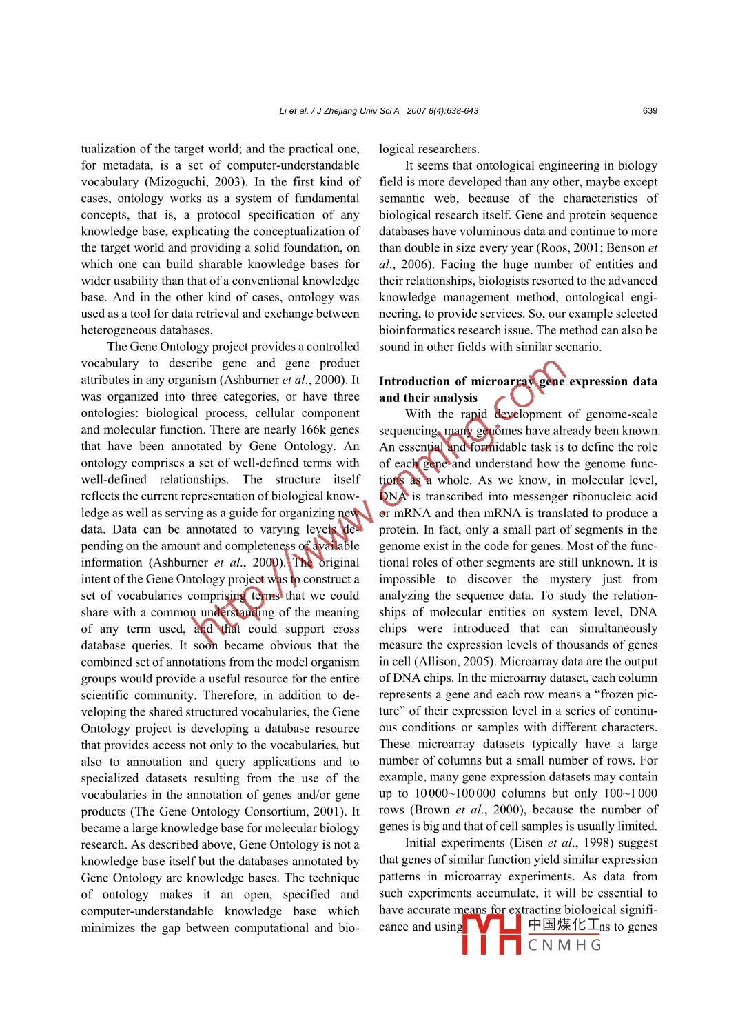 638Liet al./ J Zhejiang Univ SciA 2007 8():638-643Journal of Zhejiang University SCIENCE AISSN 1673 565X (Print); ISSN 1862- 1775 (Online)www.zju.edu.cn/jzus; www.springerlink.comJzusE-mail: jzus@zju.edu.cnClassification analysis of microarray databased on ontological engineeringLI Guo-qi, SHENG Huan-ye(Department of Computer Science and Engineering, Shanghai Jiao Tong University, Shanghai 200240, China)E-mail: liguoqi@sjtu.edu.cnReceived Feb. 11, 2006; revision accepted Sept. 21, 2006Abstract: Background knowledge is important for data mining, especially in complicated situation. Ontological engineering isthe successor of knowledge engineering. The sharable knowledge bases built on ontology can be used to provide backgroundknowledge to direct the process of data mining. This paper gives a common introduction to the method and presents a practicalanalysis example using SVM (support vector machine) as the classifier. Gene Ontology and the accompanying annotationscompose a big knowledge base, on which many researches have been carried out. Microarray dataset is the output of DNA chip.With the help of Gene Ontology we present a more elaborate analysis on microarray data than former researchers. The method canalso be used in other fields with similar scenario.Key words: Ontological engineering, Data mining, Microarray, Support vector machine (SVM)doi: 10.1631/jzus.2007.A0638Document code: ACLC number: TP391INTRODUCTIONthis section, we first present a brief introduction toontology, ontological engineering and its applicationThere is a Chinese saying that“Lessosns learmed in biology, Gene Ontology. Then the background offrom the past can guide one in the future”. With themicroarray gene expression data analysis is described.accumulation of knowledge, data mining is not anFinally, a data mining experiment on microarray dataisolated mission. What we knew should be clear be- based on Gene Ontology is designed and will be de-fore we explore new knowledge. Infrmation tech- scribed in detail in the rest of the paper.nology has been collaborating with traditional indus-tries extensively and deeply, so data mining needsOntological engineering and Gene Ontologyprevious understanding of domain specific knowl-From the computational point of view, Ontologiesedge. The sharable knowledge bases built on ontologyare agreements on shared conceptualizations. Sharedcan be used to provide background knowledgeconceptualizations include conceptual frameworks forautomatically to direct the process of data mining. Inmodeling domain knowledge, content- specific proto-the field of bioinformatics, Gene Ontology and thecols for communication among inter-operating agents,annotations compose a big knowledge base, on which and agreements on the representation of particularmany researches have been carried out. Microarray domain theories (Gruber, 1995). Ontology is used as .dataset is the output of DNA chip. With the asistance an explication of knowledge or an organizer ofof Gene Ontology we present a more elaboratemetadata. There are two large differences between theanalysis on microarray data than former researches. Inroles of an ontology for knowledge bases and thosefor metadata: one is philosophical and the other is" Project (No. 20040248001) supported by the Ph.D. Programs Foun-practical. The philosophical one is that an ontology,dation of Ministry of Education of Chinafor knowledge中國煤化工he concep-YHCNMH G ..Li et al.1J Zhejiang Univ SciA 2007 8():638-643639tualization of the target world; and the practical one, logical researchers.for metadata, is a set of computer-understandableIt seems that ontological engineering in biologyvocabulary (Mizoguchi, 2003). In the first kind of field is more developed than any other, maybe exceptcases, ontology works as a system of fundamental semantic web, because of the characteristics ofconcepts, that is, a protocol specification of any biological research itself. Gene and protein sequenceknowledge base, explicating the conceptualization of databases have voluminous data and continue to morethe target world and providing a solid foundation, on than double in size every year (Roos, 2001; Benson etwhich one can build sharable knowledge bases for al, 2006). Facing the huge number of entities andwider usability than that of a conventional knowledge their relationships, biologists resorted to the advancedbase. And in the other kind of cases, ontology was knowledge management method, ontological engi-used as a tool for data retrieval and exchange between neering, to provide services. So, our example selectedheterogeneous databases.bioinformatics research issue. The method can also beThe Gene Ontology project provides a controlled sound in other fields with similar scenario.vocabulary to describe gene and gene productattributes in any organism (Ashburner et al., 2000). It Introduction of microarray gene expression datawas organized into three categories, or have three and their analysisontologies: biological process, cellular componentWith the rapid development of genome-scaleand molecular function. There are nearly 166k genes sequencing, many genomes have already been known.that have been annotated by Gene Ontology. An An essential and formidable task is to define the roleontology comprises a set of well-defined terms with of each gene and understand how the genome func-well-defined relationships. The structure itself tions as a whole. As we know, in molecular level,reflects the current representation of biological know- DNA is transcribed into messenger ribonucleic acidledge as well as serving as a guide for organizing new or mRNA and then mRNA is translated to produce adata. Data can be annotated to varying levels de- protein. In fact, only a small part of segments in thepending on the amount and completeness of available genome exist in the code for genes. Most of the func-information (Ashburner et al, 2000). The original tional roles of other segments are still unknown. It 