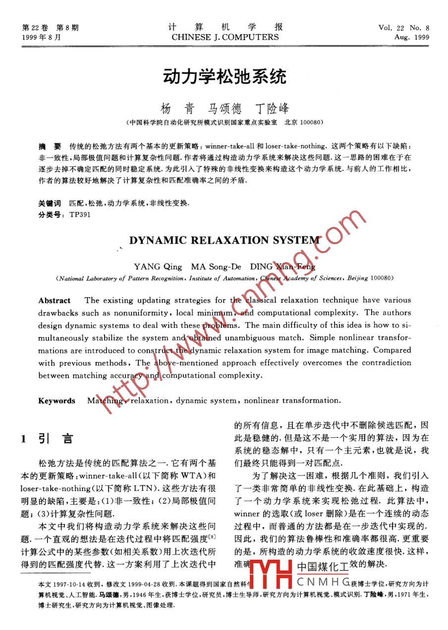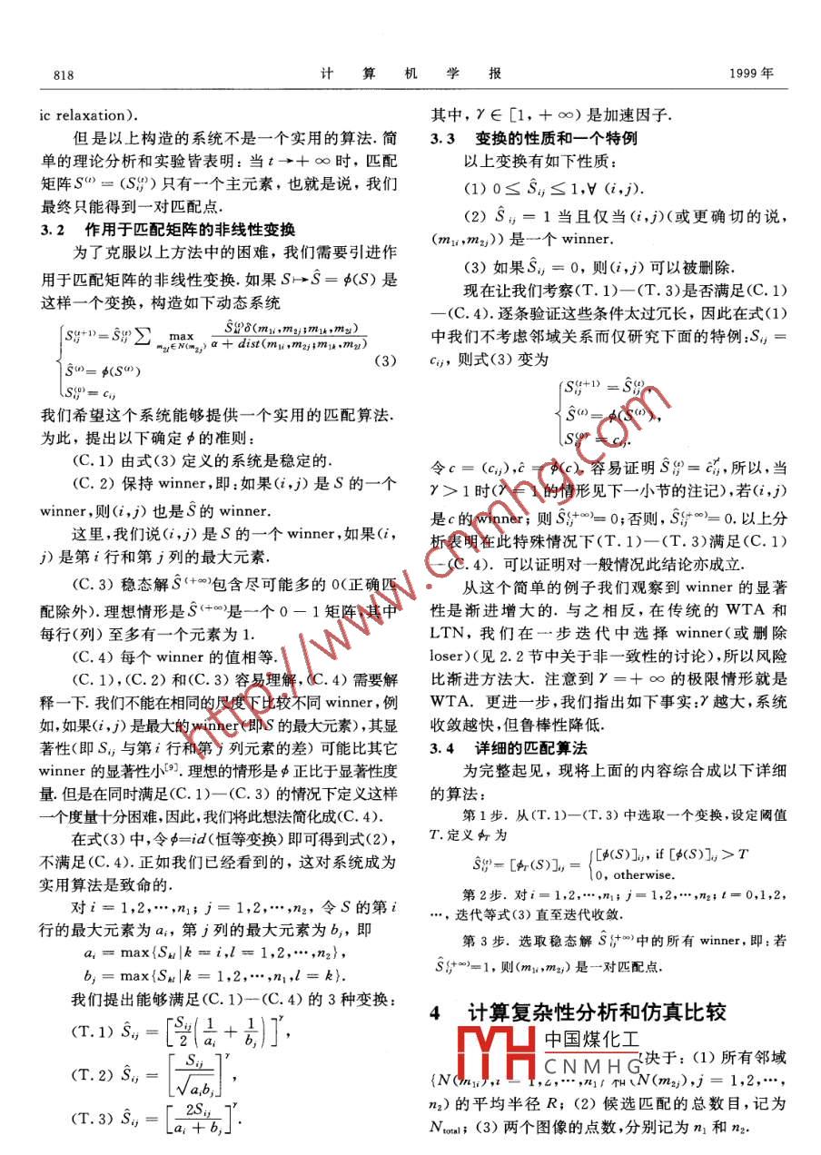 第22卷第8期計(jì)算機(jī)學(xué)報(bào)Vol. 22 No. 81999年8月CHINESE J. COMPUTERSAug.1999動(dòng)力學(xué)松弛系統(tǒng)楊青馬頌德丁險(xiǎn)峰(中國(guó)科學(xué)院自動(dòng)化研究所模式識(shí)別國(guó)家重點(diǎn)實(shí)驗(yàn)室北京100080)摘要傳統(tǒng)的松弛方法有兩個(gè)基本的更新策略: winner-take-al和 loser-take- nothing.這兩個(gè)策略有以下缺陷非一致性,局部極值問(wèn)題和計(jì)算復(fù)雜性問(wèn)題作者將通過(guò)構(gòu)造動(dòng)力學(xué)系統(tǒng)來(lái)解決這些問(wèn)題.這一思路的困難在于在逐步去掉不確定匹配的同時(shí)穩(wěn)定系統(tǒng)為此引入了特殊的非線(xiàn)性變換來(lái)構(gòu)造這個(gè)動(dòng)力學(xué)系統(tǒng).與前人的工作相比,作者的算法較好地解決了計(jì)算復(fù)雜性和匹配準(zhǔn)確率之間的矛盾關(guān)鍵詞匹配,松弛,動(dòng)力學(xué)系統(tǒng),非線(xiàn)性變換分類(lèi)號(hào):TP391DYNAMIC RELAXATION SYSTEMYANG Qing MA Song-De DING Xian-Feng(National Laboratory of Pattern Recognition, Institute of Automation, Chinese Academy of Sciences, Beijing 100080)Abstract The existing updating strategies for the classical relaxation technique have variousdrawbacks such as nonuniformity, local minimum, and computational complexity. The authorsdesign dynamic systems to deal with these problems. The main difficulty of this idea is how to si-multaneously stabilize the system and obtained unambiguous match. Simple nonlinear transformations are introduced to construct the dynamic relaxation system for image matching. Comparedwith previous methods, The above-mentioned approach effectively overcomes the contradictionbetween matching accuracy and computational complexity.Keywords Matching, relaxation, dynamic system, nonlinear transformation的所有信息,且在單步迭代中不刪除候選匹配,因1引言此是穩(wěn)健的.但是這不是一個(gè)實(shí)用的算法,因?yàn)樵谙到y(tǒng)的穩(wěn)態(tài)解中,只有一個(gè)主元素,也就是說(shuō),我松弛方法是傳統(tǒng)的匹配算法之一.它有兩個(gè)基們最終只能得到一對(duì)匹配點(diǎn)本的更新策略: winner-take-l(以下簡(jiǎn)稱(chēng)WTA)和為了解決這一困難,根據(jù)幾個(gè)準(zhǔn)則,我們引入loser-take- nothing(以下簡(jiǎn)稱(chēng)LTN).這些方法有很了一類(lèi)非常簡(jiǎn)單的非線(xiàn)性變換在此基礎(chǔ)上,構(gòu)造明顯的缺陷,主要是:(1)非一致性;(2)局部極值冋了一個(gè)動(dòng)力學(xué)系統(tǒng)來(lái)實(shí)現(xiàn)松弛過(guò)程·此算法中,題;(3)計(jì)算復(fù)雜性問(wèn)題winner的選取(或 loser刪除)是在一個(gè)連續(xù)的動(dòng)態(tài)本文中我們將構(gòu)造動(dòng)力學(xué)系統(tǒng)來(lái)解決這些問(wèn)過(guò)程中,而普通的方法都是在一步迭代中實(shí)現(xiàn)的題.一個(gè)直觀(guān)的想法是在迭代過(guò)程中將匹配強(qiáng)度[9因此,我們的算法魯棒性和準(zhǔn)確率都很高.更重要計(jì)算公式中的某些參數(shù)(如相關(guān)系數(shù))用上次迭代所的是,所構(gòu)造的動(dòng)力學(xué)系統(tǒng)的收斂速度很快.這樣,得到的匹配強(qiáng)度代替這一方案利用了上次迭代中準(zhǔn)確中國(guó)煤化工效的解決本文1997-10-14收到,修改文199904-28收到本課題得到國(guó)家自然科YHCNMHG獲博士學(xué)位,研究方向?yàn)橛?jì)算機(jī)視覺(jué)、人工智能馬頌德,男,1946年生,獲博土學(xué)位,研究員,博士生導(dǎo)師,研究方向?yàn)橛?jì)算機(jī)視覺(jué)、模式識(shí)別丁險(xiǎn)峰,男,1971年生博士研究生,研究方向?yàn)橛?jì)算機(jī)視覺(jué)、圖像處理8期楊青等:動(dòng)力學(xué)松弛系統(tǒng)817如下.每步迭代中,去掉具有最低的匹配強(qiáng)度的候2經(jīng)典的松弛方法選匹配直至得到確定的匹配為止.這是一個(gè)最慢下降方法,計(jì)算復(fù)雜性很高給定左右兩幅圖像中的點(diǎn)集{m1,i=1,2,…,n1}這兩個(gè)更新策略的局限性在于:和{m2,j=1,2,…,n2}.我們的目標(biāo)就是找出這兩個(gè)(1)非一致性,不確定的匹配不是以一種一致點(diǎn)集的匹配關(guān)系.此問(wèn)題的困難在于一幅圖像中的一的方式被去掉的,也就是說(shuō),某些點(diǎn)的候選匹配數(shù)點(diǎn)在另一圖像中可能有多個(gè)點(diǎn)與之對(duì)應(yīng)(這些可能的目減少速度可能比其它點(diǎn)快得多.這樣一部分點(diǎn)的點(diǎn)對(duì)應(yīng)我們稱(chēng)之為候選匹配),反之亦然.去掉不確定匹配會(huì)被過(guò)早確定下來(lái),如果這些匹配是錯(cuò)誤的的候選匹配算法的種類(lèi)很多,在這一節(jié)里,我們將簡(jiǎn)誤差會(huì)在以后的迭代中傳播、積累,整個(gè)匹配過(guò)程可要介紹經(jīng)典的算法:松弛方法( Relaxation).松弛方能會(huì)因此崩潰,WTA和LTN都不是一致的法亦有多種形式,在此我們只選擇其中較簡(jiǎn)單的一種(2)局部極小問(wèn)題.因?yàn)橄陆邓俣忍?WTA來(lái)闡明基本原理,讀者很容易將其推廣到更一般的問(wèn)過(guò)程可能會(huì)陷入效果很差的局部極小中.故而在很題,如圖匹配( Graph matching)4,多問(wèn)題中,它的匹配準(zhǔn)確率很差2.1候選匹配的匹配強(qiáng)度(3)計(jì)算復(fù)雜性.如果一個(gè)點(diǎn)的候選匹配較首先我們需要為每一對(duì)候選匹配定義匹配強(qiáng)多,LTN的速度可能很慢.理論上講,LTN是一種度.以下定義可以在文獻(xiàn)[9]中找到.考察候選匹配最慢下降方法,其準(zhǔn)確率應(yīng)該
