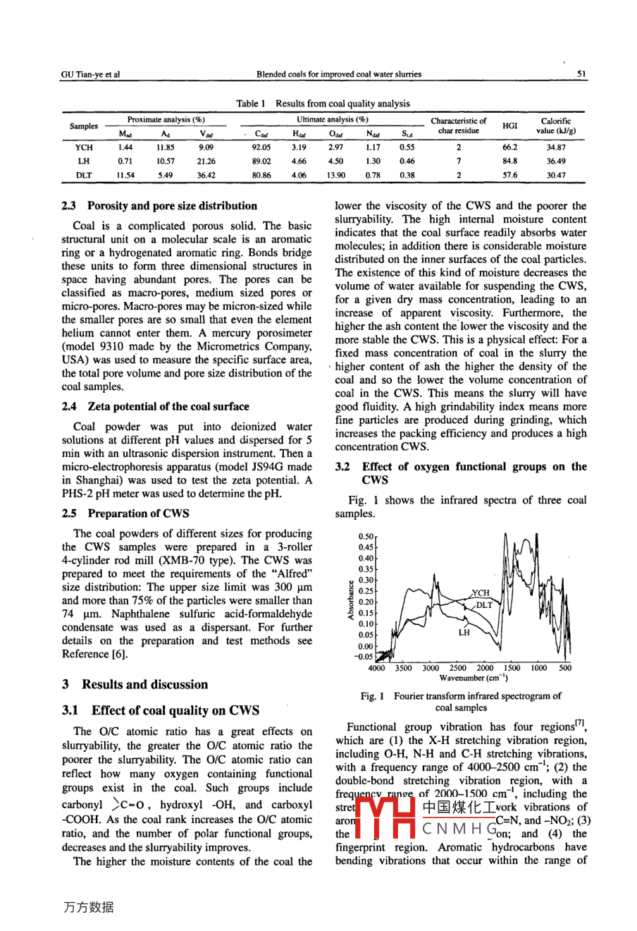 ailableonlineatwww.sciencedirectcomJOURNAL OF CHINA UNIVERSITY OF° Science DirectMININGTECHNOLOGYELSEVIERJ China Univ Mining& Technol 18(2008)00S0-0054www.elsevier.com/locate/jcurBlended coals for improved coal water slurriesGUTian-ye, WU Guo-guang, LI Qi-hui, SUN Zhi-qiang, ZENG Fang,WANG Guang-you, MENG Xian-liangSchool of Chemical Engineering and Technology, China University of Mining Technology, Xuzhou, Jiangsu 221008, ChinaAbstract: Three coal samples of different ranks were used to study the effect of coal blending on the preparation of Coal WaterSlurry(CWS). The results show that by taking advantage of two kinds of coal, the coal concentration in slurry made fromhard-to-pulp coal can be effectively improved and increased by 3%-5% generally DLT coal( DaLiuTa coal mine)is veryslurryability and the stability and rheology of the resulting slurry are not very good. when the amount of easily slurried coalhan 30%, all properties of the CwS improve and the Cws meets the requirements for use as fuel. Coalification, porosity,Ker.e difference &roups, zeta potential and grindability have a great effect on the performance of blended coal CwS.This leadsoxygenic functionaperformance between theslurry made from a single coal and slurry made from blended coalwords: low rank coal; coal water slurry; coal blending; slurryability; zeta potential1 Introductionand can help realize the complementary advantagesof the different coals being blendedCoal Water Slurry(CwS) is a newly developed,Many, including the authors, have investigated howcoal-based clean liquid fuel for replacing oil by coal. CWS of high coal concentration, low viscosity andCwS can be used in many industrial boilers, good fluidity can be produced from hard to slurryindustrial furnaces or the boilers of thermal power coals2-. We have studied the effect of low rank coalplants. Coal accounts for a large proportion of the blending on the property of a cws to address thiscost of CWS and the slurry forming properties of a problem.particular coal also have a great effect on production2 ExperimentalThe medium rank bituminous coal usedoke-making is not abundant in China. Long-flame2.1 Coal samplescoal and non-caking coal account for a largeThree coal samples of different ranks were chosenproportion of the steam coals, so brown coal, low for the experiment: a non-caking coal from Daliutarank bituminous coal and anthracite are used for (DLT), a coking coal from Linhuan (LH)and anpower generation". Both brown coal and long-flame anthracite from Yongcheng(YCH). Table I shows thecoal are low rank, high volatiles and have a low results of coal quality analysis on these coalsignition point. But these coals also have a highmoisture content and poor grindability, which makes 2.2 Infrared spectra of the samplesit hard to form highly concentrated CWS: they are One mg of coal(<300 mesh, dried at 105-110 C)hard to slurry and low in calorific value. Anthracite and 100 mg of potassium bromide were put into anhas low moisture, good grindability and high calorific agate mortar, mixed, ground and pressed into a pellet:value, but a low volatiles content and correspondingly A Fourier transform infrared spectrometer(Nexushigh ignition point make this a difficult coal to burn. 470(from Nicolet, USA)was used to measure theUsing a coal blending method can improve the infrared spectrum of each sample. The wavelengthslurryability of those coals that are hard to slurry. range was 4000-400 cm", the resolutionCoal blending is simple in operation and low in cost cm中國(guó)煤化工Received 15 July 2007: accepted 13 December 20n7CNMHGProjects 20060290506 supported by the Doctoral Foundation of the Chinese Educa灬… u VivAce and TechnologyFoundation of China University of Mining TechnologyCorrespondingauthor:Tel:+86-516-83591053:E-mailaddress:ggwu@cumt.edu.cnBlended coals for improved coal water slurrieschar residueHGIalue(ug)YCH 1. 4419297117450DLT145493642808640613900780385762.3 Porosity and pore size distributioof the cws and thCoal is a complicated porous solid. The basicslurryability. The high internal moisture contentstructural unit on a molecular scale is an aromaticindicates that the coal surface readily absorbs waterring or a hydrogenated aromatic ring. Bonds bridge distributed on the inner surfaces of the coal particlesthese units to form three dimensional structures in The existence of this kind of moisture decreases theporespores canclassified as macro-pores, medium sized pores orvolume of water available for suspending the CwSmicro-pores Macro-pores may be micron-sized whilefor a given dry mass concentration, leading to anncrease of apparent viscosity. Furthermore, thethe smaller pores are so small that even the element higher the ash content the lower the viscosity and thehelium cannot enter them. A mercury porosimeter more stable the CWS. This is a physical effect: For a(model 9310 made by the Micrometrics Company,fixed mass concentration of coal in the slurry theUSA)was used to measure the specific surface area,. higher content of ash the higher the density of thethe total pore volume and pore size distribution ofcoal samples.coal and so the lower the volume concentration ofcoal in the CwS. This means the slurry will have2. 4 Zeta potential of the coal surfacegood fluidity. a high grindability index means moreCoal powder was put into deionized waterfine particles are produced during grinding, whichsolutions at different pH values and dispersed for 5increases the packing efficiency and produces a highoncentration cwsmin with an ultrasonic dispersion instrument. Then amicro-electrophoresis apparatus(model JS94G made 3.2 Effect of oxygen functional groups on thein Shanghai) was used to test the zeta potential. ACWSPHS-2 pH meter was used to determine the pHig. 1 shows the infrared spectra of three coal2.5 Preparation of CwSsamplesThe coal powders of different sizes for pre50he Cws samples were prepared in a 3-roller0.454-cylinder rod mill(XMB-70 type). The C