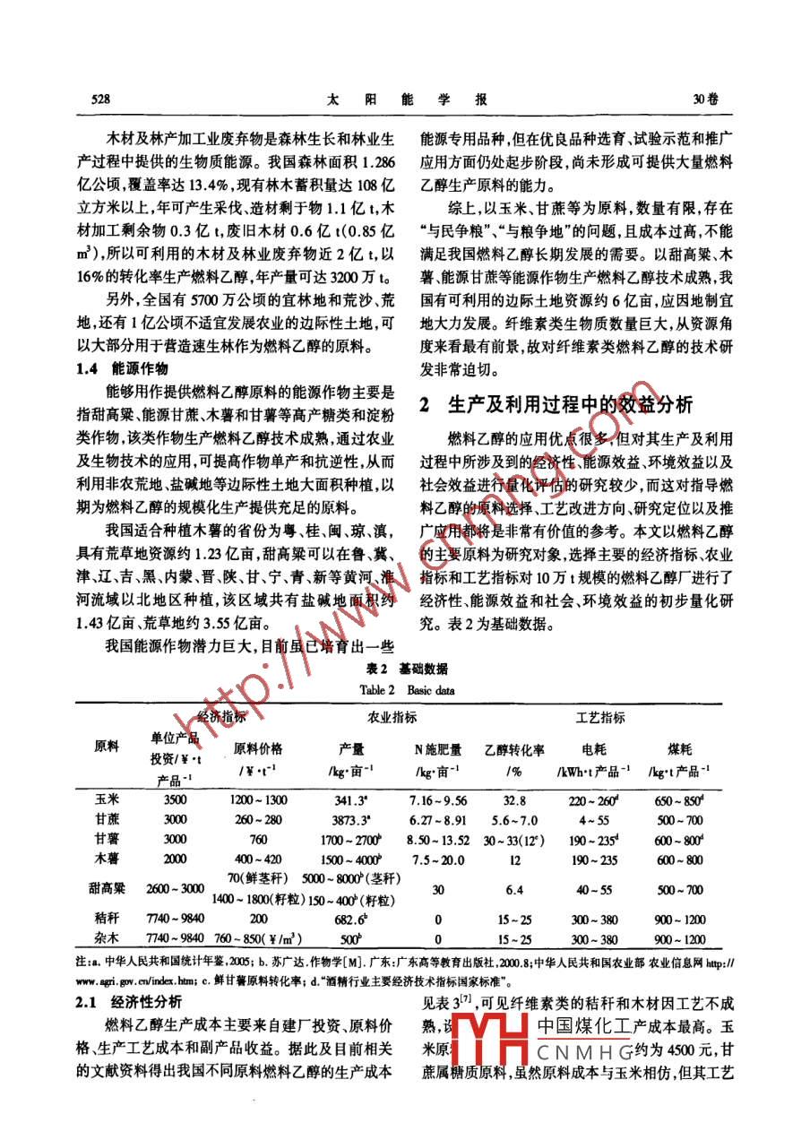 第30卷第4期太陽能學(xué)報Vol 30, No 4200年4月ACTA ENERGIAE SOLARIS SINICAApr.,2009文章編號:0254006(2009)04052606中國燃料乙醇的應(yīng)用及生產(chǎn)技術(shù)的效益分析與評價莊新姝,袁振宏,孫永明,許敬亮,吳創(chuàng)之,馬隆龍(中國科學(xué)院廣州能源研究所,中國科學(xué)院可再生能源與天然氣水合物重點(diǎn)實(shí)驗(yàn)室,廣州510640)摘要:針對國內(nèi)外燃料乙醇的應(yīng)用和發(fā)展情況,對比分析了淀粉質(zhì)糖質(zhì)和纖維素類原料燃料乙醇生產(chǎn)工藝的異同,并對我國3種原料的資源狀況進(jìn)行了評價。以10萬va的燃料乙醇工廠為例,對不同原料燃料乙醇生產(chǎn)工藝的經(jīng)濟(jì)性能源效益和社會效益進(jìn)行了對比分析發(fā)現(xiàn)甜高梁和木薯最有經(jīng)濟(jì)優(yōu)勢;從能源效益分析可知生產(chǎn)工藝能耗約占80%,工藝改進(jìn)非常重要;從單位土地能源凈產(chǎn)出情況看甜高梁最高,其次是甘蔗和木薯可見能源作物具有開發(fā)潛力;通過社會效益分析,10萬t燃料乙醇工廠會給農(nóng)民帶來2~4億元的年收益提供約100個的就業(yè)崗位;且10萬t燃料乙醇的應(yīng)用C2年減排量可達(dá)30萬t以上,減排CO、CH等汽車有害污染物近1700關(guān)鍵詞:燃料乙醇;經(jīng)濟(jì)性;能源效益;社會效益;評價中圖分類號:TK6文獻(xiàn)標(biāo)識碼:A引言我國政府非常重視可再生液體燃料產(chǎn)業(yè)的發(fā)展,國家“十一五發(fā)展規(guī)劃”中已將燃料乙醇確定為燃料乙醇做為當(dāng)前最直接最有效的石油基液體優(yōu)先發(fā)展技術(shù)。《可再生能源中長期發(fā)展規(guī)劃》明確燃料替代品其應(yīng)用可有效減排CO2及城市車輛的提出發(fā)展目標(biāo)到2010年,生物質(zhì)液體燃料達(dá)到200尾氣污染已正在世界范圍內(nèi)推廣應(yīng)用2。萬t,到20年,達(dá)到1000萬t,生物質(zhì)能年利用量占據(jù) Campbell和 Laherrere的估算,全球原油產(chǎn)量將到一次能源消費(fèi)量的4%。于2010年前出現(xiàn)供不應(yīng)求的狀況,至2050年產(chǎn)量將會從現(xiàn)在的25×10桶減至5×10桶。我國人均可開采石油資源量為世界平均水平12%,自1993年1000成為石油凈進(jìn)口國,進(jìn)口量逐年增加(見圖1),2006年進(jìn)口原油已達(dá)1.38億t對外依存度高達(dá)47%。據(jù)國際能源署(EA)等權(quán)威機(jī)構(gòu)預(yù)測:2010年和2000200年中國的石油產(chǎn)量將會分別在15-1.87億t199619982000200220042006和135~220億t之間,而同期的石油需求量將分別達(dá)到335~368億t和4.30~5.50億t,如果沒有2006年中國石油進(jìn)口量有效的替代能源措施,2010和200年石油對外依存port from 1997 to 2006 in China度將分別增長到61%和769%,我國液體燃料安全2006年世界燃料乙醇的年產(chǎn)量已近3000萬t,將面臨嚴(yán)峻考驗(yàn)其中巴西和美國是世界上燃料乙醇最大的生產(chǎn)和消另外,在我國大城市污染物中,40%以上的費(fèi)國。我國在200年四大國有燃料乙醇生產(chǎn)企業(yè)NO,80%以上的CO和70%以上的H化合物均來規(guī)劃建設(shè)的10萬t已全部達(dá)產(chǎn),以0%摻混的乙自于汽車尾氣“,百萬人口以上城市的大氣污染正醇汽油(E0占全國汽油消費(fèi)量的20%,燃料乙醇的由第一代煤煙型向第二代汽車型轉(zhuǎn)化。年產(chǎn)量居世界第3位20070828中國煤化工中國科學(xué)院知識創(chuàng)新工程重大項(xiàng)目(KCX1-YW-1.3);國家高劃項(xiàng)目(20080006)CNMHG4廣東省科技通訊作者:震振宏(1953-),男博士、研究員博士生導(dǎo)師主要從事生物質(zhì)液體燃料制備及生物質(zhì)能源戰(zhàn)略方面的研究。yu@m4期莊新妹等:中國燃料乙醇的應(yīng)用及生產(chǎn)技術(shù)的效益分析與評價527本文在總結(jié)不同原料燃料乙醇在我國應(yīng)用的基11淀粉質(zhì)原料礎(chǔ)上對其生產(chǎn)及利用過程中所涉及到的經(jīng)濟(jì)性、能淀粉類原料包括玉米、小麥、甘薯、木薯等谷類源效益、環(huán)境效益以及社會效益進(jìn)行了初步的量化和薯類作物其共同特點(diǎn)是淀粉含量高,可通過水解評估,以期為燃料乙醇的原料選擇、工藝改進(jìn)方向、生成糖,進(jìn)而由微生物發(fā)酵獲得乙醇。我國玉米等研究定位以及推廣應(yīng)用等提供有價值的參考。陳化糧約4000萬t,自2001年推廣燃料乙醇以來,基1原料及生產(chǎn)工藝本已消耗殆盡。玉米在我國的主要產(chǎn)區(qū)集中在東北、華北以及燃料乙醇的原料有淀粉質(zhì)原料糖質(zhì)原料和纖山東半島,近10年來平均年產(chǎn)量約12億。一般維素類原料。各種原料生產(chǎn)燃料乙醇的技術(shù)特性對來說68%的玉米用于飼料、13%食用、8%用于工業(yè)比見表1。深加工,每年剩余量為年產(chǎn)量的1%,約1250萬to囊1不同原料燃料乙醇生產(chǎn)工藝技術(shù)特性對比我國薯類主要有甘薯、馬鈴薯、木薯等,川渝地Table 1 Process features comparison of different區(qū)分布較為豐富。除部分食用及用作飼料外,每年feedstocks for fuel ethanol producti約有3500萬t鮮薯可作為釀酒和燃料乙醇原料種類淀粉類纖維素類綜上,淀粉類原料的極限供應(yīng)量約為1500萬t,粉碎、蒸煮、按照30%的轉(zhuǎn)化率,其燃料乙醇產(chǎn)量只能維持當(dāng)前預(yù)處理糊化壓榨調(diào)背粉碎物理或化學(xué)處理我國汽油消費(fèi)水平下全部摻混10%乙醇汽油的供酸或酶糖化,酸或纖維素酶,應(yīng),即500萬t乙醇。水解易