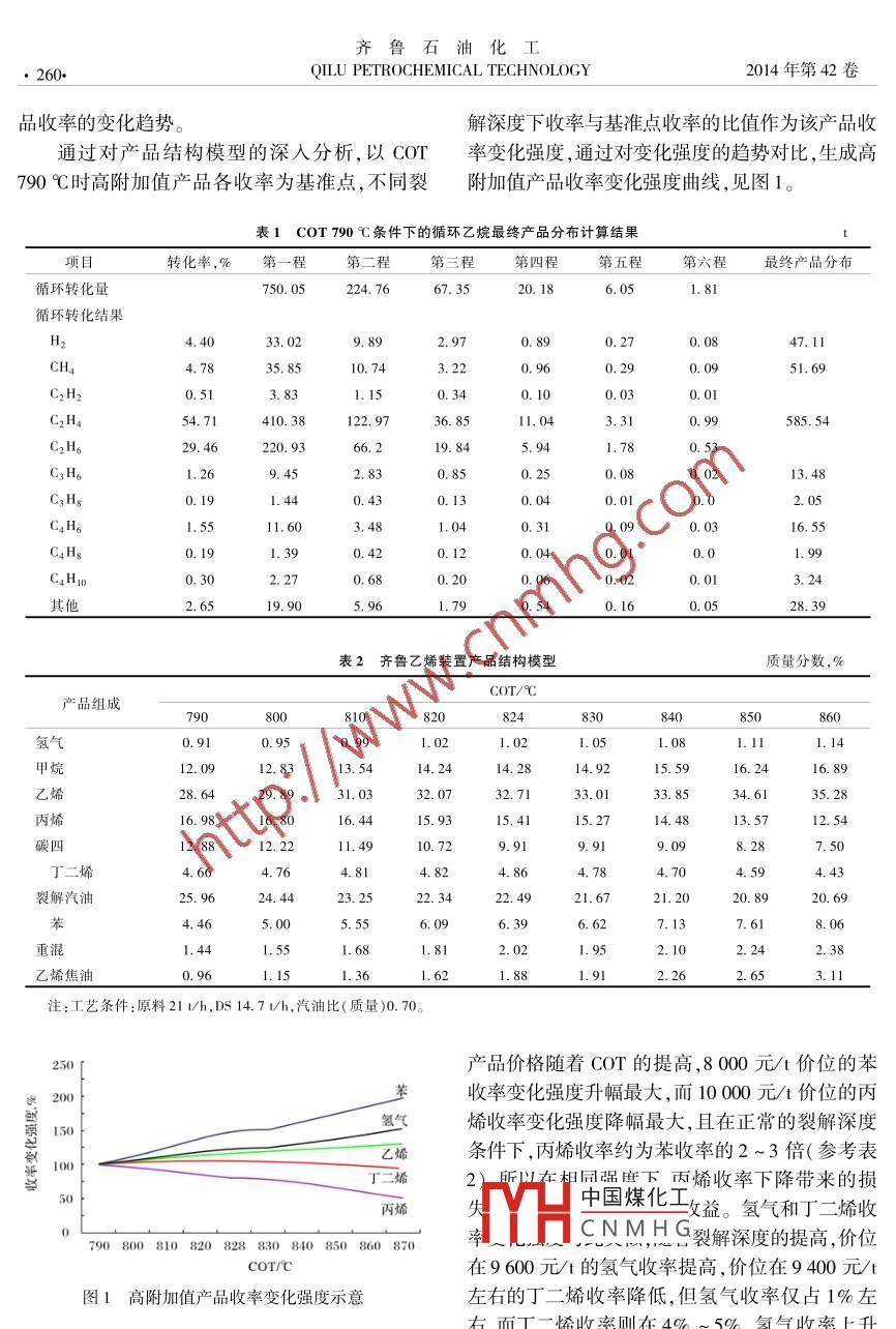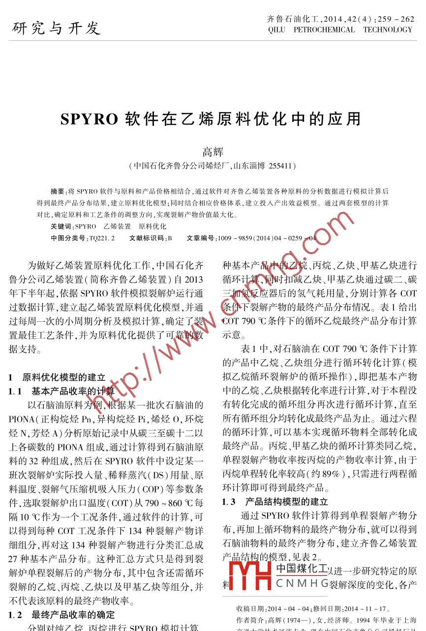 齊魯石油化工,2014,42(4) :259 - 262研究與開發(fā)QILU PETROCHEMICAL TECHNOLOGYSPYRO軟件在乙烯原料優(yōu)化中的應用高輝(中國石化齊魯分公司烯烴廠,山東淄博255411)摘要:將SPYR0軟件與原料和產(chǎn)品價格相結合,通過軟件對齊魯乙烯裝置各種原料的分析數(shù)據(jù)進行模擬計算后得到最終產(chǎn)品分布結果,建立原料優(yōu)化模型;同時結合相應價格體系,建立投入產(chǎn)出效益模型。通過兩套模型的計算對比,確定原料和工藝條件的調(diào)整方向,實現(xiàn)裂解產(chǎn)物價值最大化。關鍵詞:SPYRO乙烯裝置 原料優(yōu)化中圖分類號:TQ221. 2文獻標識碼:B文章編號:1009 - 9859(2014 )04 -0259 -04.為做好乙烯裝置原料優(yōu)化工作,中國石化齊種基本產(chǎn)品中的乙烷、丙烷、乙炔、甲基乙炔進行魯分公司乙烯裝置(簡稱齊魯乙烯裝置)自2013循環(huán)計算,同時扣減乙炔、甲基乙炔通過碳二、碳年下半年起,依據(jù)SPYR0軟件模擬裂解爐運行通三加氫反應器后的氫氣耗用量,分別計算各COT過數(shù)據(jù)計算,建立起乙烯裝置原料優(yōu)化模型,并通條件下裂解產(chǎn)物的最終產(chǎn)品分布情況。表1給出過每周一次的小周期分析及模擬計算,確定了裝COT 790 C條件下的循環(huán)乙烷最終產(chǎn)品分布計算置最佳工藝條件,并為原料優(yōu)化提供了可靠的數(shù)示意。據(jù)支持。表1中,對石腦油在COT 790 C條件下計算的產(chǎn)品中乙烷、乙炔組分進行循環(huán)轉化計算(模原料優(yōu)化模型的建立擬乙烷循環(huán)裂解爐的循環(huán)操作),即把基本產(chǎn)物1.1 基本產(chǎn)品收率的計算中的乙烷、乙炔根據(jù)轉化率進行計算,對于本程沒以石腦油原料為例,根據(jù)某一批次石腦油的有轉化完成的循環(huán)組分再次進行循環(huán)計算,直至PI0NA(正構烷烴Pn,異構烷烴Pi,烯烴0,環(huán)烷所有循環(huán)組分均轉化成最終產(chǎn)品為止。通過六程烴N,芳烴A)分析原始記錄中從碳三至碳十二以的循環(huán)計算,可以基本實現(xiàn)循環(huán)物料全部轉化成上各碳數(shù)的PIONA組成,通過計算得到石腦油原最終產(chǎn)品。丙烷、甲基乙炔的循環(huán)計算類同乙烷,料的32種組成,然后在SPYRO軟件中設定某一單程 裂解產(chǎn)物收率按丙烷的產(chǎn)物收率計算,由于班次裂解爐實際投人量、稀釋蒸汽(DS)用量、原丙烷單程轉化率較高(約89%),只需進行兩程循料溫度、裂解氣壓縮機吸人壓力(COP)等參數(shù)條環(huán)計算即可得到最終產(chǎn)品。件,選取裂解爐出口溫度(COT)從790~860C每1.3 產(chǎn)品結構模型的建立隔10 C作為一個工況條件,通過軟件的計算,可通過SPYR0軟件計算得到單程裂解產(chǎn)物分以得到每種Cor工況條件下134 種裂解產(chǎn)物詳布 ,再加上循環(huán)物料的最終產(chǎn)物分布,就可以得到細組分,再對這134種裂解產(chǎn)物進行分類匯總成石腦油物料的最終產(chǎn)物分布,建立齊魯乙烯裝置27種基本產(chǎn)品分布。這種匯總方式只是得到裂產(chǎn)品結構的模型.見表2。解爐單程裂解后的產(chǎn)物分布,其中包含還需循環(huán)中國煤化工進一-步研究特定的原裂解的乙烷、丙烷、乙炔以及甲基乙炔等組分,并YHC N M H G裂解深度的變化,各產(chǎn)不代表該原料的最終產(chǎn)物收率。收稿日期:2014 -04 -04;修回日期:2014-11-17。1.2最終產(chǎn)品收率的確定作者簡介:高輝(1974一),女,經(jīng)濟師。1994 年畢業(yè)于上海分別對純乙烷、丙烷進行SPYRO模擬計算,交通大學技術經(jīng)濟專業(yè),現(xiàn)在中國石化齊魯分公司烯烴廠從得到循環(huán)乙烷、循環(huán)丙烷的裂解產(chǎn)物收率,將27事統(tǒng)計管理工作。電話:0533 -7522309齊魯石油化工●260+QILU PETROCHEMICAL TECHNOL0GY2014年第42卷品收率的變化趨勢。解深度下收率與基準點收率的比值作為該產(chǎn)品收通過對產(chǎn)品結構模型的深人分析,以COT率變化強度,通過對變化強度的趨勢對比,生成高790 C時高附加值產(chǎn)品各收率為基準點,不同裂附加值產(chǎn)品收率變化強度曲線,見圖1。表1 COT 790 C條件下的循環(huán)乙烷最終產(chǎn)品分布計算結果項目轉化率,%第一程第二程第三程第四程第五程第六程最終產(chǎn)品分布循環(huán)轉化量750. 05224. 7667.3520. 186.051. 81循環(huán)轉化結果H24.4033. 029. 892.970.89.0.270.0847.11CH44.7835.8510. 743. 220.960.290. 0951. 69C2H20.513. 831.150.340.100.030.01C2H454. 71410. 38122. 9736.8511. 043.310.99585. 54C2H。29. 46220. 9366.219. 841.780. 53C3H6 .1.269. 452.830.850.250.0213.48C3Hg0.191.44.0.430.130.040.02. 05C4H。1.5511.603.481.040. 310.0916.55C4Hg0. 191.390.420.120. 041. 99C,H0.302.270.680.200. 06. 023. 24其他2.6519. 905.961.790.540.16.0. 0528. 39表2齊魯乙烯裝置產(chǎn) 品結構模型質(zhì)量分數(shù),%COT/C產(chǎn)品組成790800810820824830840850860氫氣0.910. 951. 021.021.051. 081.111.14甲烷12. 09.12. 8313.5414.2414.2814. 9215.5916. 2416.89乙烯28.6429. 8931. 0332. 0732. 7133.034.6135.28丙烯16. 9816. 8016.4415. 9315.4115.2714. 4813.5712. 54碳四12. 8812. 2211. 4910.729.919.098.287.50丁二烯4.664.764.814. 824.864. 704.594. 43裂解汽油25. 9624.4423. 2522.4921.6721.2020. 8920. 69苯4.465.005. 556.09.6.396.627.137.618.06重混1.441. 551.682.021.952. 102.242.38乙烯焦油0. 961. 361.621.881.912. 262. 653. 11注:工藝條件:原料21 l/h, DS 14. 7l/h,汽油比(質(zhì)量)0.70。250產(chǎn)品價格隨著COT的提高,8000元/t價位的苯200苤收率變化強度升幅最大,而10 000元/t價位的丙烯收率變化強度降幅最大,