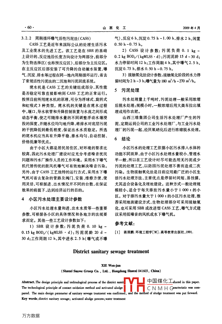 第29卷第2期山西化工Vol.29 No.22009年4月SHANXI CHEMICAL INDUSTRYApr.20092環(huán)境保護(hù)小區(qū)生活污水處理解文軍(山西三維集團(tuán)股份有限公司,山西洪洞 041603)摘要:介紹了小區(qū)生活污水處理廠的設(shè)計(jì)原則和工藝流程,分析了接觸氧化法和活性污泥法的工藝原理,比較了SBR和CASS各自的特點(diǎn),確定了小區(qū)生活污水處理的主要設(shè)計(jì)參數(shù),提出了污泥處理方法。關(guān)鍵詞:小區(qū)生活污水;活性污泥法;水處理中圖分類號:X703文獻(xiàn)標(biāo)識碼:A 文章 編號:1004-7050( 2009)02-0058-03筑環(huán)境相協(xié)調(diào),力求美觀。引言3)在污水處理工藝上力求簡單實(shí)用,以方便小區(qū)污水不同于城市污水,城市污水通常包括管理。部分工業(yè)廢水,而小區(qū)污水則屬于生活污水范疇。4)在高程布置上應(yīng)盡量采用立體布局,充分利其特征為水質(zhì)水量變化較大,污染物濃度偏低(即用地下空間;平面布置上要緊湊,以節(jié)省用地。比城市污水低),污水可生化性良好,處理難度小。5)污水處理廠位置應(yīng)盡可能位于小區(qū)下風(fēng)向,小區(qū)污水處理系統(tǒng)的處理能力,各國并無統(tǒng)-一與其他建筑物保持- -定距離 ,以減少對環(huán)境的影響。的限定。前蘇聯(lián)曾建議單個(gè)構(gòu)筑物的處理能力不宜6)處理裝置設(shè)備化、定型化、模塊化,施工安裝超過1 400 m'/d,美國則把小區(qū)污水處理廠的處理能方便,運(yùn)行簡易,設(shè)備性能穩(wěn)定,適合分期建設(shè)。力限定在<3 785 m'/d。 根據(jù)我國現(xiàn)狀,建議把7)處理程度高,污泥產(chǎn)量少,并盡可能采用節(jié)≤4 000 m/d的污水處理廠定義為小區(qū)污水處理廠。能處理技術(shù)。8)處理構(gòu)筑物對水力負(fù)荷和有機(jī)物負(fù)荷的適1小區(qū)污水處理廠 設(shè)計(jì)原則"應(yīng)范圍較大,使系統(tǒng)有較好的抗沖擊負(fù)荷能力。1)出水要求和處理程度。-般來說,不同小區(qū)9)由于小區(qū)內(nèi)的人口是逐漸增加的,因此小區(qū)對出水要求的差異較大,應(yīng)根據(jù)我國《地面環(huán)境質(zhì)污水處理廠應(yīng)將可預(yù)期的發(fā)展規(guī)劃作為流量設(shè)計(jì)的量標(biāo)準(zhǔn)》( GB 3838-88)和《污水綜合排放標(biāo)準(zhǔn)》( CB基礎(chǔ)。根據(jù)我國情況,可考慮采用20年的設(shè)計(jì)周期。8978-96) 的有關(guān)規(guī)定和當(dāng)?shù)丨h(huán)保部門的要求確定處2小區(qū)污水處理工藝?yán)沓潭?以確保出水水質(zhì)。如果出水采用土地處理法處理,則應(yīng)符合土地處理法的要求。根據(jù)小區(qū)廢水處理的原則,應(yīng)選擇處理效果穩(wěn)2)污水處理設(shè)施的設(shè)計(jì)和建設(shè)必須結(jié)合小區(qū)定產(chǎn)泥少且節(jié)能的廢水處理方法。小區(qū)處理系統(tǒng)的整體規(guī)劃和建筑特點(diǎn),即外觀設(shè)計(jì)上要與小區(qū)建中的各類建筑物一般均建有化糞池,所以化糞池應(yīng)與污水處理相結(jié)合。幾種常用的處理工藝如下:>提升泵一 +收稿日期:2008-12-11中國煤化工作者簡介:解文軍,男,1973年出生,1996年畢業(yè)于山西經(jīng)濟(jì)學(xué)院,現(xiàn)接觸CNMHG-→提升泵一.主要從事環(huán)境保護(hù)工作。TYH2009年4月解文軍,小區(qū)生活污水的處理●59.曝氣池一→沉淀池一→出水情況考核和單機(jī)處理水量有限的不足之處。該法一3)污水一→格柵- +調(diào)節(jié)池一→提升泵一 +般用于處理1 100 m'/d以下的小區(qū)污水。SBR池或CASS池一→出水3.2活性污泥法4)污水一+格柵一 →調(diào)節(jié)池一+提升泵一 +SBR和CASS均為活性污泥法。廢水經(jīng)過一段混凝沉淀一過濾一 +出水( 物化方法)時(shí)間的曝氣后,水中會(huì)產(chǎn)生- -種褐色絮凝體,這就是回用工藝流程:生物處理出水再經(jīng)混凝過濾和活性污泥。它以大量的活性微生物為主體,主要由消毒。細(xì)菌、真菌原生動(dòng)物和后生動(dòng)物所組成。此外,還在流程開始時(shí)一般要考慮設(shè)置調(diào)節(jié)池,這是因有一些無機(jī)物、未被微生物分解的有機(jī)物和微生物為小區(qū)污水處理廠在水質(zhì)和水量上的變化都比城市自身代謝的殘留物。活性污泥結(jié)構(gòu)疏松,比表面積污水處理廠大。調(diào)節(jié)池一般設(shè)在格柵以后。物化和很大,對有機(jī)污染物有很強(qiáng)的吸附凝聚和氧化分解生化處理是去除污染物的核心部分。能力?;钚晕勰嗳コ杏袡C(jī)物,主要經(jīng)歷3個(gè)山西三維集團(tuán)公司的處理流程與第1種大致一階段:樣,即,污水一+格柵一 +集水井一 →提升泵一 →調(diào)第1階段:吸附階段。絮狀的活性污泥表面積節(jié)及水解酸化池一+提升泵一 +接觸氧化池一 +沉很大,表面具有多糖類黏液層,污水與活性污泥接觸淀池一+出水。后,水中懸浮的膠體物質(zhì)經(jīng)絮凝和吸附迅速去除,水中有機(jī)物濃度( BOD)也迅速降低。3小區(qū)污水處理方法第2階段:氧化階段。在有氧的條件下,微生物3.1接觸氧化法將吸附的有機(jī)物一部分氧化分解獲得能量,另一部廢水均勻地淋灑在介質(zhì)表層上,在充分供氧的分則合成新的細(xì)胞。條件下,接種的或原存在于廢水中的微生物就在介第3階段:絮凝體形成與凝聚沉降階段。經(jīng)過質(zhì)表面增殖。這些微生物吸附廢水中的有機(jī)物,并微生物對有機(