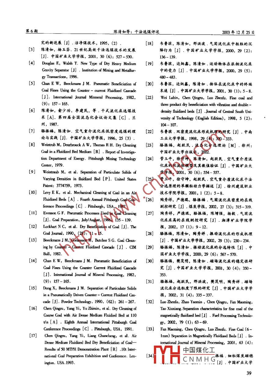 第6期選煤技術(shù)No.62003年12月COAL PREPARATION TECHNOLOCYDec. 2003文章編號: 1001-3571 (2003) 06 -0034- 06干法選煤評述陳清如2,駱振福'(1.中國礦業(yè)大學(xué)化工學(xué)院,江蘇徐州221008;2.中國煤炭學(xué)會選煤專業(yè)委員會,河北唐山063012)摘要:文章以大量詳實的資料,回顧了干法選煤技術(shù)的理論與實踐研究成果和取得的新進(jìn)展,指出了研究先進(jìn)高效的干法選煤技術(shù)對順應(yīng)我國煤炭工業(yè)戰(zhàn)略西移,促進(jìn)潔凈煤事業(yè)的全面發(fā)展的重要意義。關(guān)鍵詞:干法選煤;氣固流化床;風(fēng)力選煤;磁穩(wěn)定流化床;研究中圖分類號: TD942文獻(xiàn)標(biāo)識碼: A為了順應(yīng)中國煤炭工業(yè)的戰(zhàn)略西移,促進(jìn)潔凈1前言煤事業(yè)的全面發(fā)展,就需要研究高效的千法選煤技選煤是合理利用煤炭資源、保護(hù)環(huán)境的最經(jīng)濟(jì)術(shù)。和最有效的技術(shù),是煤炭加工、轉(zhuǎn)化為潔凈煤基燃干法選煤主要是利用煤與矸石的物理性質(zhì)差別料必不可少的基礎(chǔ)和關(guān)鍵環(huán)節(jié);通過選煤可以優(yōu)化實現(xiàn)分選的,所謂物理性質(zhì)包括密度、粒度、形產(chǎn)品結(jié)構(gòu),提高利用效率。因此,國際上公認(rèn)選煤狀、光澤度、導(dǎo)磁性、導(dǎo)電性、輻射性、摩擦系數(shù)是實現(xiàn)煤炭高效、潔凈利用的首選方案。加快發(fā)展等。干法選煤主要包括風(fēng)選、揀選、摩擦選、磁選煤技術(shù)對于實現(xiàn)煤炭資源的綜合利用、節(jié)約能選、電選、X-射線選、微波選、空氣重介質(zhì)流化源、減少環(huán)境污染具有十分重要的意義。床選煤等,其中已實現(xiàn)工業(yè)應(yīng)用的有風(fēng)力選煤(風(fēng)中國煤炭的人選比例一直較低,2001 年只有力搖床、風(fēng)力跳汰)和空氣重介質(zhì)流化床選煤。30%,動力煤的人選比例更低,僅為18%,資源2干 法選煤研究回顧浪費和環(huán)境污染問題嚴(yán)重。造成這些問題的原因是多方面的,其中水資源短缺是造成煤炭入選比例低2.1流化床選煤的主要原因之- -。中國煤炭資源主要分布在干旱缺2.1.1基本原理水地區(qū),已探明的1萬億t煤炭保有儲量中,晉、氣固流化床分離(選)礦物可分為兩類: -類陜、蒙三省區(qū)占60.3%,新、甘、寧、青等省區(qū)是根據(jù)兩種顆粒的粒度差別進(jìn)行分離。其原理是:占22.3%,東部4大缺煤區(qū)的19個省區(qū)只占粒度大的塊狀物不參與流化,而粒度小的粉狀物能17.4%。占全國煤炭保有儲量三分之二以上的千旱夠流態(tài)化,不參與流化的大顆粒沉在床底,能夠流缺水地區(qū)的煤炭難于采用耗水量大的濕法分選方法化的小顆粒流態(tài)化后不斷溢出床面,從而達(dá)到分離(就濕法跳汰選煤而言,人選1t原煤約需3~St循的目的;另一類即本文所述及研究的氣固流化床對環(huán)水,還需補(bǔ)加部分清水);其次,中國相當(dāng)數(shù)量礦物的分選。其原理是:以微細(xì)顆粒作為固相加重的年輕煤種遇水易泥化,不宜采用濕法分選;第質(zhì),形成具有一定密度的流化床層,不同密度組成三,濕法分選產(chǎn)品外水高達(dá)12%以上,嚴(yán)寒地區(qū)的被分離礦物(由有用礦物與無用礦物組成)進(jìn)入冬季凍結(jié),貯運困難,導(dǎo)致部分選煤廠被迫停產(chǎn),流化床層后按床層密度分層,輕者上浮,重者下而且,采用濕法跳汰、重介和浮游選煤,耗水量沉,從而實現(xiàn)氣固流化床對礦物的分選。氣固流化大,投資及生產(chǎn)費用高,噸煤投資達(dá)80元以上,床密度p可以表示為限制了部分地方小煤礦企業(yè)的發(fā)展。ρ = (1-e)p. = (W/A)Hg .式中:p為床層密度, kg/m2 ;e為空隙率,% ;p,為固.收稿日期: 2002-08- 12作者簡介:陳清如(1926-), 男,浙江杭州人,中國工程相力中國煤化工床層質(zhì)量,kg;A為院院士,中國煤炭學(xué)會選煤專業(yè)委員會名譽(yù)主任委員,中HCN MH Gig為重力加速度,國礦業(yè)大學(xué)化工學(xué)院教授。電話: 0516 - 3885384。m/s"。第6期陳清如等:干法選煤評述2003年12月25且不同密度的礦物在均勻流體中因受到流體的凈小。因此在- -定范圍內(nèi)改變固相加重質(zhì)粒度組成可浮力作用而產(chǎn)生運動,同時受到流體阻力的作用,最以調(diào)節(jié)流化床分選密度。但要形成高質(zhì)量流化床,終按流體密度分層分離。由于氣固流化床屬聚式流不同種類的固相加重質(zhì)各有其最佳的粒度范圍,陳化床,床層內(nèi)壓力及密度有一定的不均勻性,因此要清如等6)的研究結(jié)果表明了這一點。Weintaub實現(xiàn)被分選礦物按流化床密度分離,就要求被分選等V,)在中100mm圓簡型流化床裝置上,以0.043 ~礦物的粒度足夠大于固相加重質(zhì)顆粒粒度,使得被0.074mm的磁鐵礦粉為固相加重質(zhì)被選礦物(煤選礦物受到流化床密度的凈浮力作用占主導(dǎo),并且炭)與固相加重質(zhì)的質(zhì)量比為1:100,分別對1.17~克服床層介質(zhì)阻力及固相加重質(zhì)顆粒返混產(chǎn)生的曳0.58 mm.3.33~2.36mm.9.53 ~ 6.35 mm的3個粒級力作用而分層。礦物在流化床的分離除決定于床層煤炭進(jìn)行分選試驗,結(jié)果表明可以實現(xiàn)按密度分層密度的均勻穩(wěn)定性外,還受床層內(nèi)氣泡行為宏觀返分離,且粒度越大所需分選時間越短。Lery 等[0]試混引起的曳力等因素影響,因此,氣固流化床分選研圖用氣固流化床對微細(xì)煤粉進(