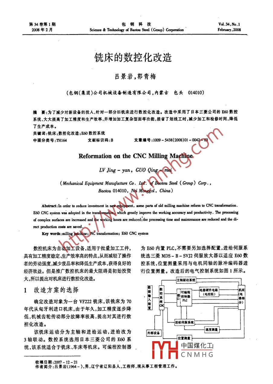 第34卷第1期包鋼科技v.34,No.12008年2月Science& Technology of Baotou Steel(Group) CorporationFebruary, 2008銑床的數(shù)控化改造景巖,郭青梅(包鋼(集團)公司機械設(shè)備制造有限公司,內(nèi)蒙古包頭014010)摘要:為了減少對新設(shè)備的投入針對一部分舊銑床進行數(shù)控化改造。改造中采用了日本三菱公司的E60數(shù)控系統(tǒng),大大提高了加工精度和生產(chǎn)效率并增加加工復(fù)雜型面等功能,接省了劃線工時減少加工和檢修時間降低了生產(chǎn)成本。關(guān)鍵詞:銑床;數(shù)控化改造;E60數(shù)控系統(tǒng)中圖分類號;TH64文獻標識碼:B文章編號:1009-5438(2008)01-0042-03Reformation on the CNC Milling MachineLV Jing- yan, GUo Qing-meiMechanical Equipment Manufacture Co. Ld. of Baotou Steel( Group )CorpBaotou 014010, Nei Monggol, China)Abstract: In order to reduce investment in new equipment, some parts of old milling machine reform to CNc transformationE60 CNC system was adopted in the transformation, which greatly improve the working accuracy and productivity. The processingof complex surfaces are increased and the working bours are reduced; the procesing time and maintenance are reduced and the direct production costs are savedKey words: milling machine: NC transformation; E60 CNC system數(shù)控機床為自動加工設(shè)備適用于批量加工工件,為E60內(nèi)置PIC,不需要另加選擇配置進給伺服系具有加工精度穩(wěn)定生產(chǎn)效率高的特點從而減輕了操作統(tǒng)選三菱MDS-B-SV伺服放大器以適應(yīng)B60數(shù)者的勞動強度減少廢品率和降低生產(chǎn)成本獲得良好的控系統(tǒng),位置測量采用與電機同軸的脈沖編碼器進經(jīng)濟效益。但是推廣數(shù)控機床的最大阻礙是初始投資行位置測量。改造后的電氣控制系統(tǒng)如圖1所示。大所以提出對機床進行數(shù)控化改造。主軸動系統(tǒng)1改造方案的選擇可編程確定改造對象為一臺VF銑床,該銑床為70年代從匈牙利進口機床,由于年久,加工精度逐步降低,機械齒輪傳動部分故障率極高,提出對其進行數(shù)控化改造。進給伺服系統(tǒng)該銑床運動分為主軸和進給運動,進給改為遠度測量外部設(shè)備3軸聯(lián)動。數(shù)控系統(tǒng)選用日本三菱公司的E60系位置測量統(tǒng),該系統(tǒng)適合于銑床、車床等機床??删幊炭刂破髦袊夯NMHG收稿日期:2007-12-21作者簡介:呂景巖(1964-),男,遼寧省遼陽縣人,工程師現(xiàn)從事工程管理工作。第1期銑床的數(shù)控化改造432各部分的組成和功能它也通過PLC與CNC通信,通報現(xiàn)時工作狀態(tài)并接受CNcC的控制。2.1數(shù)據(jù)輸入裝置單個伺服伺服系統(tǒng)的控制原理如圖2所示數(shù)據(jù)輸入裝置將指令信息和各種應(yīng)用數(shù)據(jù)輸入數(shù)控系統(tǒng)的必要裝置。現(xiàn)在一般是用CNC鍵盤作速度為一般輸入操作,也可以配置硬盤及驅(qū)動裝置(用于指令調(diào)節(jié)器調(diào)節(jié)器大量數(shù)據(jù)的存儲保護)、PC計算機等等。電流反憤2.2數(shù)控系統(tǒng)位置反傾反數(shù)控系統(tǒng)是數(shù)控機床的中樞,它將接到的全部功能指令進行解碼、運算,然后有序地發(fā)出各種需要的運動指令和各種機床功能的控制指令,直至運動和功能結(jié)束。圖2伺服系統(tǒng)控制原理圖在調(diào)試中需設(shè)置輸入輸出用參數(shù)、基本規(guī)格參數(shù)控機床是一個運動坐標的電氣控制系統(tǒng),由數(shù)、軸規(guī)格等主要參數(shù)。電流(轉(zhuǎn)矩)控制環(huán)、速度控制環(huán)和位置控制環(huán)串聯(lián)23主軸驅(qū)動系統(tǒng)組成。主軸驅(qū)動系統(tǒng)接受來自CNC的驅(qū)動指令,經(jīng)速速度調(diào)節(jié)器是比例積分(P)調(diào)節(jié)器,其P、I調(diào)度與轉(zhuǎn)矩(功率)調(diào)節(jié)輸出驅(qū)動信號驅(qū)動主電動機轉(zhuǎn)整值完全取決于所驅(qū)動坐標軸的負載大小和機械傳動,同時接受速度反饋實施速度閉環(huán)控制。它還通動系統(tǒng)(導(dǎo)軌、傳動機構(gòu))的傳動剛度與傳動間隙等過PLC將主軸的各種現(xiàn)實工作狀態(tài)通告CNC用以機械特性,一旦這些特性發(fā)生明顯變化時,首先需要完成對主軸的各項功能控制。對機械傳動系統(tǒng)進行修復(fù)工作,然后重新調(diào)整速度2.4可編程控制器環(huán)PI調(diào)節(jié)器可編程邏輯控制器是機床各項功能的邏輯控制速度環(huán)是位置伺服系統(tǒng)中的重要環(huán)節(jié),其控制中心。銑床主軸起停、換向、冷卻、潤滑、照明等輔助性能是伺服性能的一個重要組成部分,從廣義上講動作進行所謂的順序控制,順序控制的信息主要是速度控制應(yīng)該具有高精度、快響應(yīng)的特性,具體而開關(guān)量,如行程開關(guān)、按扭繼電器等這些輔助功能言,反映為小的速度脈動率、快的頻率響應(yīng)、寬的調(diào)均由可編程控制器PIC來完成速范圍等性能指標它還將來自CNC的各種運動及功能指令進行速度環(huán)的最佳調(diào)節(jié)是在位置環(huán)開環(huán)的條件下完邏輯排序,使它們能夠準確地、協(xié)調(diào)有序地安全運成的,這對于水平運動的坐標軸和轉(zhuǎn)動坐標軸較容行;同時將來自機床的各種信息及工作狀態(tài)傳送給易進行。CNC,使CNC能及時準確地發(fā)出進一步的控制指令,電流環(huán)是高性能位置伺服系統(tǒng)的基礎(chǔ),系統(tǒng)中如此實現(xiàn)對整個機床的控制。由于控