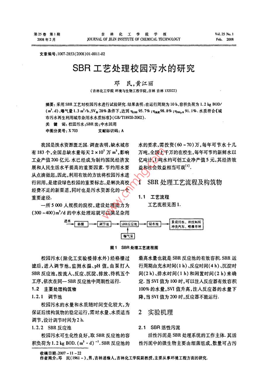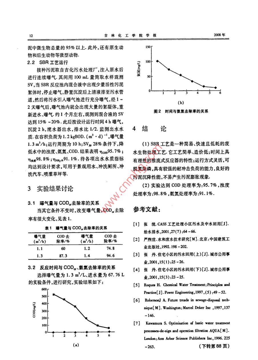 第25卷第1期Vol 25 No. 12008年2月JOURNAL OF JILIN INSTTTUTE OF CHEMICAL TECHNOLOGYFeb.2008文章編號(hào):1007-2853(2008)01001102SBR工藝處理校園污水的研究鄧民,黃江麗(吉林化工學(xué)院環(huán)境與生物工程學(xué)院吉林吉林13202摘要:采用SBR工藝對(duì)校園污水進(jìn)行試驗(yàn)研究結(jié)果表明在運(yùn)行周期為10h容積負(fù)荷為1.2 kg BOD(m.d)、曝氣量1.3m/h、SVx28%條件下達(dá)到no%5.7%;nr9.8%;nm9.1%水質(zhì)符合《城市污水再生利用城市雜用水水質(zhì)標(biāo)準(zhǔn))(GB/T18920-200)關(guān)鍵詞:校園污水;SBR法;中水回用中圖分類號(hào):X703文獻(xiàn)標(biāo)識(shí)碼:A我國(guó)是淡水資源匱乏國(guó)調(diào)查表明缺水城市水的要求,需投資(60-70)萬,每年可節(jié)水十幾有183個(gè),全國(guó)總?cè)彼棵刻?×107萬m3,影響萬噸全國(guó)上千萬的在校生,每年可節(jié)約新鮮水以工業(yè)產(chǎn)值200億元水已經(jīng)成為制約國(guó)民經(jīng)濟(jì)發(fā)億噸計(jì),1噸水約可創(chuàng)工業(yè)凈產(chǎn)值5元,其經(jīng)濟(jì)效展和人民生活水平提高的重要因素節(jié)約用水要益和社會(huì)效益相當(dāng)可觀從點(diǎn)滴做起,因此,利用有效的方法將校園污水進(jìn)行回用,是建設(shè)綠色校園的重要標(biāo)志是解決高校1SBR處理工藝流程及構(gòu)筑物經(jīng)費(fèi)不足的新渠道,同時(shí)也是污水資源化的一個(gè)重要途徑1.1工藝流程所5000人規(guī)模的院校,建設(shè)處理能力為工藝流程見圖1(300-400)m3/d的中水處理站就可以滿足雜用遇一[格】一[泡一國(guó)應(yīng)]一[區(qū)木筆景觀用水、沖洗所沖洗汽車、噴灌草坪氣泵圖1SBR處理工藝流程圖校園污水(除化工實(shí)驗(yàn)樓排水外)經(jīng)格柵過最高水量也就是SBR反應(yīng)池的有效容積SBR運(yùn)濾后,進(jìn)入調(diào)節(jié)池,監(jiān)測(cè)水溫、pH值,由泵打入行周期由充水時(shí)間(1h)、反應(yīng)時(shí)間(4h)沉淀時(shí)SBR反應(yīng)池,按流入、反應(yīng)沉淀、排放、待機(jī)五個(gè)間(2h)排水時(shí)間(lh)和閑置時(shí)間(2h)來確工序,依次在同一SBR反應(yīng)池中周期性運(yùn)行定當(dāng)SⅥ值為100時(shí),可以注入反應(yīng)器有效容積1.2主要處理構(gòu)筑物100%的水量,SⅥ值升高注人反應(yīng)器的水量下1.2.1調(diào)節(jié)池降,當(dāng)SⅥ值為200時(shí),反應(yīng)器不能運(yùn)行校園污水的水量和水質(zhì)隨時(shí)間變化較大,為保證后續(xù)構(gòu)筑物的穩(wěn)定運(yùn)行需對(duì)水量、水質(zhì)適當(dāng)2實(shí)驗(yàn)機(jī)理調(diào)節(jié),設(shè)計(jì)調(diào)節(jié)時(shí)間為2h1.2.2SBR反應(yīng)池2.1SBR活性污泥校園污水可生化性良好,取SBR反應(yīng)池的容活性污泥是SBR處理系統(tǒng)的工作主體,其活積負(fù)荷為12 kg bOD.(m3·d).SBR反應(yīng)池的性污泥中的微生物主要由細(xì)菌組成數(shù)量可占污收稿日期:2007-11-22作者簡(jiǎn)介:鄧民(1961-),男,吉林通榆人,吉林化工學(xué)院副教授,主要從事環(huán)境工程方面的研究吉林化工學(xué)院學(xué)泥中微生物總量的95%以上此外,還有原生動(dòng)物和后生動(dòng)物等微型動(dòng)物22SBR工藝運(yùn)行接種污泥取自吉化污水處理廠,注入原水后進(jìn)行連續(xù)曝氣其間用100mL量筒取水樣觀測(cè)sV當(dāng)SBR反應(yīng)池內(nèi)混合液中出現(xiàn)少量活性污泥絮體時(shí),停止曝氣靜置沉淀后上清液排至污水管道然后將污水引入曝氣池進(jìn)行充分曝氣,經(jīng)12天曝氣后曝氣池內(nèi)就會(huì)出現(xiàn)大量的絮凝體重新進(jìn)水、曝氣約1個(gè)月左右觀測(cè)到混合液的Sv圖2時(shí)間與氨氮去除率的關(guān)系達(dá)到15%-20%此后按設(shè)計(jì)運(yùn)行時(shí)間4h曝氣沉淀2h,潷水器出水,排水比1/2.監(jiān)測(cè)出水水4結(jié)論質(zhì)在容積負(fù)荷為12 kgBOD.(m3·d),曝氣量1.3m3/h;運(yùn)行周期為10h;SVx28%條件下,降(1)SBR工藝是一種簡(jiǎn)易、快速且低耗的廢低水中的濁度氨氮、COD.結(jié)果表明na9.7%;水生物處理工藝它工藝簡(jiǎn)單、造價(jià)低;時(shí)間上具Ta988%;nm91.1%,待各項(xiàng)出水水質(zhì)指標(biāo)有理想的推流式反應(yīng)器的特性;運(yùn)行方式靈活可均達(dá)到設(shè)計(jì)要求可用于景觀用水沖洗廁所沖脫氮除磷具有較強(qiáng)的耐沖擊負(fù)荷的能力良好的洗汽車、噴灌草坪等.污泥沉降性能,不易產(chǎn)生污泥膨脹現(xiàn)象3實(shí)驗(yàn)結(jié)果討論(2)實(shí)驗(yàn)達(dá)到COD處理率為:957%,濁度處理率為:988%,氨氮處理率為91.1%3.1曝氣量與cOD。去除率的關(guān)系當(dāng)其它條件不變時(shí)改變曝氣量,COD去除參考文獻(xiàn):率有很大變化,見表1[1]張統(tǒng)CAS工藝處理小區(qū)污水及中水回用[]表1曝氣量與cOD。去除率的關(guān)系給水排水,2001,27(7):64-66曝氣量COD去曝氣量COD去(m3/h)除率/%(m3/h)除率/%[2]嚴(yán)煦世水和廢水技術(shù)研究[M]北京:中國(guó)建筑工74.8業(yè)出版社,1992.198-2021.38731.494.6[3]張丹住宅小區(qū)的污水回用(上)[冂].城市公用事業(yè),2001,15(1):25-26.32反應(yīng)時(shí)間與COD、氨氮去除率的關(guān)系[4]張丹住宅小區(qū)的污水回用(下)[]城市公用事選擇曝氣量為13m3/L進(jìn)水量為6776L業(yè),2001,15(3):23-25.的實(shí)驗(yàn)條件,進(jìn)行研究,實(shí)驗(yàn)結(jié)果如下[5] Roques H. Chemical Water Treatment: Principles andPractice[J]. Power Engineering, 1997, (5): 49-52