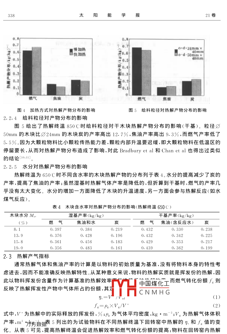 第21卷第4期太陽(yáng)能學(xué)報(bào)Vol. 21. No 42000年10月ACTA ENERGIAE SOLARIS SINICA生物質(zhì)廢棄物在回轉(zhuǎn)窯內(nèi)熱解研究Ⅰ.熱解條件對(duì)熱解產(chǎn)物分布的影響李水清李愛民嚴(yán)建華任遠(yuǎn)李曉東李潤(rùn)東池涌岑可法(浙江大學(xué)熱能工程研究所,杭州310027)文摘:研究了生物質(zhì)類廢棄物在回轉(zhuǎn)窯內(nèi)的熱解特性,討論了物料種類、熱解終溫、加熱方式、給料粒徑和含水率對(duì)熱解產(chǎn)物分布的影響。物料揮發(fā)份和熱解終溫高,加熱快、粒徑小,有利于燃?xì)猱a(chǎn)率的提高以及炭產(chǎn)率的降低,而水分的提高會(huì)提高焦油的產(chǎn)率并降低炭的產(chǎn)率。同時(shí),還研究了回轉(zhuǎn)窯內(nèi)的溫升特性和熱解氣體的瞬態(tài)析岀特性。關(guān)鍵詞:回轉(zhuǎn)窯,生物質(zhì)廢棄物,熱解條件,熱解產(chǎn)物分布,熱解氣體析出0引言生物質(zhì)類再生資源包括農(nóng)產(chǎn)品廢棄物、城市垃圾、林業(yè)廢棄物以及畜業(yè)廢棄物等。190年我國(guó)生物質(zhì)能的消耗量為263.0Mt,占一次能源供應(yīng)的20.2%,僅低于煤炭居第二位。生物質(zhì)的C/N比值很高,遠(yuǎn)高于理想的發(fā)酵原料所要求的20:1的C八N值,且堆肥處理法占地面積大、運(yùn)作周期長(zhǎng),因而熱化學(xué)處理法(焚燒和熱解)更有利于生物質(zhì)資源的大規(guī)模利用。生物質(zhì)的熱解可以得到氣體(燃?xì)?、液體(生物油)和固體(炭)三種不同形態(tài)的產(chǎn)物。氣體視其熱值的高低,可單獨(dú)或與其它高熱值燃?xì)饣旌献鳛楣I(yè)或民用燃?xì)?;焦油可通過進(jìn)一步的分離和提取制成燃料油和化工原料;炭則可用作活性劑、進(jìn)一步氣化生成氣體燃料或在流化床鍋爐內(nèi)直接焚燒回收熱能。熱解法處理固體廢棄物不僅具有較高的能量回收率,而且由于熱解是在缺氧或絕氧的條件下進(jìn)行的,其污染排放比焚燒法低得多國(guó)內(nèi)外學(xué)者對(duì)生物質(zhì)熱解進(jìn)行了大量研究, Raveendran8研究了生物質(zhì)的結(jié)構(gòu)成分纖維素、木質(zhì)素和木聚糖(半纖維素)的熱解產(chǎn)物的分布,表明熱解過程中不同生物質(zhì)成分之間并不存在關(guān)聯(lián)反應(yīng)。 Varhegyi et al、 Bradbury et al和 Chan et al研究了反應(yīng)溫度、加熱速率和給料粒徑對(duì)生物質(zhì)熱解產(chǎn)物分布的影響11。 Mazumdar-et1 Anthony et a214認(rèn)為加熱方式、給料粒徑和水分是通過改變反應(yīng)器內(nèi)溫度分布而中國(guó)煤化 n et all認(rèn)為,半焦的形成是脫揮發(fā)份反應(yīng)和揮發(fā)產(chǎn)物二次重聚反應(yīng)CNMH回轉(zhuǎn)窯以其廣泛的物料(各種尺寸及形狀的固體和液體、氣體廢棄物)適應(yīng)性及操作簡(jiǎn)單控制方便等一系列優(yōu)點(diǎn)成為各種廢棄物熱解的主要爐型之一。內(nèi)熱式回轉(zhuǎn)窯垃圾熱解技術(shù)雖①本課題齡21程資助項(xiàng)目國(guó)家自然科學(xué)基金重點(diǎn)項(xiàng)目資助編號(hào)為56210本文199-06-28收到然已得到了廣泛的應(yīng)用,但燃?xì)獾臒嶂当容^低,只能和燃油或天然氣混燃利用。外熱式熱解技術(shù)以其更高的能源利用率和更低的二次污染排放逐漸引起了人們的重視118。本課題以木塊稻殼、桔皮、落葉、蔬菜和紙類為物料,研究了生物質(zhì)廢棄物在外熱式回轉(zhuǎn)窯內(nèi)熱解過程中反應(yīng)條件對(duì)產(chǎn)物分布和產(chǎn)物品質(zhì)的影響1試驗(yàn)裝置和試驗(yàn)方法1.1回轉(zhuǎn)窯試驗(yàn)裝置外熱式回轉(zhuǎn)窯熱解試驗(yàn)裝置如圖1所示?;剞D(zhuǎn)窯筒體長(zhǎng)0.450m,內(nèi)徑0.205m,可一次處理物料4.5升?;剞D(zhuǎn)窯筒體的轉(zhuǎn)速可以在0.5-10r/min的范圍內(nèi)任意調(diào)節(jié)(本試驗(yàn)中選定轉(zhuǎn)速為3r/min)?;剞D(zhuǎn)窯筒體內(nèi)安裝有兩支K型熱電偶,一支固定在回轉(zhuǎn)窯筒體的內(nèi)壁上,而另支懸于窯膛的中間部位。加熱電爐的功率為12kW,電爐可以在滑道上左右移動(dòng)以滿足對(duì)回轉(zhuǎn)窯不同加熱方式的要求。該裝置采用了一種特殊的密封結(jié)構(gòu),成功解決了熱解回轉(zhuǎn)窯的高溫動(dòng)密封問題。熱解氣體的冷凝器為蛇形管豎式換熱器,在其底部裝有焦油收集器,熱解氣體的流量由累計(jì)流量計(jì)測(cè)得。氣體采樣裝置通過電磁閥開關(guān)由一臺(tái)計(jì)算機(jī)控制。380VsW.mmmm1B38888圖1試驗(yàn)裝置示意圖1.數(shù)字式溫度計(jì),2.軸承,3.齒輪鏈條傳動(dòng)機(jī)構(gòu),4.管式電爐,5.回轉(zhuǎn)窯筒體,6.溫度控制儀,7.密封,8.蛇形管式冷凝器,9.過濾器,10.累積流量計(jì),11.計(jì)算機(jī),12.氣體采樣裝置,13.焦油收集器,14.給料口,15.無(wú)級(jí)變速電機(jī)1.2試驗(yàn)物料表1為試驗(yàn)物料的工業(yè)和元素分析結(jié)果。表1試驗(yàn)物料的工業(yè)分析與元素分析工業(yè)分析元素分析物料Mad/% Ad/% Vad/% FcM/% Qb.nd/Jg Cad/% H./% Nad/% S/9稻殼8.4112.6666.7512.681591840.095.440.520.1433.24報(bào)紙102.374.1513.212186.536.125.370.090.1745.61木塊4.382.2878.2715.0718022.945.155.760.390.0342.01落葉11.499.4867.1211.91143中國(guó)煤化工.050.3435.83蔬菜5.6753.7712.70CNMHG.580.4032.92桔皮11.342323.545.646.401.20.0532.92桔皮、蔬菜的全水分M分別為73.93%、86,86%,產(chǎn)物平衡計(jì)算時(shí)注意空氣干燥基ad和收到基ar的換算2結(jié)果與討論回轉(zhu