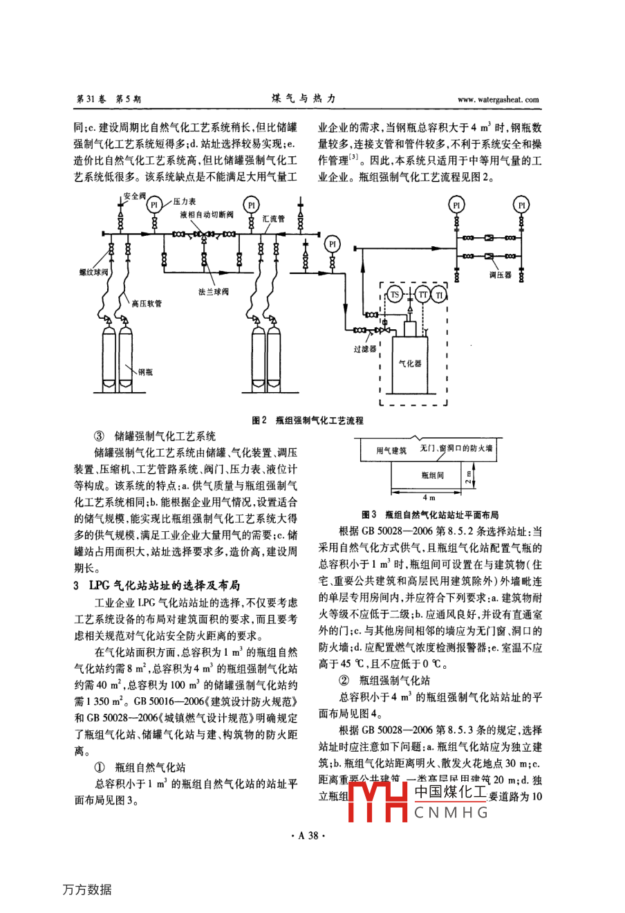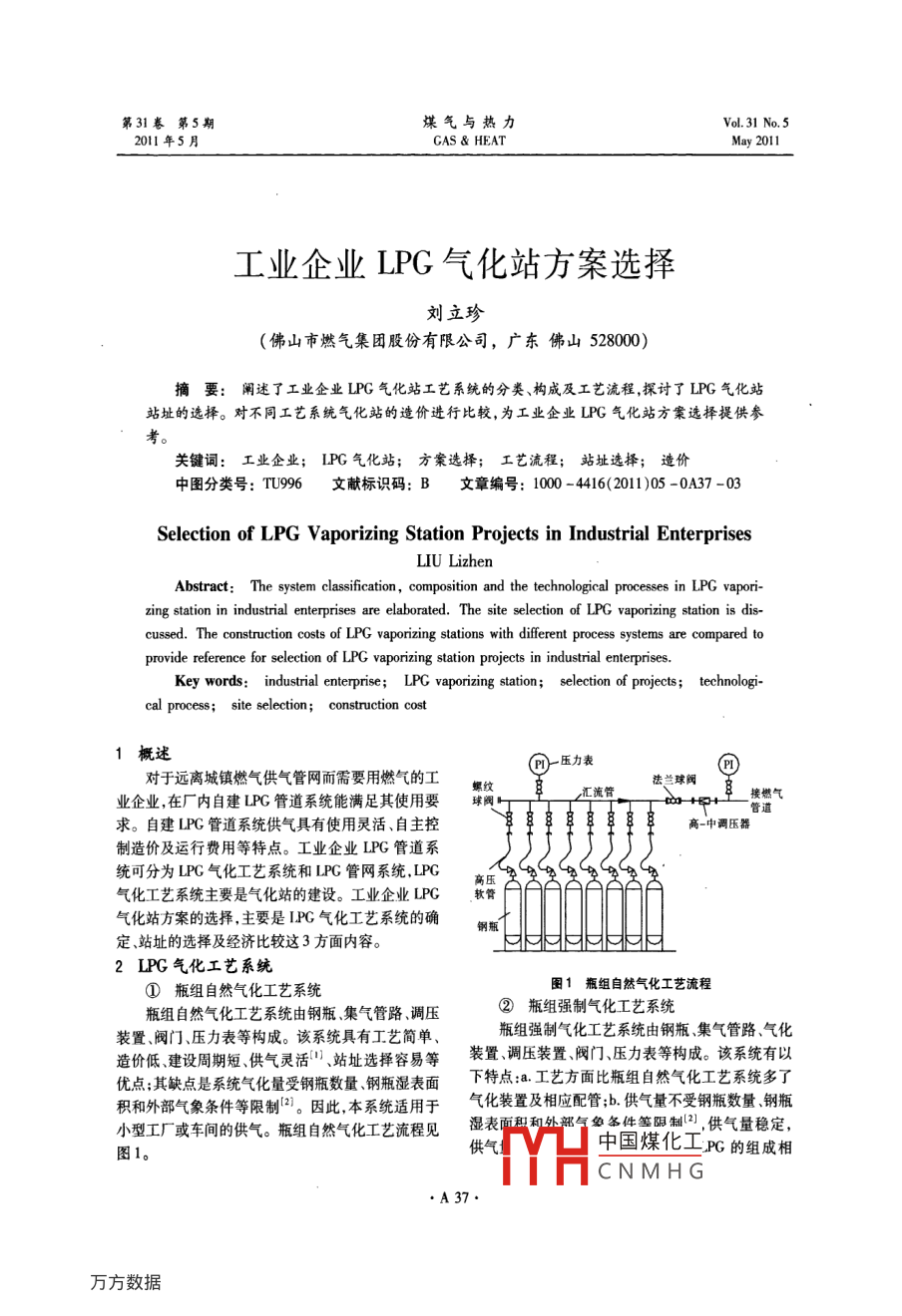 第31卷第5期煤氣與熱力Vol 31 No 52011年5月GAS heatMay 2011工業(yè)企業(yè)LPG氣化站方案選擇劉立珍(佛山市燃?xì)饧瘓F(tuán)股份有限公司,廣東佛山528000)摘要:闡迷了工業(yè)企業(yè)LPG氣化站工藝系統(tǒng)的分類(lèi)、構(gòu)成及工藝流程,探討了LPG氣化站站址的選擇。對(duì)不同工藝系統(tǒng)氣化站的造價(jià)進(jìn)行比較,為工業(yè)企業(yè)LPG氣化站方案選擇提供參考關(guān)鍵詞:工業(yè)企業(yè);IP氣化站;方案選擇;工藝流程;站址選擇;造價(jià)中圖分類(lèi)號(hào):TU996文獻(xiàn)標(biāo)識(shí)碼:B文章編號(hào):1000-446(2011)05-0A37-03tion of LPG Vaporizing Station Projects in Industrial EnterprisesLIU LizhenAbstract: The system classification, composition and the technological processes in LPG vapori-zing station in industrial enterprises are elaborated. The site selection of LPG vaporizing station is dis-cussed. The construction costs of LPG vaporizing stations with different process systems are compared toprovide reference for selection of LPG vaporizing station projects in industrial enterprisesKey words: industrial enterprise; LPG vaporizing station; selection of projects; technological process; site selection; construction cost概述壓力表對(duì)于遠(yuǎn)離城鎮(zhèn)燃?xì)夤夤芫W(wǎng)而需要用燃?xì)獾墓しㄌm球閥業(yè)企業(yè),在廠內(nèi)自建LPG管道系統(tǒng)能滿足其使用要球闕接燃?xì)馇?。自建LPG管道系統(tǒng)供氣具有使用靈活、自主控高-中調(diào)壓器制造價(jià)及運(yùn)行費(fèi)用等特點(diǎn)。工業(yè)企業(yè)LPG管道系統(tǒng)可分為UP氣化工藝系統(tǒng)和LRC管網(wǎng)系統(tǒng),B壓含22222氣化工藝系統(tǒng)主要是氣化站的建設(shè)。工業(yè)企業(yè)LPG軟管氣化站方案的選擇,主要是IPG氣化工藝系統(tǒng)的確定、站址的選擇及經(jīng)濟(jì)比較這3方面內(nèi)容。2LPG氣化工藝系統(tǒng)①瓶組自然氣化工藝系統(tǒng)圖1瓶組自然氣化工藝流程瓶組自然氣化工藝系統(tǒng)由鋼瓶集氣管路、調(diào)壓②瓶組強(qiáng)制氣化工藝系統(tǒng)裝置、閥門(mén)、壓力表等構(gòu)成。該系統(tǒng)具有工藝簡(jiǎn)單瓶組強(qiáng)制氣化工藝系統(tǒng)由鋼瓶集氣管路、氣化造價(jià)低、建設(shè)周期短、供氣靈活、站址選擇容易等裝置調(diào)壓裝置閥門(mén)壓力表等構(gòu)成。該系統(tǒng)有以優(yōu)點(diǎn)其缺點(diǎn)是系統(tǒng)氣化量受鋼瓶數(shù)量、鋼瓶濕表面下特點(diǎn):a.工藝方面比瓶組自然氣化工藝系統(tǒng)多了積和外部氣象條件等限制2。因此,本系統(tǒng)適用于氣化裝置及相應(yīng)配管b供氣量不受鋼瓶數(shù)量鋼瓶小型工廠或車(chē)間的供氣。瓶組自然氣化工藝流程見(jiàn)濕表象多件簽阻制(2),供氣量穩(wěn)定供氣中國(guó)煤化工PG的組成相CNMHGA37第31卷第5期煤氣與熱力www.watergasheat.com同;c建設(shè)周期比自然氣化工藝系統(tǒng)稍長(zhǎng),但比儲(chǔ)罐業(yè)企業(yè)的需求,當(dāng)鋼瓶總?cè)莘e大于4m3時(shí),鋼瓶數(shù)強(qiáng)制氣化工藝系統(tǒng)短得多;d.站址選擇較易實(shí)現(xiàn);e.量較多,連接支管和管件較多,不利于系統(tǒng)安全和操造價(jià)比自然氣化工藝系統(tǒng)高但比儲(chǔ)罐強(qiáng)制氣化工作管理。因此,本系統(tǒng)只適用于中等用氣量的工藝系統(tǒng)低很多。該系統(tǒng)缺點(diǎn)是不能滿足大用氣量工業(yè)企業(yè)。瓶組強(qiáng)制氣化工藝流程見(jiàn)圖2安全閥液相自動(dòng)切斷閥匯流管螺紋球調(diào)壓器法蘭球閥高壓軟管氣化器圖2瓶組強(qiáng)制氣化工藝流程③儲(chǔ)罐強(qiáng)制氣化工藝系統(tǒng)儲(chǔ)罐強(qiáng)制氣化工藝系統(tǒng)由儲(chǔ)罐、氣化裝置、調(diào)壓用氣建筑無(wú)門(mén)窗洞口的防火墻裝置、壓縮機(jī)、工藝管路系統(tǒng)、閥門(mén)、壓力表、液位計(jì)瓶組間等構(gòu)成。該系統(tǒng)的特點(diǎn):a供氣質(zhì)量與瓶組強(qiáng)制氣化工藝系統(tǒng)相同;b.能根據(jù)企業(yè)用氣情況,設(shè)置適合的儲(chǔ)氣規(guī)模,能實(shí)現(xiàn)比瓶組強(qiáng)制氣化工藝系統(tǒng)大得圖3瓶組自然氣化站站址平面布局多的供氣規(guī)模,滿足工業(yè)企業(yè)大量用氣的需要;c.儲(chǔ)根據(jù)GB50028-2006第8.5.2條選擇站址:當(dāng)罐站占用面積大站址選擇要求多,造價(jià)高,建設(shè)周采用自然氣化方式供氣且瓶組氣化站配置氣瓶的期長(zhǎng)???cè)莘e小于1m時(shí),瓶組間可設(shè)置在與建筑物(住3IPG氣化站站址的選擇及布局宅、重要公共建筑和高層民用建筑除外)外墻毗連工業(yè)企業(yè)LPG氣化站站址的選擇,不僅要考慮的單層專(zhuān)用房間內(nèi),并應(yīng)符合下列要求:a建筑物耐工藝系統(tǒng)設(shè)備的布局對(duì)建筑面積的要求而且要考火等級(jí)不應(yīng)低于二級(jí);應(yīng)通風(fēng)良好,并設(shè)有直通室慮相關(guān)規(guī)范對(duì)氣化站安全防火距離的要求外的門(mén);c.與其他房間相鄰的墻應(yīng)為無(wú)門(mén)窗、洞口的在氣化站面積方面總?cè)莘e為1m3的瓶組自然防火墻;d.應(yīng)配置燃?xì)鉂舛葯z測(cè)報(bào)警器;e.室溫不應(yīng)氣化站約需8m2,總?cè)莘e為4m3的瓶組強(qiáng)制氣化站高于45℃,且不應(yīng)低于0℃。約需40m2,總?cè)莘e為10m3的儲(chǔ)罐強(qiáng)制氣化站約②瓶組強(qiáng)制氣化站需1350m2。GB50016-2006《建筑設(shè)計(jì)防火規(guī)范》總?cè)莘e小于4m
