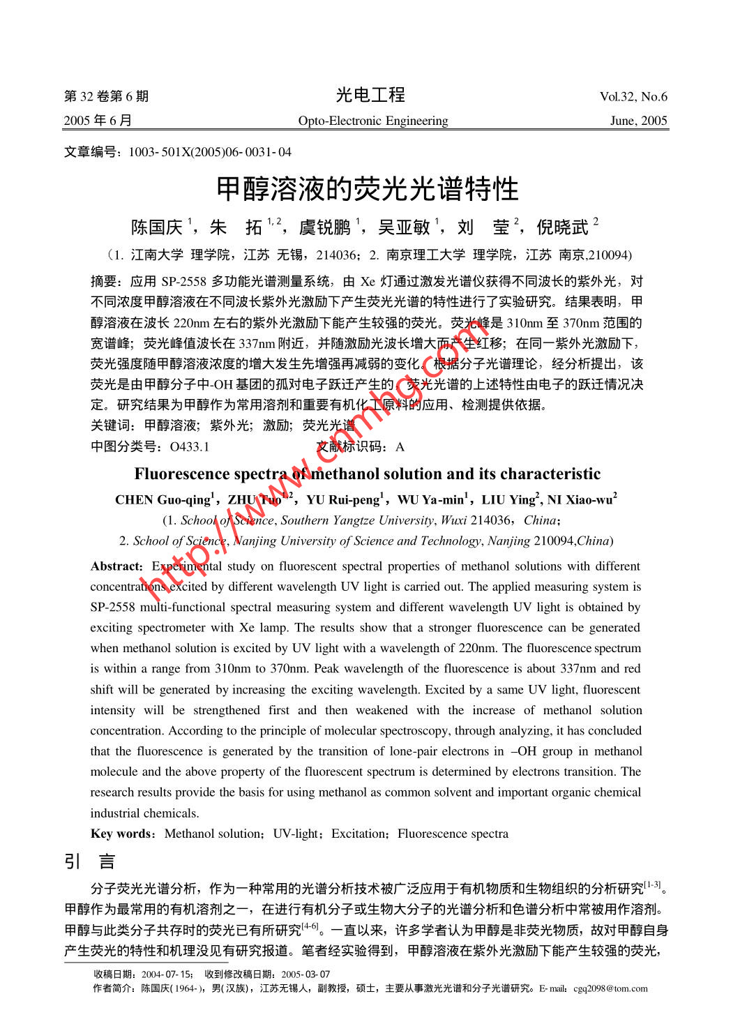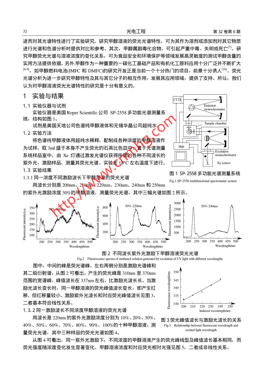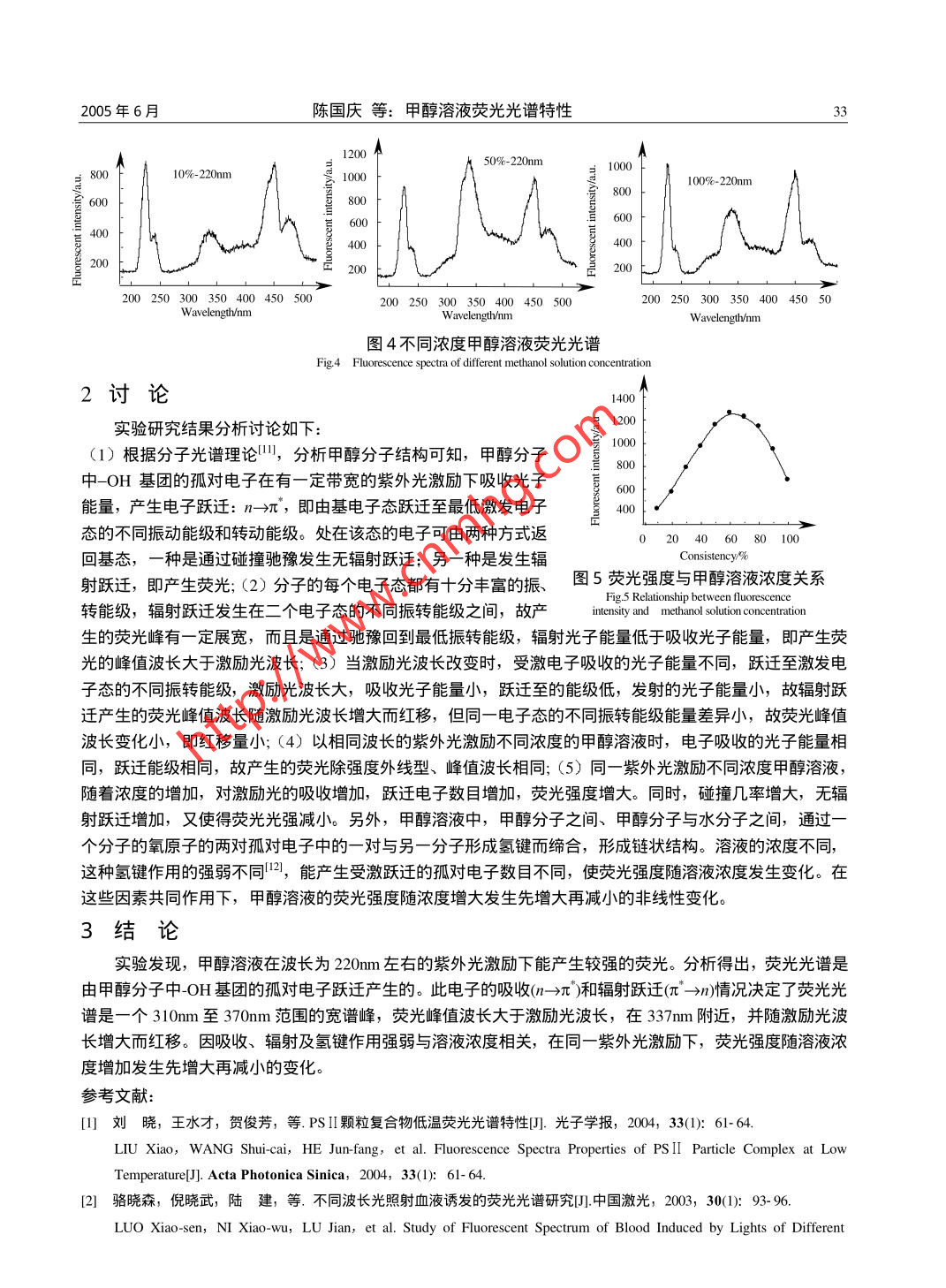 第32卷第6期光電工程VoL32, No.62005年6月Opto-Electronic EngineeringJune, 2005文章編號: 1003- 501X(2005)06- 0031- 04甲醇溶液的熒光光譜特性陳國慶',朱拓12, 虞銳鵬',吳亞敏',劉瑩,倪曉武2(1.江南大學理學院,江蘇無錫,214036; 2. 南京理工大學理學院,江蘇南京,210094)摘要:應用SP-2558多功能光譜測量系統(tǒng),由Xe燈通過激發(fā)光譜儀獲得不同波長的紫外光,對不同濃度甲醇溶液在不同波長紫外光激勵下產(chǎn)生熒光光譜的特性進行了實驗研究。結果表明,甲醇溶液在波長220nm左右的紫外光激勵下能產(chǎn)生較強的熒光。熒光峰是310nm至370nm范圍的寬譜峰;熒光峰值波長在337nm附近,并隨激勵光波長增大而產(chǎn)生紅移;在同一紫外光激勵下,熒光強度隨甲醇溶液濃度的增大發(fā)生先增強再減弱的變化。根據(jù)分子光譜理論,經(jīng)分析提出,該熒光是由甲醇分子中-OH基團的孤對電子躍遷產(chǎn)生的,熒光光譜的上述特性由電子的躍遷情況決定。研究結果為甲醇作為常用溶劑和重要有機化工原料的應用、檢測提供依據(jù)。關鍵詞:甲醇溶液;紫外光;激勵;熒光光譜中圖分類號: 0433.1文獻標識碼: AFluorescence spectra of methanol solution and its characteristicCHEN Guo-qing', ZHU Tuo"2, YU Rui-peng', WU Ya-min' , LIU Ying', NI Xiao-wu2(1. School of Science, Southern Yangtze University, Wuxi 214036,China;2. School of Science, Nanjing University of Science and Technology, Nanjing 210094,China)Abstract: Experimental study on fluorescent spectral properties of methanol solutions with differentconcentrations excited by different wavelength UV light is carried out. The applied measuring system isSP-2558 multi-functional spectral measuring system and different wavelength UV light is obtained byexciting spectrometer with Xe lamp. The results show that a stronger fluorescence can be generatedwhen methanol solution is excited by UV light with a wavelength of 220nm. The fluorescence spectrumis within a range from 3 10nm to 370nm. Peak wavelength of the fluorescence is about 337nm and redshift will be generated by increasing the exciting wavelength. Excited by a same UV light, fluorescentintensity will be strengthened first and then weakened with the increase of methanol solutionconcentration. According to the principle of molecular spectroscopy, through analyzing, it has concludedthat the fluorescence is generated by the transition of lone-pair electrons in - _OH group in methanolmolecule and the above property of the fluorescent spectrum is determined by electrons transition. Theresearch results provide the basis for using methanol as common solvent and important organic chemicalindustrial chemicals.Key words: Methanol solution; UV-light; Excitation; Fluorescence spectra引言分子熒光光譜分析,作為- -種常用的光譜分析技術被廣泛應用于有機物質(zhì)和生物組織的分析研究小-3]。甲醇作為最常用的有機溶劑之一, 在進行有機分子或生物大分子的光譜分析和色譜分析中常被用作溶劑。甲醇與此類分子共存時的熒光已有所研究1461。-直以來,許多學者認為甲醇是非熒光物質(zhì),故對甲醇自身產(chǎn)生熒光的特性和機理沒見有研究報道。筆者經(jīng)實驗得到,甲醇溶液在紫外光激勵下能產(chǎn)生較強的熒光;收稿日期: 2004-07- 15;收到修改稿日期: 2005- 03- 07作者簡介:陳國慶( 1964-),男(漢族),江蘇無錫人,副教授,碩士,主要從事激光光譜和分子光譜研究。E mail: cgq2098@ tom.com32光電工程第32卷第6期進而對其光譜特性進行了實驗研究。研究甲醇溶液的熒光光譜特性,可為其作為溶劑或添加劑對其它物質(zhì)進行光譜和色譜分析時提供對比和參考。其次,甲醇屬劇毒化合物,可引起嚴重中毒、失明或死亡口。研究甲醇熒光光譜與溶液濃度的變化關系,可為食品安全和環(huán)境保護等領域發(fā)展高靈敏度的測試甲醇含量的實用方法提供依據(jù)。另外,甲醇作為一種重要的一碳化工基礎產(chǎn) 品和有機化工原料應用十分廣泛并不斷擴大[89),如甲醇燃料電池(IMFC和DMFC)的研究開發(fā)正是當前一個十分熱門門的項目,前景十分誘人10。熒光光譜分析為進-步研究甲醇特性及其與其它分子的相互作用,發(fā)展其應用領域,提供了支持。所以,我們認為對甲醇溶液熒光光譜特性的研究是十分有意義的。1實驗 與結果CcD1.1實驗儀器與試劑OEmissionmonochromator實驗儀器是美國Roper Scientific公司SP-2558 多功能光譜測量系統(tǒng),結構如圖1。.試劑是美國天地公司色譜純甲醇液體和無錫華晶公司超純水。Sample chamber1.2實驗方法-←-刁將色譜純甲醇液體用超純水稀釋,配制成各種濃度的甲醇溶液作DBK為試樣,取3ml盛于本身不產(chǎn)生熒光的石英比色皿中,置于光譜測量Hub1Excitation系統(tǒng)樣品室中,由Xe燈通過激發(fā)光譜儀獲得所需的各種不同波長的紫外光,激勵樣品,測量其熒光光譜。實驗在18°C 左右溫度下進行。Xe soure1.3實驗結果圖1 SP- 2558多功能光譜測量系統(tǒng)1.3.1同一濃度不同激勵波長下甲醇溶液的熒光光譜Fig.1 SP-2558 mulifunctional spetrometer system用波長分別是200nm、210nm、220nm- 230nm、 240nm 和250nm的紫外光激勵濃度30%的甲醇溶液,測量熒光光譜,其中三幅光譜如圖2所示。3000個350個0o個30%-220nm30%- 240nm30%- 200nm25006002000250 .1500200400100015020000100200250300 350 400 450 500200250 300 350 400 450 500200 250 300 350 400 450 500Wavelengt/mWavelengthmWavelength/hm圖2不同波長紫外光激勵下甲醇溶液熒光光譜Fig.2 Fluorescence spectra of methanol solution generated by excitation of UV light with dfferent wavelenghs圖中,中間的峰是熒光