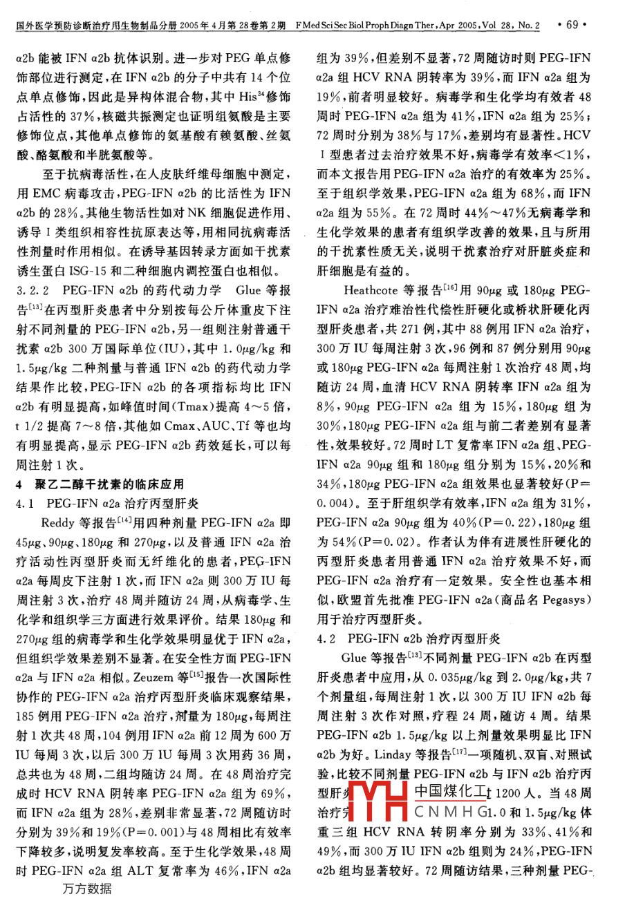 國外醫(yī)學(xué)預(yù)防診斷治療用生物制品分冊2005年4月第28卷第2期 FMed Sci Sec Biol Proph Diagn Ther.,Apr200vol28,No.2·67聚乙二醇干擾素童葵塘綜述【摘要】聚乙二醇(PEG)具有溶解性良好、毒性很小和無抗原性的特性。PEG修飾蛋白質(zhì)使分子量增加,在體內(nèi)半衰期延長,可以減少用藥次數(shù),提高治療效果。本文對PEG的結(jié)構(gòu)、性狀、對干擾素修飾的方法、修飾后的藥代動力學(xué)和臨床效果進行綜述。PEG修飾重組人干擾素a2a和PEG修飾重組人干擾素a2b在體內(nèi)藥代動力學(xué)均有明顯改善,半衰期明顯延長。兩種PEG干擾素均已進行臨床試驗。每周注射1次治療丙型肝炎,效果明顯較普通干擾素為好。其安全性與普通干擾素基本相似?!娟P(guān)鍵詞】干擾素;聚乙二醇;丙型肝炎【中圖分類號衛(wèi)R978.7【文獻標(biāo)識碼】A【文章編號】000-6591(2005)02-0067-05聚乙二醇(PEG)修飾是指一個或幾個PEG分雜質(zhì)引起的雙功能活化PEG未去除;低選擇性和不子吸附于蛋白質(zhì)、多肽等生物分子,改進它們的藥代良反應(yīng)的存在。針對以上問題發(fā)展了第二代PEG修動力學(xué)和藥效學(xué)性狀,使之達到較好的臨床效果。飾劑34,常用的是mPEG丙醛,它對N-末端的選PEG具有獨特的性狀,它在水溶液和大多數(shù)溶劑中擇性很高,因此修飾物的均一性明顯改善,mPEG-溶解良好,毒性很小,對蛋白分子沒有不良作用。丙醛修飾蛋白是通過Sch堿的形式來實現(xiàn),連接PEG本身無免疫原性,能使蛋白質(zhì)不易被蛋白酶降鍵相對穩(wěn)定。所用mPEG的分子量為2000,由于水解而穩(wěn)定性增加,修飾蛋白質(zhì)使分子量增加,不易被合程度高,使修飾物的表觀分子量和表觀體積提高。腎臟代謝而延長藥物在體內(nèi)的半衰期,因此可以減另一個優(yōu)點是除去了由二醇雜質(zhì)產(chǎn)生的雙功能團衍少用藥次數(shù)。由于以上特性,PEG修飾的蛋白和多生物。另一個值得注意的是mPEG-丙醛轉(zhuǎn)化為琥珀肽類藥物的研究有很大發(fā)展。本文對PEG修飾于酰亞胺酯活化酯SPA)。 mPEG-SPA有較理想的反擾素的情況進行綜述應(yīng)性,分子量為2000,二醇含量<1%。分枝形1聚乙二醇mPEG或PEG2是二個線形mPEG通過一個三功PEG是一種長鏈的以重復(fù)的乙二醇氧化乙烯能接頭使之連在一起,另一端和蛋白結(jié)合。它具有傘為基礎(chǔ)結(jié)構(gòu)的大分子聚合物,其分子結(jié)構(gòu)可以是線形,從而更有效保護蛋白,避免蛋白酶對其酶解作用形或分枝形,根據(jù)(OCH2CH2)數(shù)目的不同而有不同和接觸抗體,還可以減少異構(gòu)體的產(chǎn)生(5,分枝的分子量2]。PEG修飾可增加分子量而不增加吸附位點。PEG2-PEG每個分子中有一個羥基由于它反應(yīng)活性NHS40000已用于修飾重組人干擾素a2a。低,為了能在溫和條件下,以較高速率與蛋白偶聯(lián),蛋白質(zhì)分子與PEG偶聯(lián)基團主要有氨基巰基應(yīng)事先對修飾劑進行活化使羥基末端成為能與蛋與羧基-。,其中蛋白質(zhì)分子表面的賴氨酸殘基的白表面功能基團作用。常用的方法是使之帶有適合氨基包括a氨基或e氨基是常被修飾的基團,但游與賴氨酸和氨基末基團作用的反應(yīng)基團,所用的離氨基在蛋白質(zhì)分子中含量較高,具體被修飾部位PEG是單甲氧基PEG(mPEG)1。多種PEG衍生較難定位巰基蛋白分子中含量不高較易做到定點物已應(yīng)用于蛋白質(zhì)的修飾,所用的線性PEG分子量定量修飾羧基修飾首先把PEG分子中羥基轉(zhuǎn)化為在12000以下,常用的二種為單甲氧基聚乙二醇琥氨基珀酸琥珀酰亞胺酯 SS-mPEG)和單甲氧基甲酸琥2翼中國煤化工白質(zhì)的羧基結(jié)合珀酰亞胺酯(SC-mPEG)。存在的問題是修飾劑的分即即是用要根據(jù)被修飾蛋子量偏低;PEG和蛋白的交聯(lián)較弱,穩(wěn)定性差;二醇白的類型、結(jié)構(gòu)和修飾位點,PEG分子量大小是要考慮的重要性狀,此外如修飾劑的質(zhì)量、水解穩(wěn)定作者單位:2002上海生物制品研究所性、反應(yīng)性和選擇性,修飾劑與蛋白質(zhì)之間連接鍵的68·國外醫(yī)學(xué)預(yù)防診斷治療用生物制品分冊2005年4月第28卷第2期 FMed Sci Sec Biol Proph Diagn Ther,Apr2005,vo28,No2穩(wěn)定性,修飾劑的合成是否簡便等在修飾反應(yīng)中找序列和氨基酸組成成分二者相同,僅有的區(qū)別是修出蛋白的最適濃度,二者的最適摩爾比,溶劑和緩沖飾的蛋白在IFNa2a的氨基與PEG分子接觸點形介質(zhì)性質(zhì),溶液的pH,作用時間、溫度,這些都要根成酰胺鍵。據(jù)欲修飾蛋白的特點逐步進行研究,予以優(yōu)化,供制用MDBK/VSV系統(tǒng)測定體外抗病毒活性,備用。PEG-IFN a2a明顯降低,以蛋白含量計算僅為IFN3聚乙二醇修飾重組人干擾素∝a2a的7%。但在動物體內(nèi)的抗腫瘤活性則增強,如3.1 PEG-IFN a2a在小鼠中抑制人腎A498腫瘤細胞的作用,同樣蛋Hoffmann- La roche公司于90年代初曾用白含量的PEG-IFNa2a明顯比IFNa2a為強。mPEG5000修飾IFNa2a,但在194年報告失敗,中和抗體產(chǎn)生情況:PEG-IFNa2a與TFNa2a其原因是5000分子量PEG修飾的IFNa2a半衰期以同樣劑量和方法注射小白鼠,結(jié)果PEG-IFNa2a并未顯著改善2。以后改用分子量40000分枝琥中和抗體產(chǎn)生率明顯降低。珀酸衍生的PEG(PEG2-NHS)。3.1.3PEG-IFNa2a的藥代動力學(xué)動物實驗結(jié)3.1.1IFNa2a的PEG修飾)純化IFNa2a與果表明皮下注射IFNa2a或 PEG-IFN a2a,測定分子量40000的PEG2NHS以1:3摩爾比