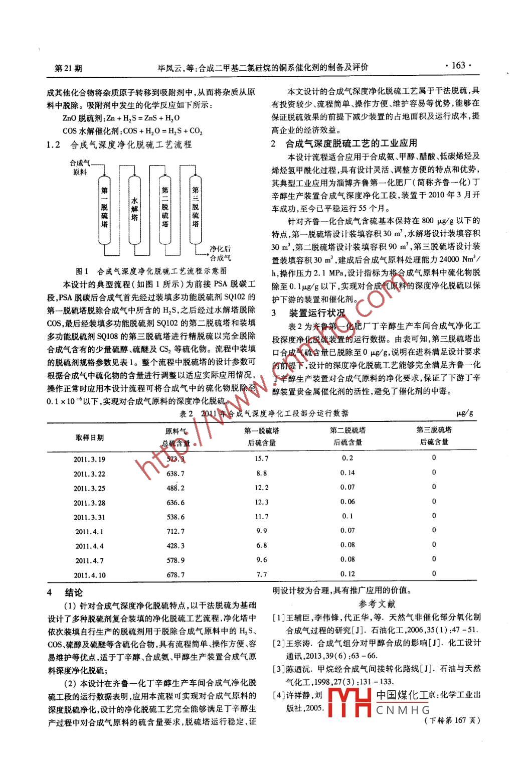 山東化工162SHANDONG CHEMICAL INDUSTRY2015年第44卷合成氣深度凈化脫硫工藝的設(shè)計及工業(yè)應(yīng)用畢鳳云,徐燕杰,仉濤,吳全貴(東營科爾特新材料有限公司,山東東營257000摘要:針對合成氣原料所含硫化物的特點以干法脫硫為基礎(chǔ)設(shè)計了合成氣深度凈化脫硫工藝流程,可用于丁辛醇、合成氨、甲醇生產(chǎn)裝置合成氣原料超深度凈化。齊魯一化丁辛醇生產(chǎn)車間合成氣凈化脫硫工段應(yīng)用情況表明,設(shè)計的合成氣凈化脫硫裝置完全能夠滿足丁辛醇裝置生產(chǎn)對合成氣原料硫含量的要求凈化脫硫塔運行穩(wěn)定、設(shè)計合理。關(guān)鍵詞:合成氣;凈化脫硫;工藝設(shè)計;工業(yè)應(yīng)用中圖分類號:X701.3文獻(xiàn)標(biāo)識碼:A文章編號:1008021X(2015)21-0162-02Design and Industrial Application of Deep Desulfurization Process for SyngasBi Fengyun, Xu Yanjie, Zhang Tao, Wu quanguiDongying Ket New Material Co, Ltd, Dongying 257000, China)Abstract: a deep desulfurization process was designed for syngas and could be used for removing H,s, COS, mercaptanand thioether in the production process of butanol and octanol, ammonia, acetic acid and methanol. The industrialapplication result in the butanol and octanol production unit in the First Chemical Fertilizer Plant of Qilu showed that thedeep desulfurization process designed could completely meet the demand of sulfur content and work properlyKey words: syngas; deep desulfurization process; design; industrial application合成氣( syngas)的主要組成為H2和CO,可以天然氣、至較低水平的優(yōu)點,常被用于精脫硫工段0煉廠氣、石腦油、焦?fàn)t氣、重油、焦炭、煤甚至農(nóng)林廢料和城市本文針對合成氣所含硫化物的特點并根據(jù)工業(yè)應(yīng)用實圾為原料制得,來源較為廣泛。合成氣中H2和CO比際情況,采用干法脫硫多種吸附劑及工藝流程組合的方法設(shè)例據(jù)合成氣來源的不同略有變化,但都在12-3/1之間2)。計了一套合成氣凈化脫硫工藝流程可將原料中的H2S、合成氣是重要的化工原料,可用于合成氨、甲醇、醋酸、低碳COS、硫醇、硫醚等含硫化合物脫除至0.1×10-°甚至更低水烯烴及烯烴氫甲?;^程,同時在碳一化工生產(chǎn)過程占有平,具有流程簡單、操作方便、脫硫率高等特點適于丁辛醇、舉足輕重的地位。合成氨、甲醇生產(chǎn)裝置合成氣原料超深度凈化脫硫在制備合成氣的氣化過程中,煤、重油、焦炭等原料中所1合成氣深度脫硫工藝的設(shè)計含的S、N等雜質(zhì)會轉(zhuǎn)移至合成氣中,這些雜質(zhì)能夠腐蝕設(shè)1.1合成氣深度脫硫原理備、引起下游催化劑中毒、降低后續(xù)產(chǎn)品純度、危害正常的生表1合成氣深度凈化用脫硫劑規(guī)格及指標(biāo)產(chǎn)運行甚至造成安全生產(chǎn)事故1,因此需要對合成氣進(jìn)行凈名稱多功能脫硫劑COs水解劑多功能脫硫劑化精致脫除雜質(zhì)以滿足下一步工藝或裝置對雜質(zhì)的要求。型號QSJ-Ol合成氣所含的雜質(zhì)中危害最大的是含硫化合物包括主要成分活性氧化鋅O3SsiO2+助劑H2S及COs、CS2、硫醇硫醚、噻吩等有機(jī)硫化物6。針對合外觀球狀球狀球狀成氣所含的硫化物雜質(zhì),各大企業(yè)及研究機(jī)構(gòu)投入了大量的人力和物力開發(fā)了多種脫硫工藝及催化劑,這些脫硫工藝整規(guī)格/mmq3~5體上可分為干法脫硫和濕法脫硫兩大類”。干法脫硫包括堆比重/(em)0.6-0707-0.80.6-0吸附法和催化轉(zhuǎn)化法,其中吸附法根據(jù)吸附劑種類分為氧化強(qiáng)度(Ncm)鐵、活性炭、氧化鋅、分子篩等,催化轉(zhuǎn)化法又包括鉆鉬加氫壽命/年≥2和氧化鋅吸附法;濕法脫硫包括化學(xué)吸收法、物理吸收法和采用東營科爾特新材料有限公司與中國石油大學(xué)(北濕式氧化法等。上述脫硫方法在工業(yè)上都有應(yīng)用實例,京)聯(lián)合開發(fā)的多種脫硫劑(表1),以化學(xué)吸附與物理吸附濕法脫硫具有硫容高、處理量大操作簡便但難以將硫化物相結(jié)合的方法脫除合成氣原料中的硫化物。所用的吸附劑脫至較低水平的特點常用于粗脫硫工段。而干法脫硫具有內(nèi)表面含有不同的金屬活性組分,介質(zhì)通過時能夠與原料中工藝流程簡單操作簡單、脫硫精度高、可將原料硫化物脫除含硫合物發(fā)生物理吸附生成表面絡(luò)合物或發(fā)生化學(xué)反應(yīng)生TYH中國煤化工收稿日期:2015-09-11作者簡介:畢風(fēng)云(1986-),女,山東萊蕪人,碩士,現(xiàn)為東營科爾特質(zhì)檢部CNMHG_),山東定陶人,學(xué)士,注冊環(huán)保工程師。第21期畢鳳云,等:合成二甲基二氯硅烷的銅系催化劑的制備及評價163·成其他化合物將雜質(zhì)原子轉(zhuǎn)移到吸附劑中,從而將雜質(zhì)從原本文設(shè)計的合成氣深度凈化脫硫工藝屬于干法脫硫,具料中脫除。吸附劑中發(fā)生的化學(xué)反應(yīng)如下所示有投資較少、流程簡單、操作方便、維護(hù)容易等優(yōu)勢,能夠在znO脫硫劑:zn+H2S=ZnS+H2O保證脫硫效果的前提下減少裝置的占地面積及運行成本,提COS水解催化劑:COS+H2O=H2S+CO2高企業(yè)的經(jīng)濟(jì)效益。1.2合成氣深度凈化脫硫工藝流程2合成氣深度脫硫工藝的工業(yè)應(yīng)用本設(shè)計流程適合應(yīng)用于合成氨、甲醇、醋酸、低碳烯烴及合成氣原料烯烴氫甲酰化過程,具有設(shè)計靈活、調(diào)整方便的特點和優(yōu)勢,其典型工業(yè)應(yīng)用為淄博齊魯?shù)谝换蕪S(簡稱