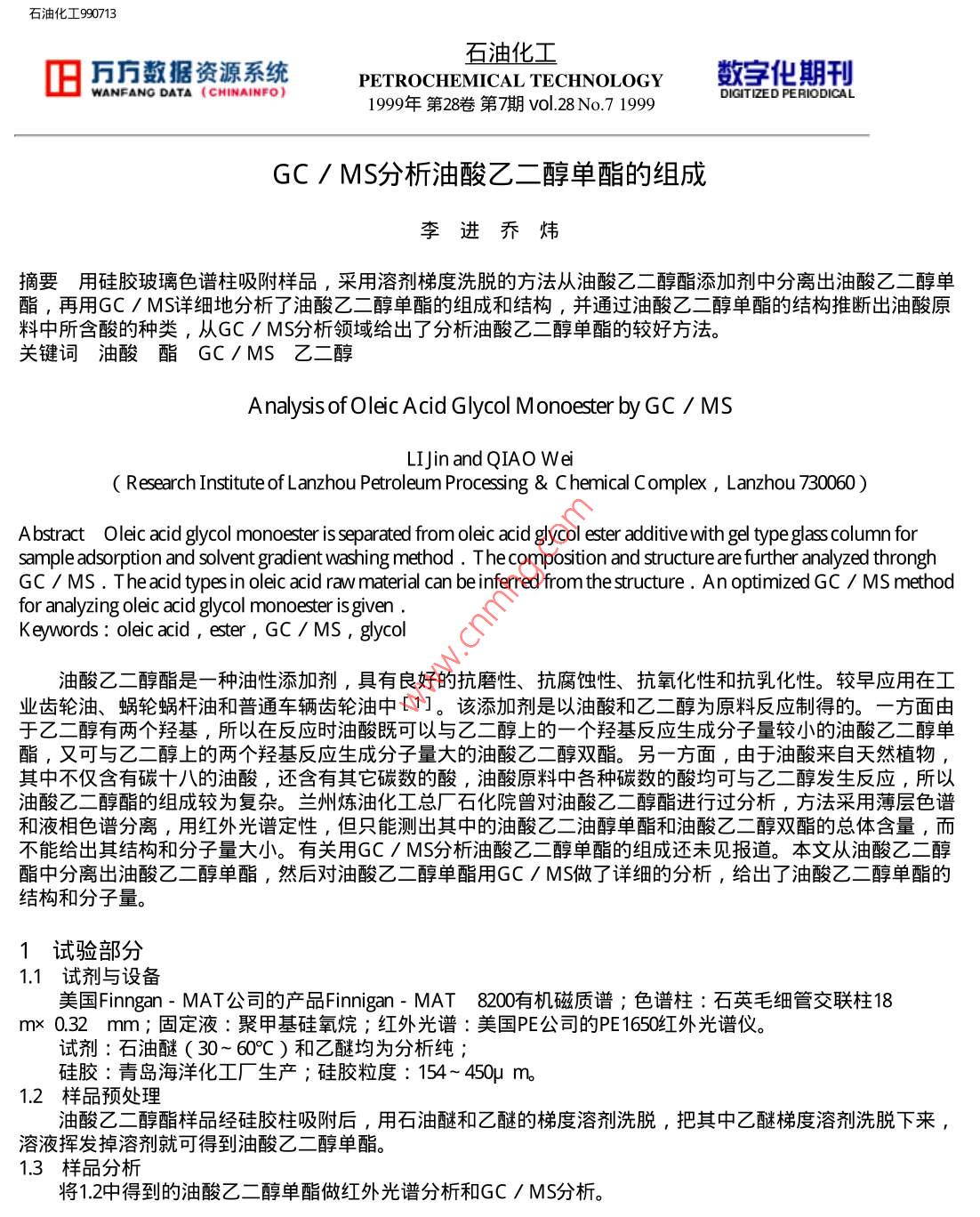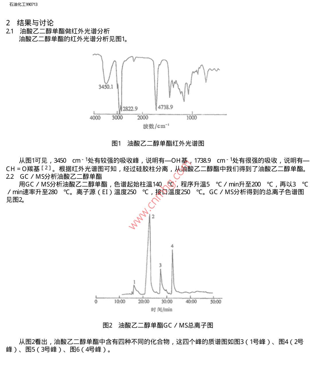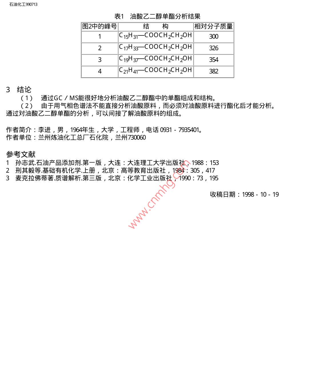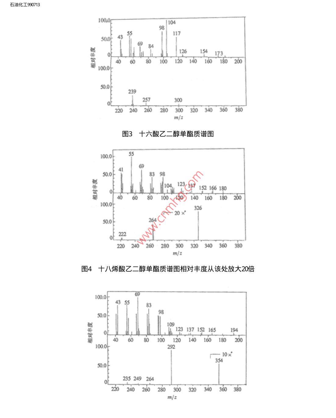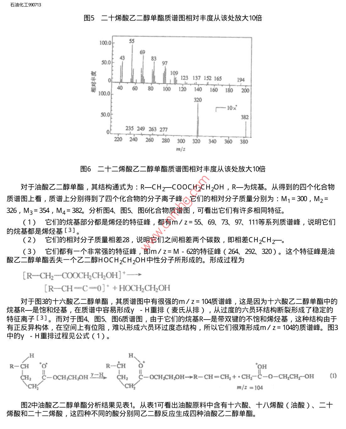 石油化工990713石油化工資源系統(tǒng)數(shù)字化期刊 WANFANG DATA (CH PETROCHEMICAL TECHNOLOGY NFO)1999年第28卷第7期vol.28No.71999 DIGITIZED PERIODICALGC/MS分析油酸乙二醇單酯的組成李進(jìn)喬煒摘要用硅膠玻璃色譜柱吸附樣品,采用溶劑梯度洗脫的方法從油酸乙二醇酯添加劑中分離出油酸乙二醇單酯,再用GC/MS詳細(xì)地分析了油酸乙二醇單酯的組成和結(jié)構(gòu),并通過油酸乙二醇單酯的結(jié)構(gòu)推斷出油酸原料中所含酸的種類,從GC/MS分析領(lǐng)域給出了分析油酸乙二醇單酯的較好方法。關(guān)鍵詞油酸酯GC/MS乙二醇 Analysis of Oleic Acid Glycol Monoester by GC/MS LIJin and QIAO Wei Research Institute of Lanzhou Petroleum Processing Chemical Complex, Lanzhou 730060) Abstract Oleic acid glycol monoester is separated from oleic acid glycol ester additive with gel type glass column for sample adsorption and solvent gradient washing method The composition and structure are further analyzed thronghgc/ms. The acid types in oleic acid raw material can be inferred from the structure. An optimized GC/MS method for analyzing oleic acid glycol monoester is given. Keywords: oleic acid, ester, GC/MS, glycol油酸乙二醇酯是一種油性添加劑,具有良好的抗磨性、抗腐蝕性、抗氧化性和抗乳化性。較早應(yīng)用在工業(yè)齒輪油、蝸輪蝸桿油和普通車輛齒輪油中[1。該添加劑是以油酸和乙二醇為原料反應(yīng)制得的。一方面由于乙二醇有兩個羥基,所以在反應(yīng)時油酸既可以與乙二醇上的一個羥基反應(yīng)生成分子量較小的油酸乙二醇單酯,又可與乙二醇上的兩個羥基反應(yīng)生成分子量大的油酸乙二醇雙酯。另一方面,由于油酸來自天然植物,其中不僅含有碳十八的油酸,還含有其它碳數(shù)的酸,油酸原料中各種碳數(shù)的酸均可與乙二醇發(fā)生反應(yīng),所以油酸乙二醇酯的組成較為復(fù)雜。蘭州煉油化工總廠石化院曾對油酸乙二醇酯進(jìn)行過分析,方法采用薄層色譜和液相色譜分離,用紅外光譜定性,但只能測出其中的油酸乙二油醇單酯和油酸乙二醇雙酯的總體含量,而不能給出其結(jié)構(gòu)和分子量大小。有關(guān)用GC/MS分析油酸乙二醇單酯的組成還未見報道。本文從油酸乙二醇酯中分離油酸乙二醇單酯,然后對油酸乙二醇單酯用GC/MS做了詳細(xì)的分析,給出了油酸乙二醇單酯的結(jié)構(gòu)和分子量。1試驗部分1.1試劑與設(shè)備美國 Finngan-Finnigan-Mt公司的產(chǎn)品-MAT8200有機(jī)磁質(zhì)譜;色譜柱:石英毛細(xì)管交聯(lián)柱18mx0.32mm;固定液:聚甲基硅氧烷;紅外光譜:美國PE公司的PE1650紅外光譜儀。試劑:石油醚(30~60℃)和乙醚均為分析純;硅膠:青島海洋化工廠生產(chǎn);硅膠粒度:154-450m1.2樣品預(yù)處理油酸乙二醇酯樣品經(jīng)硅膠柱吸附后,用石油醚和乙醚的梯度溶劑洗脫,把其中乙醚梯度溶劑洗脫下來,溶液揮發(fā)掉溶劑就可得到油酸乙二醇單酯。1.3樣品分析將1.2中得到的油酸乙二醇單酯做紅外光譜分析和GC/MS分析。石油化工9907132結(jié)果與討論2.1油酸乙二醇單酯做紅外光譜分析油酸乙二醇單酯的紅外光譜分析見圖13450.12822.94738.94000300020001000波數(shù)/cm圖1油酸乙二醇單酯紅外光譜圖從圖1可見,3450cm-1處有較強(qiáng)的吸收峰,說明有一OH基,1738.9cm-1處有很強(qiáng)的吸收,說明有一CH=0羰基[2根據(jù)紅外光譜圖可知,經(jīng)過硅膠柱分離,從油酸乙二醇酯中我們得到了油酸乙二醇單酯。2.2GC/MS分析油酸乙二醇單酯用GC/MS分析油酸乙二醇單酯,色譜起始柱溫140℃,程序升溫5/min升至200℃,再以3/min速率升至280C。離子源(EI)溫度250℃,接口溫度250C。GC/MS分析得到的總離子色譜圖見圖22010:00200030:0040:0050:00時間/min圖2油酸乙二醇單酯GC/MS總離子圖從圖2看出,油酸乙二醇單酯中含有四種不同的化合物,這四個峰的質(zhì)譜圖如圖3(1號峰)、圖4(2號峰)、圖5(3號峰)、圖6(4號峰)。石油化工99071310001049500431176984趙拼012615417340608010012014016018020100.050.0239257300220240260280300320340360380m圖3十六酸乙二醇單酯質(zhì)譜圖100.055416950.08398趙1041231372166180406080100120140160180200100.03265000220240260280300320340360380圖4十八烯酸乙二醇單酯質(zhì)譜圖相對豐度從該處放大20倍100.043558350.0冊買109123137152165194406080100120140160180200100029210×35450.0235249264220240260280300320340360380 m/z石油化工990713圖5二十烯酸乙二醇單酯質(zhì)譜圖相對豐度從該處放大10倍100050.0438109123137152165194100.040608010012014016018020320-1050.038223524926327220240260280300320340360380 m/z圖6二十二烯酸乙二醇單酯質(zhì)譜圖相對豐度從該處放大10倍對于油酸乙二醇單酯,其結(jié)構(gòu)通式為:RC2 COOCH22Ch2OH為烷基。從得到的四個化合物質(zhì)譜圖上看,質(zhì)譜上分別得到了四個化合物的分子離子峰,它們的相對分子質(zhì)量分別為:M1=300,M2=326,M3=354,M4=382。分析圖4、圖5、圖6化合物質(zhì)譜圖,可看出它們有許多相同特征。(1)它們的烷基部分都是烯烴的特征峰,都有m/Z=55、69、73、97、111等系列質(zhì)譜峰,說明它們的烷基都是烯烴基[3]。(2)它們的相對分子質(zhì)量相差28,說明它們之間相差兩個碳數(shù),即相差C2C2(3)它們都有一個非常強(qiáng)的特征峰,即m/Z=M-62的特征峰(264、292、320)。這個特征峰是油酸乙二醇單酯丟失一個乙二醇HOCH2CH2OH中性分子所形成的。形成過程為 [R-CH2-COOCH2CH2OH]+ [R-CH-C=]*+HOCH2CH2OH對于圖3的十六酸乙二醇單酯,其質(zhì)譜圖中有很強(qiáng)的/z=104質(zhì)譜峰,這是因為