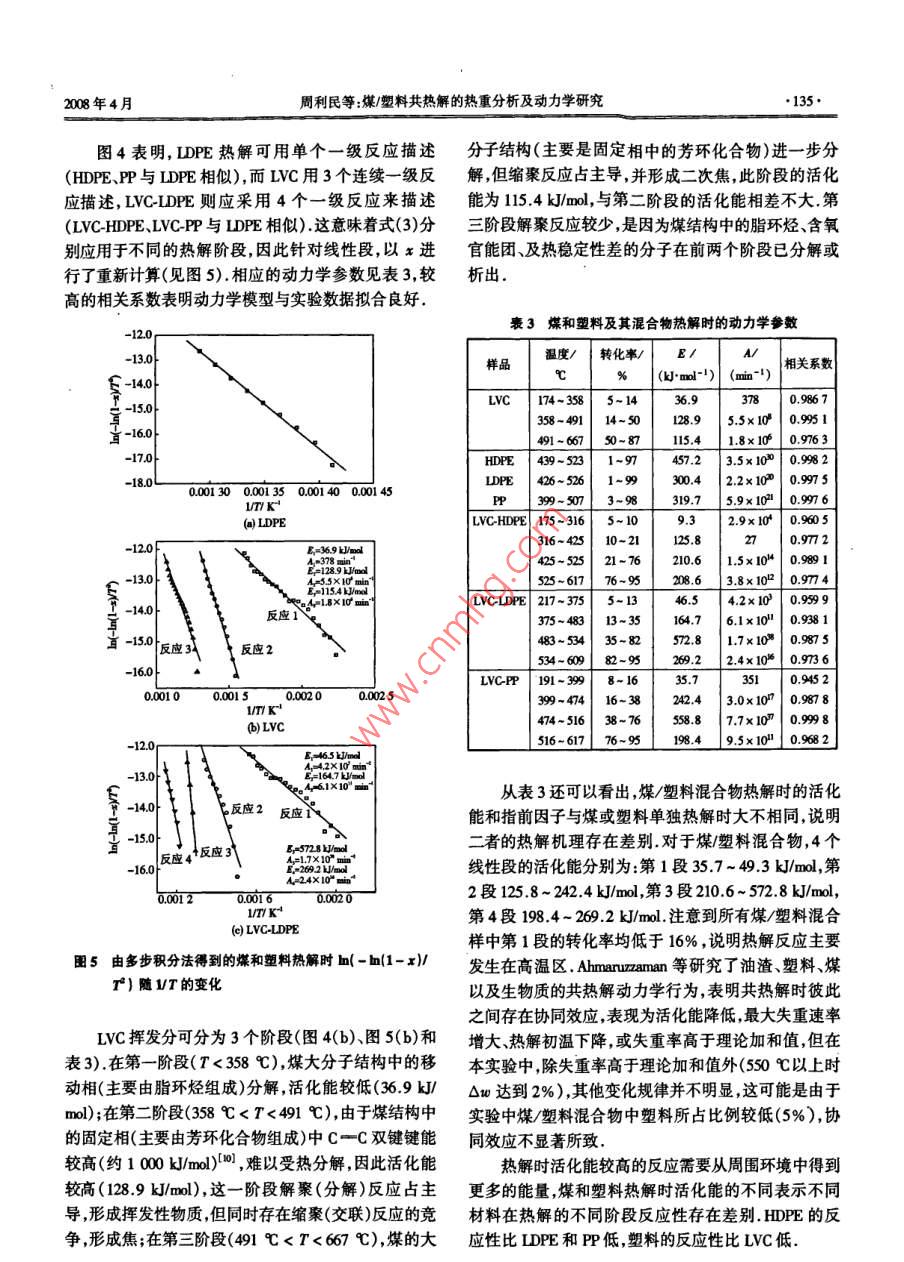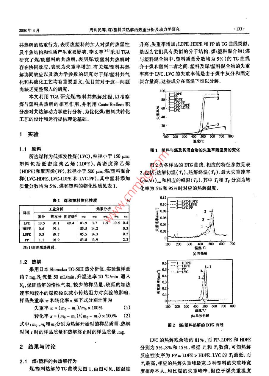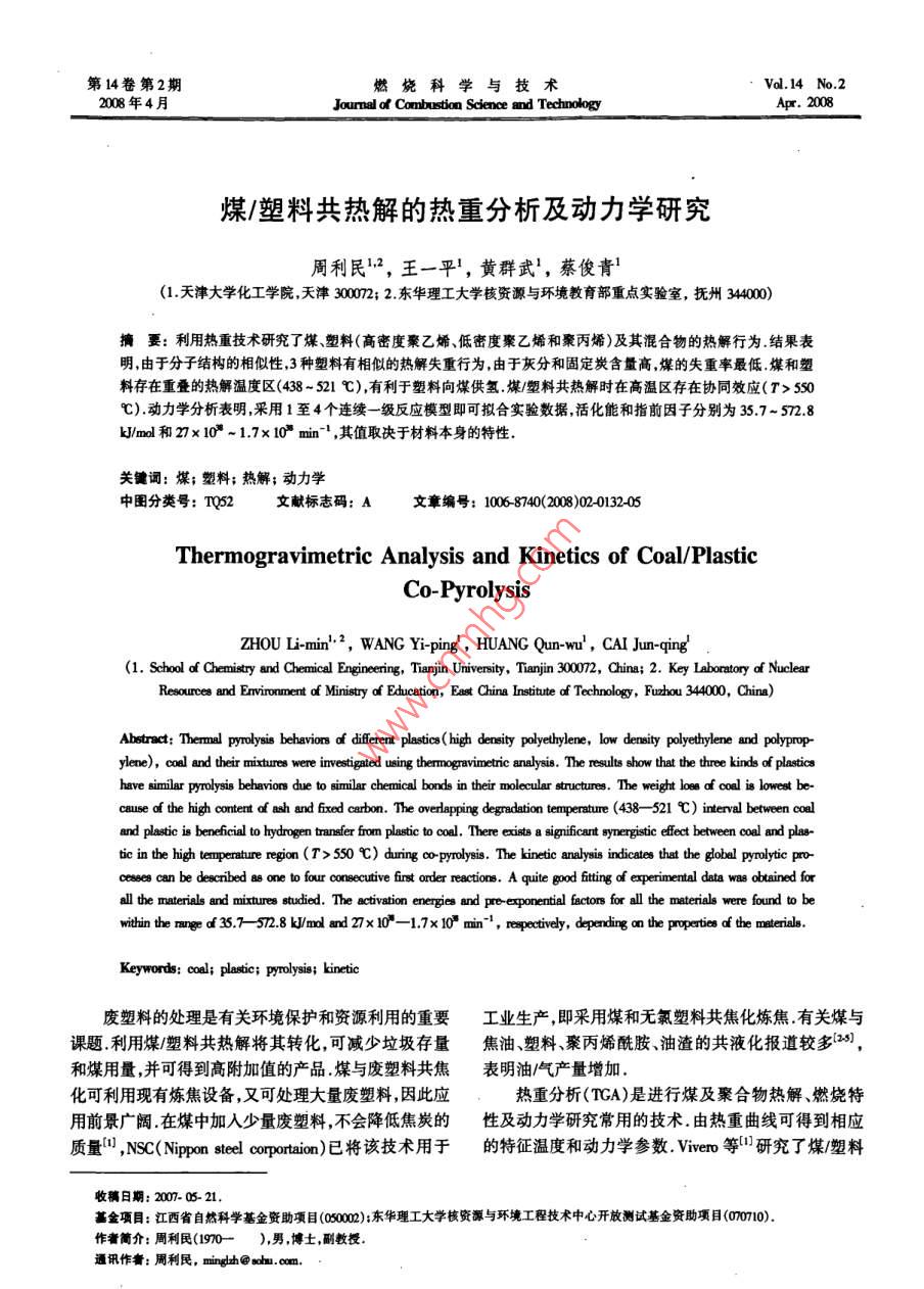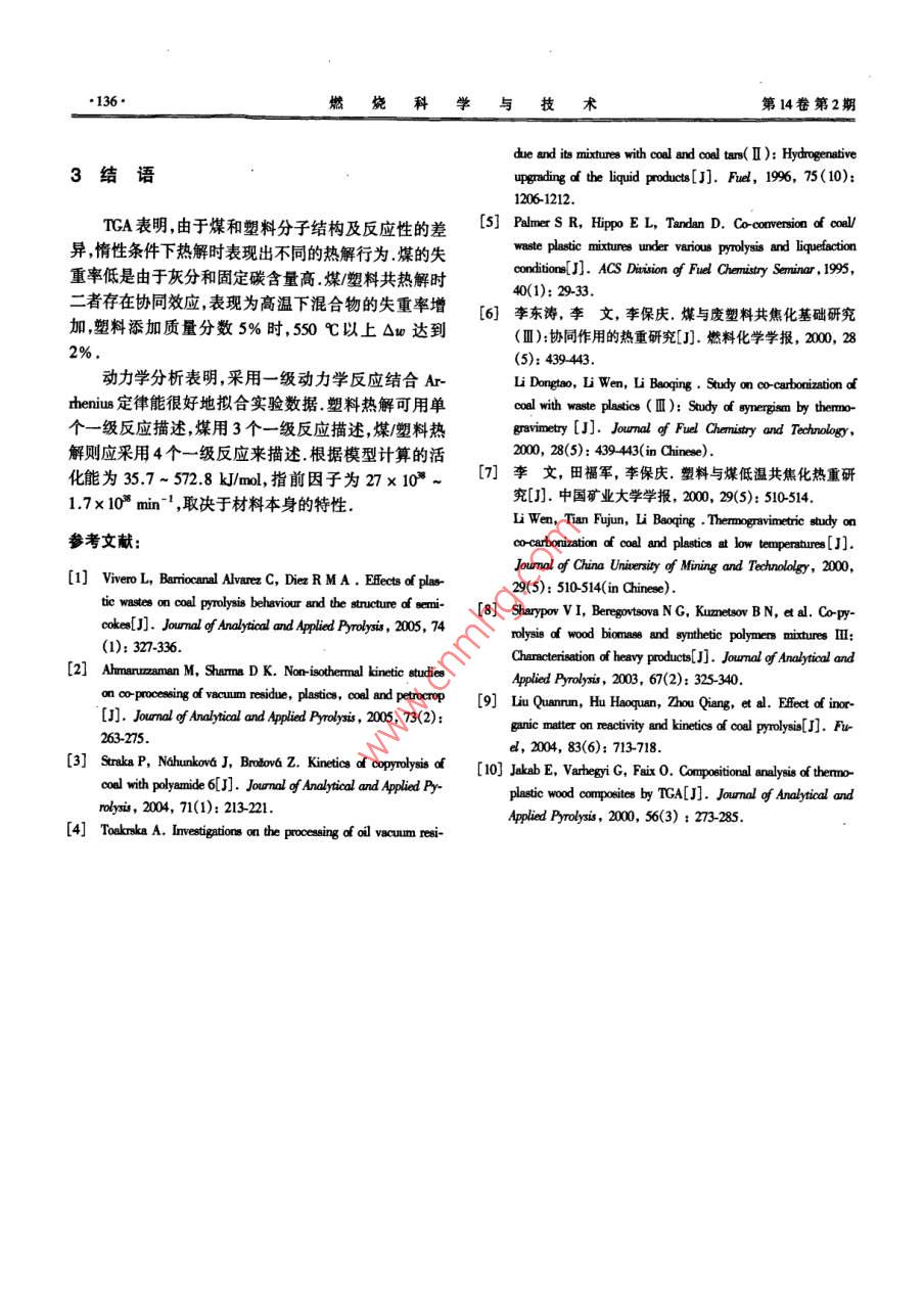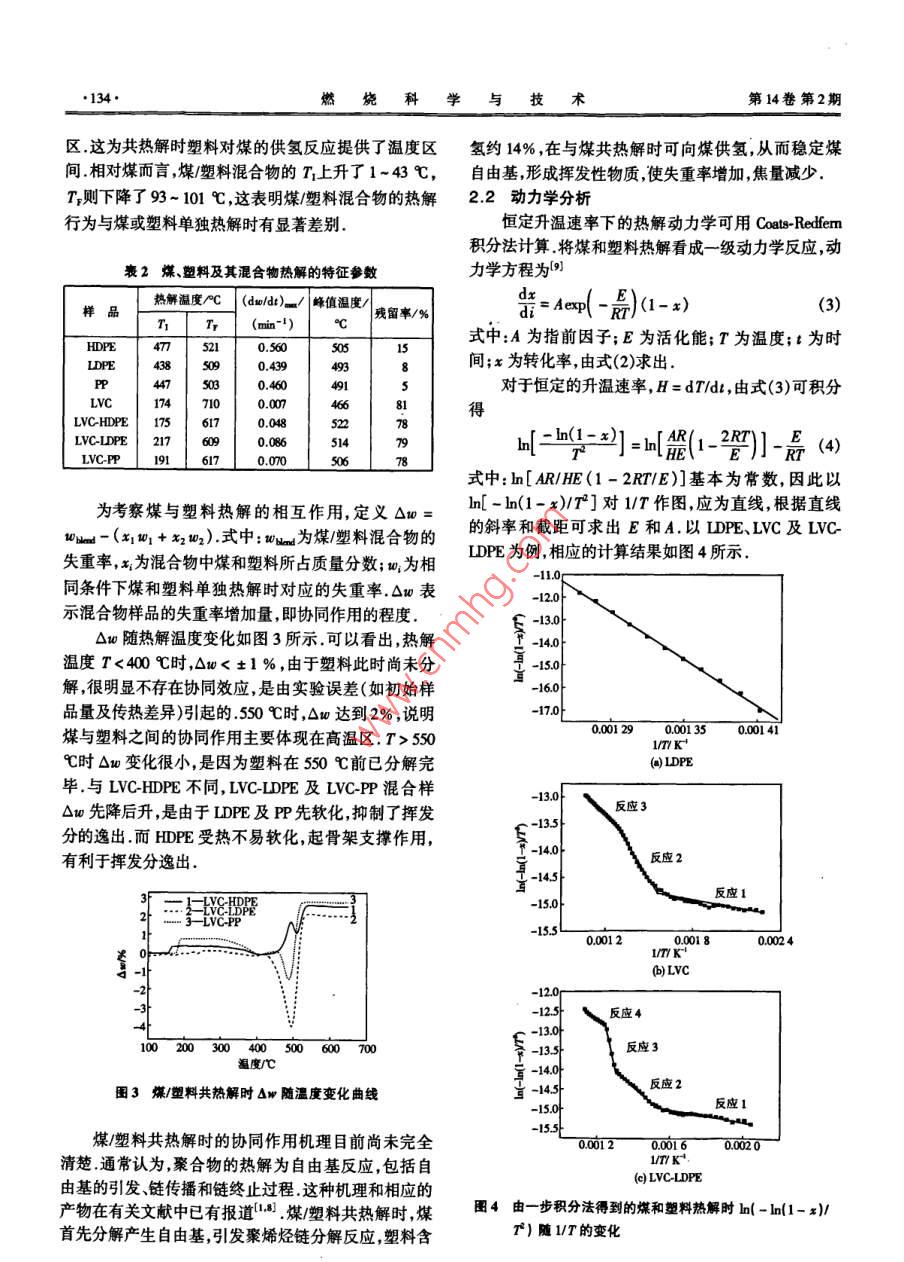 第14卷第2期燃燒科學(xué)與技術(shù)Vol.14 No.22008年4月Joumnal of Combustion Science and TechnologyApr.2008煤/塑料共熱解的熱重分析及動(dòng)力學(xué)研究周利民"2,王一平1,黃群武',蔡俊青'(1.天津大學(xué)化工學(xué)院,天津30002;2 2.東華理工大學(xué)核資源與環(huán)境教育部重點(diǎn)實(shí)驗(yàn)室,撫州34000)摘要:利用熱重技術(shù)研究了煤、塑料(高密度聚乙烯、低密度聚乙烯和聚丙烯)及其混合物的熱解行為.結(jié)果表明,由于分子結(jié)構(gòu)的相似性,3種塑料有相似的熱解失重行為,由于灰分和固定炭含量高,煤的失重率最低.煤和塑料存在重疊的熱解溫度區(qū)(438 ~ 521 C),有利于塑料向煤供氫.煤/塑料共熱解時(shí)在高溫區(qū)存在協(xié)同效應(yīng)(T> Ss0C).動(dòng)力學(xué)分析表明,采用1至4個(gè)連續(xù)--級(jí)反應(yīng)模型即可擬合實(shí)驗(yàn)數(shù)據(jù),活化能和指前因子分別為35.7~572.8k/ml和27x 10* ~ 1.7x 10* min~' ,其值取決于材料本身的特性.關(guān)鍵詞:煤;塑料;熱解;動(dòng)力學(xué)中圖分類號(hào): TQ52文獻(xiàn)標(biāo)志碼: A文章編號(hào): 10068740(2008)02-013205Thermogravimetric Analysis and Kinetics of Coal/PlasticCo- PyrolysisZHOU Li-min'2, WANG Yi-ping' , HUANC Qun-wu' , CAI Jun-qing'(1. Schol of Chemisty and Chemical Engineering, Tanjin Univernity, Tanjin 300072, China; 2. Key Laboratory of NuclearResources and Environment of Ministry of Educeation, East China Institute of Technology, Fuhou 344000, China)Abstrat: Thermal pryolysis behaviors df diferent plstio(high density polyethylene, low density ploythylene and polypp-ylene), coal and their mixtures were investigated using thermogavimetic analysis. The resuts show that the three kinds of plasticshave similar prolysis behaviors due to similar chemical bonds in their molecular stucures. The weight loe of coal is lowest be-cuee of the high content of sh and fxoed carbon. The overlapping degradation trature (438- -521 C) inteval between coaland plastic i beneficial to hydrogen tansfer from plastc to coal. There exists a sgificant synengistic efet between coal and plas-tic in the high temperature region (T> 550 C) during co-pyrolys. The kinetic analysis indicate that the global prolyic proceses can be descibed as one to four consecutive finst order reacions. A quite good fting of experimental data wae obtained forll the materials and mixtures studied. The activation energies and preexponential factos for alll the materials were found to bewithin the range of 35.7- 572.8 k/mol and27x 10*- -1.7x 10* min-' , repectively, depending on the propertice of the matrials.Keywords: calal; plasic; prolysis; kinetic廢塑料的處理是有關(guān)環(huán)境保護(hù)和資源利用的重要工業(yè)生產(chǎn),即采用煤和無氯塑料共焦化煉焦.有關(guān)煤與課題.利用煤/塑料共熱解將其轉(zhuǎn)化,可減少垃圾存量焦油、塑料、聚丙烯酰胺、油渣的共液化報(bào)道較多1:28),和煤用量,并可得到高附加值的產(chǎn)品.煤與廢塑料共焦表明油/氣產(chǎn)量增加.化可利用現(xiàn)有煉焦設(shè)備,又可處理大量廢塑料,因此應(yīng)熱重分析(TGA)是進(jìn)行煤及聚合物熱解、燃燒特用前景廣闊.在煤中加入少量廢塑料,不會(huì)降低焦炭的性及動(dòng)力學(xué)研究常用的技術(shù).由熱重曲線可得到相應(yīng)質(zhì)量" ,NSC(Nippon steel corportaion)已將該技術(shù)用于的特征溫度和動(dòng)力學(xué)參數(shù). Vivero等[研究了煤/塑料收稿日期: 200- 0s- 21.基金項(xiàng)目:江西省自然科學(xué)基金資助項(xiàng)目(000);:東華理工大學(xué)核資源與環(huán)境工程技術(shù)中心開放測試基金資助項(xiàng)目(070710).作者簡介:周利民(1970-),男,博士,副教授.通訊作者:周利民,mingh@ ocu.cm.2008年4月周利民等:煤/塑料共熱解的熱重分析及動(dòng)力學(xué)研究.133●共熱解的熱重行為,表明廢塑料的加入對(duì)煤的熱塑性升高,失重率增加;LDPE.HDPE和PP的TG曲線類似,及半焦結(jié)構(gòu)和性質(zhì)產(chǎn)生重要影響.李文等[)采用TCA是因?yàn)樗鼈兙哂蓄愃频姆肿咏Y(jié)構(gòu).煤/塑料混合物(煤研究了煤/廢塑料的共熱解,表明煤/廢塑料共熱解時(shí)與塑料混合物中,塑料質(zhì)量分?jǐn)?shù)均為5% )的TC曲線存在協(xié)同效應(yīng),表現(xiàn)為失重率增加.有關(guān)煤/塑料共熱介于煤和塑料二者之間.塑料及煤/塑料混合物的失重解協(xié)同效應(yīng)以及動(dòng)力學(xué)參數(shù)的研究對(duì)于煤/塑料共氣率高于LVC.LVC的失重率低是由于煤中灰分和固定化和共液化工藝均有重要意義,但目前對(duì)于這一問題炭含量高,這些成分在高溫下難以分解。尚缺乏完整深人的研究.本文利用TGA研究煤/塑料共熱解過程,以考察煤與塑料共熱解的相互作用,并利用Coats Redfem積分法對(duì)共熱解動(dòng)力學(xué)進(jìn)行分析,為優(yōu)化煤/塑料共轉(zhuǎn)化工藝的設(shè)計(jì)和運(yùn)行提供理論基礎(chǔ).201實(shí)驗(yàn)900200300400500600700800溫度/C .1.1原料圖1塑料與煤及其混合物的失率隨溫度的變化所選煤樣為低揮發(fā)性煤(LVC),粒徑小于150 pum;塑料包括低密度聚乙烯(LDPE)、高密度聚乙烯圖2為各樣品的DTG曲線,相應(yīng)的特征參數(shù)見表(HDPE)和聚丙烯(PP) ,粒徑小于500 pm;煤/塑料混合2,包括:熱解初溫(T)、熱解終溫(T,)、最大失重速率樣(LVC-HDPE、LVC-LDPE和LVC-PP) ,其中塑料添加(dw/dt)_和相應(yīng)的峰溫(Tp).其中T和T,分別為轉(zhuǎn)質(zhì)量分?jǐn)?shù)均為5% .煤和塑料的物化性質(zhì)見表1.化率為5%和95 %時(shí)對(duì)