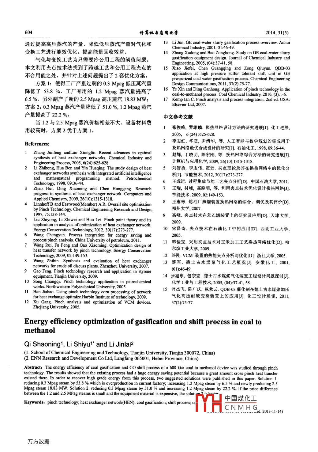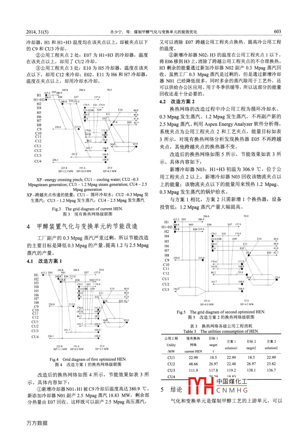 第31卷第5期針算機與應用化學Vol 31. No 52014年5月28日Computers and Applied Chemistryay28,2014煤制甲醇氣化與變換單元的能效優(yōu)化齊少寧1,李士雨李金來2(1.天津大學化工學院,天津,300072;2.新奧科技發(fā)展有限公司,河北,廊坊,065001)摘要:以某60萬噸/年煤制甲醇裝置為背景,選取氣化與變換單元為研究對象,利用夾點技術(shù)對其用能現(xiàn)狀進行了分析,找出違背夾點規(guī)則的不合理換熱匹配并提出2套優(yōu)化方案,結(jié)果如下:方案1:減少副產(chǎn)0.3Mpag蒸汽53.8%(工廠該品質(zhì)蒸汽過剩),增產(chǎn)1.2Mpag蒸汽65%新增產(chǎn)25Mpag蒸汽18.83MW;方案2:減少0.3Mpag蒸汽510%,增產(chǎn)12Mpag蒸汽222%當1.2與2.5Mpag蒸汽價格相差不大、設(shè)備材料費用較高時,方案2優(yōu)于方案1。關(guān)鍵詞:夾點技術(shù);換熱網(wǎng)絡;煤炭氣化;變換;煤制甲醇中圖分類號:TQ5464文獻標識碼:A文章編號:1001-41602014)05-601-604DOI: 10. 11719/com. app. chem20140519工智能法以夾點技術(shù)法4。其中,夾點技術(shù)法由于引言其簡單、直觀、計算量小而得到了廣泛的應用。夾點技氣化和變換是煤制甲醇工藝的上游單元,系統(tǒng)高溫術(shù)在煉油石油化工及其他化工裝置0等都取得物流的溫度高達415℃,而最終要降到40℃左右,因了顯著的節(jié)能效果,但是在煤炭氣化和變換工業(yè)的應用此可以通過副產(chǎn)蒸汽回收系統(tǒng)能量用于后續(xù)單元。根據(jù)報道不多熱力學第二定律可知,能量具有不同的品質(zhì)。高壓蒸汽本文以某廠60萬噸/年煤制甲醇裝置為背景,選取具有的能量品質(zhì)高于低壓蒸汽具有的能量品質(zhì)。故而,處于上游的煤炭氣化與變換單元作為1個系統(tǒng),利用夾可以通過提高高壓蒸汽的產(chǎn)量、降低低壓蒸汽產(chǎn)量對氣點技術(shù)法對該系統(tǒng)的用能現(xiàn)狀進行了分析,在此基礎(chǔ)上化和變換工藝進行能效優(yōu)化,提高能量回收效益提出了2套優(yōu)化方案,顯著降低了低壓蒸汽的產(chǎn)量、提目前運用的能效優(yōu)化方法主要有數(shù)學規(guī)劃法習、人高了高壓蒸汽的產(chǎn)量。HI+H3E05R01Waste waterE10CondensateRo1--gasifier; R02-shift converter; TOl-syngas scrubber; TO2-ammonia scrubber, Vo1-HP flash drum; Vo2--LP flash drum; Vo3--NO Ivacuum flash drum; V04--NO 2 vacuum flash drum; VO5-NO I water separator; V06--NO I water separator; Hi- hot stream i; Cj-cold streamRo-氣化爐;R02—變換爐;τol—洗滌塔;T02—洗氨塔;vol—高壓閃蒸罐;V02—低壓閃蒸罐;V03一第一真空閃蒸罐;V04第二真空閃蒸罐ⅴ05一第一水分離器;v06—第二水分離器:Hi-第i股熱物流;Cj·第j股冷物流Fig 1 Process flowchart of coal gasification and shift units圖1煤炭氣化與變換工藝流程圖中國煤化工收稿日期:2013-08-18;修回日期:2013-11-14CNMHG作者簡介:齊少寧(1987一),女,河北人,碩士研究生, E-mail: shaoning19871016@126com聯(lián)系人:李士雨(1964),男,天津人,博士,教授, E-mail: shylil26@126com602針算機蜀痃用化學2014,31(5)2氣化與變換單元物流分析Aspen Energy analyzer軟件分析得,系統(tǒng)夾點溫度(表2)、平衡總組合曲線(圖2)、以及各品質(zhì)公用工程能量21背景工藝簡介目標(表3)。在此基礎(chǔ)上建立現(xiàn)有換熱網(wǎng)絡(圖3),從以60萬噸年煤制甲醇裝置為背景,水煤漿氣化與而得到現(xiàn)有換熱網(wǎng)絡各公用工程消耗情況(表3)。變換單元的工藝流程簡圖如圖1所示。表2夾點溫度該裝置氣化單元采用德士古水煤漿氣化工藝1314Table 2 Pinch水煤漿與氧氣混合進入氣化爐R01進行氧化反應,出氣夾點T/℃2/℃化爐的氣體去往洗滌塔T01;洗滌塔頂水煤氣去往變換pinch單元;氣化爐、洗滌塔底排出的黑水進入閃蒸系統(tǒng)。公用工程夾點1258該裝置的變換單元采用的是鈷鉬催化劑低溫耐硫工utility pinch公用工程夾點2藝。水煤氣經(jīng)冷卻、閃蒸進入E05預熱,而后去變換爐191.6utility pinch 2R02進行變換反應,反應后的氣體H1被反應氣體C9冷公用工程夾點卻后,與配料氣體H3混合,使H2CO達到2.05±0.05 utility pinch335的設(shè)計要求,送往后續(xù)單元回收熱量。最后進入洗氨TI-hot stream temperature: T2-cold stream temperature塔T02洗去氣體中的氨,塔頂?shù)玫阶儞Q氣去往凈化工序η1-熱物流溫度;2-冷物流溫度2.2工藝物流數(shù)據(jù)只需要冷公用工程或熱公用工程的問題,稱之為閾氣化與變換單元物流提取數(shù)據(jù)如表1所示,其中有值問題。閾值問題的節(jié)能降耗主要在于尋找跨越公用工熱物流8股、冷物流4股;公用工程為循環(huán)冷卻水及03、程夾點的不合理換熱,并提出相應的優(yōu)化措施,降低公12、2.5Mpag發(fā)生蒸汽。需要特別注意的是,現(xiàn)有換熱用工程的品位(降低熱公用工程的溫度或提高冷公用工網(wǎng)絡和改造方案2級聯(lián)圖中的熱物流H1+H3(表1未列程的溫度)1。氣化與變換工藝為只需要冷公用工程的出)。反應后氣體H1與反應氣體C9換熱后,和配料氣閾值問題,因此本文的節(jié)能降耗主要為提高冷公用工程體H3不等溫混合,所得物流為H+H3。但是,在改造的溫度,具體方案為提高高壓蒸汽的產(chǎn)量、降低低壓蒸方案1中為了能夠得到更多的換熱機會、副產(chǎn)更多高品汽的產(chǎn)量、減少冷卻水的消耗量質(zhì)的蒸汽,H1和H3并不混合而是分別冷卻到ⅴ06的入圖2為系統(tǒng)的平衡總組合曲線,圖中也標出了現(xiàn)有口溫度換熱網(wǎng)絡公用工程??梢园l(fā)現(xiàn)現(xiàn)有換熱網(wǎng)絡