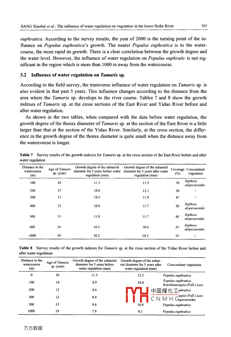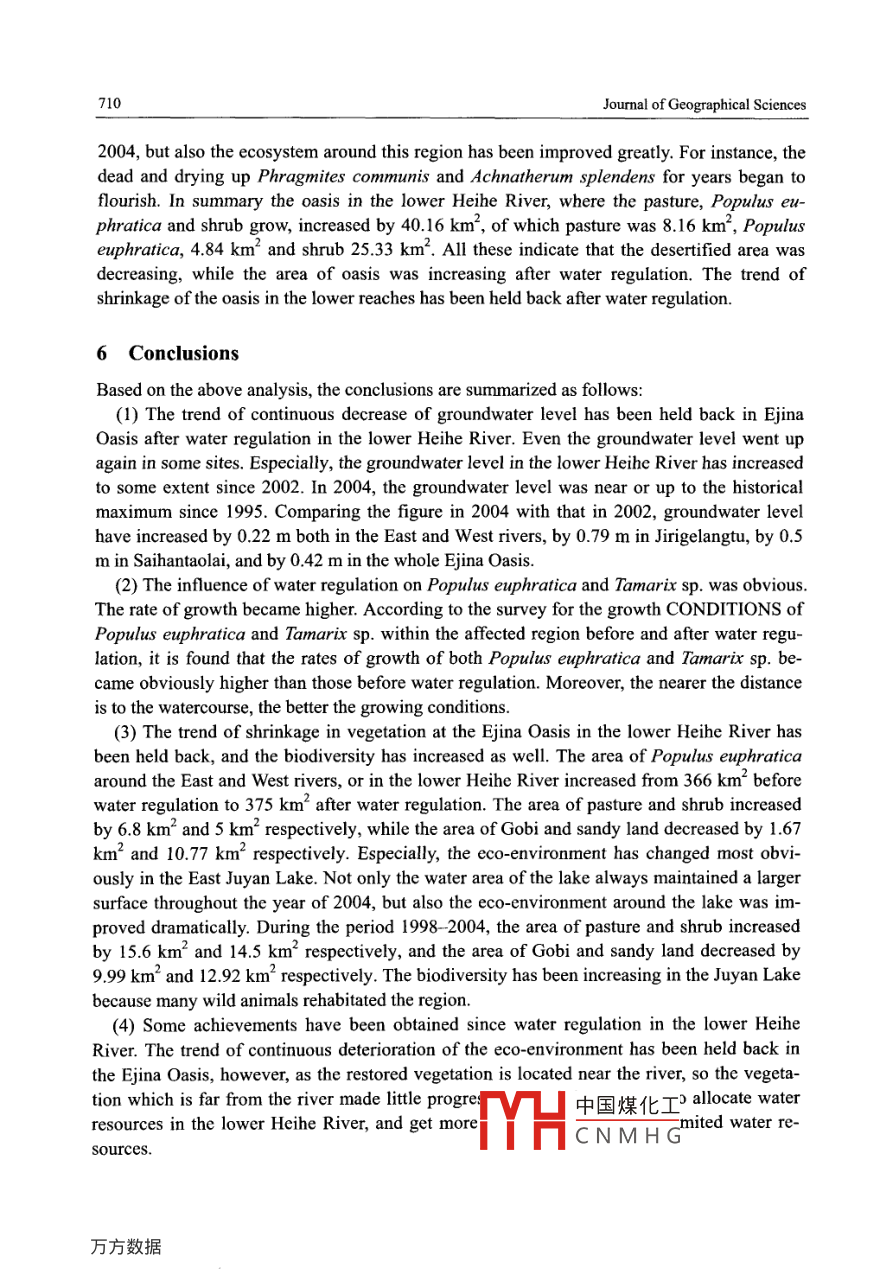 J. Geogr. Sci. 2010, 20(5): 701-711DOI: 10.1007/s11442-010-0805-6◎2010◆Science China Pres勾Springer-VerlagThe influence of water regulation on vegetationin the lower Heihe RiverJIANG Xiaohui', LIU Changming231. Yellow River Institute of Hydraulic Research, YRCC, Zhengzhou 450003, China;2. Collge of Water Sciences, Beiing Normal University, Beiing 100875, China;3. Institute of Geographic Science and Natural Resources Research, CAS, Being 100101, ChinaAbstract: Water regulation has been carried out by the Heihe River Bureau since 2000, whichaims to address the existing eco-environmental problems in the lower Heihe River. In the pastnine years, great changes in spatial-temporal distribution of water resources took place in thelower Heihe River. In order to objectively evaluate the influence of water regulation on theeco-environment, the changes of groundwater table, typical vegetation, landscape types aswell as East Juyan Lake have been analyzed in the lower Heihe River, by means of fieldsurveys and remote sensing. These results indicate that there are obvious effects of waterregulation on the eco-environment, which has been improved toward sustainability in thelower Heihe River.Keywords: water regulation; ecosystem; groundwater; the lower Heihe River1 IntroductionThe Heihe River is the second longest inland river in China, which is called“the MotherRiver" by the Hexi people. With a total drainage area of 142 900 km2 and a total length of821 km, the Heihe River originates from the north of the Qilian Mountain and flows throughQinghai Province, Gansu Province and Inner Mongolian Autonomous Region (including 11counties or banners): Its upper reach is from the above Yingluo Gorge, the middle reach isbetween Yingluo Gorge and Zhengyi Gorge, and the lower reach is from Zhengyi Gorgedownwards. The length of the lower reach is 333 km, and the drainage area is 80,400 km2.The lower reach is about 176 km from Zhengyi Gorge to Langxin Mountain, and is dividedinto the East River and the West River downwards from the diversion in Langxin Mountain.Finally it flows into the East Juyan Lake (Suoguonuoer) and the West Juyan Lake (Gashun-nuoer) respectively. The Ejina Delta oasis formed around the East and West rivers in the in-terior of the Gobi desert has been an important ecological defense against the sandstorms inReceived: 2009-02-27 Accepted: 2009-10-22Foundation: Key National Water Project funded jointly by the Ministng中國煤化工。-stry of Environ-mental Protection and Ministry of Water Resources, No.2:CHC N M H Gft Research In-stitutions Basic Scientifc Research Special Fund, No.HKYAuthor: Jiang Xiaohui (1972-), Ph.D and Senior Engineer, specialized in water resources and water environment.E-mail: jxh3412@163.comwww.scichina.comwww.springerlink.com702Joural of Geographical SciencesNorthwest China.According to historical records, there was abundant vegetation in the lower Heihe River.Furthermore, the famous ancient Juyan-Black City Oasis Culture was fostered in this regionin the 1000 years from the Han Dynasty to the Yuan Dynasty. During the period 1928- -1932,the water area of the East Juyan Lake and the West Juyan Lake spanned 35 km2 and 190 km2respectively, when the Chinese-Swedish Northwest Survey Team investigated the region. In1958, a wet year, the water area of the two lakes spanned 35.5 km' and 267 km' respectively.At that time, many species of plants, such as Populus euphratica, Elaeagnus angstifolia,Tamarix sp, Haloxylon ammodendron, Nitraria sibirica, Glycyrrhiza uralensis, Phragmitescommunis etc., flourished on both banks of the Ejina Delta and around the East Juyan, WestJuyan and Gurinai lakes. In the past 50 years, owing to water extraction in the upper andmiddle reaches, water supply for industrial and agricultural purposes, although the dischargein Yingluo Gorge has not significantly changed, the flow in Zhengyi Gorge has decreasedrapidly since the 1980s (Figure 1), and less water entered into the lower Heihe River. Owingto the lack of water in the lower Heihe River, the oasis became seriously desertified, lakesdried up, and the water quality deteriorated. The carrying capacity of pasture declinedsharply and several rare animals disappeared (Zhong et al, 2002; Cao et al, 2004; Yang etal, 2005; Zhang et al, 2002; Wang et al, 1998; Luo et al, 2003; Tang et al, 2009).2(1816, 14品12復(fù)108+Yingluo Gorge1954 1959 1964 1969 1974 1979 1984 1989 1994 1999 2004Figure 1 The 10 years moving average flow of Zhengyi Gorge and Yingluo Gorge from 1954 to 2004In order to increase water supply and avoid deterioration of the ecosystem in the lowerHeihe River, the unified management system and the new regulation were implemented inthe Heihe River. In 1999, the Heihe River Bureau of the Yellow River Conservancy Com-mission (YRCC) under the Ministry of Water Resources (MWR )was authorized andfounded. Since 1999, the water resources in this basin have been managed and regulateduniformly. Since the end of 1999, water resources uniform regulation has been initiated, andthe water user in the middle Heihe River reduce中國煤化ired to the lowerHeihe River. After several years of water regudistribution ofwater resources has changed dramatically in the ::TYHCNMHGutflow from themiddle reach has increased year by year. In terms of the relation of water diversion curve, itis calculated that when the average inflow at Yingluo Gorge is 1 .58 billion m', the averageoutflow at Zhengyi Gorge increased from the average discharge of 0.73 billion m3 beforeJIANG Xiaohui et al: The influence of water regulation on vegetation in the lower Heihe River703water regulation during the period 1997-1999 to 0.80 billion m3 in 2000, 0.83 billion m' in2001, 0.90 billion m' in 2002, and 0.95 billion m' in 2003 after water regulation. Especiallythe runoff reached the capital of Ejina town in 2001, to East Juyan Lake with the maximumwater area of 23.5 km2 in 2002 (where there has been no water for 10 years), and to West