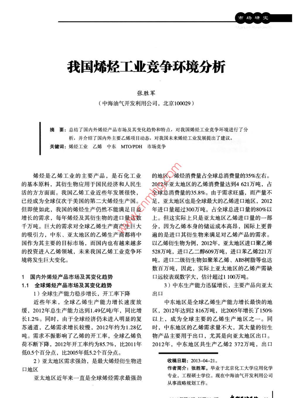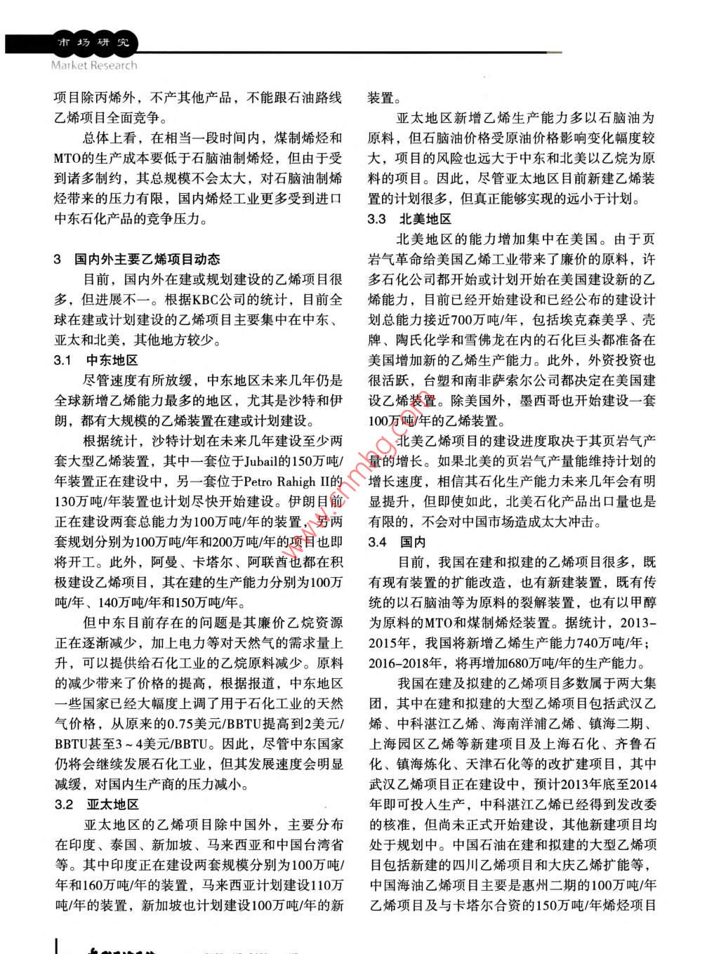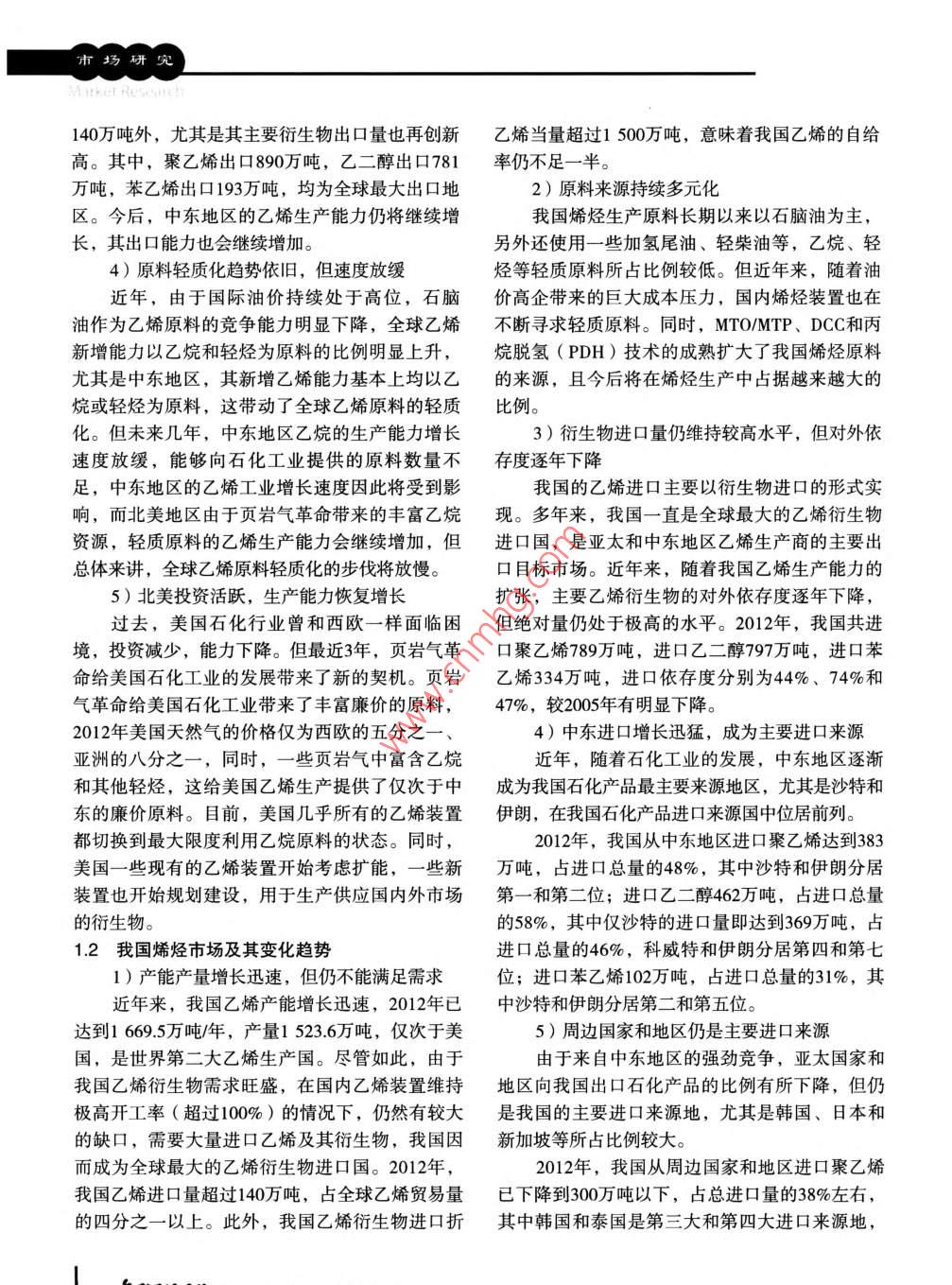 市場(chǎng)研究我國(guó)烯烴工業(yè)競(jìng)爭(zhēng)環(huán)境分析張勝軍(中海油氣開(kāi)發(fā)利用公司,北京100029 )摘要: 總結(jié)了國(guó)內(nèi)外烯烴產(chǎn)品市場(chǎng)及其變化趨勢(shì)和特點(diǎn),對(duì)我國(guó)烯烴工業(yè)競(jìng)爭(zhēng)環(huán)境進(jìn)行了分析,并介紹了國(guó)內(nèi)外主要乙烯項(xiàng)目動(dòng)態(tài),對(duì)我國(guó)未來(lái)烯烴工業(yè)發(fā)展提出了建議。關(guān)鍵詞:烯烴工業(yè)乙烯中東MTO/PDH 市場(chǎng)競(jìng)爭(zhēng)烯烴是乙烯工業(yè)的主要產(chǎn)品,是石化工業(yè).的地區(qū),烯烴消費(fèi)量占全球總消費(fèi)量的35%左右。的基本原料,其衍生物應(yīng)用于國(guó)民經(jīng)濟(jì)和人民生2012年亞太地區(qū)的乙烯消費(fèi)量達(dá)到4 621萬(wàn)噸,占活的方方面面。我國(guó)乙烯工業(yè)近些年發(fā)展很快,全球總消費(fèi)量的35.8%。由于需求旺盛,而產(chǎn)量不已經(jīng)成為全球僅次于美國(guó)的第二大烯烴生產(chǎn)國(guó)。足,亞太地區(qū)也是全球最大的乙烯進(jìn)口地區(qū), 2012但即使如此,我國(guó)的烯烴生產(chǎn)仍然不能滿(mǎn)足日益年進(jìn)口量超過(guò)300萬(wàn)噸,占全球總進(jìn)口量的80%以增長(zhǎng)的需求,每年烯烴及其衍生物的進(jìn)口量達(dá)數(shù)上。但這實(shí)際上只是亞太地區(qū)乙烯進(jìn)口量的一部千萬(wàn)噸。巨大的需求對(duì)全球乙烯生產(chǎn)商產(chǎn)生巨大分,因?yàn)橐蚁┍旧淼膬?chǔ)運(yùn)成本高昂,國(guó)際上更普的吸引力,中東、亞太地區(qū)的乙烯生產(chǎn)商都將中遍的是進(jìn)口其衍生物來(lái)滿(mǎn)足對(duì)乙烯產(chǎn)品的需求。國(guó)作為其主要的目標(biāo)市場(chǎng),而國(guó)內(nèi)也有越來(lái)越多以乙烯衍生物為例,2012年,亞太地區(qū)進(jìn)口聚乙烯的投資進(jìn)入乙烯領(lǐng)域,未來(lái)我國(guó)乙烯工業(yè)競(jìng)爭(zhēng)環(huán)528萬(wàn)噸,進(jìn)口乙二醇609萬(wàn)噸,進(jìn)口苯乙烯221萬(wàn)境將發(fā)生巨大變化。噸,進(jìn)口二級(jí)衍生物如聚苯乙烯、ABS樹(shù)脂等也達(dá)數(shù)百萬(wàn)噸,因此,實(shí)際上亞太地區(qū)的乙烯產(chǎn)需缺1國(guó)內(nèi)外烯烴產(chǎn) 品市場(chǎng)及其變化趨勢(shì)口遠(yuǎn)較表觀(guān)數(shù)字大,估計(jì)超過(guò)1 100萬(wàn)噸。1.1 全球烯烴產(chǎn) 品市場(chǎng)及其變化趨勢(shì)3)中東生產(chǎn)能力迅猛增長(zhǎng),主要產(chǎn)品向亞太1)全球生產(chǎn)能力穩(wěn)步增長(zhǎng),開(kāi)工率下降出口近些年來(lái),全球乙烯生產(chǎn)能力增長(zhǎng)速度放中東地區(qū)是全球乙烯生產(chǎn)能力增長(zhǎng)最快的地緩,2012年總生產(chǎn)能力達(dá)到1.49億噸/年,同比增區(qū),2012年 達(dá)到2816萬(wàn)噸,比2005年增長(zhǎng) 了150%長(zhǎng)1.2%。同時(shí),由于全球經(jīng)濟(jì)仍未進(jìn)人明顯的復(fù)以上,成為全球主要的乙烯生產(chǎn)地區(qū)之一。同蘇通道,乙烯需求增長(zhǎng)較慢,2012年約為1.28億時(shí),中東地區(qū)的乙烯需求量不大,其大量的衍生噸。需求不振影響了乙烯的開(kāi)工率,全球乙烯負(fù)物產(chǎn)品主要用于出口,尤其是向亞太地區(qū)出口。荷不斷下降,2012年開(kāi)工率約為85.7%,比2011年2012年,中東地區(qū)共生產(chǎn)乙烯2372萬(wàn)噸,出口低0.5個(gè)百分點(diǎn),比2005年低5.2個(gè)百分點(diǎn)。2)亞太地區(qū)需求強(qiáng)勁,是最大烯烴衍生物進(jìn)收稿日期: 2013-04- 21。.口地區(qū)作者簡(jiǎn)介:張勝軍,畢業(yè)于北京化工大學(xué)應(yīng)用化學(xué)亞太地區(qū)近年來(lái)一直 是全球烯烴需求最強(qiáng)勁專(zhuān)業(yè),工程碩士學(xué)位?,F(xiàn)在中海油氣開(kāi)發(fā)利用公司從事戰(zhàn)略規(guī)劃工作。2013年第8期總第224期出化砌?;?3市場(chǎng)研究140萬(wàn)噸外,尤其是其主要衍生物出口量也再創(chuàng)新乙烯當(dāng)量超過(guò)1500萬(wàn)噸,意味著我國(guó)乙烯的自給高。其中,聚乙烯出口890萬(wàn)噸,乙二醇出口781率仍不足一半。萬(wàn)噸,苯乙烯出口193萬(wàn)噸,均為全球最大出口地2)原料來(lái)源持續(xù)多元化區(qū)。今后,中東地區(qū)的乙烯生產(chǎn)能力仍將繼續(xù)增我國(guó)烯烴生產(chǎn)原料長(zhǎng)期以來(lái)以石腦油為主,長(zhǎng),其出口能力也會(huì)繼續(xù)增加。另外還使用-些加氫尾油、輕柴油等,乙烷、輕4)原料輕質(zhì)化趨勢(shì)依舊,但速度放緩烴等輕質(zhì)原料所占比例較低。但近年來(lái),隨著油近年,由于國(guó)際油價(jià)持續(xù)處于高位,石腦價(jià)高企帶來(lái)的巨大成本壓力,國(guó)內(nèi)烯烴裝置也在油作為乙烯原料的競(jìng)爭(zhēng)能力明顯下降,全球乙烯不斷尋求輕質(zhì)原料。同時(shí),MTO/MTP、 DCC和丙新增能力以乙烷和輕烴為原料的比例明顯上升,烷脫氫(PDH)技術(shù)的成熟擴(kuò)大了我國(guó)烯烴原料尤其是中東地區(qū),其新增乙烯能力基本上均以乙的來(lái)源,且今后將在烯烴生產(chǎn)中占據(jù)越來(lái)越大的烷或輕烴為原料,這帶動(dòng)了全球乙烯原料的輕質(zhì)比例?;5磥?lái)幾年,中東地區(qū)乙烷的生產(chǎn)能力增長(zhǎng)3)衍生物進(jìn)口量仍維持較高水平,但對(duì)外依速度放緩,能夠向石化工業(yè)提供的原料數(shù)量不存度逐年下降足,中東地區(qū)的乙烯工業(yè)