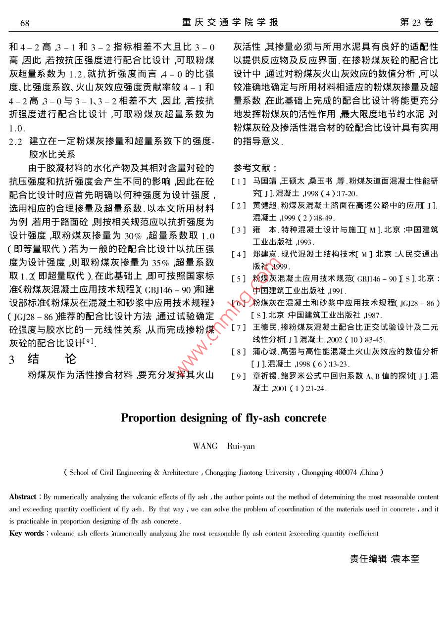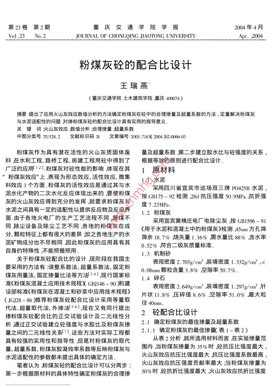 第23卷第2期重慶交通學(xué)院學(xué)報(bào)2004年4月Vo1.23No.2JOURNAL OF CHONGQING JIAOTONG UNIVERSITYApr.2004粉煤灰砼的配合比設(shè)計(jì)王瑞燕重慶交通學(xué)院土木建筑學(xué)院重慶400014)摘要提岀了應(yīng)用火山灰效應(yīng)數(shù)值分析的方法確定粉煤灰在砼中的合理摻量及超量系數(shù)的方法,定量解決粉煤灰與水泥適配性的問題對(duì)摻粉煤灰砼的配合比設(shè)計(jì)具有實(shí)用的指導(dǎo)意義關(guān)鍵詞火山灰效應(yīng)激值分析合理摻量超量系數(shù)中圖分類號(hào)U528.2文獻(xiàn)標(biāo)識(shí)碼B文章編號(hào):001-7162004)2.00603粉煤灰作為具有潛在活性的火山灰質(zhì)固體廢量及超量系數(shù)涕二步建立膠水比與砼強(qiáng)度的關(guān)系,料在水利工程、路橋工程、房建工程用砼中得到了根據(jù)等效的原則進(jìn)行配合比設(shè)計(jì)廣泛的應(yīng)用12]粉煤灰對(duì)砼性能的影響體現(xiàn)在其1原材料″粉煤灰效應(yīng)”上表現(xiàn)為形態(tài)效應(yīng)、活性效應(yīng)、微集料效應(yīng)3個(gè)方面粉煤灰的活性效應(yīng)是通過其與水1水泥采用四川省宜賓市巡場雙三牌PO425R水泥,泥水化產(chǎn)物的二次水化反應(yīng)體現(xiàn)出來的要使粉煤按CB175-9檢測28d抗壓強(qiáng)度50.9Ma抗折強(qiáng)灰的火山灰效應(yīng)得到充分的發(fā)揮就要求粉煤灰與度7.23MPa水泥之間具有一定的適配性以提供反應(yīng)物及反應(yīng)界2粉煤灰面由于各地火電廠的生產(chǎn)工藝流程不同原煤不采用宜賓黃桷莊電廠電除塵灰按GB1596-91同除塵設(shè)備及除塵工藝不同,各地的粉煤灰在成《用于水泥和混凝土中的粉煤灰》檢測A5um方孔篩分顆粒特征上都有很大的差異加之各地生產(chǎn)的水篩余187%燒失量1.16%需水量比8%含水率泥礦物成分也不盡相同因此粉煤灰的應(yīng)用具有其0.52%符合二級(jí)灰質(zhì)量標(biāo)準(zhǔn)自身的特殊性不能照搬照用1.3機(jī)制砂關(guān)于粉煤灰砼配合比的設(shè)計(jì)現(xiàn)階段在我國主表觀密度2.703g/cm3裝填密度1.332gcm3,<要采用的方法有調(diào)整系數(shù)法、超量系數(shù)法、固定粉0.08m顆粒含量3.8%空隙率50.7%煤灰用量法、固定摻量比法等方法3H]現(xiàn)行國家標(biāo)準(zhǔn)《粉煤灰混凝土應(yīng)用技術(shù)規(guī)程XGBJ46-9廂建1.4碎石表觀密度2.649g/cm3裝填密度1.2907g/cm3針設(shè)部標(biāo)準(zhǔn)《粉煤灰在混凝士和砂漿中應(yīng)用技術(shù)規(guī)程》片狀118%壓碎值8.6%空隙率51.0%最大粒JGJ28-86)推薦粉煤灰砼配合比設(shè)計(jì)采用等量取徑40m代法、超量取代法、外摻法56現(xiàn)在又有同行提出摻粉煤灰砼配合比的正交試驗(yàn)設(shè)計(jì)及二元線性分2砼配合比設(shè)計(jì)析通過正交試驗(yàn)建立砼強(qiáng)度與水膠比及粉煤灰摻2.1確定粉煤灰的最佳摻量及超量系數(shù)量之間的二元線性關(guān)系7]這些方法對(duì)實(shí)際工程都2.1.1確定粉煤灰的最佳摻量表1~表2)具有較強(qiáng)的實(shí)用性和指導(dǎo)性但是對(duì)粉煤灰的取代從表2分析就所選用材料而言在實(shí)驗(yàn)摻量范量、超量系數(shù)、粉煤灰膠凝效率系數(shù)等反映粉煤灰與圍內(nèi)當(dāng)粉煤灰摻量為35%時(shí)砼抗壓比強(qiáng)度最大水泥適配性的參數(shù)都未提岀具體的確定方法火山灰效應(yīng)抗壓比強(qiáng)度最大抗壓比強(qiáng)度系數(shù)最高筆者認(rèn)為粉煤灰砼的配合比設(shè)計(jì)可以分兩步火山灰效應(yīng)抗壓強(qiáng)度貢獻(xiàn)率最大當(dāng)粉煤灰摻量為第一步根據(jù)原材料的具體特性確定粉煤灰的合理摻30%時(shí)砼抗折比強(qiáng)度最大火山灰效應(yīng)抗折比強(qiáng)度第2期王瑞燕粉煤灰砼的配合比設(shè)計(jì)67表1配合比及強(qiáng)度測試結(jié)果編號(hào)0水泯kg/m3)粉煤灰kgm3)FF+CC%)膠水比27.9/4.69強(qiáng)度20.9/3.9621.5/3.8423.3/4.1228430.3/34834.1/5.9931.7/42531.2/4.53324/481321/415注表中數(shù)值分子為抗壓強(qiáng)度數(shù)據(jù)分母為抗折強(qiáng)度數(shù)據(jù)表228d火山灰效應(yīng)分8項(xiàng)目1-02-03-04-0基準(zhǔn)砼比強(qiáng)度0.303/0.035摻粉煤灰砼比強(qiáng)度0.3030.0350.401/0.0700.3960.0530.416/0.0600.463/0.0690.494/0.064火山灰效應(yīng)比強(qiáng)度0/00.098/0,0350,093/0.0180,113/0.0250.160/0.0340.191/0.029比強(qiáng)度系數(shù)1.323/2.0001.307/1.5141.373/1.7141.528/1.9711.630/1.830火山灰效應(yīng)強(qiáng)度貢獻(xiàn)率0/023.5/34.434.6/49.3水化反應(yīng)強(qiáng)度貢獻(xiàn)率100/10075,6/50.076.5/66072.858.365.4/50.761.3/54.7注】.表中分子為抗壓強(qiáng)度分母為抗折強(qiáng)度2.表中摻粉煤灰砼比強(qiáng)度〓砼強(qiáng)度/水泥摻量百分?jǐn)?shù)火山灰效應(yīng)比強(qiáng)度=摻粉煤灰砼比強(qiáng)度-基準(zhǔn)砼比強(qiáng)度北強(qiáng)度系數(shù)=摻粉煤灰砼比強(qiáng)度/基準(zhǔn)砼比強(qiáng)度火山灰效應(yīng)強(qiáng)度貢獻(xiàn)率=火山灰效應(yīng)比強(qiáng)度/摻粉煤灰砼比強(qiáng)度冰化反應(yīng)強(qiáng)度貢獻(xiàn)率=100-火山灰效應(yīng)強(qiáng)度貢獻(xiàn)率最大抗折比強(qiáng)度系數(shù)最高火山灰效應(yīng)抗折強(qiáng)度貢泥熟料相對(duì)較少,且膠凝材料的水化反應(yīng)是二次反獻(xiàn)率最大.若砼按抗折強(qiáng)度進(jìn)行設(shè)計(jì)則可選擇粉煤應(yīng)因此其早期的水化反應(yīng)速度比未摻粉煤灰時(shí)慢,灰的摻量為30