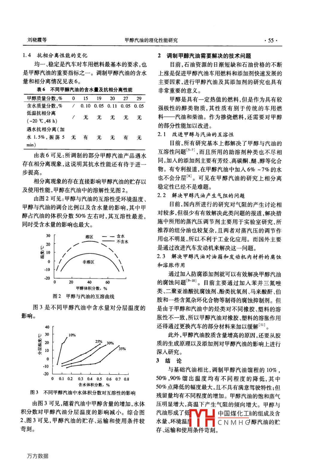 第34卷第4期化學(xué)工業(yè)與工程技術(shù)Vol 34 No 42013年8月Journal of Chemical Industry EngineeringAug,2013甲醇汽油的理化性能研究劉曉霞',張娟利2,楊天華2(1.陜西延長石油(集團)有限責(zé)任公司,陜西西安710075;2.陜西延長石油(集團)有限責(zé)任公司研究院,陜西西安710075)摘要:通過對甲醇汽油餾程、蒸汽壓、實際膠質(zhì)、抗相分離性能等關(guān)鍵理化性質(zhì)的進一步分析,提出了目前調(diào)制甲醇汽油所存在的主要技術(shù)問題。關(guān)鍵詞:甲醇汽油理化性能分析中圖分類號:TE626文獻標識碼:A文章編號:1006-7906(2013)04-0053-04Study on the physical and chemical properties of methanol gasolineLIU XiAoxia, ZHANG Juanli, YANG Tianhua(1. Shaanxi Yanchang Petroleum( Group)Corp. Ltd, Xi'an 710075, Chin2. Shaanxi Yanchang Petroleum( Group)Corp. Ltd. Research Institute, Xi'an 710075, China)Abstract: The key physical and chemical properties of the methanol gasoline including boiling range, vapour pressure, existentgum, anti-phase separation and so on are analyzed, the main problem existed in the modulating process of the methanol gasoline is pro-Key words: Methanol gasoline; Physical and chemical properties; Analysis當前石油資源日益匱乏,甲醇作為來源充分、價積分數(shù)為10%,50%,90%時的餾出溫度均有不同格低廉的可代用燃料具有良好的發(fā)展前景,研究開程度的降低,其中50%點餾出溫度降低的幅度最發(fā)甲醇的摻燒技術(shù)對于緩解目前的石油供需矛盾具大,為42.6℃;甲醇汽油中的甲醇含量越高,其餾程有十分重要的意義,而甲醇汽油的調(diào)配技術(shù)已成為數(shù)據(jù)偏離基礎(chǔ)汽油越遠。甲醇汽油餾出體積分數(shù)目前國內(nèi)研究的熱點。1甲醇汽油的理化性質(zhì)變化分析50%時餾出溫度降低,說明甲醇汽油的平均蒸發(fā)性能汽油中加入甲醇后,其物理性質(zhì)的變化主要集好因而發(fā)動機的加速性能好,反應(yīng)靈敏,運轉(zhuǎn)平穩(wěn)。中在餾程、蒸汽壓、實際膠質(zhì)、抗相分離性能以及氧為了進一步評價甲醇汽油餾程特性的優(yōu)劣,將含量上?;A(chǔ)汽油、甲醇汽油及具有滿意駕駛特性的汽油餾1.1餾程的變化程特性上、下限數(shù)據(jù)列于表11。不同甲醇汽油與基礎(chǔ)汽油的餾程數(shù)據(jù)對比見由表1可見:基礎(chǔ)汽油與不同甲醇汽油的餾程數(shù)據(jù)均符合GB17930-2006《車用無鉛汽油》對汽基礎(chǔ)汽油油餾程的技術(shù)要求;基礎(chǔ)汽油的餾程數(shù)據(jù)均在滿意0%的甲醇汽油含甲醇20%的甲醇汽油駕駛特性的汽油餾程溫度范圍內(nèi),但所列甲醇汽油含甲醇27%的甲醇汽油如目150含甲醇30%的甲醇汽的餾出體積分數(shù)50%時餾出溫度普遍低于滿意駕駛特性的77℃餾溫下限,同時也低于64.5℃的甲醇沸點。分析其原因,主要是由于甲醇與汽油形成了大量低沸點的共沸物,而且隨著甲醇含量的增大,終餾點餾出體積分數(shù),%收稿日期:201圖1甲醇汽油與基礎(chǔ)汽油的餾程數(shù)據(jù)對比曲線作者簡介:劉中國煤化工士,工程師,現(xiàn)主要從事石油化工THECNMHG由圖1可見:與基礎(chǔ)汽油相比,甲醇汽油餾出體 Email:135391832化學(xué)工業(yè)與工程技術(shù)2013年第34卷第4期形成的低沸點共沸物增多。與基礎(chǔ)汽油相比,甲醇有升有降,變化不大,但殘留量普遍增大,這說明甲醇汽油餾出體積分數(shù)90%時餾出溫度降低,終餾點則汽油中增加了一些較難揮發(fā),且易形成膠質(zhì)的物質(zhì)。表1甲醇汽油與基礎(chǔ)汽油的餾程特性比較餾出體積分數(shù),%殘留量體汽油類型終餾點積分數(shù)車用汽油的技術(shù)要求(國標Ⅲ)不高于70不高于120不高于190不高于205不大于2EN28所界定餾溫下限的滿意駕駛餾溫上限基礎(chǔ)汽油47.297.4161.2甲醇質(zhì)量分數(shù)為15%的甲醇汽油45.473.9161.0198.0甲醇質(zhì)量分數(shù)為19%的甲醇汽油39.959.4157.0194.9甲醇質(zhì)量分數(shù)為20%的甲醇汽油155.5189.0甲醇質(zhì)量分數(shù)為27%的甲醇汽油153.8甲醇質(zhì)量分數(shù)為29%的甲醇汽油407557140219141.0表2列出了汽油餾出體積分數(shù)10%時餾出溫和日本汽車n=0.7計算所得)34見表4度與開始產(chǎn)生氣阻溫度的關(guān)系2表4不同甲醇汽油的氣阻指數(shù)表2餾程10%的餾出溫度與開始產(chǎn)生氣阻溫度的關(guān)系甲醇質(zhì)量分數(shù),%01519202729餾出體積分數(shù)10%時餾出4050607080蒸汽壓/kPa66.370.474.073.872.573.5溫度/℃氣阻指數(shù)86.4104.0114.6112.3115.2115.5開始產(chǎn)生氣阻溫度/℃137274767可能發(fā)生氣阻的403327272625臨界溫度/℃由表1、表2數(shù)據(jù)可見:基礎(chǔ)汽油開始產(chǎn)生氣阻的溫度約在5℃左右,但摻入甲醇后,開始產(chǎn)生氣阻由氣阻指數(shù)查圖得到發(fā)生氣阻的臨界溫度。由的溫度降至-13~5℃之間??梢娬{(diào)入甲醇后,甲醇表4可見:在使用車型不變的情況下,隨著甲醇質(zhì)量汽油產(chǎn)生氣阻的傾向加大。分數(shù)的增加(小于30%),汽車發(fā)生氣阻的臨界溫度1.2蒸汽壓的變化降低,即發(fā)生氣阻的可能性增大。汽油中加入甲醇對汽油蒸汽壓的影響見表3。1.3實際膠質(zhì)的變化表3甲醇汽油與基礎(chǔ)汽油的蒸汽壓比較實際膠質(zhì)是判斷油品安定性的重要指標之甲醇質(zhì)量分數(shù),%01519202729常用來評定汽油或柴油在發(fā)動機中生成膠質(zhì)的傾蒸汽壓/kPa66.370.474.073.872.573.5向,是判斷油品能否使用和繼續(xù)儲存的重要依據(jù)調(diào)制甲醇汽油的實際