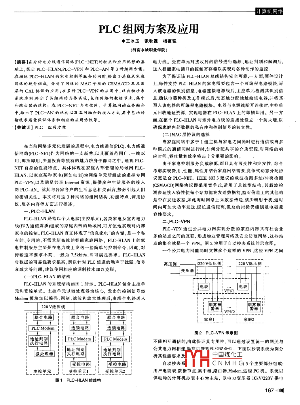 計(jì)算機(jī)網(wǎng)PLC組網(wǎng)方案及應(yīng)用◆王冰玉張秋霞楊富強(qiáng)(河南永城職業(yè)學(xué)院)【摘要】在分析電力線通信網(wǎng)絡(luò)(PLC-NET的特點(diǎn)和應(yīng)用優(yōu)勢(shì)的基電力線。受控單元對(duì)接收到的信號(hào)進(jìn)行選頻、地址判別和解調(diào)后礎(chǔ)上,提出PC- HLAN, PLC-VN和PLC-AN等3種組網(wǎng)方案;送入智能家電接口的控制寄存器以實(shí)現(xiàn)對(duì)各種動(dòng)作的監(jiān)控。在描述PLC-HAN的家電控制等服務(wù)的同時(shí),給出了總線式家庭為了保證該P(yáng)LC-HLAN總線結(jié)構(gòu)安全可靠,一方面硬件設(shè)計(jì)網(wǎng)絡(luò)的硬件組成,分析了網(wǎng)絡(luò)的MAC子層的CSMA/CD及應(yīng)用上,每件支持PLC-HLAN的家電需要包含一個(gè)可編程電路模塊,寫層的CAL協(xié)議的應(yīng)用;在多種PLC-VPN的應(yīng)用中,以自動(dòng)抄表入該電器的識(shí)別信息,電器連接電源線后主控單元檢測(cè)其識(shí)別信系統(tǒng)為例,給出了其組網(wǎng)的具體實(shí)現(xiàn),包括網(wǎng)絡(luò)的數(shù)據(jù)節(jié)點(diǎn)、集中息確認(rèn)電器種類及工作模式后,動(dòng)態(tài)地分配地址給該電器并將其和路由器的結(jié)構(gòu);在PLC-NET與電信網(wǎng)、計(jì)算機(jī)網(wǎng)的業(yè)務(wù)融合寫人該電器的可編程電路模塊。電器與電源線斷開(kāi)連接時(shí)主控單中,給出了PLC-AN的結(jié)構(gòu)以及三網(wǎng)融合的接入方式,其中包括傳元回收地址資源,實(shí)現(xiàn)電器在PLC-HLAN上的即插即用。另一方輸技術(shù)質(zhì)量保證體系和相應(yīng)的應(yīng)用協(xié)議等。面在整個(gè)PLC-HLAN與室外電力線的連接處設(shè)立一個(gè)防火墻,以【關(guān)鍵詞】PLC組網(wǎng)方案確保家庭內(nèi)部數(shù)據(jù)的私有性和控制信號(hào)的獨(dú)立性。(二)MAC層協(xié)議的選擇當(dāng)家庭網(wǎng)絡(luò)中多于1組主機(jī)與家電之間同時(shí)進(jìn)行通信或當(dāng)多在當(dāng)前網(wǎng)絡(luò)多元化發(fā)展的進(jìn)程中電力線通信(PIC電力線通種模式的通信同時(shí)進(jìn)行時(shí)如何分配共享的介質(zhì)資源對(duì)網(wǎng)絡(luò)的響信網(wǎng)絡(luò)( LC-NET)作為網(wǎng)絡(luò)的一支新秀以其覆蓋范圍廣、一線雙應(yīng)時(shí)間、吞吐量和效率將起十分重要的影響用、即插即用、少量投資等獨(dú)有的魅力躋身于群網(wǎng)之中。通觀PLC-由于家電控制服務(wù)負(fù)載較低而且具有可變性和突發(fā)性,綜合NET自身的性能特點(diǎn),具體體現(xiàn)在家庭內(nèi)部管理的局域網(wǎng)PLC-考慮實(shí)現(xiàn)費(fèi)用、性能、屬性并結(jié)合家庭網(wǎng)絡(luò)需要競(jìng)爭(zhēng)式動(dòng)態(tài)分配協(xié)HLAN、以家庭某種家電(例如電表)為網(wǎng)絡(luò)單元所組成的虛擬專網(wǎng)議更適合 PLC-NET。IEEE8023建議的載波檢測(cè)多址/沖突檢測(cè)PLC-VPN,以及滿足共享 Internet資源、提供多種生活服務(wù)的接入( CSMA/CD)網(wǎng)絡(luò)協(xié)議即采用競(jìng)爭(zhēng)式適用于總線型結(jié)構(gòu),其載波檢網(wǎng)PLC-AN。就其與各家各戶的生活息息相關(guān)而言勢(shì)必引起人們的密切關(guān)注。本文將對(duì)這3種網(wǎng)絡(luò)的組網(wǎng)結(jié)構(gòu)、功能特點(diǎn)、調(diào)用協(xié)測(cè)多址接入特性使每個(gè)站都能在發(fā)送數(shù)據(jù)前,監(jiān)聽(tīng)信道上的其他站是否在發(fā)送數(shù)據(jù),如此閑時(shí)網(wǎng)絡(luò)上無(wú)數(shù)據(jù)傳送,減少輻射干擾短時(shí)議、服務(wù)內(nèi)容等方面進(jìn)行描述。間內(nèi)可加大功率發(fā)送,延長(zhǎng)通信距離但總的指標(biāo)仍能滿足電磁兼PLC-HLAN容性要求。PLC-HLAN是指以個(gè)人電腦(主控單元)各類家電及室內(nèi)電力二、PLC-VPN線(作為通信媒質(zhì))組成的家庭內(nèi)部的局域網(wǎng)可方便地實(shí)現(xiàn)對(duì)內(nèi)部PLC-VPN通過(guò)公共電力網(wǎng)實(shí)現(xiàn)分散的家庭內(nèi)部共有社會(huì)業(yè)家電的控制。PLC-HLAN真正體現(xiàn)了“信息家電”的內(nèi)涵,是一個(gè)私有的、專用的、不需重新布線的智能家庭網(wǎng)絡(luò)。PC-HLAN上的家務(wù)的站點(diǎn)之間的互聯(lián),形成物業(yè)管理網(wǎng)絡(luò)及安全防范網(wǎng)絡(luò),這些站點(diǎn)的集合就是一個(gè)ⅤPN。圖2為用于自動(dòng)抄表系統(tǒng)的示意圖電控制服務(wù)主要是在電力線上發(fā)送一些簡(jiǎn)單的控制命令,因此,對(duì)個(gè)公共電力網(wǎng)能同時(shí)支撐多個(gè)這樣的VPN,這些ⅤPN之間傳輸速率要求不高,一般為7.5 kbit/s,即可滿足要求。PLC-HLAN對(duì)數(shù)據(jù)的可靠性要求很高,所以針對(duì)PLC信道的噪聲干擾強(qiáng)、信號(hào)高壓側(cè)220V低壓側(cè)220V低壓衰減大等問(wèn)題,建議使用相應(yīng)的調(diào)制技術(shù)加以克服。變壓器(一)PLC-HLAN的結(jié)構(gòu)PIC-HLAN的系統(tǒng)結(jié)構(gòu)如圖1所示。PC-HLAN包含主控單11電表電表元和受控單元。主控單元以微處理器為核心,發(fā)出的控制信號(hào)經(jīng)VPNModem模塊加以編碼、調(diào)制、濾波和放大處理后,由耦合電路送入220V低壓線1:煙霧警器合電圖}國(guó)合電那1VPN警器[耦合電路i LPLC Modem[選頻電路[選頻電路圖2 PLC-VPN示意圖地址ii DPEC Modem i: [PLC Modem]1執(zhí)行不能相互通信的,由此保