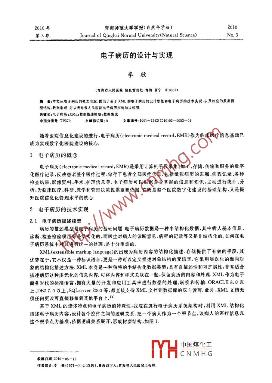 2010年青海師范大學(xué)學(xué)報(bào)(自然科學(xué)版)2010第3期Journal of Qinghai Normal University( Natural Science)No. 3電子病歷的設(shè)計(jì)與實(shí)現(xiàn)李敏(青海省人民醫(yī)院信息管理處,青海西寧810007)摘妻:本文從電子病歷的概念出發(fā).提出了基于XML的電子病歷的設(shè)計(jì)思想和電子病歷的技術(shù)實(shí)現(xiàn),以及相應(yīng)的數(shù)據(jù)模型結(jié)構(gòu).數(shù)據(jù)集成.并以青海省人民醫(yī)院電子病歷實(shí)例加以說(shuō)明.關(guān)鍵詞:電子病歷;XML:數(shù)據(jù)描述模型;數(shù)據(jù)集成中團(tuán)分類號(hào):TP270文獻(xiàn)標(biāo)識(shí)碼:A文章編號(hào):1001-754212010)03 - 0053 -04隨著醫(yī)院信息化建設(shè)的進(jìn)行,電子病歷(electronicmedicalrecord,EMR)作為臨床醫(yī)療信息基礎(chǔ)已成為實(shí)現(xiàn)數(shù)字化醫(yī)院建設(shè)的核心。1電子病歷的概念電子病歷(electronic medical record, EMR)是采用計(jì)算機(jī)手段采集、加工、存儲(chǔ).傳輸和服務(wù)的數(shù)字化醫(yī)療記錄,反映患者整個(gè)醫(yī)療過(guò)程,儲(chǔ)存了患者全部醫(yī)療信息.包括紙張病歷的醫(yī)囑病程記錄、各種檢查結(jié)果、影像資料、手術(shù)、護(hù)理信息等.電子病歷可以根據(jù)自身掌握的信息和知識(shí),主動(dòng)進(jìn)行統(tǒng)計(jì)、分析,為臨床醫(yī)療、科研、教學(xué)和管理決策提供重要依據(jù).它既是整個(gè)醫(yī)院數(shù)字化建設(shè)的基礎(chǔ)架構(gòu),又是提升醫(yī)院信息化管理水平的核心。2電子病歷的技 術(shù)實(shí)現(xiàn)2.1電子病歷 描述模型病歷的描述模型是電子病歷的基礎(chǔ)問(wèn)題.電子病歷數(shù)據(jù)是-種半結(jié)構(gòu)化數(shù)據(jù),其中病人基本信息、診斷.檢查檢驗(yàn)項(xiàng)目等是結(jié)構(gòu)化的,而醫(yī)生對(duì)病人的診斷意見(jiàn)、病程的記錄等又是非結(jié)構(gòu)化的.如何在電子病歷系統(tǒng)中對(duì)其進(jìn)行統(tǒng)-的處理,是十分困難的.XML(extensible markup language)的出現(xiàn)為病歷內(nèi)容的結(jié)構(gòu)化描述、存儲(chǔ)提供了有效的手段.其優(yōu)勢(shì)在于:它不僅是一種標(biāo)識(shí)語(yǔ)言,更是一-種可以定義描述對(duì)象結(jié)構(gòu)的元語(yǔ)言它采用層次化的面向?qū)ο蟮慕Y(jié)構(gòu)化描述方法. XML本身是一種獨(dú)特的半結(jié)構(gòu)化數(shù)據(jù)類型,具有自描述性和可擴(kuò)展性,非常適合描述病歷這種多元化的信息內(nèi)容.可將內(nèi)容和樣式關(guān)聯(lián)在-起,保留病歷的內(nèi)容和外觀. XML作為電子商務(wù)時(shí)代的標(biāo)準(zhǔn)語(yǔ)言,擁有大量的開(kāi)發(fā)和應(yīng)用工具來(lái)進(jìn)行數(shù)據(jù)的處理、轉(zhuǎn)換和傳輸.ORACLE8.0以上.DB2 7.0以上.SQLserver 2000等,都直接支持XML文檔到數(shù)據(jù)庫(kù)的雙向讀寫(xiě).此外,XML文檔無(wú)須任何更改可直接移植到其他平臺(tái)上.以基于XML的諸多特點(diǎn)和電子病歷的特殊性,我院在進(jìn)行電子病歷系統(tǒng)架構(gòu)時(shí),利用XML結(jié)構(gòu)化描述電子病歷內(nèi)容,設(shè)計(jì)各個(gè)控件之間的邏輯關(guān)系.把一一個(gè)病人作為一個(gè)根節(jié)點(diǎn),該病人的醫(yī)療信息以這個(gè)根節(jié)點(diǎn)為基準(zhǔn),依據(jù)邏輯關(guān)系展開(kāi),形成樹(shù)型結(jié)構(gòu),如圖1.中國(guó)煤化工MHCNMHG收稿日期:2010-05-12作者簡(jiǎn)介:李敏(1971-).女(漢族), 青海西寧人,青海省人民醫(yī)院工程師._54青海師范大學(xué)學(xué)報(bào)(自然科學(xué)版)2010年姓名基本信息住院志性別病歷根節(jié)點(diǎn)入院記錄主訴手術(shù)記錄現(xiàn)病史體格檢查首次病程記錄... ++..中. +.我房記錄出院記錄圖1電子病歷的描述模型2.2基于XML的電子病歷集成.電子病歷數(shù)據(jù)來(lái)源于醫(yī)療的各個(gè)環(huán)節(jié)及醫(yī)院信息系統(tǒng)的各個(gè)子系統(tǒng),XML能夠描述不規(guī)則數(shù)據(jù),能夠從不同的來(lái)源集成數(shù)據(jù),將各個(gè)應(yīng)用程序生成的數(shù)據(jù)納人同一個(gè)XML文檔,被解析出來(lái)的數(shù)據(jù)可以在本地存儲(chǔ)、編輯和操縱.因此XML作為集成電子病歷的工具能夠簡(jiǎn)化電子病歷集成系統(tǒng)的實(shí)現(xiàn)(*].實(shí)現(xiàn)框架如圖2所示印.HIS 精礎(chǔ)信息查詢服務(wù)XML訪問(wèn)服務(wù)醫(yī)療信息病歷數(shù)菜電據(jù)庫(kù)管理服務(wù)手術(shù)數(shù)據(jù)權(quán)限PACS/LIS數(shù)據(jù)應(yīng)用服務(wù)圖2基于XML的電子病歷集成3應(yīng)用實(shí)例下面以青海省人民醫(yī)院電子病歷中“出院記錄”的具體實(shí)例,就電子病歷調(diào)用HIS數(shù)據(jù)庫(kù)中信息,以及調(diào)用“ICD~10”知識(shí)庫(kù)的具體實(shí)現(xiàn)作--介紹.中國(guó)煤化工MHCNMH G建立一個(gè)“出院記錄”文件:out_ record. xml,其中病人基本信息部分描還為<