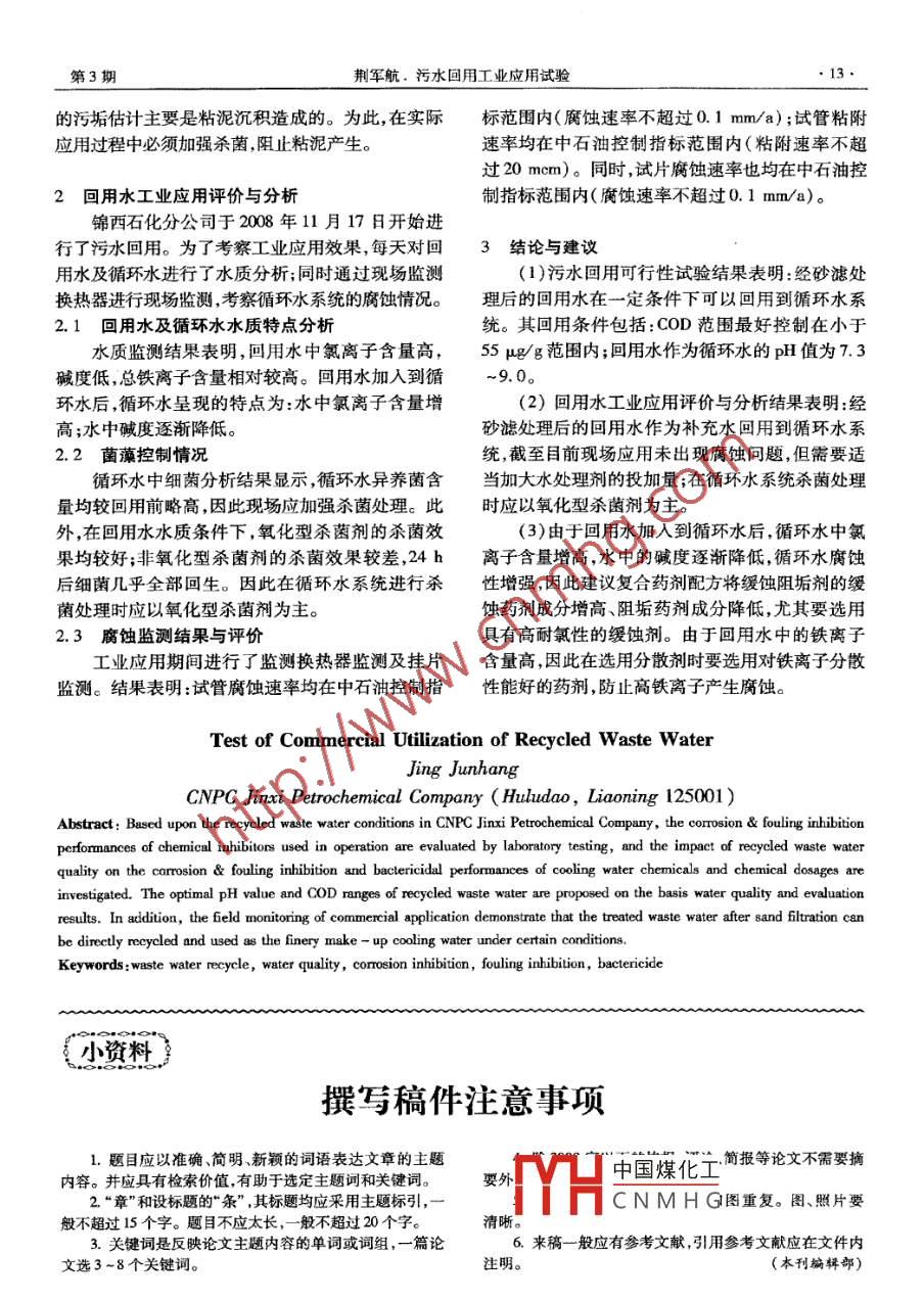 石油。化工腐蝕,與防、護(hù)研究Corrosion & Protection in Petrochemical Industry2009,26(3).10.污水回用工業(yè)應(yīng)用試驗(yàn)荊軍航(中國石油天然氣股份有限公司錦西石化分公司,遼寧葫蘆島125001 )摘要:對中國石油天然氣股份有限公司錦西石化分公司污水回用水的水質(zhì)和各循環(huán)水場現(xiàn)用藥劑的緩蝕阻垢效果及殺菌效果進(jìn)行了實(shí)驗(yàn)室綜合評價(jià),考察了回用水水質(zhì)對循環(huán)水處理藥劑緩蝕阻垢性能、殺菌性能及藥劑加藥量的影響,根據(jù)水質(zhì)情況及藥劑評價(jià)結(jié)果提出了污水回用水的最佳pH值及C0D(化學(xué)耗氧量)值的范圍。此外,還敘述了工業(yè)應(yīng)用后的現(xiàn)場監(jiān)測結(jié)果。工業(yè)應(yīng)用試驗(yàn)表明:在一定條件下,可以成功將砂濾處理污水直接回用于煉油廠循彌水。關(guān)鍵詞:污水回用水質(zhì)緩蝕阻垢殺菌中圖分類號:TC174.4文獻(xiàn)標(biāo)識碼:A文章編號:1007 -015(2009)03 -0010 -04污水回用于循環(huán)冷卻水是解決水資源緊張的1.2實(shí)驗(yàn)用水有效途徑,但由于污水中有機(jī)物、懸浮物含量高,文章中實(shí)驗(yàn)用水分別為采自現(xiàn)場的污水二期成分復(fù)雜,微生物易大量生長并形成生物粘泥,外排水,及污水回用中試砂濾后產(chǎn)出水。且污水中陰陽離子較多,特別是氯離子和硫酸根1.3 污水 回用砂濾后出水的水質(zhì)特征離子等陰離子是新鮮水的好幾倍。因此回用過程將砂濾后產(chǎn)出水的水質(zhì)分析數(shù)據(jù)與新鮮循環(huán)水中所要解決的兩個(gè)難題是腐蝕和微生物的控制。補(bǔ)水的水質(zhì)分析數(shù)據(jù)進(jìn)行綜合對比分析。結(jié)果表中國石油天然氣股份有限公司錦西石化分公司明,動態(tài)砂濾單元出水具有以下特征: COD和氨(以下簡稱錦西石化分公司)污水回用項(xiàng)目設(shè)計(jì)氮較高, 是細(xì)菌生長的養(yǎng)分;水中的腐蝕因子如氯產(chǎn)品水產(chǎn)出能力為560 Vh,其中200 t/h回用于離子、硫酸根離子含量高,堿度低和pH值略低。循環(huán)水補(bǔ)水,還欲將微絮凝過濾單元(砂濾)后1.4砂濾水對藥劑緩蝕性能影響評 價(jià)的產(chǎn)出水直接回用到循環(huán)水,因此要求盡快考察為了考察砂濾后的回用水對藥劑緩蝕性能的回用水對循環(huán)水系統(tǒng)的影響。砂濾后水質(zhì)與初級影響,開展了旋轉(zhuǎn)掛片腐蝕試驗(yàn),考察不同pH再生水控制指標(biāo)相比,砂濾后C0D值高于初級再值和不同COD值的回用水對水質(zhì)腐蝕性及藥劑緩生水控制指標(biāo);與新水補(bǔ)充水相比,水中的腐蝕蝕性能的影響。因子如氯離子、硫酸根離子含量高,其腐蝕性增(1)自然pH值條件下砂濾水腐蝕試驗(yàn):為了加;砂濾后的水腐蝕性強(qiáng)、COD值高。污水回用考察原有藥劑的適應(yīng)性,在自然pH值條件下考察水與補(bǔ)充新水相比其水質(zhì)條件更加復(fù)雜,由于水了砂濾后回用水對藥劑緩蝕性能的影響,不同藥劑質(zhì)的變化,會對循環(huán)水場現(xiàn)用藥劑產(chǎn)生影響。通不同水質(zhì)現(xiàn)場加藥量腐蝕試驗(yàn)結(jié)果見圖1。結(jié)果表過實(shí)驗(yàn)室緩蝕阻垢實(shí)驗(yàn)及殺菌實(shí)驗(yàn)的評價(jià),考察明,在自然pH值砂濾后的回用水水質(zhì)及現(xiàn)場加藥了回用水水質(zhì)對循環(huán)水處理藥劑緩蝕阻垢性能、濃度條件下,所用藥劑的試片腐蝕速率均高于中石殺菌性能及藥劑加藥量的影響,同時(shí)在回用水工油試片標(biāo)準(zhǔn)0. 1 mm/a, 不同藥劑的試片腐蝕速率業(yè)應(yīng)用后進(jìn)行水質(zhì)監(jiān)測和腐蝕監(jiān)測,考察了工業(yè)順序?yàn)镃Q -206小于CLP -401小于HD -02。應(yīng)用污水回用對循環(huán)水系統(tǒng)的影響。(2)自然pH值時(shí)COD和氨氮對腐蝕影響試收稿中國煤化工明: 2009 - 03 -11。1實(shí)驗(yàn) 室可行性試驗(yàn)作者M(jìn)HCNMH G年畢業(yè)于大連理工大.1 實(shí)驗(yàn)方法學(xué)化學(xué)上程系,⊥字傅士,尚級上程師,現(xiàn)為中國石油天旋轉(zhuǎn)掛片腐蝕實(shí)驗(yàn)和殺菌劑評定試驗(yàn)均按照然氣股份有限公司錦西石化分公司研究院院長,曾在中文《冷卻水分析和試驗(yàn)方法》進(jìn)行。核心期刊上發(fā)表過論文數(shù)篇。第3期荊軍航.污水回用工業(yè)應(yīng)用試驗(yàn)11●驗(yàn):為了考察在自然pH值條件下,現(xiàn)用藥劑對下,緩蝕阻垢劑CQ - 206在加藥量為100 μg/g時(shí),COD和氨氮值的適應(yīng)范圍,以污水二期人水為原回用水的pH值為7.3 ~9.0,試片腐蝕速率小于水配制成不同COD和氨氮值的實(shí)驗(yàn)用水,在緩蝕0.1 mm/a, 當(dāng)pH值為8. 0時(shí),藥劑緩蝕效果最好,阻垢劑CQ-206加藥量為100μg/g時(shí)進(jìn)行了旋轉(zhuǎn).當(dāng)pH值小于6.5時(shí),試片腐蝕很嚴(yán)重。掛片腐蝕試驗(yàn),試驗(yàn)結(jié)果見圖2。(4)加堿調(diào)pH值時(shí)砂濾水腐蝕性能考察:試驗(yàn)考察了加堿調(diào)pH值條件下砂濾后回用水對藥劑緩蝕性能的影響,結(jié)果見圖4,5。結(jié)果表明:在自1.0使用現(xiàn)場加藥量條件下,只有緩蝕阻垢劑CQ - 2060.8-沙越后回用水在加藥量為100μg/g時(shí),試片腐蝕率明顯小于0.110.4新水補(bǔ)充水mm/a;當(dāng)加藥量均增加為100 μg/g時(shí),在適當(dāng)?shù)膒H值范圍內(nèi),藥劑HD -02和CLP -401的試片腐CLP-401CQ-206BHD-02 .蝕速率也可以小于0.1 mm/a。
