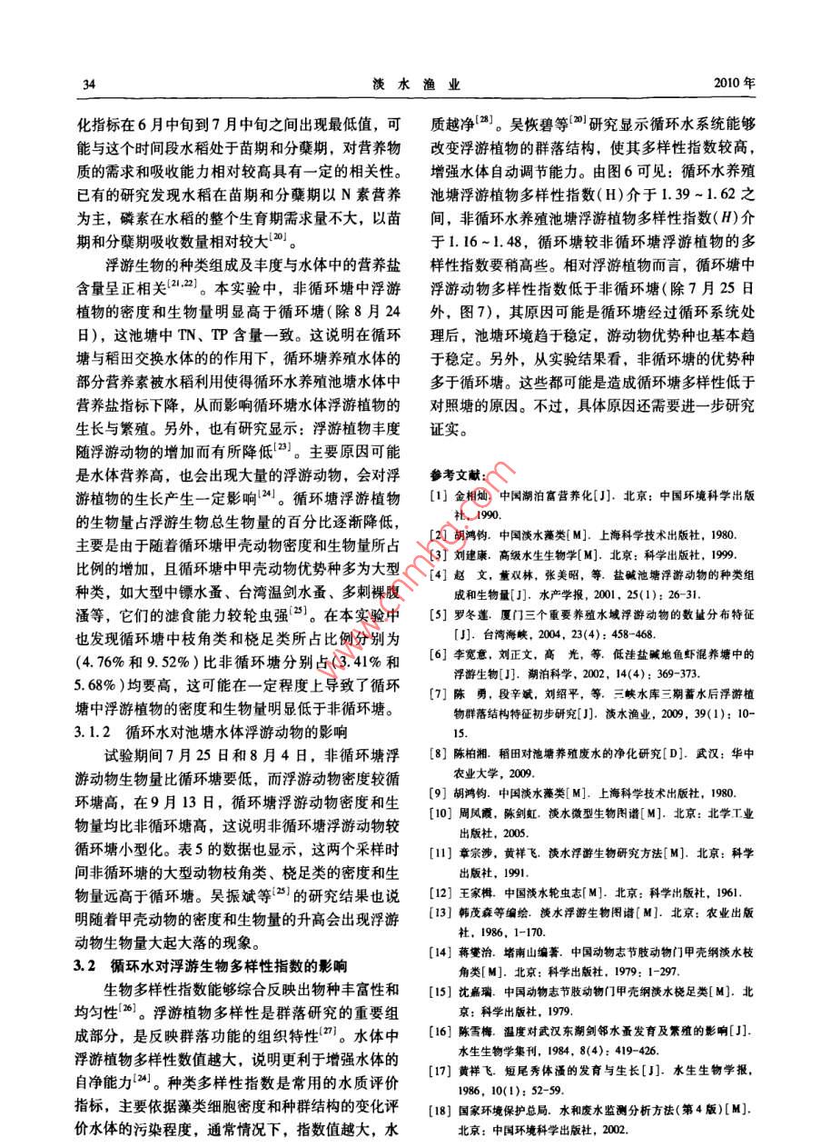 .第40卷第3期淡水漁業(yè)2010年5月.Vol.40 Na.3Freshwater FisheriesMay 2010循環(huán)水池塘與非循環(huán)水池塘中浮游生物的群落結(jié)構(gòu)及其動(dòng)態(tài)研究楊慧君,謝從新,何緒剛,鮮瑩,胡雄,陳柏湘(華中農(nóng)業(yè)大學(xué)水產(chǎn)學(xué)院,武漢430070)摘要:研究了循環(huán)水對池塘中氮、磷含量、浮游生物種群結(jié)構(gòu)及其相互關(guān)系的影響。結(jié)果顯示:從循環(huán)塘中共鑒定出浮游植物93種,隸屬6門47屬;非循環(huán)塘中共鑒定出浮游植物100種,隸屬6門48屬,循環(huán)塘與非循環(huán)塘均以綠藻門種類最多,分別占各塘種類總數(shù)的40. 86%、42%。兩塘中浮游植物的密度和生物量分別為:循環(huán)塘為247. 68 -1133. 31( x 10'ind/L)和3.07 ~ 10.83 mg/L;非循環(huán)塘為511. 68 -1773.3( x 10* ind/L)和4.48~17. 34 mg/L。循環(huán)塘浮游植物的密度和生物量比非循環(huán)塘要低,且差異性顯著(P<0.05)。循環(huán)水魚塘中共檢出浮游動(dòng)物33屬42種,非循環(huán)水池塘68屬88種,在試驗(yàn)期間兩塘中浮游動(dòng)物的優(yōu)勢種主要是由原生動(dòng)物和輪蟲組成,其種數(shù)變化順序?yàn)樵鷦?dòng)物>輪蟲>枝角類和橈足類。循環(huán)塘中原生動(dòng)物和輪蟲分別占浮游動(dòng)物總種類數(shù)的52.38%、33.34%;而非循環(huán)塘中原生動(dòng)物和輪蟲分別占浮游動(dòng)物總種類數(shù)的42.05%、48.86%。其中循環(huán)塘72 ~708.11 ind/L 和0.41~1. 69 mg/L;非循環(huán)塘152.9 ~ 208.20 ind/L和0.26 ~0. 46 mg/L。循環(huán)塘浮游動(dòng)物的密度和生物量顯著高于非循環(huán)塘(P <0.05)。循環(huán)塘與非循環(huán)塘中浮游植物的Sharnon-Wiener指數(shù)分別為介于1.39~1.62和1.16~1. 48之間,兩塘中浮游動(dòng)物的Shannon Wiener指數(shù)分別為介于0.50~1.95和1.08~1. 45之間。結(jié)果表明:循環(huán)水對養(yǎng)魚池塘水體中浮游生物的出現(xiàn)率、豐度和生物量影響較大。關(guān)鍵詞:循環(huán)塘;非循環(huán)塘;浮游生物;密度;生物量中圖分類號(hào): S965. 119; Q418文獻(xiàn)標(biāo)識(shí)碼: A文章編號(hào): 100-6907-(2010)03-0028-08Studies on plankton community structure and its dynamicsin recycling and non-recycling aquaculture pondsYANG Huijun, XIE Cong-xin, HE Xu-gang, XIAN Ying, HU Xiong, CHEN Bo-xiang(College of Fisheries, Huahong Agricutural Uninersity, Wuhan 430070)Abstract: An experiment was conducted to determine the influences of the recycling aquaculture pond on the concentra-tions of nitrogen and phosphorus,the plankton community structure and their correlations. The phytoplankton identifiedfrom the recycling aquaculture pond belonged to 93 species, 47 genera, 6 phyla. The phytoplankton identifed from thenon-rcyeling aquaculture pond belonged to 100 species, 48 genera, 6 phyla. Chlorophyta ranked first in species richnessof the two ponds (40. 86% and 42% of the toal record taxa, repetively). The density and biomass of the phytoplanktonin the reyeling water aquacuture pond were significant lower than the non-reycling aquaculture ponds in the experimentperiod (P <0.05), the density of the phytopankton were 247. 68 ~1133.31 ( x 10* ind/L) and 511.68 ~1773.3(x10^ ind/L) repetively; the biomass were 3.07 ~ 10. 83 mg/L and 4. 48 ~ 17. 34 mg/L repectiviely. The zplankonwere ienified belonging to 42 species, 33 gena and 88 species, 68 gena from the reeyeling aquaculture and non-ecyclingaquacuture ponds, respectively. The 2oplankton were mainly consisted of protoa and rtie. The order of all specieswere prolozoa > roifer > cladocera and copepoda. Prolozoa and roifer in the recycling water aquaculture pond represented33.34% and 52.38%, respectively, and in the non-reyeling aquaculture pond, they represented 48. 86% and收稿日期: 2009-12 -14資助項(xiàng)目:本項(xiàng)目受國家支撐計(jì)劃2006BAD03B01、2007BAD37B02)資助第一作者簡介:楊慧君(1984- ), 女,碩士研究生,專業(yè)方向?yàn)闈O業(yè)資源。E-mail: yi1212292 yobo, com cn通訊作者:謝從新。E-mal: xecngin@ mail hau edu cn第3期楊慧君等:循環(huán)水池塘與非循環(huán)水池塘中浮游生物的群落結(jié)構(gòu)及其動(dòng)態(tài)研究2942. 05%,respectively. The density and biomass of the zooplankton, which of the recyeling water aquaculture pond weresignificant higher than the non-recycling aquaculture pond(P < 0.05),the density of the zooplankton were 72 ~708. 11 ind/L and 152. 9 - 208.20 ind/L repectively; the biomass were 0.41 ~ 1.69 mg/L and 0. 26 ~0.46 mg/L respectively. The shannon-wiener diversity index of phytoplankton were 1.39~1. 62 and1. 16-1 48 in the reeycling aqua-culure and non-reyeling squaculture ponds, respectively; The shannon-wiener indexes of zooplankton were 0.51-1.95and 1.08 ~1.45 in the reeycling aquaculure and non-eeyecling aquaculture ponds, respectively. According to the resultsabove, it was concluded that frequency of occurence, abundance and biomass of the plankton were impacted by the recy-cling water.Key words: recycling aquaculture pond; non-recycling aquaculture ponds; plankton; density; biomass在1887年,由德國學(xué)者V. Hensen首先提出了1材料和方法浮游生物--詞,浮游生物主要由浮游植物(Phyto-plankton) 和浮游動(dòng)物( Zooplankton)兩大類構(gòu)成。其1.1試驗(yàn)地點(diǎn)與材料中浮游植物中由于含有葉綠素,因此可以利用光能本研究于2008年5月30日-9月18日在湖北進(jìn)行光合作用,將無機(jī)物轉(zhuǎn)變?yōu)橛袡C(jī)物,為其他消洪湖市瞿家灣金地農(nóng)業(yè)科技發(fā)展有限公司養(yǎng)殖試驗(yàn)費(fèi)者提供豐富的餌料來源,所以它們在水生態(tài)系統(tǒng)基地進(jìn)行。中具有重要