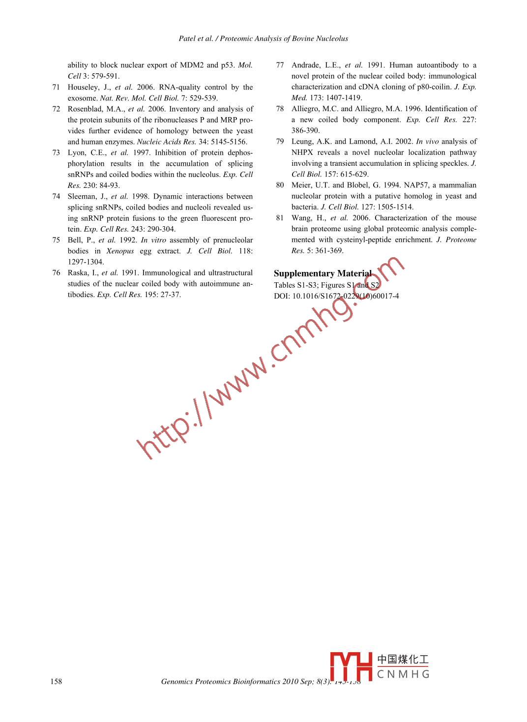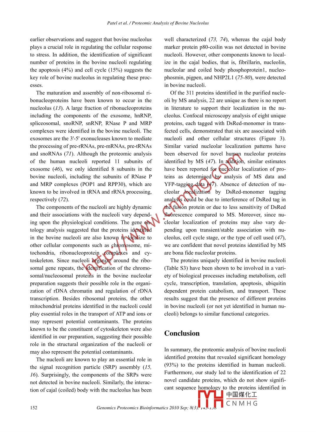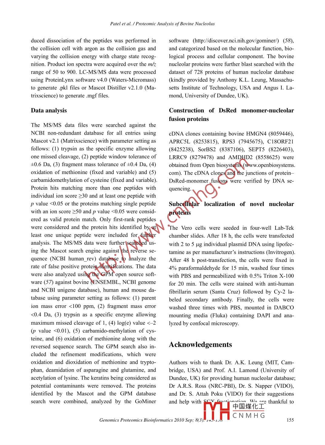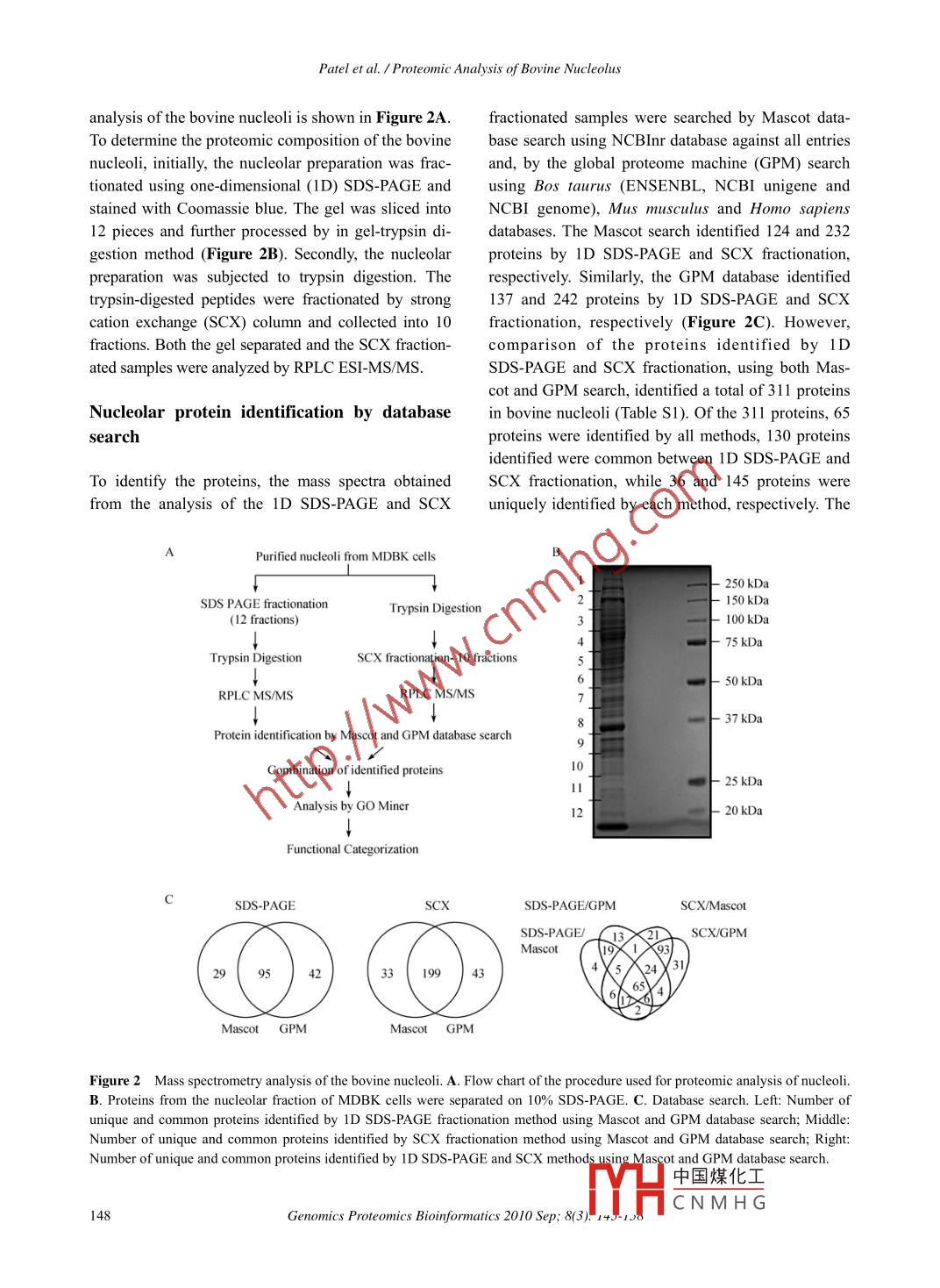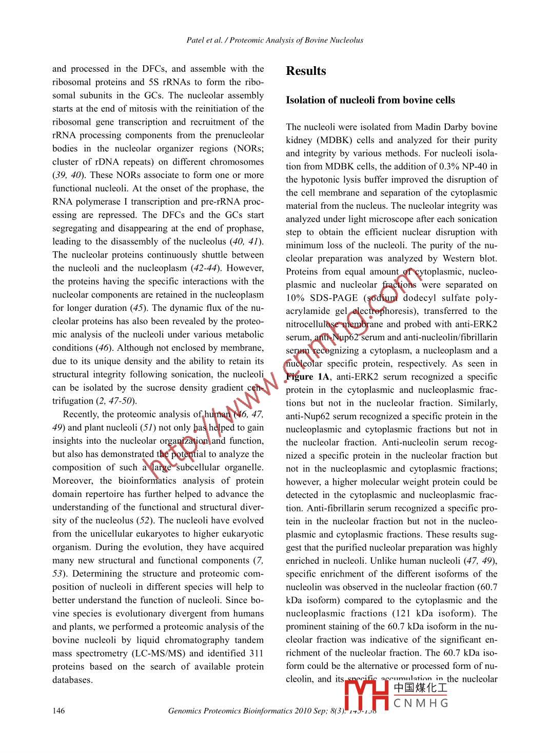 Available online at www.sciencedirect.comGENOMICSPROTEOMICS &ScienceDirectBIOINFORMATICSEL SEVIERwww.sciencedirect.com/science/journal/16720229ArticleProteomic Analysis of Bovine NucleolusAmrutlal K. Patel',, Doug Olson', and Suresh K. Tikol,2.4*' Vaccine and Infectious Disease Organization, University of Saskatchewan, Saskatoon, Canada;'Department of Veterinary Microbiology, Western College of Veterinary Medicine, University of Saskatchewan, Saskatoon, Canada;National Research Council, Plant Biotechnology Institute, University of Saskatchewan, Saskatoon, Canada;4School of Public Health, University of Saskatchewan, Saskatoon, Canada.Genomics Proteomics Bioinformatics 2010 Sep; 8(3): 145-158 DOI: 10.1016/S1672-0229(10)60017-4AbstractNucleolus is the most prominent subnuclear structure, which performs a wide variety of functions in the eu-karyotic cellular processes. In order to understand the structural and functional role of the nucleoli in bovine cells,we analyzed the proteomic composition of the bovine nucleoli. The nucleoli were isolated from Madin Darby bo-vine kidney cells and subected to proteomic analysis by LC-MS/MS after fractionation by SDS-PAGE and strongcation exchange chromatography. Analysis of the data using the Mascot database search and the GPM databasesearch identified 311 proteins in the bovine nucleoli, which contained 22 proteins previously not identified in theproteomic analysis of human nucleoli. Analysis of the identified proteins using the GoMiner software suggestedthat the bovine nucleoli contained proteins involved in ribosomal biogenesis, cell cycle control, transcriptional,translational and post-translational regulation, transport, and structural organization.Key words: bovine, nucleolus, proteomics, 1D SDS- PAGE, SCX, LC-MS/MSIntroductionribosome biogenesis, nucleolus plays a wide range ofcellular functions, which include biogenesis of ribo-Nucleolus is a dynamic subnuclear domain, whichnucleoproteins (13, 14) and signal recognition parti-cles (I5, 16), regulation of the cell cycle (17-20),forms around the clusters of ribosomal DNA duringRNA editing (I7, 21-23), stress response (24, 25),the interphase of the cell cycle (1-6). The mammaliancell contains 1-6 nucleoli with varying sizes andregulation of telomerase activity (26), tRNA process-numbers, depending upon the cell types and cultureing (27, 28), aging (29), apoptosis (30), export of nu-clear proteins (3I) and mRNAs (32), and viral repli-conditions, even within the same cell (I, 7). The nu-cation (33-36).cleolus was traditionally known to be the ribo-The nucleoli are formed as a result of the ribosomalsome-producing apparatus resulting from the act ofbuilding the ribosomes (8). However, research overgene transcription, processing of 47S pre-ribosomalthe past decade explored its functional complexityRNA (rRNA) into 5.8S, 18S, and 28S rRNAs, andbeyond manufacturing of ribosomes (9-12). Besidesribosomal subunit assembly (I, 3, 8). The nucleoliconsist of three distinct sub-compartments, namely*Corresponding author.fibrillar centres (FCs), dense fibrillar centres (DFCs)E-mail: suresh.tik@usask.caand granular c中國煤化工37, 38). TheC 2010 Beijing Institute of Genomics. All rights reserved.rRNAs are syrYHC N M H GaccumulatedPatel et al. /Proteomic Analysis of Bovine Nucleolusand processed in the DFCs, and assemble with theResultsribosomal proteins and 5S rRNAs to form the ribo-somal subunits in the GCs. The nucleolar assemblyIsolation of nucleoli from bovine cellsstarts at the end of mitosis with the reinitiation of theribosomal gene transcription and recruitment of theThe nucleoli were isolated from Madin Darby bovinerRNA processing components from the prenucleolarkidney (MDBK) cells and analyzed for their puritybodies in the nucleolar organizer regions (NORs;and integrity by various methods. For nucleoli isola-cluster of rDNA repeats) on different chromosomestion from MDBK cells, the addition of 0.3% NP-40 in(39, 40). These NORs associate to form one or morethe hypotonic lysis buffer improved the disruption offunctional nucleoli. At the onset of the prophase, thethe cell membrane and separation of the cytoplasmicRNA polymerase I transcription and pre-rRNA proc-material from the nucleus. The nucleolar integrity wasessing are repressed. The DFCs and the GCs startanalyzed under light microscope after each sonicationsegregating and disappearing at the end of prophase,step to obtain the efficient nuclear disruption withleading to the disassembly of the nucleolus (40, 41).minimum loss of the nucleoli. The purity of the nu-The nucleolar proteins continuously shuttle betweencleolar preparation was analyzed by Western blot.the nucleoli and the nucleoplasm (42-44). However,Proteins from equal amount of cytoplasmic, nucleo-the proteins having the specific interactions with theplasmic and nucleolar fractions were separated onnucleolar components are retained in the nucleoplasm10% SDS- PAGE (sodium dodecyl sulfate poly-for longer duration (45). The dynamic flux of the nu-acrylamide gel electrophoresis), transferred to thecleolar proteins has also been revealed by the proteo-nitrocellulose membrane and probed with anti-ERK2mic analysis of the nucleoli under various metabolicserum, anti-Nup62 serum and anti-nucleolin/fibrillarinconditions (46). Although not enclosed by membrane,serum recognizing a cytoplasm, a nucleoplasm and adue to its unique density and the ability to retain itsnucleolar specific protein, respectively. As seen instructural integrity following sonication, the nucleoliFigure 1A, anti-ERK2 serum recognized a specificcan be isolated by the sucrose density gradient cen-protein in the cytoplasmic and nucleoplasmic frac-trifugation (2, 47-50).tions but not in the nucleolar fraction. Similarly,Recently, the proteomic analysis of human (46, 47,anti-Nup62 serum recognized a specific protein in the49) and plant nucleoli (51) not only has helped to gainnucleoplasmic and cytoplasmic fractions but not ininsights
