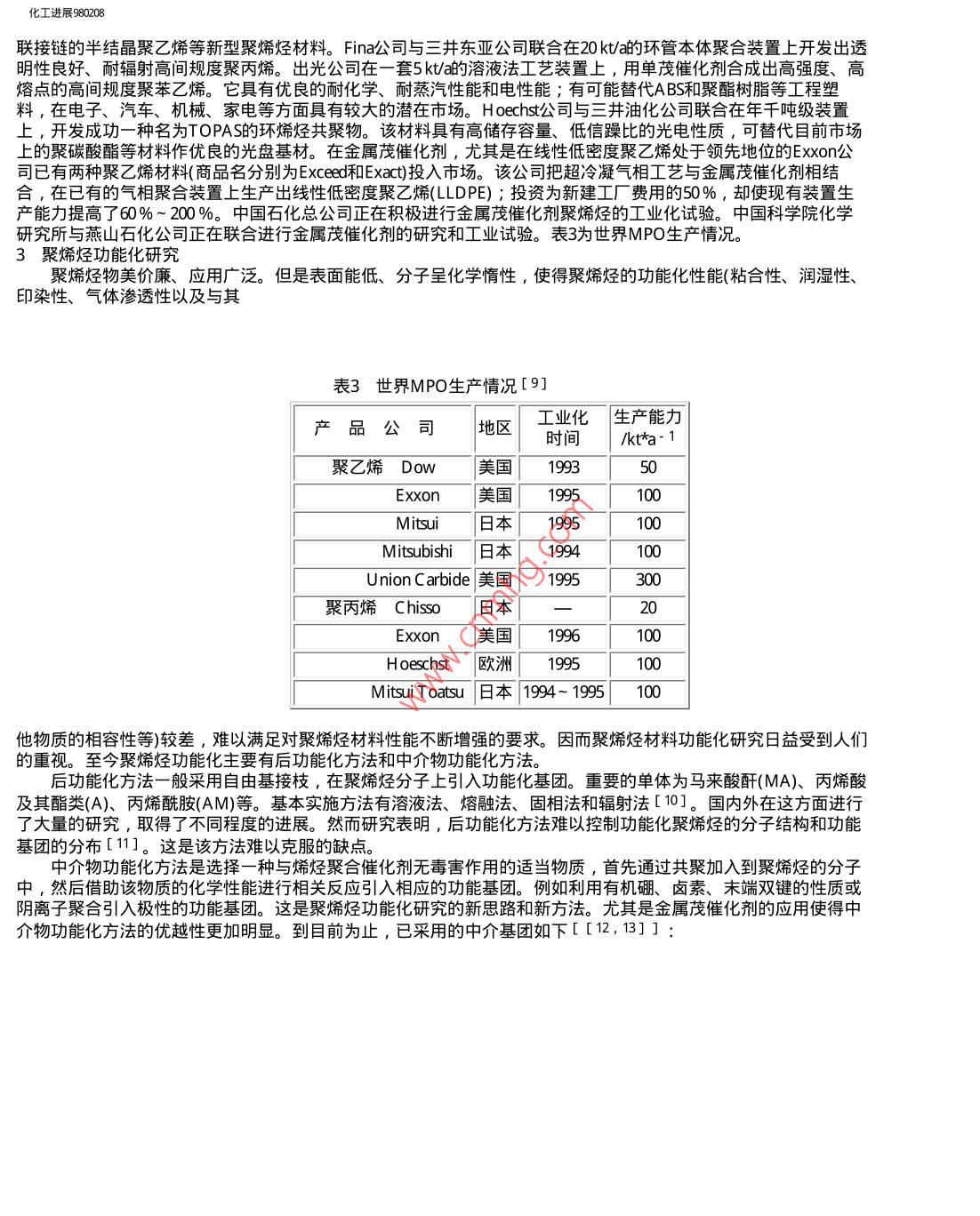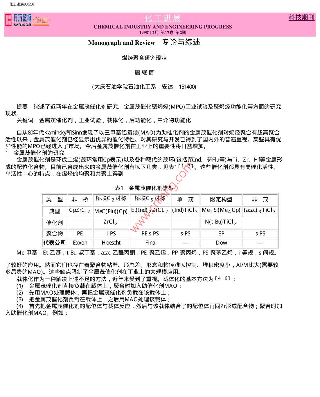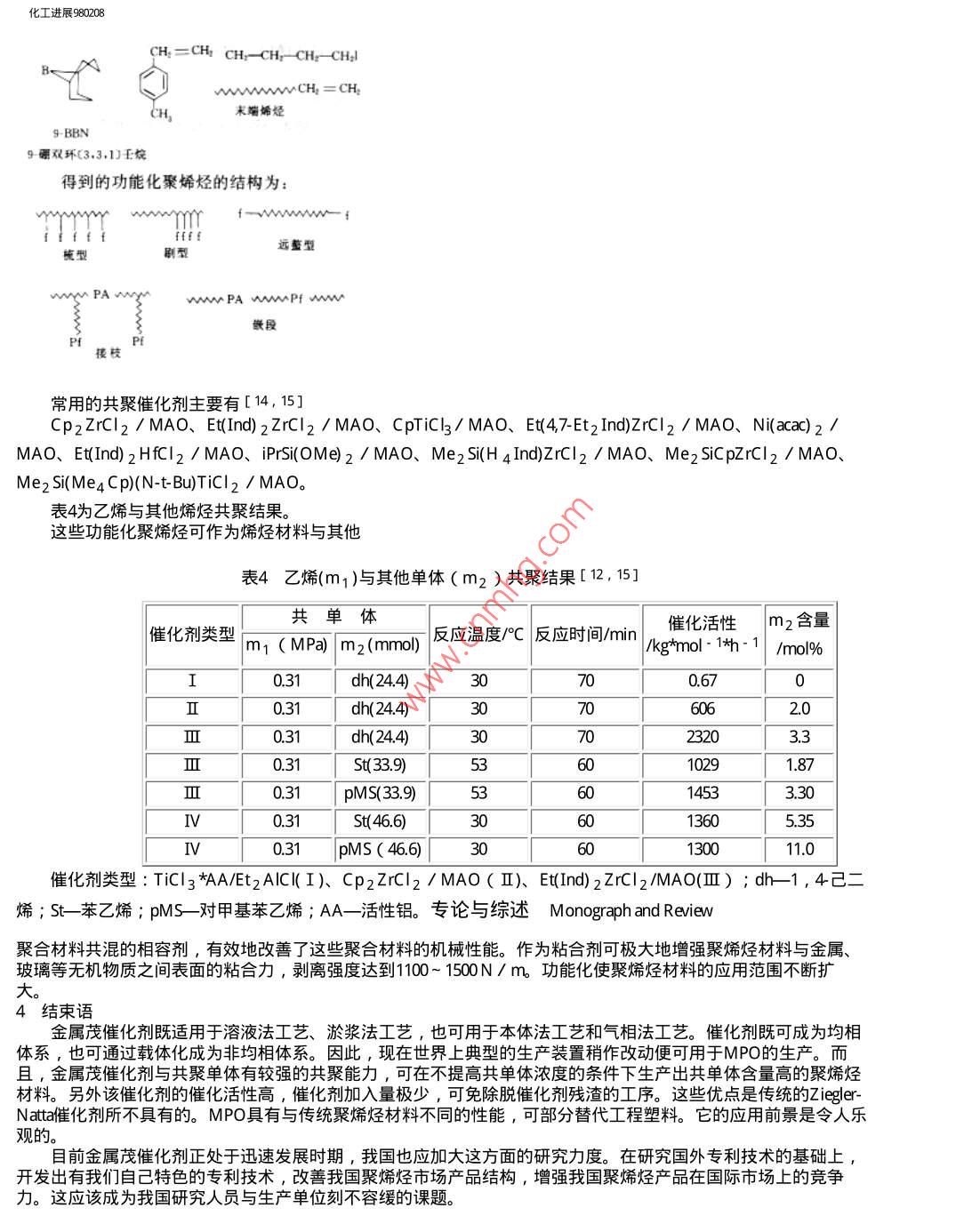 化工進展980208Rfia化工進展科技期刊山WANFANG DATACHEMICAL INDUSTRY AND ENGINEERING PROGRESS1998年2月第17卷第2期Monograph and Review專論與綜述烯烴聚合研究現(xiàn)狀唐繼信(大慶石油學(xué)院石油化工系,安達, 151400) .現(xiàn)狀。提要綜述了近兩年在 金屬茂催化劑研究、金屬茂催化聚烯烴(MPO)工業(yè)試驗及聚烯烴功能化等方面的研究關(guān)鍵詞金屬茂催化劑 ,工業(yè)試驗,載體化,后功能化,中介物功能化自從80年代K aminsky和Sinn發(fā)現(xiàn)了以三甲基鋁氧烷( MAO)為助催化劑的金屬茂催化劑對烯烴聚合有超高聚合活性以來,金屬茂催化劑已經(jīng)顯示出優(yōu)異的催化特性。對其研究與開發(fā)已得到了國內(nèi)外的普遍重視。某些具有優(yōu)異性能的MPO已經(jīng)進入了市場。今后金屬茂催化劑在工業(yè)上的重要性將日益增加。1金 屬茂催化劑的研究金屬茂催化劑是環(huán)戊二烯(茂環(huán)常用C p表示)以及各種取代的茂環(huán)(包括茚Ind、芴Flu等)與Ti、 Zr、 H等金屬形成的配位化合物。目前已合成出來的金屬茂催化劑有以下幾類,見表1[1~3]。這些催化劑都具有高催化活性、單活性中心的特點,在烯烴的均聚和共聚上得到表1金屬茂催化劑類型類型非橋橋聯(lián)C2對稱橋聯(lián)C5對稱單茂限定構(gòu)型非茂典型[CpZrCI2 MeC(Flu)(Cp) [Et(Ind) 2ZrCL2 (Ind)TiCI3 Me2 Si(Me4Cp) (acac)3TiCI3催化劑ZrCl2N(t-Bu)TiCI2聚合物PEi-PSPEs-PSs-PSEP代表公司 ExxonH oeschtMe甲基, Et-乙基, tBu-叔丁基, acac-乙酰丙酮; PE- 聚乙烯, PP-聚丙烯, PS-聚苯乙烯, i-等規(guī), s間規(guī)。了較好的應(yīng)用。然而它們也存在著聚合物粘壁、形態(tài)差、形態(tài)和粘徑難以控制、堆積密度小, Al/M比大(需要較多昂貴的MAO)。這些缺點限制了金屬茂催化劑在工業(yè)上的大規(guī)模應(yīng)用。載體化作為-種解決上述不足的方法,近年來受到了重視。載體化的基本方法為[4~6] :(1) 金屬茂催化劑直接負載在載體上,聚合時加入助催化劑MAO ;(2) 先用MAO處理載體,再把金屬茂催化劑負載在該載體上;(3) 把金屬茂催化劑負載在載體上,之后用MAO處理該載體;(4)首 先把金屬茂催化劑的配位體與載體反應(yīng),然后與該載體結(jié)合了的配位體再同Zr形成配合物;聚合時加入助催化劑MAO。例如:fl://E vqkngz980208.htm(第1/5頁) 2010322 20.4化工進展980208By、BrndSiOrSOrSiO1Li.Ind. lnd .LiLiBu24C4.zTHFSOzSiOz常用的載體有SiO2、Al203、MgCI2、 分子篩、聚合物等。方法不同,催化劑的催化效果也不一樣。具體結(jié)果見表2。載體化了的金屬茂催化劑盡管催化活性有所降低,但是在形態(tài)、粒徑以及粘釜等方面都得到了改善,聚烯烴的分子量和熔點上升。并且AIM比顯著下降,減少了昂貴的MAO的用量,使金屬茂催化劑的工業(yè)化成為可能。表2不同載體化方法的催化效果 [4-7]催化劑.[催化活性負載程序加入量/Al/Zr| /kg PE*相對活性/摩爾比molZr- 1*/%μ molh-1均相cat2.020003200100cat/SiO 21.5120cat/MAO-.23000100031TMA-SiO 2cat/TMA-SiO 2.1120038cat/MAO-SiO 23.0240075Cat/TMA-SiO 2.0280088cat- Si0 2 /MAOa50032910MC M41/800140044MAO/catbcat- -Et(Ind) 2ZrCl2 ; TMA-三甲基鋁; MAO- -三甲基鋁氧烷; MCM41-分子篩。聚合條件:T=65°C, P=0.1MPa,溶劑為甲苯;a:T= 50°C其余同前; b:T =50°C , P= 0.12 MPa隨著對金屬茂催化劑研究的不斷深入,人們對金屬茂催化劑的結(jié)構(gòu)和性能之間的關(guān)系有了-定的認識,催化劑的手性不同,催化效果不同。如C2對稱的金屬茂催化劑得到高等規(guī)度聚烯烴,C5對稱的金屬茂催化劑得到高間規(guī)度的聚烯烴[8]。茂環(huán)上的取代基從空間效應(yīng)和電子效應(yīng)兩個方面影響金屬茂催化劑的催化活性。茂環(huán)上的取代基增加使兩茂環(huán)間的間隙張角(gap aperture)減小,阻礙了烯烴分子的插入,催化活性下降;茂環(huán)上的吸電子基團降低了催化劑分子的電子云密度,也會降低催化活性。2金屬茂催化聚烯烴工業(yè)試驗從1993年起, Fina. Dow. Exxon、 Hoechst出光和三井油化等世界著名化工公司紛紛進行了5 ~ 400kt/a規(guī)模的工業(yè)試驗和新的MPO產(chǎn)品的開發(fā)[9]。Dow公司于1993年把它的- -個56 kt/a的溶液法聚合工藝裝置改造成金屬茂催化劑的裝置,以一種限定構(gòu)型催化劑(Me2 Si(Me4 C p)(N-t- Bu)TiCl2 )合成的乙烯-丙烯聚合彈性體已經(jīng)投入市場。目前該公司不僅開發(fā)出7個牌號ENGAGE彈性體、14個牌 號AFFINTY塑性體,而且開發(fā)出窄分布聚乙烯、有fl/F7e7E2FE,e(第2/5頁) 20102222化工進展980208聯(lián)接鏈的半結(jié)晶聚乙烯等新型聚烯烴材料。Fina公 司與三井東亞公司聯(lián)合在20 kt/a的環(huán)管本體聚合裝置上開發(fā)出透明性良好、耐輻射高間規(guī)度聚丙烯。出光公司在一套5 kt/a的溶液法工藝裝置上,用單茂催化劑合成出高強度、高熔點的高間規(guī)度聚苯乙烯。它具有優(yōu)良的耐化學(xué)、耐蒸汽性能和電性能;有可能替代ABS和聚酯樹脂等工程塑料,在電子、汽車、機械、家電等方面具有較大的潛在市場。Hoechst公 司與三井油化公司聯(lián)合在年千噸級裝置上,開發(fā)成功一 -種名為TOPAS的環(huán)烯烴共聚物。該材料具有高儲存容量、低信躁比的光電性質(zhì),可替代目前市場上的聚碳酸酯等材料作優(yōu)良的光盤基材。在金屬茂催化劑,尤其是在線性低密度聚乙烯處于領(lǐng)先地位的Exxon公司已有兩種聚乙烯材料(商品名分別為Exceed和Exact)投入市場。該公司把超冷凝氣相工藝