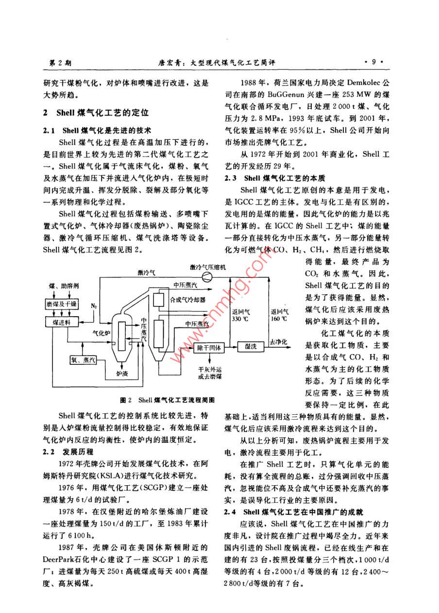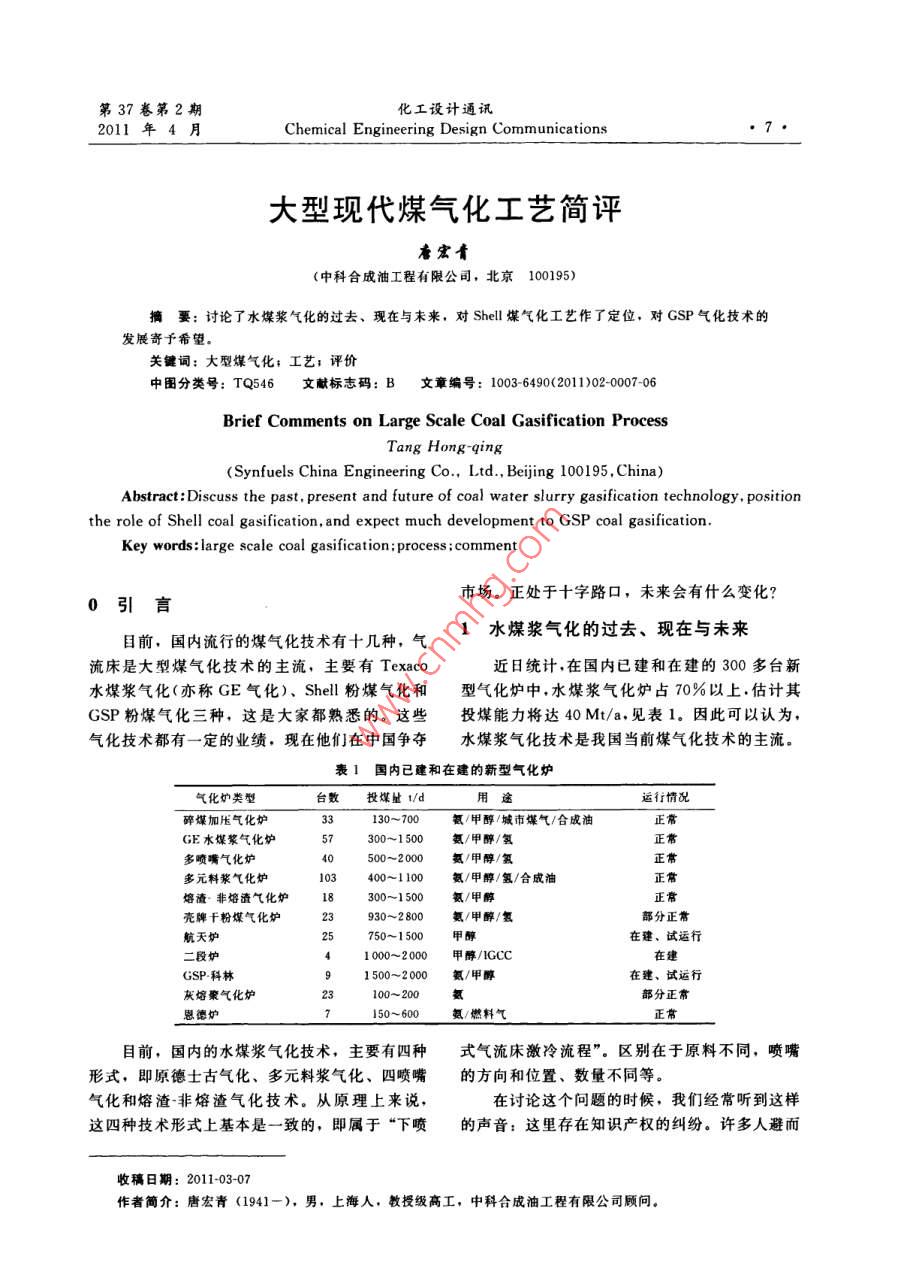 第37卷第2期化工設(shè)計(jì)通訊2011年4月Chemical Engineering Design Communications●7●大型現(xiàn)代煤氣化工藝簡(jiǎn)評(píng)唐宏青(中科合成油工程有限公司,北京100195)摘要:討論了水煤漿氣化的過(guò)去、現(xiàn)在與末來(lái),對(duì)Shell煤氣化工藝作了定位,對(duì)GSP氣化技術(shù)的發(fā)展寄予希望。關(guān)鍵詞:大型煤氣化;工藝;評(píng)價(jià)中圍分類號(hào): TQ546文獻(xiàn)標(biāo)志碼: B文章編號(hào): 1003-6490(2011)02 007-06Brief Comments on Large Scale Coal Gasification ProcessTang Hong-qing(Synfuels China Engineering Co., Ltd.. Beijing 100195 , China)Abstract:Discuss the past, present and future of coal water slurry gasification technology, positionthe role of Shell coal gasification, and expect much development to GSP coal gasification.Key words:large scale coal gasification; process ;comment市場(chǎng)。正處于十字路口,未來(lái)會(huì)有什么變化?0引言目前,國(guó)內(nèi)流行的煤氣化技術(shù)有十幾種,氣1水煤漿氣化的過(guò)去、 現(xiàn)在與未來(lái)流床是大型煤氣化技術(shù)的主流,主要有Texaco近日統(tǒng)計(jì),在國(guó)內(nèi)已建和在建的300多臺(tái)新水煤漿氣化(亦稱GE氣化)、Shell 粉煤氣化和型氣化爐中.水 煤漿氣化爐占70%以上.估計(jì)其GSP粉煤氣化三種,這是大家都熟悉的。這些投煤能力將達(dá) 40 Mt/a.見表1.因此可以認(rèn)為,氣化技術(shù)都有一-定的業(yè)績(jī),現(xiàn)在他們?cè)谥袊?guó)爭(zhēng)奪水煤漿氣化技術(shù)是我國(guó)當(dāng)前煤氣化技術(shù)的主流。表1國(guó)內(nèi)已建和在建 的新型氣化爐氣化妒類型臺(tái)敷投煤塹 1/d用途運(yùn)行情況碎煤加壓氣化妒130~700氨/甲醇 /城市煤氣/合成油E常GE水煤漿氣化爐5300~1500氨/ 甲醇/氫正常多噴嘴氣化爐500~ 2000氨/甲醇/氨多元料漿氣化爐400~1 100氨/甲醇/氫/合成油熔渣非熔渣氣化爐18300~1500氨/甲醇?xì)づ苀粉煤氣化爐2:930~2800氨/甲醇/氫部分正常航天爐750~1500甲 醇在建、試運(yùn)行二段爐1000~2000甲 醇/IGCC在GSP.科林1500~2000氨/甲醇灰熔聚氣化爐100~200恩德爐150~600氨/燃料氣目前,國(guó)內(nèi)的水煤漿氣化技術(shù),主要有四種式氣流床激冷流程"。區(qū)別在于原料不同,噴嘴形式,即原德士古氣化、多元料漿氣化、四噴嘴的方向和位置、數(shù)量不同等。氣化和熔渣非熔渣氣化技術(shù)。從原理上來(lái)說(shuō),在討論這個(gè)問(wèn)題的時(shí)候,我們經(jīng)常聽到這樣這四種技術(shù)形式上基本是一致的,即屬于“下噴的聲音:這里存在知識(shí)產(chǎn)權(quán)的糾紛。許多人避而收稿日期: 2011-03-07作者簡(jiǎn)介:唐宏青(1941-). 男,上海人,教授級(jí)高工,中科合成油工程有限公司顧問(wèn)?!?.化工設(shè)計(jì)通訊,第37卷不談這個(gè)問(wèn)題。結(jié)構(gòu)是各不相同的,噴射方向也各異,這就是專其實(shí),我們不應(yīng)該回避。只要我們把這種利所在,其他四個(gè)部分都是常規(guī)設(shè)備,大體相“下噴式氣流床激冷流程"在中國(guó)發(fā)展的歷史和.同,如果有區(qū)別,也是很微弱的,沒(méi)有什么奧妙這個(gè)工藝的本質(zhì)解剖清楚,我們就可以明確地回之處。專利商可以有細(xì)節(jié)上的專利,但用戶可以答是否存在侵權(quán)問(wèn)題。不用這些專利也不影響大局,因此,各專利商的1.1“下噴式氣流床激冷流程”的發(fā)展歷史專利權(quán)限主要在噴嘴上,不是爐體。“下噴式氣流床激冷流程”在我國(guó)已有40多.1.4原料的變遷年歷史。氣化原料先后有重油、渣油、瀝青、從重油變到水煤漿,專利商從蒙特卡蒂尼變;油焦、水煤漿、粉煤等多種形式。用粉煤作原料到德士古,流程沒(méi)有變化,原料變化了又形成新后,氣化爐壁由耐火磚變成盤管,投煤量在500~的專利,這說(shuō)明原料可以成為專利權(quán)限。因此,2 000t/d之間?,F(xiàn)在從水煤漿變成多元料漿,或者在水煤漿中加1.2流程技術(shù)人別人沒(méi)有加入的添加劑,專利權(quán)限也因此而改從20世紀(jì)60年代中期引進(jìn)重油氣化開始,變。顯然,這個(gè)專利被破解是很容易的。至今已40多年。這種"下噴式氣流床激冷流程",1.5水煤漿 氣化的未來(lái):包括噴嘴、在鋼殼中用耐火磚砌成的氣化室、由激水煤漿氣化需要低灰熔點(diǎn)的原煤,成漿性也冷環(huán)噴水冷卻的激冷室.文丘里洗滌、炭黑水洗滌有一定的要求,水分在氣化爐中蒸發(fā)升溫和反塔共五個(gè)主要部分(見圖1),這些在中國(guó)已經(jīng)成應(yīng),消耗大量的氧氣和碳元素,因此能耗較高。為公知技術(shù)。根據(jù)當(dāng)時(shí)中國(guó)的政策,引進(jìn)技術(shù)是這個(gè)技術(shù)已經(jīng)很成熟,盡管噴嘴五花八門,但早一次買斷的,在國(guó)內(nèi)不存在專利保護(hù)問(wèn)題?!跋聡娨褳楦鲝S商掌握,只是手法不同。隨著出現(xiàn)的以式氣流床激冷流程”的流程技術(shù),已經(jīng)屬于國(guó)家。干煤粉為原料的“下噴式氣流床激冷流程”,只根據(jù)現(xiàn)在的專利法,這個(gè)技術(shù)的專利時(shí)限早已過(guò)是氣化爐爐體由耐火磚變?yōu)槔鋮s盤管等組成的冷去,因此在流程技術(shù)上已不存在專利保護(hù)問(wèn)題。壁,采取熔渣掛壁的辦法,冷卻盤管可以水進(jìn)水1.3技術(shù)關(guān)鍵出,也可以水進(jìn)汽出。這個(gè)技術(shù)也已經(jīng)公開,似上述“下噴式氣流床激冷流程”的五個(gè)主要乎沒