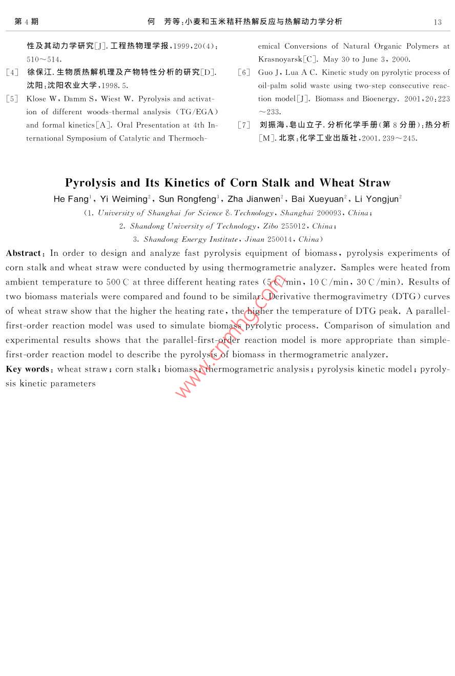 第18卷第4期農(nóng)業(yè)工程學(xué)報(bào)Vol. 18 No. 42002年7 月Transactions of the CSAEJuly 2002小麥和玉米秸稈熱解反應(yīng)與熱解動(dòng)力學(xué)分析何芳, 易維明”,孫容峰”,閘建文”,柏雪源”,李永軍’(1.上海理工大學(xué): 2.山東理工大學(xué),3.山東省科學(xué)院能源研究所)摘要:為了對(duì)生物質(zhì)快速熱解液化設(shè)備進(jìn)行分析和計(jì)算,該文用熱重、差熱分析儀分別對(duì)小麥和玉米秸稈在不同升溫速率下進(jìn)行了熱分析研究。結(jié)果表明:小麥和玉米秸稈的熱解特性基本一致,熱解過(guò)程可以用同一種模型描述;隨升溫速率的提高,熱解最高速率時(shí)的溫度和熱解最高速率明顯提高。分析了小麥和玉米秸稈熱解反應(yīng)過(guò)程,提出了平行一階反應(yīng)動(dòng)力學(xué)模型并計(jì)算出模型中各參數(shù),將該模型的計(jì)算結(jié)果.現(xiàn)有一階反應(yīng)模型的計(jì)算結(jié)果分別和試驗(yàn)數(shù)據(jù)進(jìn)行了對(duì)比,結(jié)果表明,平行一階反應(yīng)模型的準(zhǔn)確程度比現(xiàn)有一階反應(yīng)模型有很大的提高。關(guān)鍵詞:小麥秸稈;玉米秸稈;生物質(zhì);熱分析;熱解動(dòng)力學(xué)模型;熱解動(dòng)力學(xué)參數(shù)中圖分類號(hào): S216文獻(xiàn)標(biāo)識(shí)碼: A文章編號(hào):1002- 6819(2002)04-0010-04自第一臺(tái)生物質(zhì)快速熱解液化設(shè)備出現(xiàn)以來(lái),約為100~130 kg/m3 ,試驗(yàn)時(shí)樣品含水率約為2%熱解液化技術(shù)得到了一定的發(fā)展,研究者已從當(dāng)初~4%。物料尺寸小于0. 5 mm。單純要得到液體燃料為目的逐步轉(zhuǎn)變?yōu)椴坏@得1.1.2 試驗(yàn)方法液體燃料,更要獲得具有很高利用價(jià)值的醫(yī)藥、化工試驗(yàn)在一臺(tái)日本生產(chǎn)的TG- DTA200型熱重原料的高級(jí)目標(biāo)。但現(xiàn)在還沒有出現(xiàn)能夠供商業(yè)運(yùn)差熱分析儀上進(jìn)行。取約10 mg的樣品盛入樣營(yíng)的生產(chǎn)液體燃料或化工產(chǎn)品十分成熟的熱解工藝品皿(直徑為5 mm,高為5 mm)中,用Al2O,作參技術(shù)。主要原因是生物質(zhì)熱解過(guò)程十分復(fù)雜,人們對(duì)比物,用N2作保護(hù)氣。由程序設(shè)定升溫速率、終溫,它的基本原理的了解還遠(yuǎn)遠(yuǎn)不夠。為制定合理的熱系統(tǒng)自動(dòng)記錄熱解過(guò)程中樣品的質(zhì)量變化等。解工藝,有效地利用生物質(zhì)熱解技術(shù),必須對(duì)熱解反分別將玉米秸稈粉、小麥秸稈粉以5、10C、應(yīng)過(guò)程作深入地研究。國(guó)內(nèi)外學(xué)者對(duì)生物質(zhì)熱解進(jìn)30C/min的升溫速率從常溫加熱至500C進(jìn)行熱行了許多實(shí)驗(yàn)研究,并建立了一些經(jīng)驗(yàn)公式口~61。本解分析實(shí)驗(yàn)。記錄的曲線有熱重曲線(TG)、微分熱文對(duì)我國(guó)典型農(nóng)業(yè)廢棄物玉米秸稈、小麥秸稈的熱重曲線(DTG)和差熱曲線(DTA)3條。解特性進(jìn)行了實(shí)驗(yàn)研究和分析,根據(jù)玉米秸稈和小1.2 結(jié)果分析和討論麥秸稈的化學(xué)組成提出了用平行一級(jí)反應(yīng)模型來(lái)模1.2.1小麥秸稈、玉米秸稈熱解曲線的對(duì)比擬它們?cè)跓岱治鰞x中的熱解反應(yīng)過(guò)程。由圖1可以看出,小麥和玉米秸稈在相同的熱解條件下各曲線非常相似。文獻(xiàn)[4,5,7]表明,木粉1試驗(yàn)和結(jié)果分析1.1 試驗(yàn)也100301.1. 1試驗(yàn)物料的制備為試驗(yàn)時(shí)取樣具有代表性和減少水分對(duì)熱解實(shí)0t驗(yàn)的影響,試驗(yàn)物料用如下的方法制備。取具代表性0 10020000500 t 0100200 300400 500溫度/'C溫度/C的玉米秸稈(一段包括玉米秸稈皮、玉米秸稈芯和少一wheat-5一. com-5一wheal-5量的玉米葉的有莖節(jié)的玉米秸稈)和小麥秸稈(數(shù)段包括小麥葉子的小麥秸稈),進(jìn)行研磨,將研磨后的100 r粉末充分混合后用坩鍋收集。坩鍋上蓋后置入干燥6010箱,在105C下干燥2h。按上述方法各制備小麥秸20 L0 100200 300400 500100 200 300 400 500稈粉和玉米秸稈粉2~3g。制備后的樣品堆積密度- - - comn-30 一wheat-30-corn-30 一wbeat-30收稿日期:2002-03- 19基金項(xiàng)目;國(guó)家863項(xiàng)目(2001AA514030)和高等學(xué)校骨干教師圖1小麥秸稈 、玉米秸稈TG、DTG曲線對(duì)比何芳等:小麥和玉米秸稈熱解反應(yīng)與熱解動(dòng)力學(xué)分析的熱解曲線也與它們相似,DTG曲線也呈現(xiàn)出有2熱,而在質(zhì)量損失速率最大時(shí),吸熱速率已基本降至個(gè)峰的趨勢(shì);而棉織物、紙張、辣椒、橘子皮83.6]則和零。這種現(xiàn)象可以解釋為:熱解斷鍵反應(yīng)-開始就發(fā)它們不同,棉織物、紙張DTG曲線呈現(xiàn)明顯的1個(gè)生,而且是吸熱的。但此時(shí)斷鍵后的中間產(chǎn)物由于分峰,橘子皮呈現(xiàn)出明顯的2個(gè)峰、而辣椒是明顯的3子量仍很大,并未能逸出,隨著溫度的升高和斷鍵的個(gè)峰。繼續(xù),產(chǎn)物分子量越來(lái)越小,動(dòng)能越來(lái)越大,分子開這種現(xiàn)象可以從物料的化學(xué)組成來(lái)解釋,表1始逸出,出現(xiàn)了質(zhì)量損失速率峰,隨著物料中可熱解給出了上述幾種物料的化學(xué)組成。小麥秸稈、玉米秸物質(zhì)的急劇減少,斷鍵所需的熱量也急劇減少,出現(xiàn)稈和木粉熱解曲線相似的原因是它們的主要成分都DTA上升峰形和DTG峰形相似的結(jié)果。為纖維素、半纖維素
