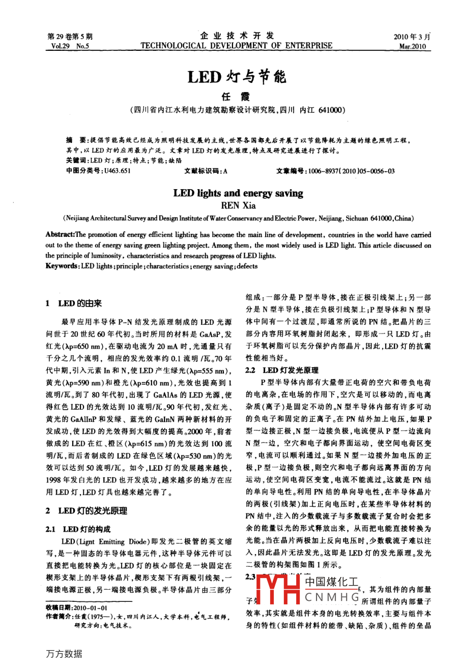 第29卷第5期企業(yè)技術(shù)開發(fā)2010年3月TECHNOLOGICAL DEVELOPMENT OF ENTERPRISEMar 2010LED燈與節(jié)能任霞(四川省內(nèi)江水利電力建筑勘察設(shè)計(jì)研究院,四川內(nèi)江64100摘要:提倡節(jié)能高效已經(jīng)成為照明科技發(fā)展的主線,世界各國(guó)都先后開展了以節(jié)能降耗為主題的綠色照明工程,其中,以LED燈的應(yīng)用最為廣泛。文章對(duì)LED燈的發(fā)光原理,特點(diǎn)及研究進(jìn)展進(jìn)行了探討。關(guān)鍵詞:LED燈;原理;特點(diǎn);節(jié)能;缺陷中圖分類號(hào):U463.651文標(biāo)識(shí)碼:A文章編號(hào):1006-8937(2010)05-0056-03LED lights and energy savingreN Xia(Neijiang Architectural Survey and Design Institute of Water Conservancy and Electric Power, Neijiang, Sichuan 641000, China)Abstract: The promotion of energy efficient lighting has become the main line of development, countries in the world have carriedout to the theme of energy saving green lighting project. Among them, the most widely used is LED light. This article discussed onthe principle of luminosity, characteristics and research progress of LED lightsKeywords: LED lights principle characteristics; energy saving; defects1LED的由來組成:一部分是P型半導(dǎo)體,接在正極引線架上;另一部分是N型半導(dǎo)體,接在負(fù)極引線架上;P型導(dǎo)體和N型導(dǎo)最早應(yīng)用半導(dǎo)體PN結(jié)發(fā)光原理制成的LED光源體中間有一個(gè)過渡層,即通常所說的PN結(jié)。把晶片的三問世于20世紀(jì)60年代初。當(dāng)時(shí)所用的材料是 GaAsP,發(fā)部分內(nèi)容用環(huán)氧樹脂封閉起來,即形成一只LED燈。由紅光(p=650mm),在驅(qū)動(dòng)電流為20mA時(shí),光通量只有于環(huán)氧樹脂可以充分保護(hù)內(nèi)部晶片,因此LED燈的抗震千分之幾個(gè)流明,相應(yīng)的發(fā)光效率約0.1流明佤瓦。70年性能相當(dāng)好。代中期,引入元素In和N,使LED產(chǎn)生綠光(Ap=55m),22LED燈發(fā)光原理黃光(λp=590mm)和橙光(λp=610m),光效也提高到1P型半導(dǎo)體內(nèi)部有大量帶正電荷的空穴和帶負(fù)電荷流明/瓦。到了80年代初,出現(xiàn)了 GaAlAs的LED光源,使的電離雜,在電場(chǎng)的作用下,空穴是可以移動(dòng)的,而電離得紅色LED的光效達(dá)到10流明/瓦。90年代初,發(fā)紅光、雜質(zhì)(離子)是固定不動(dòng)的N型半導(dǎo)體內(nèi)部有許多可動(dòng)黃光的 GaAlInP和發(fā)綠、藍(lán)光的GanN兩種新材料的開的負(fù)電子和固定的正離子。在PN結(jié)外加上電壓,如果P發(fā)成功,使LED的光效得到大幅度的提高。2000年,前者型一邊接正極N型一邊接負(fù)極,電流便從P型一邊流向做成的LED在紅、橙區(qū)(p=615mm)的光效達(dá)到100流N型一邊,空穴和電子都向界面運(yùn)動(dòng),使空間電荷區(qū)變明/瓦,而后者制成的LED在綠色區(qū)域(小p=530mm)的光窄,電流可以順利通過。如果N型一邊接外加電壓的正效可以達(dá)到50流明/瓦。如今,LED燈的發(fā)展越來越快,極,P型一邊接負(fù)極,則空穴和電子都向遠(yuǎn)離界面的方向1998年發(fā)白光的LED也開發(fā)成功,越來越多的地方在應(yīng)運(yùn)動(dòng),使空間電荷區(qū)變寬,電流不能流過。這就是PN結(jié)用LED燈,LED燈具也越來越完善了。的單向?qū)щ娦?。利用PN結(jié)的單向?qū)щ娦?在半導(dǎo)體晶片2LED燈的發(fā)光原理的兩極(引線架)加上正向電壓時(shí),在某些半導(dǎo)體材料的PN結(jié)中,注入的少數(shù)載流子與多數(shù)載流子復(fù)合時(shí)會(huì)把多21LED燈的構(gòu)成余的能量以光的形式釋放出來,從而把電能直接轉(zhuǎn)換為L(zhǎng)ED( Lignt Emitting Diode)即發(fā)光二極管的英文縮光能。當(dāng)在晶片兩極加上反向電壓時(shí),少數(shù)載流子難以注寫,是一種固態(tài)的半導(dǎo)體電器元件,這種半導(dǎo)體元件可以入,因此晶片無法發(fā)光。這即是LED燈的發(fā)光原理。發(fā)光直接把電能轉(zhuǎn)換為光。LED燈的核心部位是一塊固定在二極管的構(gòu)架圖如圖1所示。楔形支架上的半導(dǎo)體晶片,楔形支架下有兩根引線架,中國(guó)煤化工端接電源正極,另一端接電源負(fù)極。半導(dǎo)體晶片由三部分,其為組件的內(nèi)部量CNMHG所謂組件的內(nèi)部量子收稿日期:2010-01-01作者簡(jiǎn)介:任實(shí)(1975-),女,四川內(nèi)江人,大學(xué)本科,氣工程師,效率,其實(shí)就是組件本身的電光轉(zhuǎn)換效率主要與組件本研究方向:電氣技術(shù)身的特性(如組件材料的能帶、缺陷、雜質(zhì))、組件的壘晶第29卷第5期任霞:LED燈與節(jié)能組成及結(jié)構(gòu)等相關(guān)。而組件的取出效率則指的是組件內(nèi)LED的長(zhǎng)時(shí)間工作會(huì)光衰引起老化,尤其對(duì)大功率部產(chǎn)生的光子,在經(jīng)過組件本身的吸收、折射、反射后,實(shí)LED來說,光衰問題更加嚴(yán)重。在衡量LED的壽命時(shí),僅際在組件外部可測(cè)量到的光子數(shù)目。因此,關(guān)于取出效率僅以燈的損壞來作為L(zhǎng)ED壽命的終點(diǎn)是遠(yuǎn)遠(yuǎn)不夠的,應(yīng)的因素包括了組件材料本身的吸收、組件的幾何結(jié)構(gòu)、組該以LED的光衰減百分比來規(guī)定LED的壽命,比如3%~件及封裝材料的折射率差及組件結(jié)構(gòu)的散射特性等。而5%,這樣更有意義。組件的內(nèi)部量子效率與組件的取出效率的乘積,就是整28大功率LED封裝個(gè)組件的發(fā)光效果,也就是組件的外部量子效率。