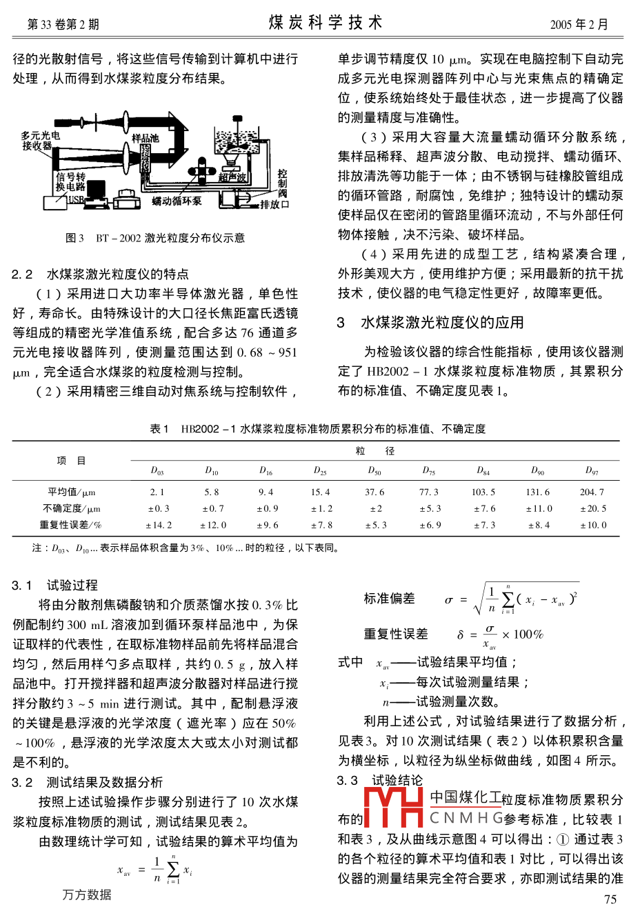 第33卷第2期煤炭科學技術(shù)2005年2月水煤漿激光粒度儀的原理與應用段清兵2,汪廣田2,何國鋒,董青云3,王國房2,賈傳凱業(yè)大學(北京),北京100083;2.國家水煤漿工程技術(shù)研究中心,北京100013;3.百特儀器有限公司,遼寧丹東118002)摘要∶水煤漿的粒度分布關(guān)系到水煤漿的粘度,同時也直接影響水煤漿的流變性、穩(wěn)定性及霧化燃燒特性。根據(jù)顆粒能使激光產(chǎn)生散射這一物理現(xiàn)象,結(jié)合水煤漿的粒度分布特性,硏制了水煤漿專用激光粒度儀,并介紹了該儀器的特點和應用情況。關(guān)鍵詞:水煤漿;激光粒度儀;粒度分布特性中圖分類號:TH744.5文獻標識碼:B文章編號:0253-2336(2005)02-0074-03Principle and application of laser particle meter for coal water mixtureDUAN Qing-bing, WANG Guang-tian, HE Guo-feng, DONG Qing-yun, WANG Guo-fang, JIA Chuan-kai(l. Beying Campus, China University of Mining and Technology, Beying 100083, China2. National Coal watre Engineering and Technology Research Center, Beiing 100013, China3. Beite Instrument Company Ltd. Dandong 118002, China水煤漿的粒度分布,通常又稱其為粒度級配的散射光的強度,即可以得到樣品的粒度分布。分布,它關(guān)系到水煤漿的粘度,同時也直接影響水煤漿的流變性、穩(wěn)定性及霧化燃燒特性。激光粒度儀作為一種新型的粒度測試儀器,已經(jīng)在其它粉體加工與應用領(lǐng)域得到廣泛的應用。它的特點是測試速度快、重復性好、準確性好、操作簡便。根據(jù)水圖1不同粒徑的顆粒產(chǎn)生不同角度的散射光煤漿濃度大、粒度分布寬、顆粒對光的吸收特性強的特殊情況,國家水煤漿工程技術(shù)研究中心與百特為測量不同角度上的散射光的光強,需要運用儀器有限公司合作,成功地研制出國內(nèi)第一臺水煤光學手段對散射光進行處理。在光束中的適當位置漿專用的BT-2002型激光粒度儀,這對提高水煤上放置一個富氏透鏡,在該富氏透鏡的后焦平面上放置一組多元光電探測器,不同角度的散射光通過漿產(chǎn)品質(zhì)量、降低能源消耗有著重要的意義。富氏透鏡照射到多元光電探測器上時,光信號將被1激光粒度儀的原理轉(zhuǎn)換成電信號并傳輸?shù)诫娔X中,通過對這些信號進激光粒度儀是根據(jù)顆粒能使激光產(chǎn)生散射這一行處理,就準確地得到粒度分布,如圖2所示。物理現(xiàn)象測試粒度分布的,由于激光具有很好的單色性和極強的方向性,所以在沒有阻礙的無限空間中激光將會照射到無窮遠的地方,并且在傳播過程中很少有發(fā)散的現(xiàn)象。米氏散射理論表明,當光束遇到顆粒阻擋時,一部分光將發(fā)生散射現(xiàn)象,散射圖2激光粒度儀原理示意光的傳播方向?qū)⑴c主光束的傳播方向形成一個夾角。夾角的大小與顆粒的大小有關(guān),顆粒越大,產(chǎn)2水煤激光度心的構(gòu)造及特點生的散射光的夾角就越小;顆粒越小,產(chǎn)生的散射中國煤化工光的夾角就越大。即小角度(B0)的散射光是由2.CNMHGO大顆粒引起的;大角度(θ1)的散射光是由小顆BT-202型激光粒度儀包括樣品制備系統(tǒng)、粒引起的,如圖1所示。進一步研究表明,散射光光學測定與信號轉(zhuǎn)換系統(tǒng)和計算機系統(tǒng),如圖3所的強度代表該粒徑顆粒的數(shù)量。測量不同角度上的示。通過樣品制備系統(tǒng)與光學測定裝置獲得顆粒粒74第33卷第2期煤炭科學技術(shù)2005年2月徑的光散射信號,將這些信號傳輸?shù)接嬎銠C中進行單步調(diào)節(jié)精度僅10μm。實現(xiàn)在電腦控制下自動完處理,從而得到水煤漿粒度分布結(jié)果。成多元光電探測器陣列中心與光束焦點的精確定位,使系統(tǒng)始終處于最佳狀態(tài),進一步提高了儀器的測量精度與準確性。樣品池3)采用大容量大流量蠕動循環(huán)分散系統(tǒng)集樣品稀釋、超聲波分散、電動攪拌、蠕動循環(huán)排放清洗等功能于一體;由不銹鋼與硅橡膠管組成蠕動循環(huán)泵的循環(huán)管路,耐腐蝕,免維護;獨特設(shè)計的蠕動泵排放口使樣品僅在密閉的管路里循環(huán)流動,不與外部任何圖3BT-2002激光粒度分布儀示意物體接觸,決不污染、破壞樣品。(4)采用先進的成型工藝,結(jié)構(gòu)緊湊合理2.2水煤漿激光粒度儀的特點外形美觀大方,使用維護方便;采用最新的抗干擾(1)采用進口大功率半導體激光器,單色性技術(shù),使儀器的電氣穩(wěn)定性更好,故障率更低好,壽命長。由特殊設(shè)計的大口徑長焦距富氏透鏡等組成的精密光學準值系統(tǒng),配合多達76通道多3水煤漿激光粒度儀的應用元光電接收器陣列,使測量范圍達到0.68~951為檢驗該儀器的綜合性能指標,使用該儀器測完全適合水煤漿的粒度檢測與控制。定了HB2002-1水煤漿粒度標準物質(zhì),其累積分2)采用精密三維自動對焦系統(tǒng)與控制軟件,布的標準值、不確定度見表1。表1HB2002-1水煤漿粒度標準物質(zhì)累積分布的標準值、不確定度粒徑不確定度/±5.3±11.0±20.5重復性誤差/%12.0±9.6±5.3±6.9±8.4注:D3、Do….表示樣品體積含量為3%、10%…時的粒徑,以下表同3.1試驗過程將由分散劑焦磷酸鈉和介質(zhì)蒸餾水按0.3%比標準偏差)例配制約300mL溶液加到循環(huán)泵樣品池中,為保證取樣的代表性,在取標準物樣品前先將樣品混合重復性誤差δ100%均勻,然后用樣勺多點取樣,共約0.5g,放入樣式中x—試驗結(jié)果平均值品池中。打開攪拌器和超聲波分散器對樣品進