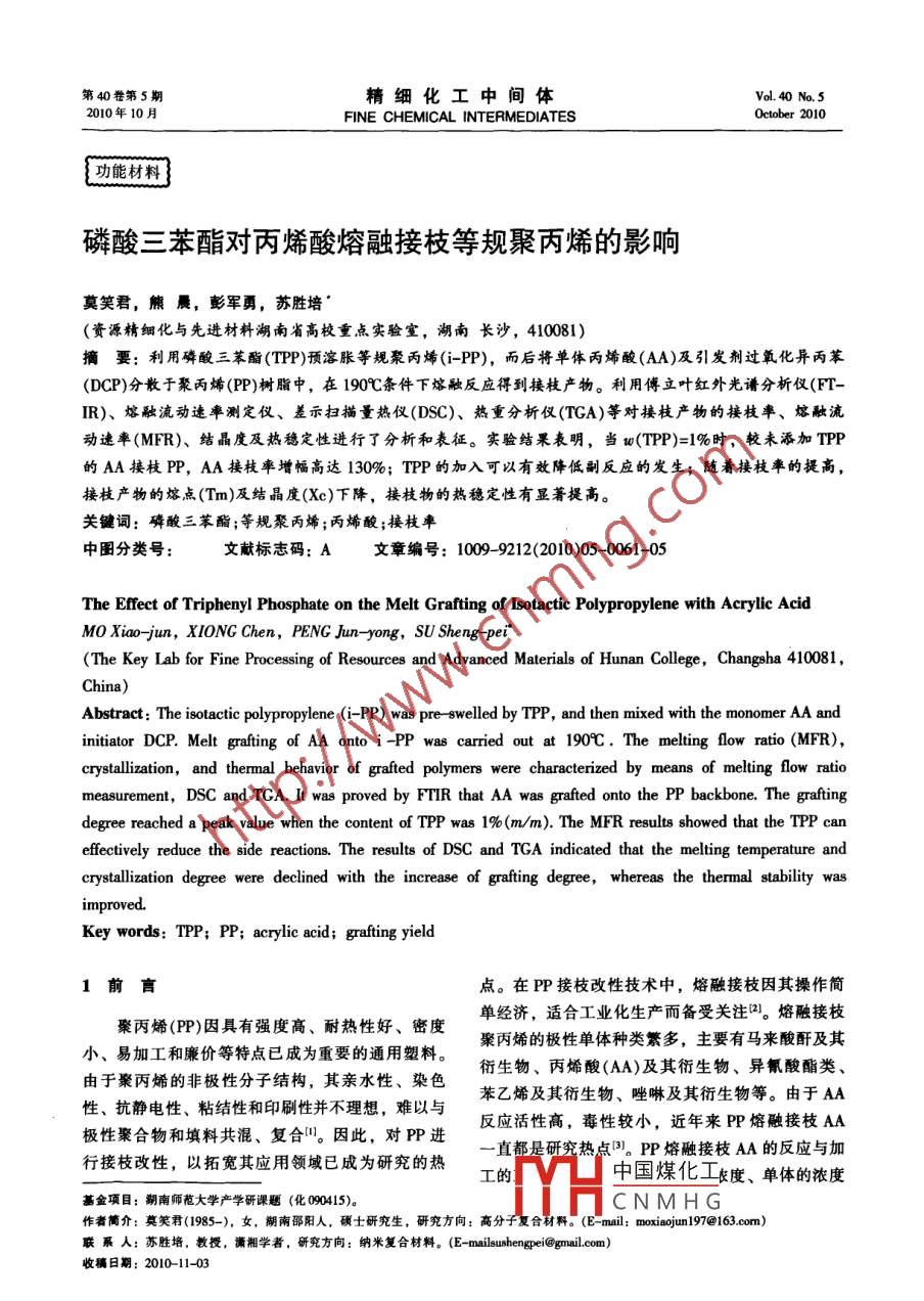 磷酸三苯醋對(duì)丙烯酸熔融接枝等規(guī)聚丙烯的影響