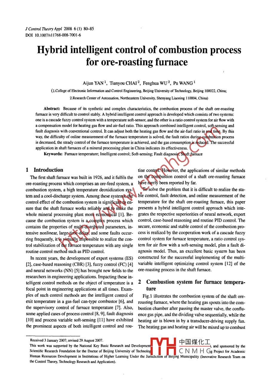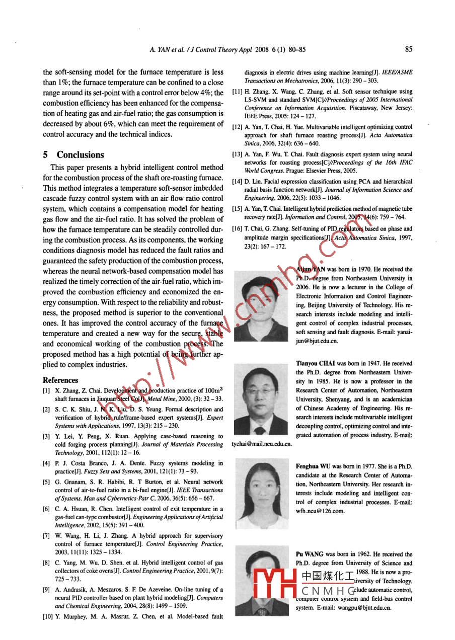 J Control TheoryAppl 2008 6(1) 80-85DOI 10.1007/51176-008-7001-6Hybrid intelligent control of combustion processfor ore-roasting furnaceAjun YAN ", Tianyou CHAI2, Fenghua WU2, Pu WANG 1(.College of Elctronic Information and Control Engineering. Beijing Univesity of Technology Beijing 10022,2 China;2.Reserch Center of Automation, Northeasterm University, Shenyang Liaoning 10004, China)Abstract: Because of its synthetic and complex characteristics, the combustion process of the shaft ore-roastingfurace is very difficult to control stably. A hybrid intelligent control approach is developed which consists of two systems:one is a cascade fuzzy control system with a temperature soft-sensor, and the other is a ratio control system for air flow witha compensation model for heating gas flow and air-fuel ratio. This approach combined itelligent control, soft- sensing andfault diagnosis with conventional control. It can adjust both the heating gas flow and the air-fuel ratio in real time. By thisway, the difficulty of online measurement of the fumace temperature is solved, the fault ratios during combustion processis decreased, the steady control of the fumace temperature is achieved, and the gas consumption is reduced. The successfulapplicaion in shaft furmaces of a mineral processing plant in China indicates its efectivness.Keywords: Furnace temperature; Inelligent control; Soft- sensing; Fault diagnosis; Shaft furace1 Introductiontine control. However, the applications of similar methodsThe first shaft furnace was built in 1926, and it fulfls the on the combustion control of a shaft ore-roasting fumaceore- roasting process which comprises an ore feed system, a have rarely been reported by far.combustion system, a high temperature deoxidization sys- To solve the problem that it is dificult to realize the sta-tem and a cool-discharge system. Among these sytems, the ble control, fault detection, and online measurement of thecontrol effect of the combustion system is significant to en- temperature for the shaft ore-roasting furmace, this papersure that the shaft furmace works reliably and to make the presents a hybrid intelligent control approach which inte-whole mineral processing plant more economical [1]. Be- grates the respective superiorities of neural network, expertcause the combustion system is a complex process which control, case-based reasoning and routine PID control. Thecontains the properties of multi-distributed parameters, in- secure, economic and stable control of the combustion pro-tensive nonlinear, large time-delay, and some faults occur- cess is realized by the cooperation work of a cascade fuzzyring frequently, it is virtually impossible to realize the con- control system for fumace temperature, a ratio control sys-trol stabilization of the furmace temperature with any single tem for air flow with a soft sensing model, plus a fault di-routine control method such as PID control.agnosis model. Thus, an excellent basic system has beenIn recent years, the development of expert systems (ES) constructed for the sucessful implementing of the muli-[2], case -based reasoning (CBR) [3]. fuzzy control (FC)[4] variable itelligent optimizing control system [12] of theand neural networks (NN) [5] has brought new fields to the ore-roasting process in the shaft furmace.researchers in engineering applications. Impacting these in-tligent control methods on the objet of temperature isa 2 Combustion system for furnace tempera-focal point in engineering applications at all times. Exam-ples of such control methods are the intelligent control ofFig.1 ilustrates the combustion system of the shaft ore-exit temperature in a gas-fuel can-type combustor [6], and roasting furmace, where the heating gas spouts into the com-the superisory control of furnace temperature [7]. Also, bustion chamber afer pssing the master valve, the confu.some pplied cases of process control [8, 9], fault diagnosis ence gas pipe, and the dividing valve seqaentill, while the[10] and process variable sf-sensing [1] have exhibited heaing air is blown in by a tasducerdriving supply fan.the prominent aspects of both ielelient control and rou- The heating gas and heating air will be mixed up to combustReceived 3 Januany 2007; revised 29 August 2007.中國煤化工This work was supported by the National Key Basic Research and Development7, andnd posored by theScientific Research Foundation for the Doctor of Beijing University of TechnologMHC N M H Gg Projet for AcademieHuman Resources Development in Intitions of Higher Leamning Under the Junsdiction of Bejig Muncipality (nnovaive Research Team onthe Control Theory, Technology Research and Aplicaion).A. YAN et al.1J Control Theory Appl 2008 6(1) 80-8581and will provide heat for the required furnace temperatureFor a long time, the combustion process has been work-(normally within the range of 1050°C~1 150°C).ing in the pattemn of manual operation. Depending on theOres from ore-feeding systempatrolling detection to the condition of combustion, the op-erators make judgments and decisions on the varying infor-Heating gas Dividingmation with their experiences. Then, they adjust the flowMaster valve valverate of heating gas and heating air manually. However, thetX-operators can bardly discover the variety of information dueXto the complication of the working conditions including theSupplycalorific value of the heating gas fuctuating frequently, andfan:|the furnace temperature being hard to be measured online.Consequently, neither the safety and the economy nor theg XHaccuracy of the control of the combustion process can beX→x+guaranteed, which may lead to such situations that the faultsoccur frequently and inferior control performances of thefumnace temperature emerge with excessive gas consump-Confluence gas pipetionConfuence airpipe I3 Hybrid intelligent control for the combus-To high temperature deoxidization systemFig. 1 Combution system of the shaft ore roating furnace.tion processTh