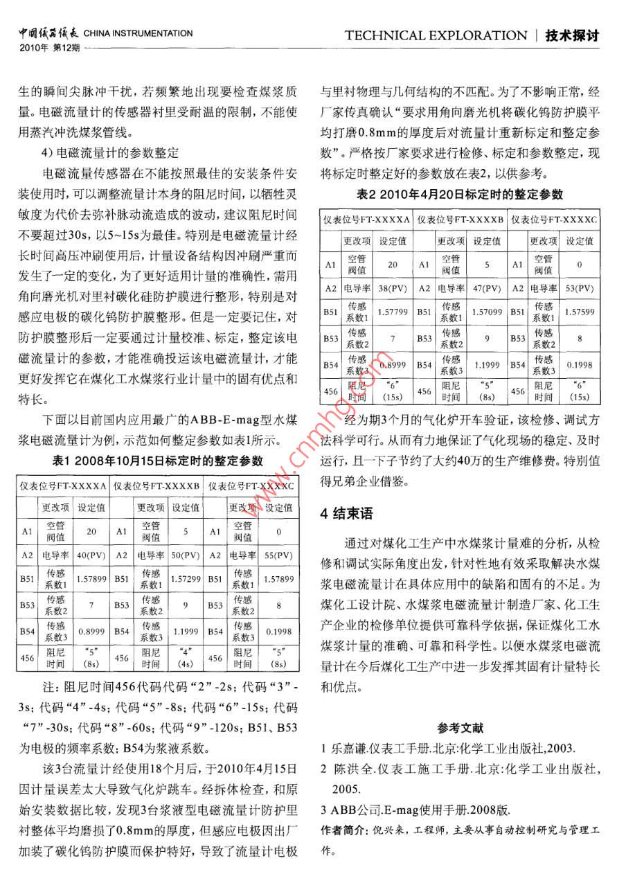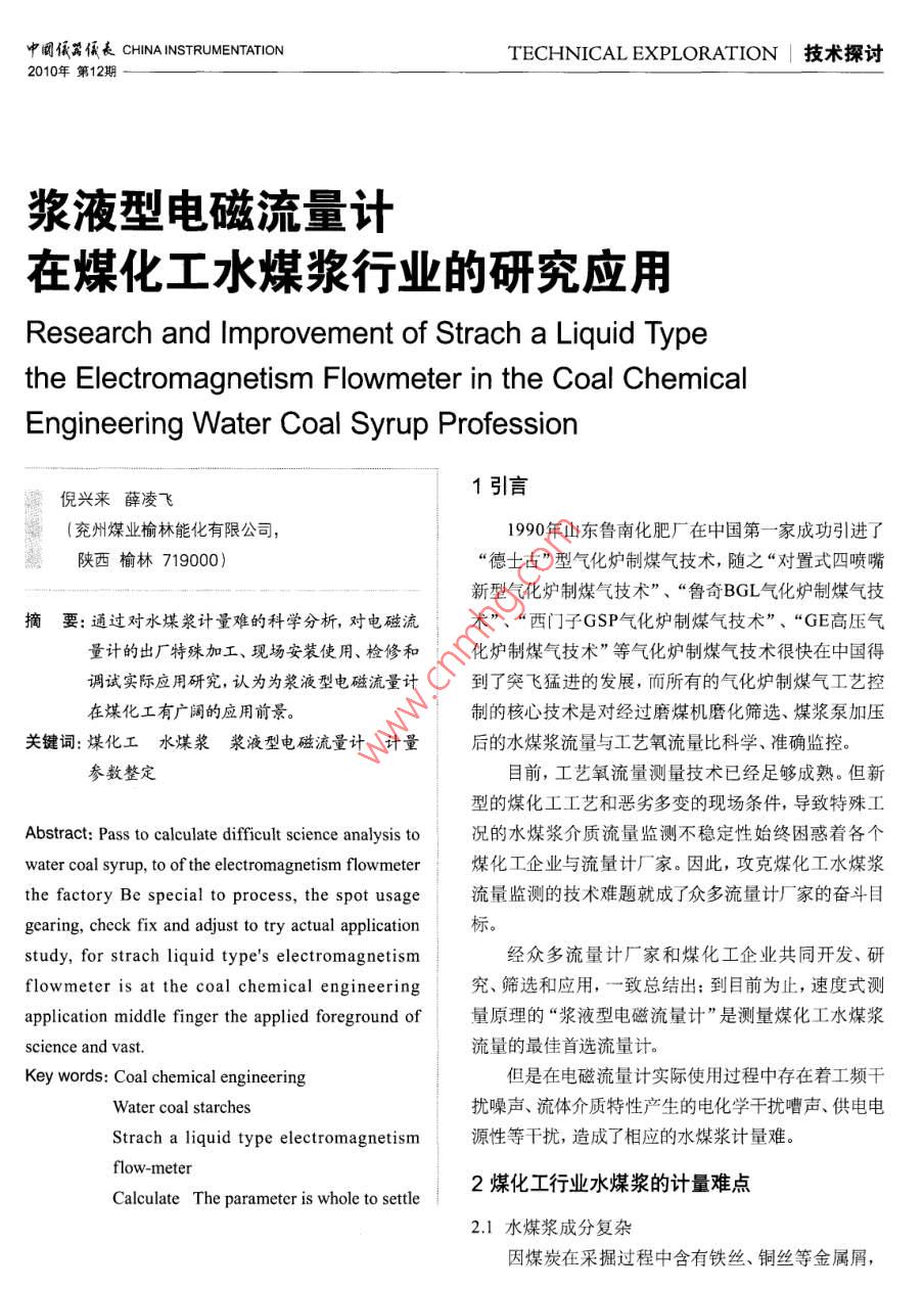 中明儀佤長(zhǎng) CHINA INSTRUMENTATIONTECHNICAL EXPLORATION技術(shù)探討2010年第12期漿液型電磁流量計(jì)在煤化工水煤漿行業(yè)的研究應(yīng)用Research and Improvement of Strach a Liquid Typethe Electromagnetism Flowmeter in the Coal chemicalEngineering Water Coal Syrup Profession倪興來(lái)薛凌飛1引言(兗州煤業(yè)榆林能化有限公司,1990年山東魯南化肥廠在中國(guó)第一家成功引進(jìn)了陜西榆林719000)“德士古”型氣化爐制煤氣技術(shù),隨之“對(duì)置式四噴嘴新型氣化爐制煤氣技術(shù)”、“魯奇BGL氣化爐制煤氣技摘要:通過(guò)對(duì)水煤漿計(jì)量難的科學(xué)分析,對(duì)電磁流術(shù)”、“西門子GSP氣化爐制煤氣技術(shù)”、“GE高壓氣量計(jì)的出廠特殊加工、現(xiàn)場(chǎng)安裝使用、檢修和化爐制煤氣技術(shù)”等氣化爐制煤氣技術(shù)很快在中國(guó)得調(diào)試實(shí)際應(yīng)用研究,認(rèn)為為漿液型電磁流量計(jì)到了突飛猛進(jìn)的發(fā)展,而所有的氣化爐制煤氣工藝控在煤化工有廣闊的應(yīng)用前景制的核心技術(shù)是對(duì)經(jīng)過(guò)磨煤機(jī)磨化篩選、煤漿泵加壓關(guān)鍵詞:煤化工水煤漿漿液型電磁流量計(jì)計(jì)量后的水煤漿流量與工藝氧流量比科學(xué)、準(zhǔn)確監(jiān)控。參數(shù)整定目前,工藝氧流量測(cè)量技術(shù)已經(jīng)足夠成熟。但新型的煤化工工藝和惡劣多變的現(xiàn)場(chǎng)條件,導(dǎo)致特殊工Abstract: Pass to calculate difficult science analysis to況的水煤漿介質(zhì)流量監(jiān)測(cè)不穩(wěn)定性始終困惑著各個(gè)water coal syrup, to of the electromagnetism flowmeter煤化工企業(yè)與流量計(jì)廠家。因此,攻克煤化工水煤漿the factory Be special to process, the spot usage流量監(jiān)測(cè)的技術(shù)難題就成了眾多流量計(jì)廠家的奮斗目gearing, check fix and adjust to try actual application標(biāo)示study, for strach liquid type's electromagnetism經(jīng)眾多流量計(jì)廠家和煤化工企業(yè)共同開(kāi)發(fā)、研flowmeter is at the coal chemical engineering究、篩選和應(yīng)用,一致總結(jié)出:到目前為止,速度式測(cè)application middle finger the applied foreground of量原理的“漿液型電磁流量計(jì)”是測(cè)量煤化工水煤漿science and vast流量的最佳首選流量計(jì)。Key words: Coal chemical engineering但是在電磁流量計(jì)實(shí)際使用過(guò)程中存在著工頻干Water coal starches擾噪聲、流體介質(zhì)特性產(chǎn)生的電化學(xué)干擾嘈聲、供電電Strach a liquid type electromagnetism源性等干擾,造成了相應(yīng)的水煤漿計(jì)量難。flow-meter2煤化工行業(yè)水煤漿的計(jì)量難點(diǎn)Calculate The parameter is whole to settle21水煤漿成分復(fù)雜因煤炭在采掘過(guò)程中含有鐵絲、銅絲等金屬屑,技術(shù)探討| TECHNICAL EXPLORATIOCHINA INSTRUMENTATION中闞低長(zhǎng)2010年第12期通過(guò)皮帶輸送到棒磨機(jī)或球磨機(jī)里,和造紙廢液、甲形成極化電壓,會(huì)加大電磁流量計(jì)本身的測(cè)量精度和醇廢水等添加劑進(jìn)行研磨,生成含量為60%~-70%、操進(jìn)一步造成增大波動(dòng)量。而不銹鋼管線基本不存在此作密度為1250-1286kg/m3動(dòng)力粘度為700-3000cp問(wèn)題。的水煤漿。棒磨機(jī)或球磨機(jī)在研磨煤炭碰撞會(huì)進(jìn)一步脫落部分金屬顆粒,后續(xù)設(shè)備不可能完全過(guò)濾、去除3漿液型電磁流量計(jì)的應(yīng)用研究水煤漿中含有金屬顆粒,計(jì)量過(guò)程中的沖擊和磨損容3.1電磁流量計(jì)的特別安裝要求易造成加壓泵及其它計(jì)量主輔設(shè)備的易損壞。嚴(yán)格按照電磁流量計(jì)安裝要求安裝,并且盡可能2.2水煤漿介質(zhì)特性影響地將3臺(tái)電磁流量計(jì)安裝在汽化爐頂部。延長(zhǎng)流量計(jì)在測(cè)量水煤漿、泥漿等液、固兩相混合導(dǎo)電性介的前直管段是解決煤漿加壓泵工作時(shí)造成脈動(dòng)的最質(zhì)流量時(shí),在固體顆粒或者纖維介質(zhì)擦過(guò)電極表面佳辦法。時(shí),電級(jí)表面的接觸電化學(xué)電勢(shì)突然變化,造成從傳3.,2電磁流量計(jì)的特殊加工感器輸出的電極檢測(cè)信號(hào)出現(xiàn)尖脈沖漿液(干擾)噪用專用量具量出電磁流量計(jì)的法蘭接口尺寸并經(jīng)聲,它將造成顯示和信號(hào)輸出波動(dòng),波動(dòng)量大小與傳計(jì)算和設(shè)計(jì),用316錳絡(luò)合金等特殊材質(zhì)加工成接口感器的勵(lì)磁電流頻率1f的頻譜特性關(guān)系。金屬顆粒的法蘭的防護(hù)沖刷磨損套。對(duì)電磁流量計(jì)的腔室渡上碳摩擦?xí)a(chǎn)生更加嚴(yán)重的瞬間尖脈沖干擾,最終造成電化硅(對(duì)電磁干擾有防護(hù)作用)防護(hù)沖刷磨損膜。對(duì)磁流量信號(hào)所受干擾嚴(yán)重而導(dǎo)致測(cè)量不穩(wěn)定。電磁流量計(jì)感應(yīng)電極度上碳化鎢防護(hù)沖刷磨損膜。23加壓泵的影響33電磁流量計(jì)使用建議加壓泵工作時(shí)存在脈動(dòng)流是必然的。在水煤漿(1)在單機(jī)試車階段嚴(yán)禁對(duì)電磁流量計(jì)送電,先制造及普通鍋爐燃燒的加壓環(huán)節(jié)基夲上采用“螺杄做奷煤漿循環(huán)管線磨損防護(hù),利用水煤漿對(duì)煤漿管線泵”,因其結(jié)構(gòu)及工作方式在不同的轉(zhuǎn)速下脈動(dòng)流內(nèi)壁除銹,否則鐵銹會(huì)被電磁傳感器內(nèi)壁的磁場(chǎng)吸附的波動(