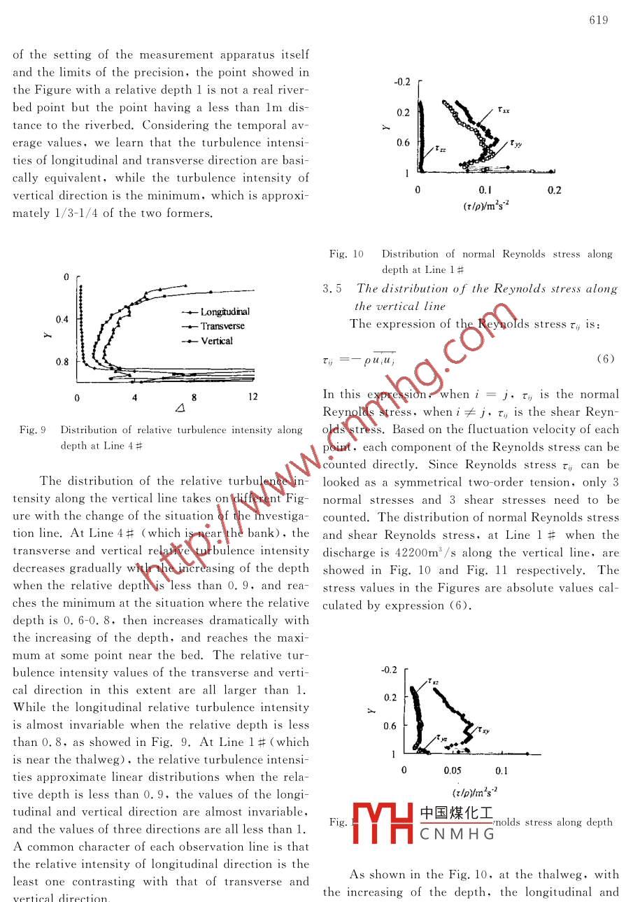 615Journal of Hydrodynamics, Ser. B, 2005,17(5):615- 620China Ocean Press,Beijing - Printed in ChinaOBSERVATION AND ANALYSIS ON CHARACTERISTIC OF NATURAL RIV-ERS"LU Jin-you, XU Hai-tao, YAO Shi- mingYangtze River Scientific Research Institute, Wuhan 430010,China,E- mail:lujy@ mail:crsri. cn(Received Aug. 12, 2004)ABSTRACT: Based on the previous study on turbulent Nanjinguan. Based on the field data, the large-scalestructure, field experiments on fluctuation velocity were car- turbulent structure was investigated. In this paper,ried out in section Huangingmiao of main stream of Y angtzeanalysis is carried out based on the field data of sec-River with a 3-D Doppler velocimeter. And a number of datation Huanglingmiao.such as velocity of different discharge and different verticalline were obtained. According to the field experiment data,period,frequency, period function and probability densityfunction of large scale coherent structure in natural river wereprescribed by means of quantitative analysis. And the problemabout distribution of time average velocity, turbulent intensity8069.44 3#, 14# 2#and Reynolds stress along depth were further analyzed andcalculated. The results in this paper will deepen the under-王40-stand of large- scale turbulent structure in natural river and somake the base for applying“ turbulence theory” to water con-5C200400600servancy,hydroelectric, environment engineering and so on.L./mKEY WORDS: natural river, large scale turbulence,turbu-Fig.Landform of huanglingmiao hydro-section and ar-lent mechanismrangement of observation vertical-lines2. GENERAL SITUATIONS OF OBSERVATIONS1. INTRODUCTIONThe landform of Huanglingmiao hydro-sectionMost of flows in natural rivers are turbulent,and arrangement of observation vertical-lines areind many fluid dynamic questions of engineeringshown in Fig. 1. By placing a 3-D Doppler velocimemust be solved by turbulence theory. But at pres-ter at the vertical line about lm deep under the wa-ent, turbulence theory has not reached the level toter,point velocity fluctuation processes of everyobtain a general solution for fluid dynamic questionsvertical line were observed. Observations were perof practical engineerings, many practical questionsformed at different vertical lines at thalweg or nearcouldn't be solved absolutely.In the past, abundant researches on turbulencethe bank,under different discharges of high andmiddle water level. Velocimeter can set observationfeatures of flows have been performed by manypoints at the vertical line at discretion. Flow genesscholars[1-8],but most of those works aimed atof river reaches of each observation are shown influme experiments, few aimed at the turbulence ofTable 1. Each group of observation data includesnatural flow. In this item, with a 3-D Doppler velo-depth of observation point h,longitudinal velocitycimeter, turbulent structures in natural rivers were中國煤化工vertical velocity u。observed at different sites: estuary of Yangtze Riv-synth.MHCNMHG on. Sampling inter-er, section Huanglingmiao, the outlet of open di-vals are between U. bs -3s,and observations allversion channel of the Three Gorges Project andProject supported by the National Natural Science Foundation of China (Grant No: 50179001).Biography :石方熬據(jù)u (1963-). Male, Mater, Professor Senior Engineering616Table1 Flow genes in section Huanglingmiao when observation was carried outNumber of observation vertical line1#2#3#4#Distance (m)350310470Sampling intervals (s)2. 472.272.00.570. 57Observation last (h)1. 070.681.00.6Discharge (m3 /s)3000030000 4220042200 1120011200Water depth (m)60. 6317. 163.2 17.8 60.87 25. 9Width of water surface (m)504511495Hydraulic radius (m)34. 134.134. 8734.87 33. 1333. 13Slope of Water Surface (%)0. 1020. 1020. 1810.1810.019.0. 019Profile Average Velocity (m/s)1.674 1. 6742. 2772.277 0. 6550.655Friction Velocity (m/s)0. 1850. 1850. 2490.249 0. 0780. 078Reynolds Number (X10' )6.39.02.4Bed Materials doo (mm)0. 3550. 4010. 3130.876 0. 331). 251lasted more than 1h. Consequently, the observation 20s 30s,while the 1. 105m/s velocity of about 80s-data reflect the relatively strong fluctuations. Ultra- 100s. Through analysis, we draw a conclusion: thesonic launch frequency of velocimeter is 300Hz. As average point velocity value of long- term observa-a result, the data collected is not instantaneous val- tion comes forth at a minimum interval, the intervalue,but average value of samplings in the pre-estab- will both increase by adding to or subtracting fromlished time range Ol .the average velocity a same value, and the increas-ing extents are approximately equal. All of the fluc-3. ANALYSIS ON TURBULENT STRUCTUREtuation progress lines can be decomposed into sever-3.1 Quasi periodicity of water turbulenceal different periodic functions, so large scale turbu -Considering a certain point of every vertical line lence can be looked as a superposition of several vorespectively, velocity progress curves of three directexes of different scale and several syntonic waves oftions are drawn along the time. Despite of the different turbulence periodicity.difference of observation time, vertical line and 3. 2 The probability distribution of fluctuationpoint, the fluctuation progresses of velocity are ba-velocitysically similar. Fig. 2 shows fluctuation progressesDo probahilitv statistics of us, uy,and u。ofof three directions of the point at Line 3 # where each中國煤化工rin the emergence fre-the relative depth is 0. 96. From Fig. 2,we learn quencC N M H Gvelocity extension andthat large- scale turbulences have quasi- periodicities draw the frequency curve. The results in Fig. 3 andof different sizes. Statistics indicate that the average Fig. 4 show the experiential frequency curves of lon-velocity of longitudinal direction is 0. 709m/s, the gitudinal and transverse fluctuation velocities in ver-0.805m/方號數(shù)據(jù)Y comes forth at interval of about tical lines. Figure 5 shows both exper