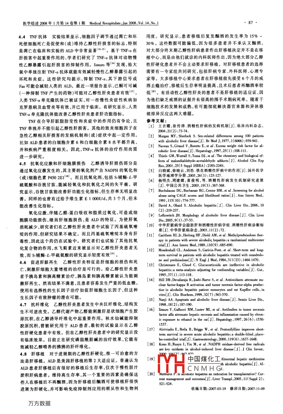 醫(yī)學綜述2008年1月第14卷第1期 Medical Recapitulat,Jn200vd14,No1乙醇性肝病黃慶科(綜述),林菊生(審校)(1溫州醫(yī)學院附屬第一醫(yī)院消化內科,浙江溫州3250002華中科技大學同濟醫(yī)學院附屬同濟醫(yī)院消化內科,武漢4300中圖分類號:R575.5文獻標識碼:A文章編號:10062084(2008)01-008404摘要:乙醇性肝病是一有特異性病理生理改變的肝臟損傷。乙醇性肝病在組織瘸理學上主入量是個體化的而且已明確有很多要表現(xiàn)為3種形式:乙醉性脂肪肝、乙醇性肝類和乙醇性肝硬化。乙醉性肝病的發(fā)病機制尚不酗酒以外的因素決定乙醇性肝損害的明確但免要機制和自由基損傷被認為起重要作用。乙性肝病的臨床表觀包括乏力不適,黃敏感性。如一些特殊基因的多態(tài)性皰等。治療的主要措施是戒酒、感染和門脈高壓等并發(fā)癥的處理、營養(yǎng)支持可預示某些特殊人群對乙醇的肝毒性關鍵詞:乙醇;肝疾病;肝硬化有更大的敏感性,尤其是TNF激動子filiated Hospital of Wendar UANG Qing-ke2, LIN Ju-sheng2.(1. epartment of gastroenterology,Fm的突變和乙醇代謝酶系統(tǒng)的突變包Alcoholic Liver Diseaseh4Mdm0,m0括乙醇脫氫酶乙醛脫氫酶和微粒體氧化酶系統(tǒng)。肝炎病毒感染也可加重e,由 a has three manifestations in histopathe, uding alcoholic fatty liver, alcoholic hepatitis and,AD患者的肝損害,另外有些研究coholic cirthosis. The pathogenesis of alcoholic liver disease is not very clear, but immunological mechanism示肥胖可能是一危險因素。and free radical injury are considered to play important role in its genesis. The elinical manifestation of alco-AID的發(fā)病機制較復雜。乙醇本hole liver disease includes debility, complaint, jaundice and so on. Its main therapy includes stoping drinking, treating its complications such as infection, portal hypertention and so on and nutritional support身對肝臟組織細胞有直接損傷作用。Key words: Alcohol; Liver disease; Cirmho乙醇是脂溶性物質,它破壞生物膜的脂質雙分子層,改變膜的順應性及對乙醇性肝病( alcoholic liver disease,AID)在西方國家是常鈣的通透性,影響膜的結構和功能。同樣也破壞線粒體膜的見的疾病和主要死亡原因之一。近來隨著中國經濟水平的發(fā)結構和功能。乙醇還可通過氧化應激引起肝臟損傷。乙醇在展,乙醇的消耗量增加,AID明顯增多。ALD在組織病理學上肝細胞內的級聯(lián)氧化過程中,導致輔酶Ⅰ轉變?yōu)檫€原型輔主要表現(xiàn)為3種形式:乙醇性脂肪肝、乙醇性肝炎和乙醇性肝酶Ⅰ,使還原型輔酶Ⅰ輔酶I的比值明顯增高,進而出現(xiàn)氧硬化,這3種形式可單獨或混和存在。AID的發(fā)病機制較復化還原作用的改變,產生過多的氧應激產物,如OH、O2雜,乙醇及其代謝產物對肝臟可發(fā)生直接和間接損傷。治療H2O2等自由基,這些自由基可激活磷脂酶及脂質過氧化反的主要措施是戒酒、感染和門脈高壓等并發(fā)癥的處理、營養(yǎng)支應,破壞膜磷脂,改變膜通透性和流動性,從而改變與膜結合持,而激素治療尚有爭論。對于進展的乙醇性肝硬化惟一可的酶、受體和離子通道的微環(huán)境,影響其功能。此外脂質過氧治愈的方法是肝移植?;€影響DNA和蛋白質的結構和功能。正常肝內存在抗氧1發(fā)病機制化物質,如谷胱甘肽和維生素A、C、E等。長期酗酒者,肝細體攝人的乙醇主要在十二指腸、上段回腸以及胃通過胞內谷胱甘肽含量明顯降低,以線粒體最為明顯,從而加劇對單純擴散吸收,進入血循環(huán)后迅速分布,在肝、肺及腦部等血線粒體結構和功能的損害。長期飲酒造成的營養(yǎng)吸收不良也管分布較多的器官很快達到平衡。乙醉在體內不能儲存,使食物中抗氧化劑吸收減少。因此,長期飲酒導致機體內促主要在肝臟內被乙醇脫氫酶和微粒體乙醇氧化酶系統(tǒng)所氧化氧化物質產生明顯增多和抗氧化物質的減少,促發(fā)氧化應激代謝。當血循環(huán)中乙醇含量較低時,主要由乙醇脫氫酶代謝。最終導致肝細胞死亡或凋亡當乙醇水平很高時或長期飲酒者,則主要由微粒體乙醇氧化乙醇的主要中間代謝產物乙醛對肝細胞損傷更為突出酶系統(tǒng)起作用,其功能依賴于細胞色素F50。乙醇經上述酶并且可以阻止其自身在線粒體的氧化,使這一毒性物質不斷解途徑代謝后的主要代謝物是乙醛,同時還產生氧應激產物。增加。乙醛能降低肝臟對脂肪酸的氧化;損傷線粒體,抑制乙醛隨后又被乙醛脫氫酶氧化代謝為乙酸,最終的產物是二羧酸循環(huán);影響肝臟的微管系統(tǒng)造成脂質和蛋白質在肝臟細氧化碳和水。長期乙醇攝入可致乙醇脫氫酶活性減低,不能胞中沉積;與細胞膜結合而改變其通透性及流動性;抑制及時代謝乙醛,而導致過多的乙醛在體內(主要在肝臟局部)DNA的修復和DNA中胞嘧啶的甲基化,從而抑制細胞的分化潴留及損傷組織的再生、修復口。乙醛主要在肝小葉中央?yún)^(qū)產生發(fā)生ALD所需要乙醇的量大約為每天80g,并持續(xù)數(shù)年。增多,古心量最低,最容易出現(xiàn)缺在乙醇攝入量相同的情況下,女性發(fā)生ALD的危險性要明顯氧性拉中國煤化工統(tǒng)產生氧自由基,其高于男性。以往認為女性胃內乙醇脫氫酶量少活性低是危本身自CNMHG梅蛋白結合,使谷胱甘險性增高的原因,現(xiàn)認為與女性飲酒后內毒素水平高及雌激肽水平下降,機體內源性抗氧化能力減弱難以清除過多的自素上調內毒素受體CD4和核因子kB與腫
