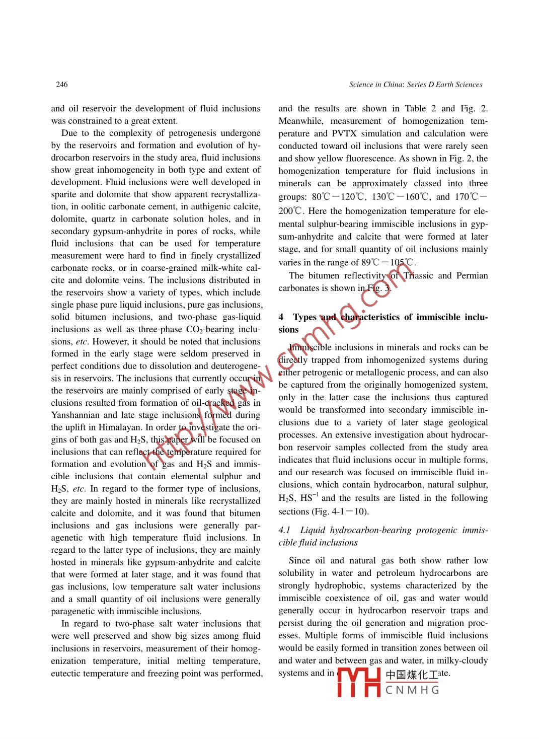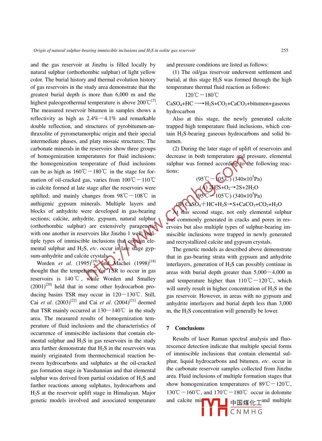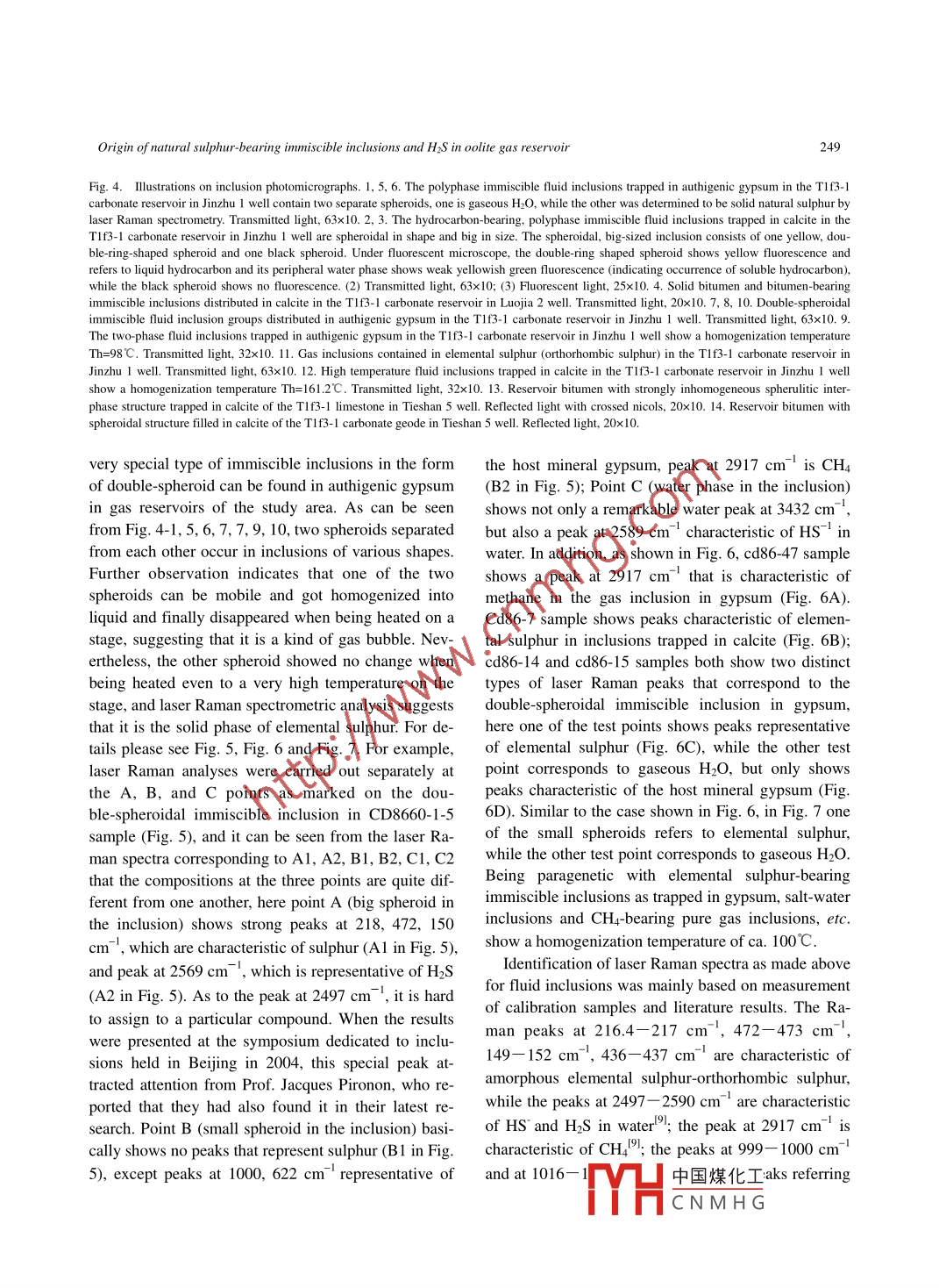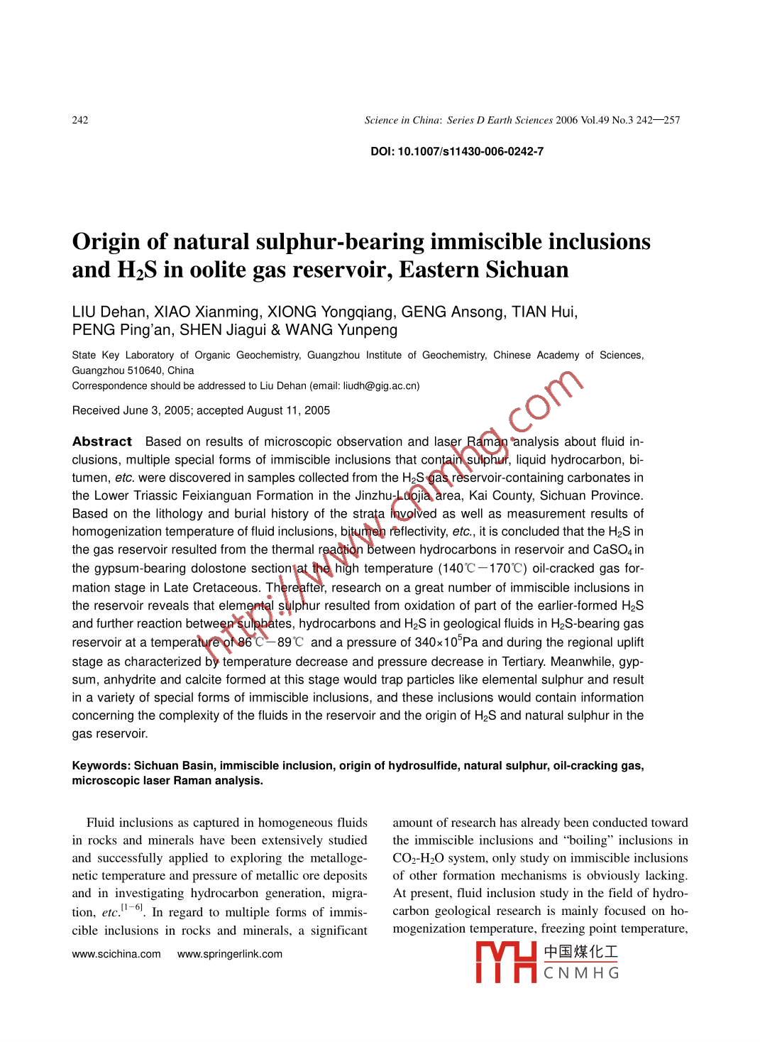 242Science in China: Series D Earth Sciences 2006 Vol.49 No.3 242- -257DOI: 10.1007/s11430-006-0242-7Origin of natural sulphur-bearing immiscible inclusionsand H2S in oolite gas reservoir, Eastern SichuanLIU Dehan, XIAO Xianming, XIONG Yongqiang, GENG Ansong, TIAN Hui,PENG Ping'an, SHEN Jiagui & WANG YunpengState Key Laboratory of Organic Geochemistry, Guangzhou Institute of Geochemistry, Chinese Academy of Sciences,Guangzhou 510640, ChinaCorrespondence should be addressed to Liu Dehan (email: liudh@gig.ac.cn)Received June 3, 2005; accepted August 11, 2005Abstract Based on results of microscopic observation and laser Raman analysis about fluid in-clusions, multiple special forms of immiscible inclusions that contain sulphur, liquid hydrocarbon, bi-tumen, etc. were discovered in samples collected from the H2S gas reservoir-containing carbonates inthe Lower Triassic Feixianguan Formation in the Jinzhu-Luoja area, Kai County, Sichuan Province.Based on the lithology and burial history of the strata involved as well as measurement results ofhomogenization temperature of fluid inclusions, bitumen reflectivity, etc., it is concluded that the H2S in .the gas reservoir resulted from the thermal reaction between hydrocarbons in reservoir and CaSO4 inthe gypsum-bearing dolostone section at the high temperature (140C一170C) oil-cracked gas for-mation stage in Late Cretaceous. Thereafter, research on a great number of immiscible inclusions inthe reservoir reveals that elemental sulphur resulted from oxidation of part of the earlier-formed H2Sand further reaction between sulphates, hydrocarbons and H2S in geological fluids in H2S-bearing gasreservoir at a temperature of 86C- 89°C and a pressure of 340x10*Pa and during the regional upliftstage as characterized by temperature decrease and pressure decrease in Tertiary. Meanwhile, gyp-sum, anhydrite and calcite formed at this stage would trap particles like elemental sulphur and resultin a variety of special forms of immiscible inclusions, and these inclusions would contain informationconcerning the complexity of the fluids in the reservoir and the origin of H2S and natural sulphur in thegas reservoir.Keywords: Sichuan Basin, immiscible inclusion, origin of hydrosulfide, natural sulphur, oil-cracking gas,microscopic laser Raman analysis.Fluid inclusions as captured in homogeneous fluids amount of research has already been conducted towardin rocks and minerals have been extensively studiedthe immiscible inclusions and“boilling” inclusions inand successfully applied to exploring the metalloge- CO2-H2O system, only study on immiscible inclusionsnetic temperature and pressure of metallic ore depositsof other formation mechanisms is obviously lacking.and in investigating hydrocarbon generation, migra-At present, fluid inclusion study in the field of hydro-tion, etc." 0. In regard to multiple forms of immis-carbon geological research is mainly focused on ho-cible inclusions in rocks and minerals, a significantmogenization temperature, freezing point temperature,www.scichina.com www. springerlink.com中國(guó)煤化工MYHCNMH G.Origin of natural sulphur-bearing immiscible inclusions and HzS in oolite gas reservoir243etc. of fluid inclusions as trapped in homogenized tion of sapropel-type pelitic carbonate source rocks ofsystem, while few research on immiscible inclusionstrough facies in Permian and Triassic, and the layouthas been published so far. As a matter of fact, multiple of the Ertan gas reservoir in the Feixianguan Forma-forms of immiscible inclusions might occur in sometion in the two sides of the trough. Here in Easternhydrocarbon reservoirs and pervious layers, only not Sichuan, the marine facies strata were mainly devel-much focus was put on their research. Recently theoped from Upper Permian to Lower Triassic, and theauthors discovered the occurrence of polyphase im-Lower Triassic Feixianguan Formation mainly con-miscible inclusions that contain natural sulphur and sists of pelitic carbonates of marine facies-tidal-flatH2S in the Ertan gas reservoir of the Triassic Feixian-facies and saltish lagoon facies and deposits of gyp-guan Formation in Sichuan Basin, which can unsum-salt facies. The pelitic carbonates of trough faciesdoubtedly yield key information concerning the originin the Upper Permian Changxing Formation has a relicof hydrogen sulfide and natural sulphur. Gas from theorganic carbon concentration being as high as 0.4%-Ertan reservoir is highly enriched in H2S, and on De-1.1%, while the pelitic carbonates of trough facies incember 23, 2003 a blowout accident occurred in the Feixianguan Formation has a relic organic carbonLuojia Village 16 gas mine in Kai County, Sichuan,concentration of 0.4%一0.5%, hence becoming majorwhich resulted in large area H2S-related poisoning.hydrocarbon source rocks in the study area. On theTherefore, study on the origin of hydrogen sulfideswo sides of the NE-trending Kaijiang-Liangpingand natural sulphur in gas reservoirs has become a keytrough, carbonate rocks of oolitic beach facies charac-issue that has attracted extensive attention in gas ex- terized by abundant porosity were developed, and be-ploration and development.came important hydrocarbon reservoirs. The multiplelayers of gypsum- salt and pelitic rocks in the TriassicJialingjiang Formation and Feixianguan Formation1 Samples and petroleum geologic settingserved as the direct covers for the Ertan gas reservoirI.1 Petroleum geologic settingin the Feixianguan Formation and the Cretaceous redThe oolite gas reservoir in the Feixianguan Forma-beds as the regional cover for the gas reservoir.tion is located in Kaijiang, Liangping, Kaixian andAn analysis about the burial history and thermalWanyuan in northeast Sichuan, and geotectonicallyevolution history of the hydrocarbon source rocks inbelongs to the northwestern margin of the Yangtzethe Permian System and the Triassic System in thePlate. Its basement is composed of Proterozoic lovstudy area was c