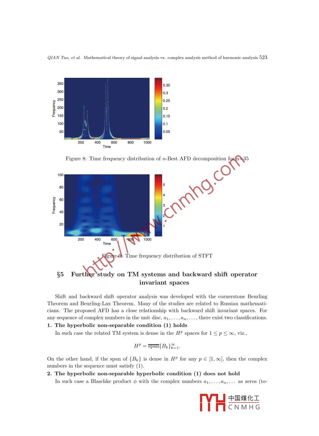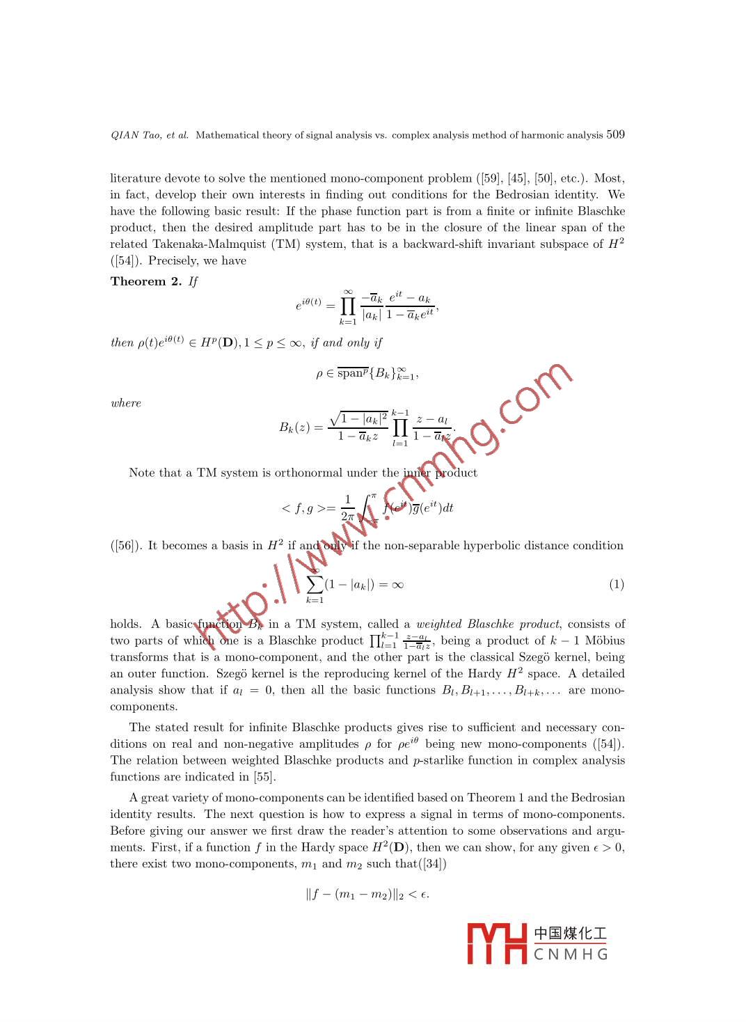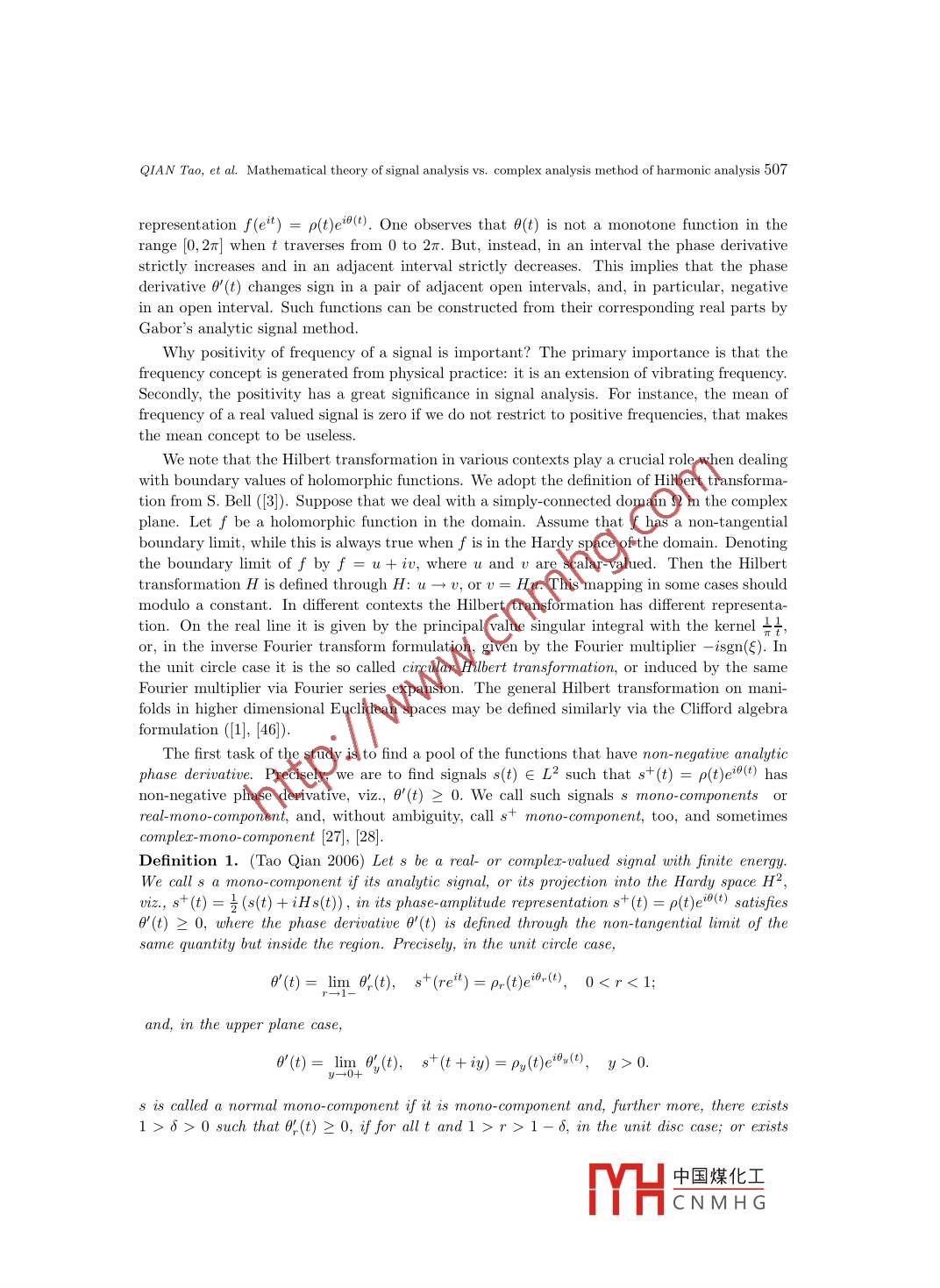 Appl. Math. J. Chinese Univ.2013, 28(4): 505-530Mathematical theory of signal analysis vs. complexanalysis method of harmonic analysisQIAN TaolZHANG Li-ming2Abstract. We present recent work of harmonic and signal analysis based on the complex Hardyspace approach.δ1 IntroductionProfessor Gong Sheng shared with the first author his view:“On the unit circle it is harmonicanalysis, and inside the unit circle it is complex analysis" ([16]). This is, in fact, common senseamong analysis. In general, we regard the following as what we mean by complex method ofharmonic analysis. Suppose that one is to study analysis on a closed and finite-dimensionalmanifold. One can then imbed the manifold into a space of one more (or several more) dimension(dimensions) with a complex analysis structure, and, in such way, one treats the manifoldunderstudy as a co-dimension 1 (or co-dimension p) space. By a complex structure it meansthat there exist a Cauchy kernel and a Cauchy formula, and the related complex analysisobjects. With the complex structure one can define Hardy spaces of good complex holomorphicfunctions in the regions enclosed by the manifold. Functions on the manifold then can be splitinto a sum of the boundary limits of the related Hardy space functions. Those boundary limitsconstitute boundary Hardy spaces. Such idea was, in fact, taught by M.-T. Cheng and D.-G.Deng when the first author was in his Ph.D. program in Beijing University around 1980. Itis also hinted by the book of Gorusin translated by Jian-Gong Chen ([17]). The author alsolearned this idea from the works by C. Kenig and, separately, by A. McIntosh on complex Hardyspaces and singular integrals on Lipschitz curves and surfaces. This article gives a survey on theresults that the authors and their collaborators obtained by implementing the complex analysisapproach to signal analysis.It has been a controversial issue to the present time about what is instantaneous frequency(IF), or, in brief, frequency. People tend to believe for a general signal there is a certain frequencyReceived: 2013-10-16.MR Subject Classification: 42A50, 32A30, 32A35, 46J15.Keywords: Mobius transform, Blaschke form, mono- component, Hardy space, adaptive Fourier decomposi-tion, rational approximation, rational orthogonal system, time-frequency distribution, digital signal processing,uncertainty principle, higher dimensional signal analysis in several complex variables and the Clifford algebrasetting.Digital Object Identifier(DO): 10. 10751166-013-3225-4.The work was partially supported by Research Grant of University of Macau MYRG115(Y1-L4)-FST13-QT,Macao Science and Technology Fund FDCT/098/2012/A3.中國(guó)煤化工MHCNMH G506Appl. Math. J. Chinese Univ.Vol. 28, No.4at any moment of time. This belief is hinted and supported by sinusoidal signals that possessthe constant frequencies. To justify this idea is to define what is frequency. For a generalsignal a well acceptable and reasonable way to define instantaneous frequency has not beenfound. Our view is that there does not exist a frequency concept for a general signal. Our workproposes a definition under which some signals have well defined instantaneous frequencies, andsome not. Signals possessing IF are called mono-components, and otherwise, multi- components.For multi-components one seeks for mono-component decompositions. We now review the storystarted from Gabor.In 1946 Gabor proposed his analytic signal approach ([15]). Throughout this article werestrict ourselves to only signals with finite energy, or L2-functions. Let s(t) be a real-valuedsignal of finite energy. The associated analytic signal, denoted by s+(t), is defined ass+(t)= (<() + iH(),where H is the Hilbert transformation. We note that analytic signals are non-tangential bound-ary limits (the Plemelj formula) of Hardy space functions in the related domain, the latter con-sisting of holomorphic functions with good control close to the boundary. For the real line casethe related domain is the upper-half complex plane. The Hardy space functions in the domainare given by the Cauchy integral of the signal s(t) on the boundary. We note that through outthe paper, except in the final section for multivariate signals, we use the terminology Hardyspace only for the complex Hardy H2 spaces in either the contexts inside or outside of the unitdisc, or the contexts of the upper- or lower- half complex planes. There are esentially paralleltheories in the four contexts. We will feel free in below to switch from one context to another.From paragraph to paragraph we will make sure that we give clear indication to which con-text we are referring. We will use the notations L2(R), H2(C+), L2(OD), H2(D), etc., whereR, C,D and C+ denote, respectively, the real line, the complex plane, the unit disc and theupper-half- complex plane. When we use H2 and L2 we mean that we refer to all the fourcontexts.On the real line, the Fourier transform of Hs is - isgn(.)8(). As consequence, the Fouriertransform of s+ is supported on [0,∞), and, in particular,s+()=赤[^ e(s()dE.This shows that s+ is a“l(fā)inear combination”of some terms of non-negative frequencies, viz.,of those eit with ξ≥0. It hence has reason to believe that in a single-term-amplitude-phaserepresentation, viz, s+(t) = p(t)ei6(t), one should have that the phase derivative of s+, oralternatively, the analytic phase derivative of s, satisfies θ'(t)≥0. But, unfortunately, this isnot true. To make clear the terminology, we note that if s= s+, then st+ = s. This amountsthat analytic phase derivatives of boundary values of the Hardy space functions coincide withthe phase derivatives of the functions. It is a fact that phase derivatives of any non- trivialanalytic outer function are negative in a set of positive Lebesgue measure [26]. Such examplescan be simply constructed as follows. Consider a fractional linear transform, f, in the complexplane that maps the unit disc centered at the origin onto a