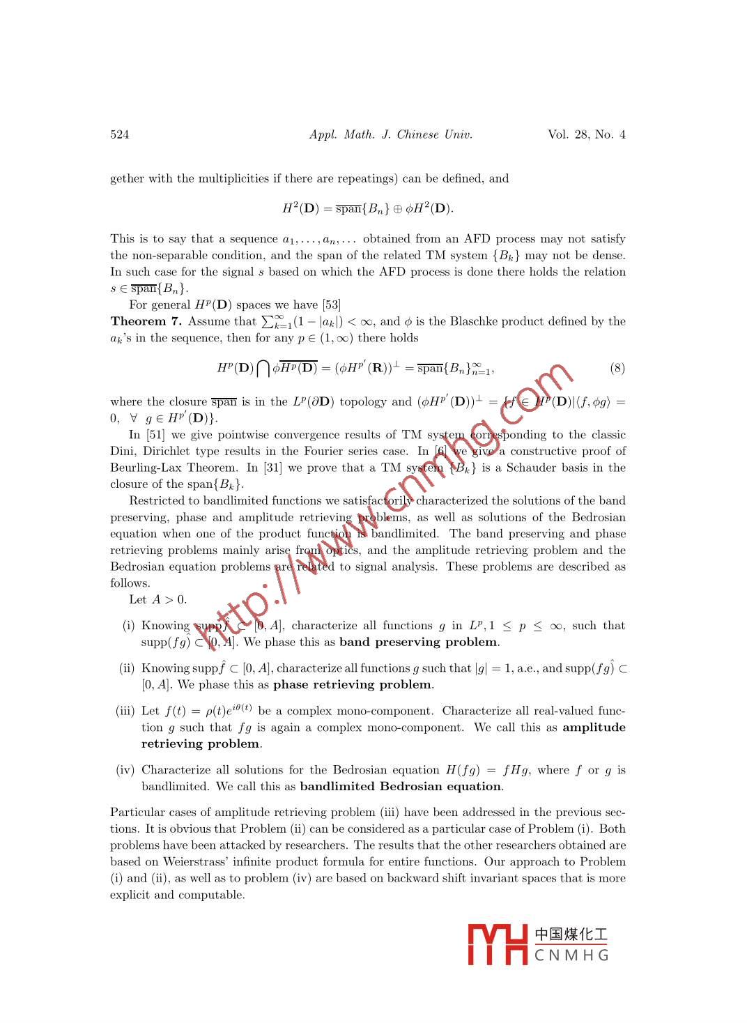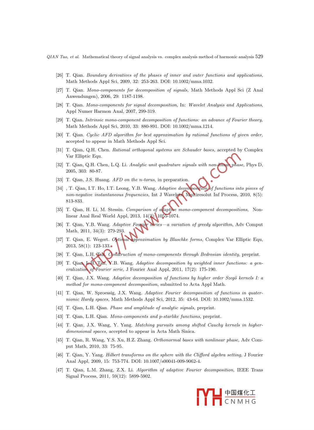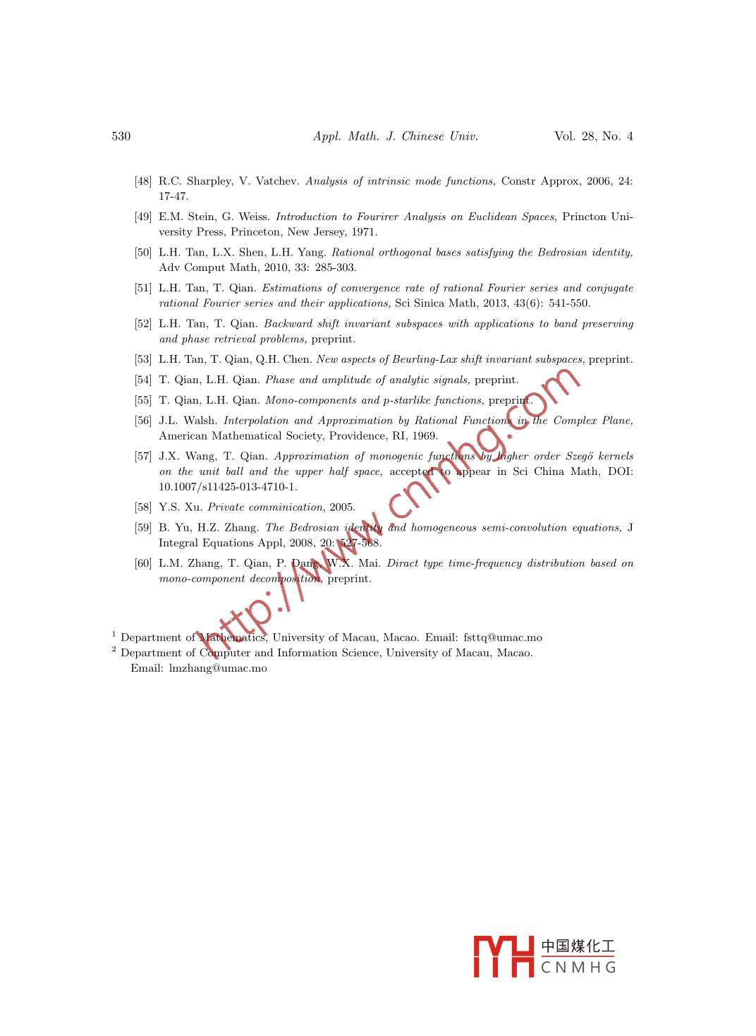 Appl. Math. J. Chinese Univ.2013, 28(4): 505-530Mathematical theory of signal analysis vs. complexanalysis method of harmonic analysisQIAN TaolZHANG Li-ming2Abstract. We present recent work of harmonic and signal analysis based on the complex Hardyspace approach.δ1 IntroductionProfessor Gong Sheng shared with the first author his view:“On the unit circle it is harmonicanalysis, and inside the unit circle it is complex analysis" ([16]). This is, in fact, common senseamong analysis. In general, we regard the following as what we mean by complex method ofharmonic analysis. Suppose that one is to study analysis on a closed and finite-dimensionalmanifold. One can then imbed the manifold into a space of one more (or several more) dimension(dimensions) with a complex analysis structure, and, in such way, one treats the manifoldunderstudy as a co-dimension 1 (or co-dimension p) space. By a complex structure it meansthat there exist a Cauchy kernel and a Cauchy formula, and the related complex analysisobjects. With the complex structure one can define Hardy spaces of good complex holomorphicfunctions in the regions enclosed by the manifold. Functions on the manifold then can be splitinto a sum of the boundary limits of the related Hardy space functions. Those boundary limitsconstitute boundary Hardy spaces. Such idea was, in fact, taught by M.-T. Cheng and D.-G.Deng when the first author was in his Ph.D. program in Beijing University around 1980. Itis also hinted by the book of Gorusin translated by Jian-Gong Chen ([17]). The author alsolearned this idea from the works by C. Kenig and, separately, by A. McIntosh on complex Hardyspaces and singular integrals on Lipschitz curves and surfaces. This article gives a survey on theresults that the authors and their collaborators obtained by implementing the complex analysisapproach to signal analysis.It has been a controversial issue to the present time about what is instantaneous frequency(IF), or, in brief, frequency. People tend to believe for a general signal there is a certain frequencyReceived: 2013-10-16.MR Subject Classification: 42A50, 32A30, 32A35, 46J15.Keywords: Mobius transform, Blaschke form, mono- component, Hardy space, adaptive Fourier decomposi-tion, rational approximation, rational orthogonal system, time-frequency distribution, digital signal processing,uncertainty principle, higher dimensional signal analysis in several complex variables and the Clifford algebrasetting.Digital Object Identifier(DO): 10. 10751166-013-3225-4.The work was partially supported by Research Grant of University of Macau MYRG115(Y1-L4)-FST13-QT,Macao Science and Technology Fund FDCT/098/2012/A3.中國(guó)煤化工MHCNMH G506Appl. Math. J. Chinese Univ.Vol. 28, No.4at any moment of time. This belief is hinted and supported by sinusoidal signals that possessthe constant frequencies. To justify this idea is to define what is frequency. For a generalsignal a well acceptable and reasonable way to define instantaneous frequency has not beenfound. Our view is that there does not exist a frequency concept for a general signal. Our workproposes a definition under which some signals have well defined instantaneous frequencies, andsome not. Signals possessing IF are called mono-components, and otherwise, multi- components.For multi-components one seeks for mono-component decompositions. We now review the storystarted from Gabor.In 1946 Gabor proposed his analytic signal approach ([15]). Throughout this article werestrict ourselves to only signals with finite energy, or L2-functions. Let s(t) be a real-valuedsignal of finite energy. The associated analytic signal, denoted by s+(t), is defined ass+(t)= (<() + iH(),where H is the Hilbert transformation. We note that analytic signals are non-tangential bound-ary limits (the Plemelj formula) of Hardy space functions in the related domain, the latter con-sisting of holomorphic functions with good control close to the boundary. For the real line casethe related domain is the upper-half complex plane. The Hardy space functions in the domainare given by the Cauchy integral of the signal s(t) on the boundary. We note that through outthe paper, except in the final section for multivariate signals, we use the terminology Hardyspace only for the complex Hardy H2 spaces in either the contexts inside or outside of the unitdisc, or the contexts of the upper- or lower- half complex planes. There are esentially paralleltheories in the four contexts. We will feel free in below to switch from one context to another.From paragraph to paragraph we will make sure that we give clear indication to which con-text we are referring. We will use the notations L2(R), H2(C+), L2(OD), H2(D), etc., whereR, C,D and C+ denote, respectively, the real line, the complex plane, the unit disc and theupper-half- complex plane. When we use H2 and L2 we mean that we refer to all the fourcontexts.On the real line, the Fourier transform of Hs is - isgn(.)8(). As consequence, the Fouriertransform of s+ is supported on [0,∞), and, in particular,s+()=赤[^ e(s()dE.This shows that s+ is a“l(fā)inear combination”of some terms of non-negative frequencies, viz.,of those eit with ξ≥0. It hence has reason to believe that in a single-term-amplitude-phaserepresentation, viz, s+(t) = p(t)ei6(t), one should have that the phase derivative of s+, oralternatively, the analytic phase derivative of s, satisfies θ'(t)≥0. But, unfortunately, this isnot true. To make clear the terminology, we note that if s= s+, then st+ = s. This amountsthat analytic phase derivatives of boundary values of the Hardy space functions coincide withthe phase derivatives of the functions. It is a fact that phase derivatives of any non- trivialanalytic outer function are negative in a set of positive Lebesgue measure [26]. Such examplescan be simply constructed as follows. Consider a fractional linear transform, f, in the complexplane that maps the unit disc centered at the origin onto a