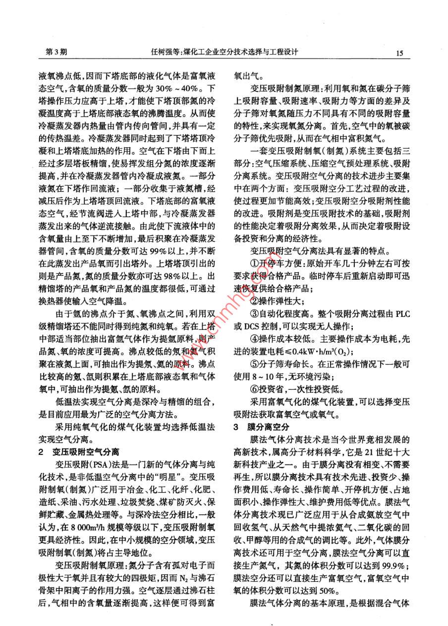氮肥技術(shù)2009年第30卷第3期煤化工企業(yè)空分技術(shù)選擇與工程設(shè)計任樹強(qiáng)曲順利(山東省化工規(guī)劃設(shè)計院250013)摘要簡要介紹了主要的空氣分離工藝技術(shù)(空氣低溫分離工藝,變壓吸附空氣分離膜分離技術(shù))的流程與原理,最新發(fā)展及其主要特點。介紹了煤化工企業(yè)空分技術(shù)的選擇及現(xiàn)代空分技術(shù)與工程設(shè)計的關(guān)系。關(guān)鍵詞煤化工空氣分離原理工程設(shè)計目前新興的煤化工企業(yè)的煤氣化裝置均采通過壓縮機(jī)將其壓縮至用戶所需壓力。在內(nèi)壓縮用純氧或富氧氣化工藝,如何獲得穩(wěn)定、可靠、廉流程中,用液體泵將來自精餾塔的液體產(chǎn)品提價的氧氣或富氧空氣就變得極為重要。壓,再送入換熱器汽化、復(fù)熱后出空分裝置。其中空氣分離的方法可分為低溫和非低溫兩種,用液體泵將產(chǎn)品提升至用戶所需壓力的流程為其中非低溫空氣分離方法包括吸附、膜分離、化全內(nèi)壓縮流程;在裝置內(nèi)將產(chǎn)品液體壓力提升至學(xué)分離法。中間壓力的流程為部分內(nèi)壓縮流程,此種流程可由于目前在大規(guī)模制取氧、氮液化產(chǎn)品,尤減少離心壓縮機(jī)的壓縮級數(shù)其是高純度產(chǎn)品方面低溫分離法具有無法取代深度冷凍法分為兩步,先行制冷,再加精餾的競爭優(yōu)勢,而且只有低溫分離法才具有可同時即可得到不同的氣體產(chǎn)品。生產(chǎn)氬等稀有氣體產(chǎn)品的能力,故低溫法在空氣1.1制冷分離的工業(yè)應(yīng)用中占據(jù)非常重要的地位。為了使空氣液化,可采用不同的深度冷凍循變壓吸附法是20世紀(jì)50年代末才開發(fā)成環(huán)裝置,主要以林德循環(huán)和克勞德循環(huán)為基礎(chǔ)。功的由于其獨有的靈活方便投資少、能耗低的前者是通過節(jié)流膨脹制冷;后者除仍有節(jié)流膨脹優(yōu)點,近年來變壓吸附空分富氧技術(shù)在中小規(guī)模外,還有一部分氣體在膨脹機(jī)中作等熵膨脹。氣富氧應(yīng)用領(lǐng)域得到越來越多地應(yīng)用。體進(jìn)行等熵膨脹時,溫度的降低要比節(jié)流膨脹膜分離空分是20紀(jì)世80年代國外興起的大,而且能回收一部分壓縮功所以比節(jié)流膨脹高新技術(shù),屬高分子材料科學(xué),它是21世紀(jì)十大經(jīng)濟(jì)。其他各種改進(jìn)的深度冷凍循環(huán),有雙壓節(jié)新科技產(chǎn)業(yè)之一。該技術(shù)雖起步晩,但發(fā)展較快。流循環(huán)、帶氨預(yù)冷節(jié)流循環(huán)、逐級重疊循環(huán)等。先進(jìn)的空分設(shè)備技術(shù)必須與優(yōu)秀的工程設(shè)在深度冷凍法的各種循環(huán)中,典型的流程是計相結(jié)合,才能使空氣分離技術(shù)的應(yīng)用更好地為先使空氣在過濾器中濾去塵埃等雜質(zhì)后進(jìn)入壓工業(yè)服務(wù)。縮機(jī),再經(jīng)分子篩凈化器除去空氣中在低溫下易1空氣低溫分離工藝凝固氣體,如水蒸汽和二氧化碳等,已凈化的空空氣低溫分離工藝是利用多塔低溫精餾的氣在第一換熱器中由產(chǎn)品氮氣和氧氣降溫。出第方法從壓縮空氣中制取高純度的氧、氮、氬產(chǎn)品。一換熱器后,空氣分成兩路:一路經(jīng)第二換熱器壓縮空氣經(jīng)過分子篩吸附器,除去所含的雜質(zhì),繼續(xù)冷卻后,再經(jīng)節(jié)流閥降壓;另一路經(jīng)膨脹機(jī)包括水、CO2碳?xì)浠衔锏取T俳?jīng)換熱器被冷卻降壓。兩路膨脹后的空氣溫度均降至103K左右至低溫,在精餾塔中可分離為氧、氮、氫等產(chǎn)品。進(jìn)入雙級精餾塔的下塔底部。裝置所需冷量由壓縮空氣或壓縮氮氣膨脹做功12精餾獲取。根據(jù)氣態(tài)產(chǎn)品的加壓方式可將空氣低溫分在深度冷凍法中,主要的分離過程是在雙級離流程分為外壓編和內(nèi)壓縮兩種類型。在外壓縮精餾塔中進(jìn)行的。該塔由上、下兩塔和塔間的冷流程中,空分裝置生產(chǎn)的氣態(tài)產(chǎn)品的溫度接近于凝蒸發(fā)器組成。進(jìn)入下塔底部的空氣在該處的溫環(huán)境溫度,因其壓力僅比大氣壓力稍高,故需要度和壓力條件下,已部分液化。由于液氮沸點比第3期任樹強(qiáng)等:煤化工企業(yè)空分技術(shù)選擇與工程設(shè)計液氧沸點低,因而下塔底部的液化氣體是富氧液氧出氣。態(tài)空氣,含氧的質(zhì)量分?jǐn)?shù)一般為30%~40%。下變壓吸附制氮原理:利用氧和氮在碳分子篩塔操作壓力應(yīng)高于上塔,才能使下塔頂部氮的冷上吸附容量、吸附速率、吸附力等方面的差異及凝溫度高于上塔底部液態(tài)氧的沸騰溫度。從而使分子篩對氧氮隨壓力不同具有不同的吸附容量冷凝蒸發(fā)器內(nèi)熱量由管內(nèi)傳向管間,并具有一定的特性,來實現(xiàn)氧氮分離。首先,空氣中的氧被碳的傳熱溫差。冷凝蒸發(fā)器同時起到了下塔塔頂冷分子篩優(yōu)先吸附,從而在氣相中富積氮氣凝和上塔塔底加熱的作用??諝庠谙滤上露弦惶鬃儔何街蒲?制氮)系統(tǒng)主要包括三經(jīng)過多層塔板精餾,使易揮發(fā)組分氮的濃度逐漸部分:空氣壓縮系統(tǒng)、壓縮空氣預(yù)處理系統(tǒng)、吸附提高,并在冷凝蒸發(fā)器管內(nèi)冷凝成液氮。一部分分離系統(tǒng)。變壓吸附空氣分離的技術(shù)進(jìn)步主要集液氮在下塔作回流液;一部分收集于液氮槽,經(jīng)中在兩個方面:變壓吸附