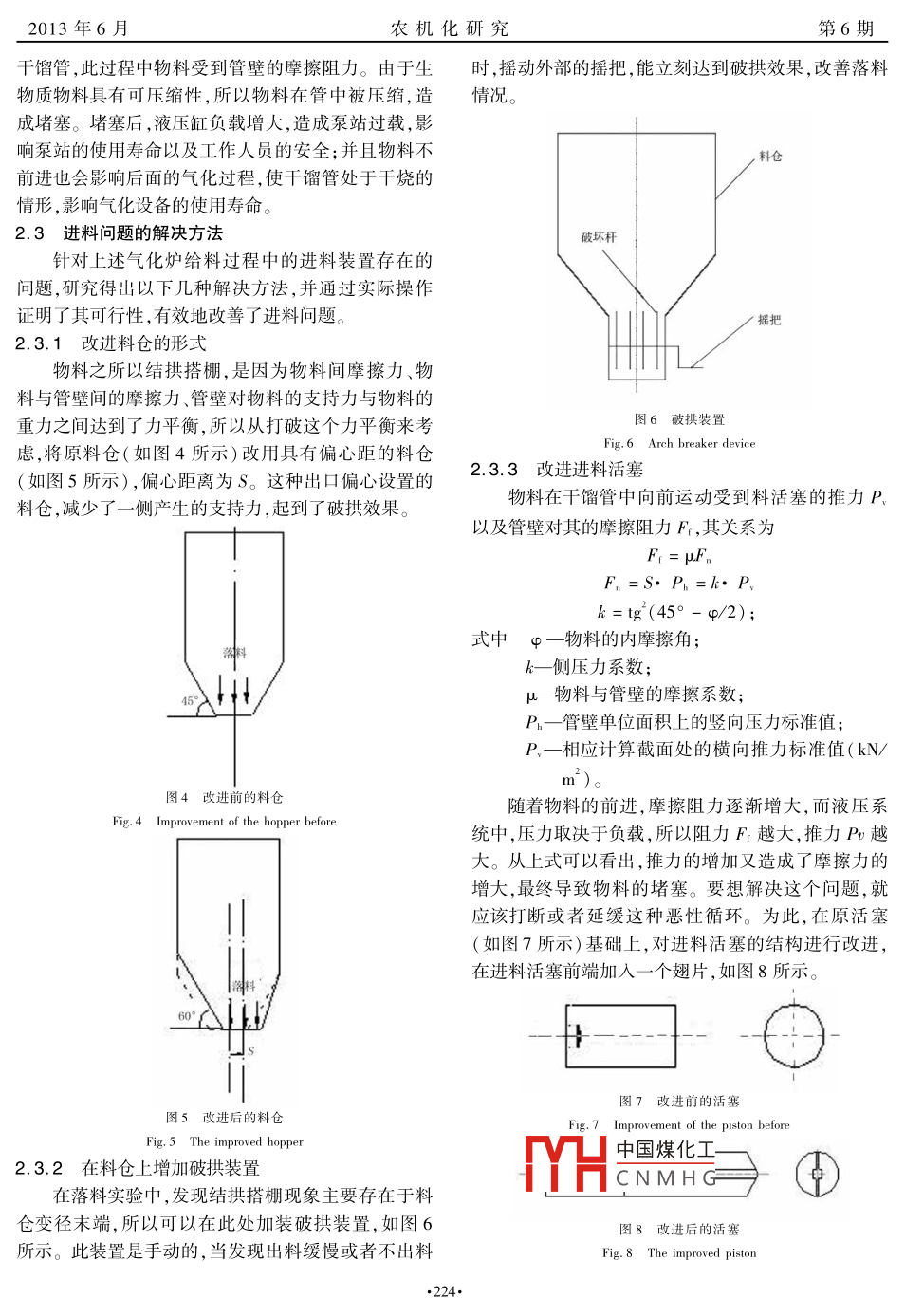 2013年6月農(nóng)機(jī)化研究第6期生物質(zhì)氣化系統(tǒng)中氣化爐設(shè)計(jì)及進(jìn)料裝置改進(jìn)郭培紅,朱莉,梅艷陽(河南理工大學(xué)機(jī)械與動(dòng)力工程學(xué)院,河南焦作454003)摘要:新型生物質(zhì)氣化系統(tǒng)—雙干餾管內(nèi)燃加熱式氣化爐氣化系統(tǒng)主要由液壓進(jìn)料系統(tǒng)、雙干餾管內(nèi)燃加熱式氣化爐、氣體收集和浄化系統(tǒng)組成,采用生物質(zhì)-垃圾混合物作為氣化的原料。雙干餾管內(nèi)燃加熱式氣化爐作為該系統(tǒng)中的主要設(shè)備,其兩根干餾管的外側(cè)被通入高溫?zé)煔獾穆菪艿览p繞,使高溫?zé)煔馀c干餾管的接觸時(shí)間延長,熱交換更充分。此外,針對系統(tǒng)中液壓進(jìn)料裝置存在的問題提出了3種改進(jìn)措施,將料倉和進(jìn)料活塞做了相應(yīng)的結(jié)構(gòu)改進(jìn),有效地解決了進(jìn)料裝置中不同部位的進(jìn)料不暢和物料堆積問題。關(guān)鍵詞:氣化爐;生物質(zhì);垃圾;進(jìn)料裝置中圖分類號(hào):TK64文獻(xiàn)標(biāo)識(shí)碼:A文章編號(hào):1003-188X(2013)06-0222-040引言統(tǒng)—雙干餾管內(nèi)燃加熱式氣化爐氣化系統(tǒng),提高了氣化爐的熱利用率,并為改善環(huán)境開辟了一條新途徑在眾多可再生能源中,生物質(zhì)能最具有發(fā)展前景。由于生物質(zhì)能的能源品值較低,直接使用越來越1氣化爐的設(shè)計(jì)不能滿足人們對高質(zhì)量現(xiàn)代生活的需求,因此研究各本文所介紹的生物質(zhì)-垃圾氣化系統(tǒng)主要由液壓種新技術(shù)將生物質(zhì)轉(zhuǎn)化成高品位的潔浄能源,是大規(guī)進(jìn)料系統(tǒng)、雙干餾管內(nèi)燃加熱式氣化爐、氣體收集和模利用生物質(zhì)能的必然趨勢。其中,生物質(zhì)氣化技術(shù)凈化系統(tǒng)組成。其中,雙干餾管內(nèi)燃加熱式氣化爐是越來越受到重視該氣化系統(tǒng)中的主要設(shè)備。生物質(zhì)氣化的能量轉(zhuǎn)換效率高,設(shè)備簡單,投資1.1雙干餾管內(nèi)燃加熱式氣化爐少,易操作,氣化產(chǎn)生的燃?xì)饪蓮V泛用于炊事、采暖和近年來,我國生物質(zhì)氣化爐的設(shè)計(jì)和使用有了顯作物烘干,還可以用作內(nèi)燃機(jī)或熱氣機(jī)等動(dòng)力裝置的著的發(fā)展。筆者歸納總結(jié)了氣化爐設(shè)計(jì)工藝的優(yōu)缺燃料,輸出電力或動(dòng)力2。目前,生物質(zhì)氣化爐的原點(diǎn)及其特性”,設(shè)計(jì)了一款新的氣化爐一雙干餾管式料大多來自秸稈類農(nóng)業(yè)廢棄物。這些原料雖然來源氣化爐。該種氣化爐的氣化過程采用空氣一水蒸汽廣泛,但是分布比較分散,能量密度低,并且存在明顯氣化的形式,主要用來克服空氣氣化產(chǎn)物熱值低(只的區(qū)域性和季節(jié)性,因此收集、運(yùn)輸及貯存成為此類有4000-6000/m3)的缺點(diǎn),減少了空氣的供給原料的重要問題3。量,并且加入了水蒸汽,使得更多的氫氣和碳?xì)浠想S著城市規(guī)模的擴(kuò)大和城市化進(jìn)程的加速,城鎮(zhèn)物生成,提髙了燃?xì)獾臒嶂?。此?空氣與生物質(zhì)的垃圾的產(chǎn)生量和堆積量逐年增加。據(jù)統(tǒng)計(jì),我國城市氧化反應(yīng)可為其他反應(yīng)提供所需要的熱量,不需要其生活垃圾的年增長率達(dá)8%~10%,未經(jīng)處理的垃圾他外部熱源。氣化爐結(jié)構(gòu)如圖1所示。將會(huì)危害人類的身體健康,占用空間,導(dǎo)致嚴(yán)重的環(huán)由圖1可知,在燃燒室內(nèi),采用專用的燃燒器燃境問題。針對以上情況,將生物質(zhì)-垃圾混合后作燒儲(chǔ)氣罐中的可燃?xì)?產(chǎn)生的高溫?zé)煔饨?jīng)過螺旋煙氣為氣化的原料,設(shè)計(jì)了新型的生物質(zhì)氣化系管道排空,尾氣用于干燥物料。高溫?zé)煔饧訜嵋欢螘r(shí)間后,進(jìn)料裝置開始運(yùn)行,將物料送進(jìn)干餾管中,并且收稿日期:2012-05-25基金項(xiàng)目:流體機(jī)械及工程省級(jí)重點(diǎn)學(xué)科項(xiàng)目(507907);熱能與動(dòng)力反復(fù)連續(xù)供料,物料被逐步向前推進(jìn),依次經(jīng)過干燥工程河南省特色專業(yè)項(xiàng)目(508057);熱能工程校級(jí)重點(diǎn)學(xué)區(qū)、干中國煤化工在干燥區(qū),物料被烘科(509927)干,使其作者簡介:郭培紅(195),女河南新鄉(xiāng)人,教授,碩士,(E-一mi)化裂解CNMHG餾區(qū),大部分物料氣氧化區(qū)時(shí),從空氣供給壁通入了guopeihong(@126.com.通訊作者:朱莉(1988-),女,鄭州人,碩士研究生,(E-mail)定量的空氣,部分物料燃燒,為焦油的催化裂解和還576549694@qg.com原區(qū)的反應(yīng)提供熱量;水煤氣反應(yīng)所需要的水通過水2013年6月農(nóng)機(jī)化研究第6期蒸汽供給壁通入,物料中的部分碳在還原區(qū)與水蒸氣者針對這些問題做了相應(yīng)的改進(jìn)。反應(yīng)生成氫氣和一氧化碳等;這些產(chǎn)生的可燃?xì)怏w和2.1進(jìn)料裝置的組成固體殘余物在氣碳分離室被分離,固體殘余物從干餾若使生物質(zhì)氣化系統(tǒng)正常運(yùn)行,必須保證其進(jìn)料管中落下,被收集處理,而氣體經(jīng)過燃?xì)饬魍ü艿?由設(shè)備能夠順利、穩(wěn)定和均勻地工作。該系統(tǒng)中的液壓雙干餾管和上下兩個(gè)燃?xì)夤艿婪獍鍑?排出并收進(jìn)料裝置包括液壓泵站、液壓缸、料活塞、機(jī)身以及與集。氣化所得的氣體經(jīng)燃?xì)饬魍ü艿琅懦龅耐瑫r(shí),一機(jī)身相