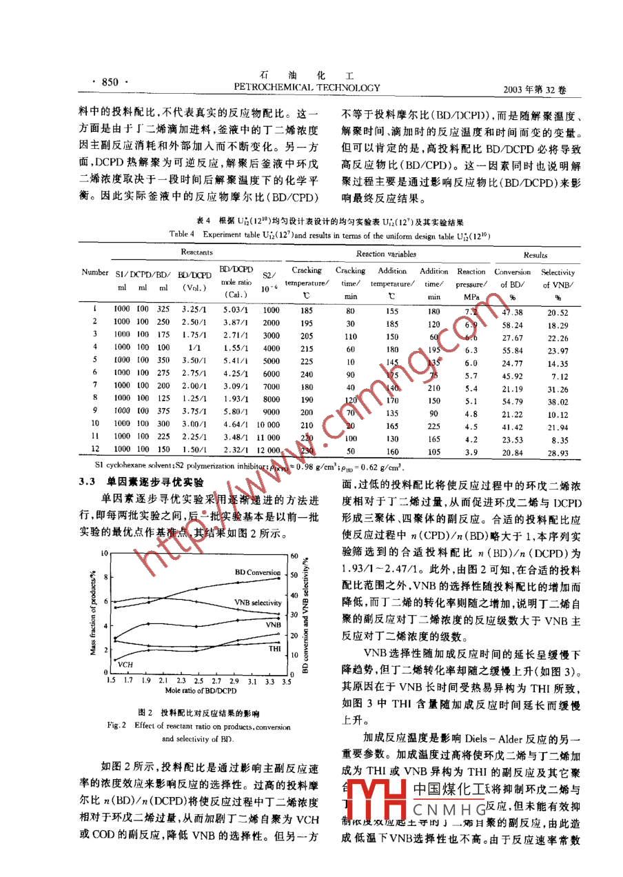 石油比T2003年第32卷第10期.PETROCHEMICAL TECHNOLOGY847乙烯基降冰片烯合成的序列實驗研究蔣正興,郭世卓,楊忠保,馬洪璽(上海石油化工股份有限公司化工研究所.上海200540)[擤要]遁過機理分析,在存在氣相死體積的2 L高壓釜中對乙婚基降冰片婚的合成工藝進行了系統(tǒng)的序列實驗研究。通過層次遞進的初步探索性實驗、均勻設計實驗和單因素考察實驗逐步優(yōu)化5合成工藝,同時對雙環(huán)戊二烯解聚和環(huán)戊二媚與丁二嫌的Diels- Aldler 反應的機理進行了深人地分析。.關鍵調]乙烯基降冰片始:雙環(huán)戊二媚;丁二婼;均勻設計;序列實驗;憶丙橡膠:乙叉隔冰片烯[文章編號} 1000- 8144(2003)10 - 0847 - 06[中園分類號] TQ 30.34[文獻標識碼] A乙叉降冰片烯(ENB)是三元乙丙橡膠(EPDM)首中 雙鍵連續(xù)與CPI)進行Diels- Alder反應生成聚選的第三單體1] ,近年來ENB的應用進-步向下游彈合物的副反應,其主要的副產物有:乙烯基環(huán)已烯性體材料及相近的具有廣闊市場前景的、多品種降冰(VCH)環(huán)辛二烯(COD)、四氫茚(THI)、環(huán)戊二烯片烯類化合物領域拓展[2] ,因此ENB是具有廣泛用途的三聚體、四聚體等-系列高聚物。的石化產品。而乙烯基降冰片烯(VNB)是合成ENB的中間體,即VNB通過催化異構得到ENB'3-9]。1)VNB可通過乙烯和降冰片二烯在Ziegler- NiDCPDCPD催化下制備,但更經濟合理的工業(yè)化合成路線為:0.f→>2)(1)雙環(huán)戊二烯(DCPD)熱解聚;(2)環(huán)戊二烯(CPD)CPD BDVNB與1,3-丁二烯(BD)進行Dies- Alder加成反應,生成VNB。20世紀60年代北京化工研究院曾進行過VNB合成及其催化異構的研究[10],吉林化學工55→VCH(3)業(yè)公司也曾進行過VNB合成的中試研究11,但未見工業(yè)化生產報道。盡管國內外有很多相關ENB合成(包括VNB合成)的專利,但有關的研究報告很少。文獻1[川首次報道了其合成VNB的小試研0.8-THI究,但其將雙環(huán)解聚與后續(xù)Diels-Alder反應混合4)的實驗方法仍有待商榷。另一方面,迄今為止有關該Diels-Alder反應的機理分析和闡述仍很少。另-類副反應是較高溫度下CPD與DCPD、本工作根據先解聚雙環(huán)戊二烯后滴加丁二烯的VNB、THI及BD與VNB聚合成三聚體等高分子凝實驗,通過設計層次遞進的序列實驗方法,對VNB膠,其反應式如式(5)。.的合成工藝進行了研究,并分析和關述了濃度效應、溫度效應對雙環(huán)解聚反應及申聯(lián)Diels- Alder主副o+r→r反應的影響。(VNB)(CPD-VNB)0+0→0(5)1VNB合成工藝的基本原理(THD)(CPD-THD)VNB工業(yè)化合成路線如式(1)、式(2)所示。采廠+o-CY用雙環(huán)戊二烯作為反應原料是因為雙環(huán)戊二烯在室(BD-VNB)溫下較穩(wěn)定,便于儲存和運輸并且加熱后可解聚為中國煤化工環(huán)戊二烯。由于環(huán)戊二烯和丁二烯都是共軛雙烯2003-06 -26。烴,且交叉互為雙烯體和親雙烯體,因此除主反應:0HCN M H G市人,博士,高級工程師.外,還伴隨有大量的親雙烯體自身聚合或降冰片烯電話021- 57943800 - 3321.電郵zhyingjzp@ sina.com.聯(lián)系人:郭世卓,021 - S7943800 - 33206。6油化工●848PETROCHEMICAL TECHNOL0GY2003年第32卷為抑制不希望的形成聚合物或高分子凝膠等副定的色譜峰校正因子為1。生成液的主要成分經色反應,需加人阻聚劑(鏈終止劑)。質聯(lián)用儀及標樣定位分析為丁二烯環(huán)已烷、環(huán)戊=2實驗部分烯、VNB、VCH、THI和DCPD。高壓釜的攪拌轉速定為400 r/min,選用的阻聚劑為2,6-二叔丁基對實驗流程見圖1。產物定性分析采用色質聯(lián)用甲酚。反應釜的氣相空間隨溶劑和反應投料的變化儀和標樣定位相結合的方法,定量分析采用而變化。HP5890氣相色譜儀分析,色譜柱為HP -5,實驗確序列實驗分為三步:(1)初步探索性實驗,確定Diels-Alder addition| 2 L Batch renctorCracking of DCPD_ : 2L Batch reactor(afer cooled t如tanget temperture)I DC'PD+cyclohexaneDCPD+CPD+cyclohexancAnalyses of productsBD tankMctering pump. . .....圖1 DCPD 熱解聚及CPD與BD的Diels.Alder加成反應的實驗流程Fig.1 The flowchar of crecking of DCPC and Diels Alder Adiom of CPD and BD.后續(xù)均勻設計實驗的因素和水平;(2)均勻設計實.表1 DCPD解紊 和環(huán)戍二娜(CPD)與r二烯(BD)的驗,確定在所選水平范圍內的最佳工藝點;(3)以均Diels - Alder反應的影響因素和水平Factors and levels of cracking of DC:PD and Diels - Alder勻設計實驗的最佳工藝點為基準,進行單因素實驗。oddition of CPD and BD初步探索性實驗的工藝條件取自參考文Reaetion stepsFactorsLevels獻[10~12]。在DCPD熱解聚步驟,采用了工業(yè)上常Thermal - cracking of Tempereture180 -240 t:用的解聚溫度較溫和的液相熱解聚法。解聚溫度為DCPDCracking time10~ 120 min180 ~ 220心。解聚反應為可逆反應,溫度升高有利Dids- Aker edtion of Temperature130-185口于提i高解聚平衡常數,但過高的溫度將加劇環(huán)戊二CPD and BDAddition time60- 225 min烯與DCPD形成三聚體及四聚體的副反應。解聚Ratio d reatents (wod.) BD/DCPD= 3.75/1- 1/1反應的另一個影響因素是解聚時間。對于解聚后環(huán)Mass fraction of0.00 -0.012戊二烯與丁二烯之間的Diels- Alder加成反應,文inhibitur獻1011闡述此反應均是在高壓釜中進行的,反應溫Reaction pressure3.9-7.2 MPa度為120~ 180 t ,反應時間由數分鐘到6h。該反應可選用的溶劑為ELO、THF、EtOH、MeOH、環(huán)已3結果和討論烷、庚烷,及Ci~C的單羧酸酯等[121,本工作選用.3.1初步 探索性實驗環(huán)已烷為溶劑。加成反應另兩個相關的因素是投料表2為本序列實驗前7次探索性實