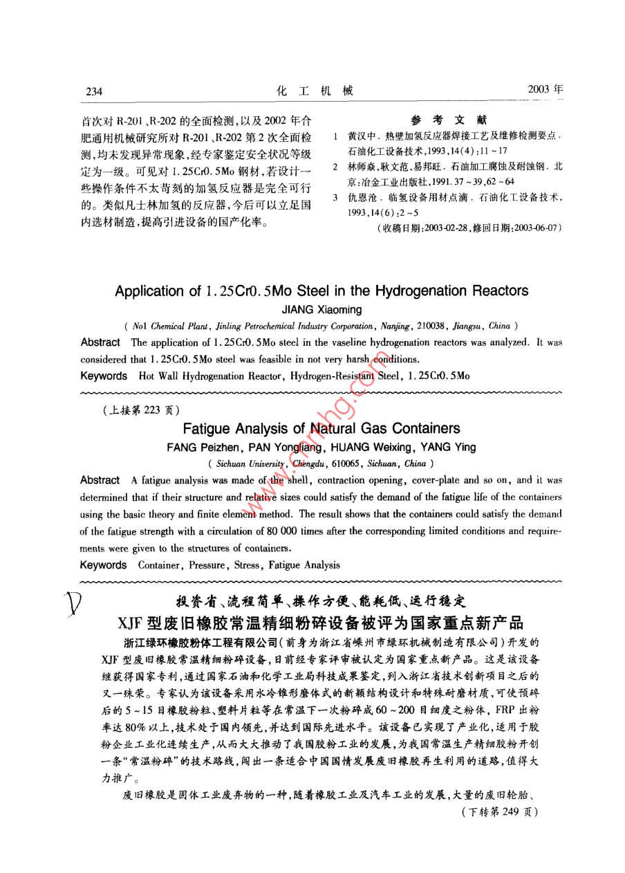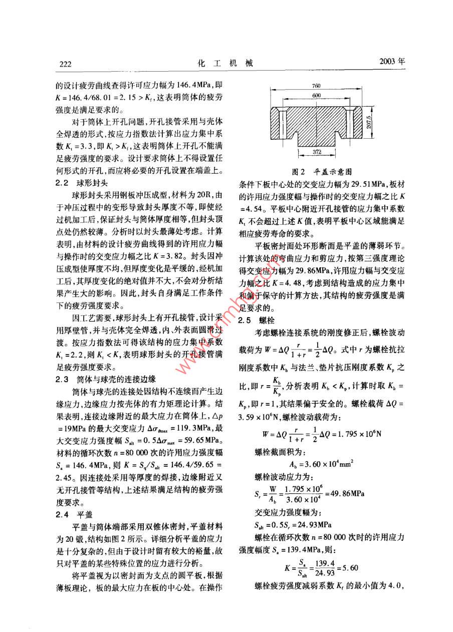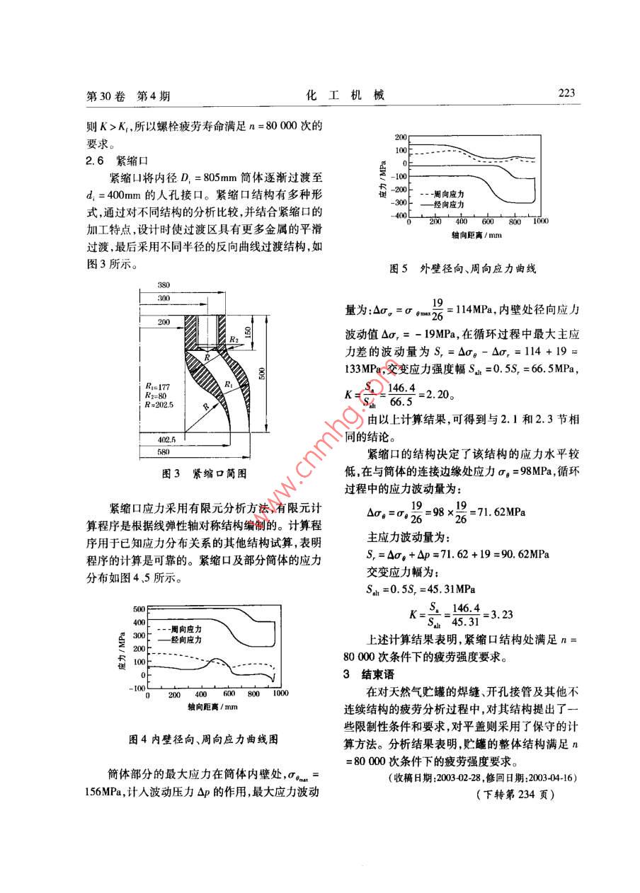 第30卷第4期化工機械221天然氣貯罐的疲勞分析方佩珍**潘永亮黃衛(wèi)星楊穎(四川大學)摘要用壓力容器的基本理論和有限單元法等對天然氣貯罐的殼體、緊縮口、平蓋等構(gòu)件進行疲勞性能分析,確定結(jié)構(gòu)及相關(guān)尺寸是否滿足該設(shè)備疲勞壽命的要求。結(jié)果表明,在對貯罐結(jié)構(gòu)給出了相應(yīng)的限制條件和要求后,該貯罐滿足循環(huán)次數(shù)n= 80000次條件下的疲勞強度要求。關(guān)鍵詞貯罐壓力應(yīng)力疲勞分析中圖分類號TQ053.2文獻標識碼A文章編號.0254-6094( 2003 )040221-0460天然氣貯罐是供貯存精脫硫天然氣的容器。00開當貯罐裝人高壓天然氣后,再通過它向車用鋼瓶充氣。貯罐工作過程承受升壓、降壓的交變載荷作用,在貯罐焊縫、接管及其他結(jié)構(gòu)不連續(xù)的區(qū)域,因產(chǎn)生塑性應(yīng)變的高應(yīng)力區(qū)容易導(dǎo)致容器的疲勞破壞。為了避免貯罐的失效,必須對貯罐各85.7部件進行詳細應(yīng)力計算,并根據(jù)應(yīng)力計算結(jié)果對貯罐進行疲勞分析。1貯罐技術(shù)參數(shù)介質(zhì)精脫硫天然氣Pu$5 <25mg/m'(標)設(shè)計壓力p 26MPa圖1貯罐的結(jié)構(gòu) 簡圖最低工作壓力pmin 7MPa2.1 簡體工作溫度50C簡體采用多層包扎式結(jié)構(gòu),內(nèi)層材料為20R,循環(huán)次數(shù)n 80 000次厚度20mm,層板材料為16MnR,板厚8mm,共72貯罐的疲勞分析貯罐的結(jié)構(gòu)如圖1所示。罐體由簡體、球形層。由于采用優(yōu)質(zhì)薄板,而承擔該設(shè)備的制造廠封頭和緊縮口組成,緊縮頭小端通過螺栓與平蓋家具有長期生產(chǎn)多層包扎式厚壁簡的成熟經(jīng)驗,連接。通過對貯罐各部件的詳細應(yīng)力分析,圖1因此能完全保證設(shè)備的質(zhì)量。在對該簡體進行應(yīng)中各部件的結(jié)構(gòu)尺寸均滿足按應(yīng)力分類法設(shè)計的力分析時,將多層包扎式殼體等效為整體殼壁。強度條件。在此基礎(chǔ)上進行疲勞分析,以確保結(jié)容器在工作過程中的壓力波動范圍Op = 19MPa。構(gòu)承受預(yù)計的循環(huán)載荷而不發(fā)生疲勞破壞的能簡體疲勞問題主要考慮筒體焊縫及簡體上的力。因為工作溫度不高,計算時忽略溫度對材料開孔接管影響,對于簡體焊縫,根據(jù)JB4732 ,其疲彈性模量的影響。在以下分析中,材料的許用應(yīng)勞強度減弱系數(shù)取Kr=2.0。計算表明,簡體在力幅按JB4732標準確定。Op影響下的交變應(yīng)力幅為68. 01MPa,而由材料四川省應(yīng)用基礎(chǔ)研究項目(01CY051406)。*方佩珍,女,1975 年6月勝,碩士生。四川省成都市,610065。222化工機械2003年的設(shè)計疲勞曲線查得許可應(yīng)力幅為146.4MPa,即76K=146. 4/68.01=2. 15 > K,這表明簡體的疲勞強度是滿足要求的。對于簡體上開孔問題,開孔接管采用與殼體全焊透的形式,按應(yīng)力指數(shù)法計算出應(yīng)力集中系數(shù)K,=3.3,即K, > K,這表明簡體上開孔不能滿_3足疲勞強度的要求。設(shè)計要求簡體上不得設(shè)置任何形式的開孔,而應(yīng)將必要的開孔設(shè)置在端蓋上。圖2平蓋示意圖2.2 球形封頭條件下板中心處的交變應(yīng)力幅為29. 51MPa,板材球形封頭采用鋼板沖壓成型,材料為20R,由的許用應(yīng)力強度幅與操作時的交變應(yīng)力幅之比K于沖壓過程中的變形導(dǎo)致封頭厚度不等,即使經(jīng)=4. 54。平板中心附近開孔接管的應(yīng)力集中系數(shù)過機加工后,保證封頭與簡體厚度相等,但封頭頂K,不會超過上述K值,表明平板中心區(qū)域能滿足點處仍然較薄。分析時以封頭最薄處考慮。計算相應(yīng)疲勞壽命的要求。表明,由材料的設(shè)計疲勞曲線得到的許用應(yīng)力幅平板密封面處環(huán)形斷面是平蓋的薄弱環(huán)節(jié)。與操作時的交變應(yīng)力幅之比K=3.82。封頭因沖計算該處的彎曲應(yīng)力和剪應(yīng)力,按第三強度理論壓成型使厚度不均,但厚度變化是平緩的,經(jīng)機加得交變應(yīng)力幅為29. 86MPa ,許用應(yīng)力幅與交變應(yīng)工后,其厚度變化的絕對值并不大,不會對分析結(jié)力幅之比K=4.48,考慮到結(jié)構(gòu)造成的應(yīng)力集中果產(chǎn)生大的影響。因此,封頭自身滿足工作條件和偏于保守的計算方法,其結(jié)構(gòu)的疲勞強度是滿下的疲勞強度要求。足要求的。因工藝需要,球形封頭上有開孔接管,設(shè)計采2.5 螺栓用厚璧管,并與殼體完全焊透,內(nèi)外表面圓滑過考慮螺栓連接系統(tǒng)的剛度修正后,螺栓波動渡。按應(yīng)力指數(shù)法可得該結(jié)構(gòu)的應(yīng)力集中系數(shù)載荷為W=QQj+r=-0Q。式中r為螺檢抗拉K,=2.2,則K < K,表明球形封頭的開孔接管滿足疲勞強度要求。剛度系數(shù)中K,與法蘭、墊片抗壓剛度系數(shù)K。之2.3簡體 與球殼的連接邊緣K。簡體與球殼的連接處因結(jié)構(gòu)不連續(xù)而產(chǎn)生邊比,即r=令,分析表明K。 K,所以螺栓疲勞壽命滿足n = 80 000次的000要求。002.6 緊縮口g緊縮口將內(nèi)徑D,=805mm筒體逐漸過渡至d = 400m的人孔接口。緊縮口結(jié)構(gòu)有多種形-200-- -周向應(yīng)力-300經(jīng)向應(yīng)力式,通過對不同結(jié)構(gòu)的分析比較,并結(jié)合緊縮口的02004006008001000加工特點,設(shè)計時使過渡區(qū)具有更多金屬的平滑軸向距離/ mm過渡,最后采用不同半徑的反向曲線過渡結(jié)構(gòu),如圖3所示。圖5外壁徑向、周向應(yīng)力 曲線80