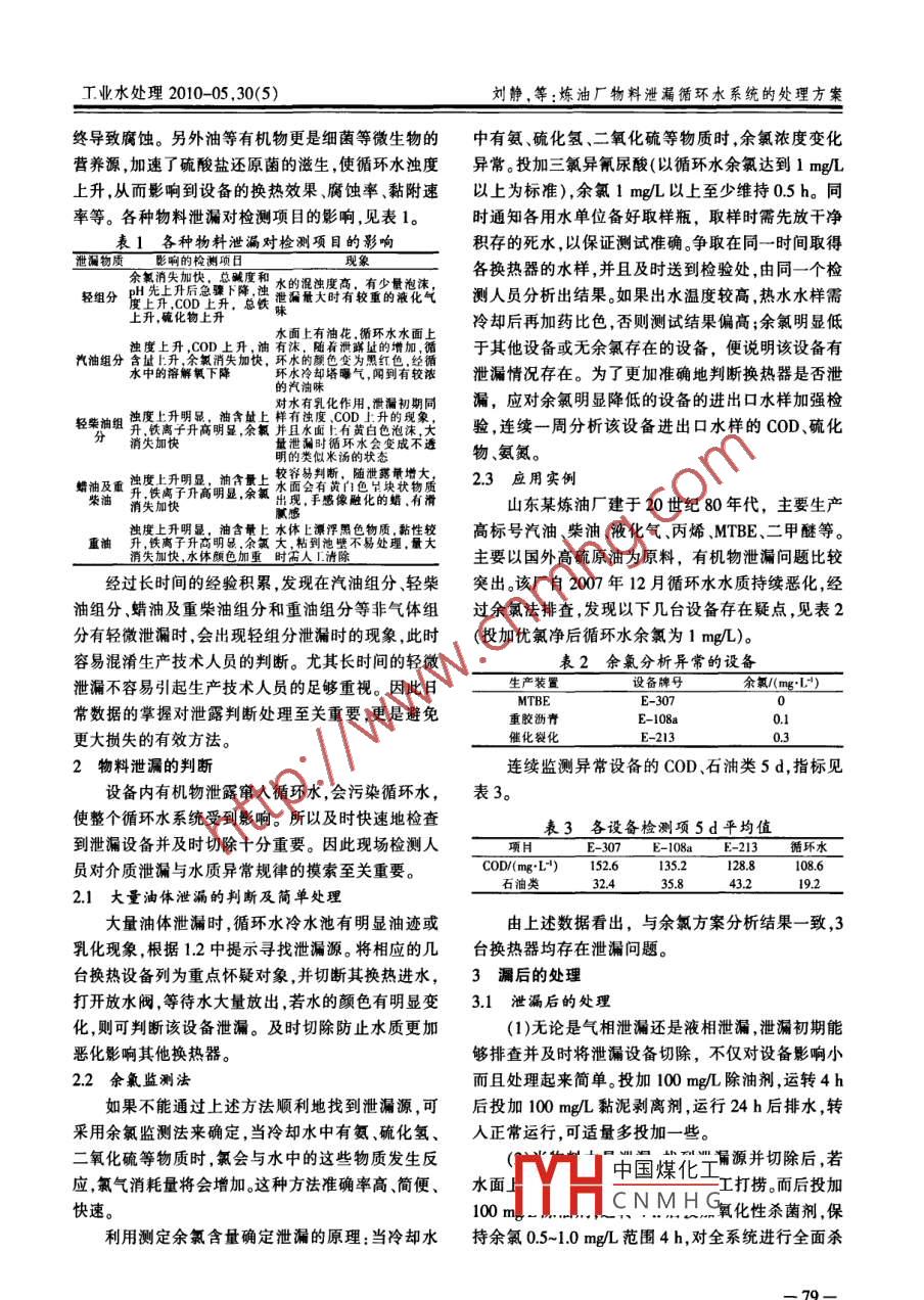 第30卷第5期工業(yè)水處理Vol.30 No.52010年5月Industrial Water TreatmentMay ,2010經(jīng)驗(yàn)交流煉油廠物料泄漏循環(huán)水系統(tǒng)的處理方案靜,王雪,王宏,王欣",胡科先3(1.中海油天津化工研究設(shè)計院,天津300131;2.中海油能源發(fā)展股份有限公司采油 技術(shù)服務(wù)分公司,天津300452;3.中國石油長慶油田第一采氣廠 ,陜西靖邊718500)[摘要]越來越多的劣質(zhì)原油成為了煉油廠的加工對象,增加了物料泄漏的頻率,所以及時快速地檢查到泄漏設(shè)備并及時切除非常重要。泄漏后及時的處理更是換熱設(shè)備正常運(yùn)行的保證。介紹了泄漏后的相關(guān)處理方案。[關(guān)鍵詞]循環(huán)水;泄漏;水處理[中團(tuán)分類號] TQ085.41 [文獻(xiàn)標(biāo)識碼]B [文章編號] 1005- -829X(2010)05 -0078-03Treatment of organic matter leakage from circulating water systemin refineriesLiu Jing', Wang Xue', Wang Hong' , Wang Xin? ,Hu Kexian'(1.CNOOC Tianjian Research & Design Instiue of Chemical Industry , Tianjin 300131 ,China;2. CNOOC Energy Technology & Services 0ifield Technology Srvice Co. , Tianjin 300452, China;3.No.1 Gas Plant PetroChina Changqing Oil Field Company, Jingbian 718500, China)Abstract: More and more inferior crude oil has become the processed object for the oil refinery , increasing the fre-quency of the organic matter leakage. It is very important to examine the leaking equipment quickly and eliminatethe leakage in time. Immediate treatment after the organic matter leakage is the guarantee of normal running for theheat exchange equipment.Key words: circulating water; leakage ; water treatment隨著經(jīng)濟(jì)的快速發(fā)展,各國對石油資源的需求換熱器泄露后,物料進(jìn)人循環(huán)水,對pH和總堿度影不斷增加,而石油資源又不可再生,因此更多的劣質(zhì)響較大,泄漏初期堿度和pH明顯上升,一段時間后原油成為了煉油廠的加工對象。隨之而來的是強(qiáng)腐急劇下降,這是由硫化細(xì)菌和硝化細(xì)菌引起的。蝕性的物質(zhì)對換熱設(shè)備的腐蝕越來越嚴(yán)重,增加了一般壓縮氣中含2 000~3 000 mg/L的硫化物,物料泄漏的頻率,換熱設(shè)備介質(zhì)泄漏就成了煉油廠液化氣中含1 500~2 500 mg/L的硫化物。水中硫酸普遍存在的一個問題,而目前缺乏適用于大多數(shù)煉菌將循環(huán)水中硫化物轉(zhuǎn)化成硫酸,pH會降到<7,超油廠的查漏儀器。對循環(huán)水系統(tǒng)來講,一臺換熱器出了一般水處理劑的應(yīng)用條件,系統(tǒng)中的有機(jī)磷和泄漏,整個系統(tǒng)將會受到影響,所以及時快速檢查到鋅鹽被破壞,最終導(dǎo)致循環(huán)水中的pH降低,總磷升泄漏設(shè)備并及時處理非常重要。高,鋅濃度低。分析幾次輕組分泄漏,發(fā)現(xiàn)一般泄漏1各類物質(zhì)泄漏的狀態(tài)周期較長,有時上述現(xiàn)象會持續(xù)3個月以上,漏點(diǎn)1.1 冷卻器殼程的氣態(tài)介質(zhì)不易查出。冷卻器殼程的氣態(tài)介質(zhì),大多數(shù)是石油加工過.2 C.以上組分泄漏程中形成的熱分解產(chǎn)物。液化氣、壓縮富氣酸性氣C4以上組分泄漏時,水面油跡明顯。有機(jī)物會體等Cr~C4輕組分中除了含烷烴外,還含有烯烴及引起系統(tǒng)循環(huán)水濁度升高,懸浮物.COD上升。換熱N2、HS .CO2.CO等成分,在形成過程中部分氣體中器內(nèi)中國煤化工身,造成油膜的導(dǎo)的HS.NH,等含量相當(dāng)高。從催化裂化車間分離器熱性|YHCNMHG首先影響的是換等分離出來的污水(酸性水)中HS、NH3-N等質(zhì)量熱效果,其次當(dāng)油膜附著管壁后,阻止了緩蝕阻垢劑濃度均達(dá)到2000~6 000 mng/L。當(dāng)酸性水汽提部分與金屬表面的接觸,使保護(hù)膜不能充分發(fā)揮作用,最- 78-.工業(yè)水處理2010- -05 ,30(5)劉靜,等:煉油廠物料泄漏循環(huán)水系統(tǒng)的處理方案終導(dǎo)致腐蝕。另外油等有機(jī)物更是細(xì)菌等微生物的中有氨硫化氫.二氧化硫等物質(zhì)時,余氯濃度變化營養(yǎng)源,加速了硫酸鹽還原菌的滋生,使循環(huán)水濁度異常。投加三氯異氰尿酸(以循環(huán)水余氯達(dá)到1 mg/L上升,從而影響到設(shè)備的換熱效果、腐蝕率、黏附速以上為標(biāo)準(zhǔn)),余氯1 mg/L以上至少維持0.5h。同率等。各種物料泄漏對檢測項(xiàng)目的影響,見表1。.時通知各用水單位備好取樣瓶,取樣時需先放干凈表1各種物料泄漏對檢測項(xiàng)目的影響積存的死水,以保證測試準(zhǔn)確。爭取在同一時間取得泄瀾物質(zhì)影響的檢測項(xiàng)目現(xiàn)象余氯消失加快總堿度和水的混濁度高,有少量泡各換熱器的水樣,并且及時送到檢驗(yàn)處,由同一個檢輕組分H先上開后急騁下降,獨(dú)他湖最大時有較重的液化i測人員分析出結(jié)果。如果出水溫度較高熱水水樣需上開,碗化物上升水面上有油花.循環(huán)水水面上冷卻后再加藥比色,否則測試結(jié)果偏高;余氯明顯低獨(dú)度上升,COD上升,油有淶隨著泄鮮址的增加,循于其他設(shè)備或無余氯存在的設(shè)備,便說明該設(shè)備有汽油組分第苗戰(zhàn)眾失加快,林水的售設(shè)為限紅經(jīng)體泄漏情況存在。為了更加準(zhǔn)確地判斷換熱器是否泄的汽油味*對水有乳化作用,滑漏初期同漏,應(yīng)對余氯明顯降低的設(shè)備的進(jìn)出口水樣加強(qiáng)檢輕柴抽組升鐵離十升高明顯,余氟井且水城上有黃白色泡珠,大驗(yàn),連續(xù)一周分析該設(shè)備進(jìn)出口水樣的COD、硫化分消失加快量泄瀾時循環(huán