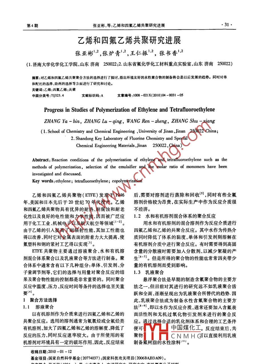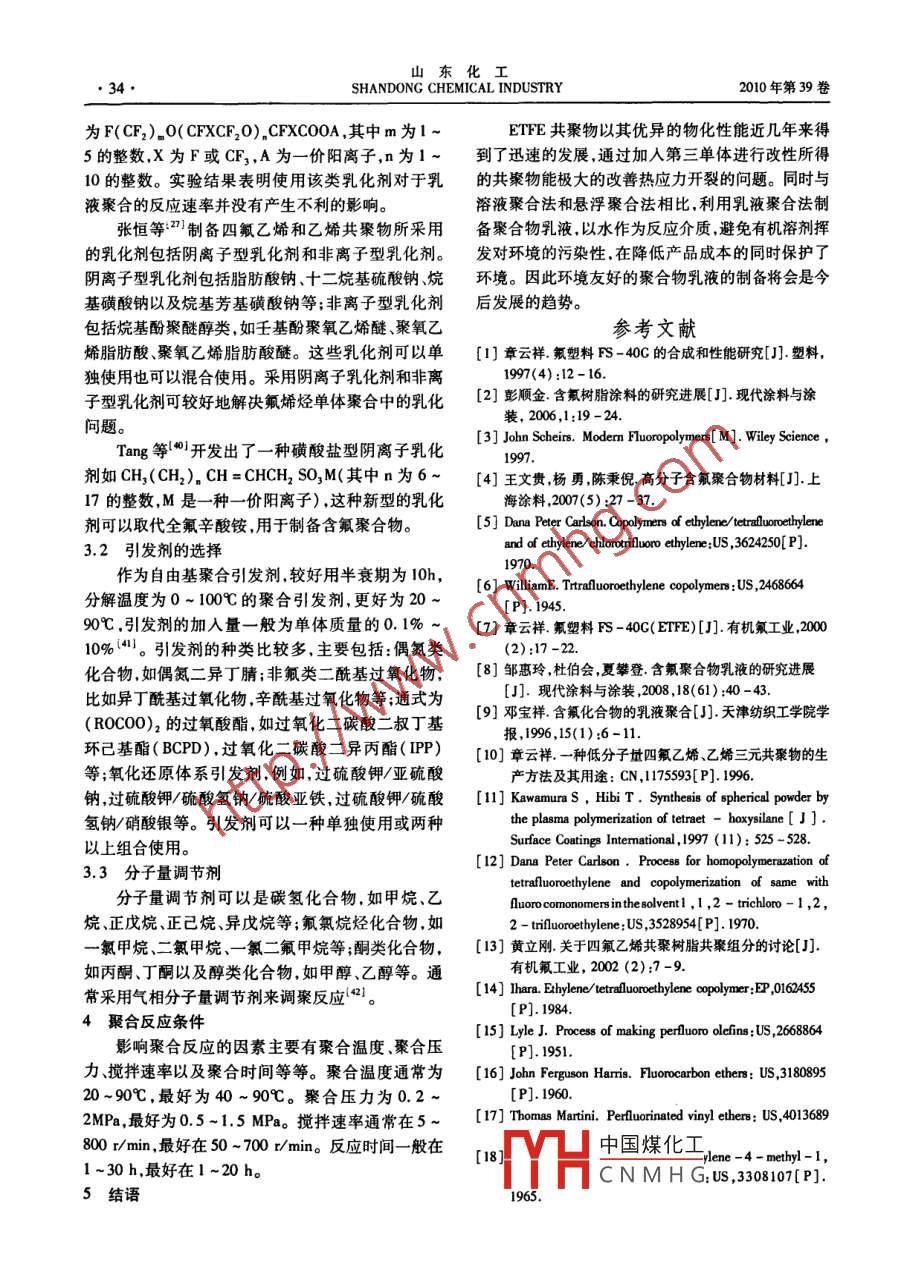 第4期張亞彬,等:乙烯和四氟乙烯共聚研究進展.31●乙烯和四氟乙烯共聚研究進展張亞彬'"2,張爐青'2 ,王仁振'2,張書香',2(1.濟南大學化學化工學院,山東濟南250022 ;2.山東省氟化學化工材料重點實驗室,山東濟南250022)摘要:對乙烯和四氟乙烯共聚聚合方法的選擇進行了探討指出環(huán)境友好的水性聚合物的制備將會是以后發(fā)展的趨勢。同時對單體配比的選擇.助劑的選擇等方面進行了研究和討論。關鍵詞:乙烯;四氟乙媚;共聚中國分類號:TQ325.4文獻標識碼:A文章編號:1008 -021X(2010)04 -0031 -05Progress in Studies of Polymerization of Ethylene and TetrafluoroethyleneZHANG Ya - bin, ZHANC Lu - qing, WANG Ren - zheng, ZHANG Shu - xiang(1. School of Chemistry and Chemical Engineering ,University of Jinan ,Jinan 250022 China;2. Shandong Key Laboratory of Fluorine Chemistry and SpecialChemical Engineering Materials ,Jinan 250022 , China)Abstract: Reaction conditions of the polymerization of ethylene and tetrafluoroethylene such as themethods of polymerization, selection of the emulsifier and the molar ratio of monomers have beeninvestigated and discussed.Key words: ethylene ; tetraluoroethylene; copolymerization乙烯和四氟乙烯共聚物( ETFE)發(fā)現(xiàn)于1946后,需要對溶劑進行蒸除和回收[5),同時有些全氟年,美國和日本先后于20世紀70年代投產(chǎn)。乙烯溶劑價格較為昂貴,在實際生產(chǎn)中作為反應介質很和四氟乙烯共聚物具有優(yōu)異的耐熱、耐腐蝕和耐老不經(jīng)濟。化性以及良好的電性能和力學性能,因而被廣泛應1.2 水和有機溶劑混合體系的聚合反應用于化工工業(yè)、機械電子以及航天航空等領域|-2)。用水和有機溶劑的混合溶劑作為反應介質進行由于乙烯的引入提高了耐輻射性能,其加工性能也四氟乙烯和乙烯的共聚合反應。其中水作為傳熱介得以改善,同時它對金屬表面的附著力大大提高,使質同時降低了體系的黏度,單體和引發(fā)劑則溶解在氟塑料和鋼的緊襯工藝得以實現(xiàn)"。有機溶劑介質中進行聚合反應。有時需要得到高固ETFE共聚物主要通過溶液聚合、水和有機溶含量的分散液時需要加入分散劑,以減少絮凝的產(chǎn)劑混合體系聚合以及乳液聚合等方法進行制備。聚生]。但是所得的聚合物的性能也常常因夾帶少合體系中通常含有以下幾種組分:單體、引發(fā)劑、分量的有機溶劑而受到影響。子量調(diào)節(jié)劑等,它們的選擇與用量對聚合反應的結1.3 乳液聚合果及聚合物性能的控制都是非常重要的。同時聚合懸浮聚合法是早期的制造含氟聚合物的主要方反應中溫度、壓力、反應時間等條件的選擇也至關重法之一,但目前對其進行的研究遠不如乳液聚合活躍和全面.逐漸呈現(xiàn)出為乳液聚合所替代的趨勢.因1聚合方法選擇此,乳液聚合法成為制備水性含氟聚合物的主要方1.1溶液聚合法[8-9] ,即以水作為反應介質,通常還要加入含氟表以有機溶劑作為介質來進行四氟乙烯和乙烯的面活性劑和無機過氧化物引發(fā)劑來進行的聚合反共聚合反應。選用的溶劑通常為氟氯烴或全氟烴類應。通過選擇合適的乳化劑體系和合理的工藝條件有機溶劑,加大了四氟乙烯和乙烯的溶解度,降低了便可中國煤化工。反應結束后,共.反應的壓力,同時反應速率較大。由于所使用的有聚物|YHCNMHGJ以直接利用乳液機溶劑對環(huán)境具有一定的破壞作用,因此,反應結束制備氟樹脂的水性涂料"。收稿日期:2010-01-12基金項目:國家自然科學基金( 20774037) ;國家科技攻關項目(2006BAJ03A09)。萬雋數(shù)搶:張亞彬(1984- -) .男,山東青島人,在讀研究生,研究方向:有機氟高分子材料。山東化工●32●SHANDONC CHEMICAL INDUSTRY2010年第39卷2聚合單體的選擇環(huán))舊]乙烯和四氟乙烯的共聚物具有很大的交替性,同時1:1的交替共聚物具有最好的物理化學和電性SF2能,因此如果單體組分中四氟乙烯的含量太多,那么所得的ETFE熔融成型性,機械強度將降低;如果單體組分中四氟乙烯的含量較少.那么得到的ETFE的耐熱性、耐化學性、阻燃性等性能將明顯降低。因CF2-CF- -CF2此為了得到性能優(yōu)異的ETFE樹脂,四氟乙烯和乙(6)CF2 =CF-0- (CF2)。- COX,,X,代表烯的物質的量比為40:60到60:40之間,最好是45:0H、0R,或NR,R,其中R,為含有1 ~3個碳原子55到55 :45之間12-3)。的烷基,R2、R,代表H或R,n:1~10的整數(shù)。X,但對于只含有四氟乙烯和乙烯兩種組分的最好為OH或0CH3。ETFE共聚物也有不足之處,例如較差的耐開裂性(7)有下述結構的乙烯基醚類[9):能,尤其是在高溫下,較小的應力便能使ETFE產(chǎn)生開裂現(xiàn)象。為了解決這些不足之處,在合成ETFEcr,=(F- -0- +ur,-(F-0--C:-(z-X時,通常加人少量的第三單體與四氟乙烯和乙烯進CF3’一n行共聚,這樣得到的ETFE共聚物既保持了原有的其中Xz :COOR, ,CO0H或CN,R,為具有1 ~3優(yōu)異性能又能解決熱應力開裂問題。因而,目前大個碳原子的烷基,n為1 ,2,3和4。Xz最好為CO0H部分商業(yè)生產(chǎn)的ETFE共聚物都含有有少量的第三或COOCH,。.單體組分的三元共聚物。通常第三單體加人量為(8)全氟烷基乙烯類'∞] :CH2 =CH -REg,Rf,為0.1%~10%(以四氟乙烯和乙烯的總摩爾數(shù)為基具有2~10個碳原子,最好是2 ~6個碳原子的全氟準) ,最好為0.5% ~5%14。參與反應的第三單體烷基自由基。其中部分的含氟烯烴的制備是通過添的種類也比較多,大部分為乙烯基類化合物。主要加乙烯到全氟烷基碘化物中,然后與堿金屬氫氧化包括以下幾類。(1)全氟