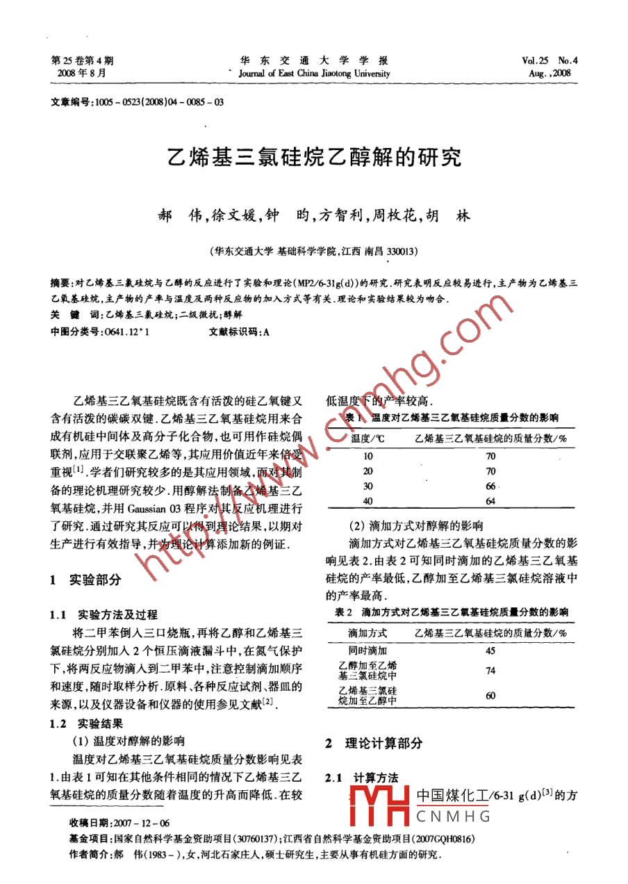 第25卷第4期華東交通大學(xué)學(xué)報(bào)Vol.25 No.42008 年8月.Jourmal of East China Jiaotong UniversityAug. ,2008文章編號(hào): 1005 - 0523(2008)04 - 0085 -03乙烯基三氯硅烷乙醇解的研究郝偉,徐文媛,鐘昀,方智利,周枚花,胡林(華東交通大學(xué)基礎(chǔ)科學(xué)學(xué)院,江西南昌3003)摘要:對乙烯基三氯硅烷與乙醇的反應(yīng)進(jìn)行了實(shí)驗(yàn)和理論(MP2/6-31g(d))的研究研究表明反應(yīng)較易進(jìn)行,主產(chǎn)物為乙烯基三乙氧基硅烷,主產(chǎn)物的產(chǎn)率與溫度及兩種反應(yīng)物的加入方式等有關(guān)理論和實(shí)驗(yàn)結(jié)果較為吻合.關(guān)鍵詞:乙烯基三氯硅烷;二級徵擾;醇解中圖分類號(hào):0641.12*1文獻(xiàn)標(biāo)識(shí)碼:A乙烯基三乙氧基硅烷既含有活潑的硅乙氧鍵又低溫度下的產(chǎn)率較高.含有活潑的碳碳雙鍵.乙烯基三乙氧基硅烷用來合贊1 溫度對乙烯基三乙氧基硅烷質(zhì)分?jǐn)?shù)的影響成有機(jī)硅中間體及高分子化合物,也可用作硅烷偶溫度/C乙烯基三乙氧基硅烷的質(zhì)量分?jǐn)?shù)/%聯(lián)劑,應(yīng)用于交聯(lián)聚乙烯等,其應(yīng)用價(jià)值近年來倍受170重視[" .學(xué)者們研究較多的是其應(yīng)用領(lǐng)域,而對其制2(7(備的理論機(jī)理研究較少.用醇解法制備乙烯基三乙3(464氧基硅烷,并用Gaussian 03程序?qū)ζ浞磻?yīng)機(jī)理進(jìn)行了研究.通過研究其反應(yīng)可以得到理論結(jié)果,以期對(2)滴加方式對醇解的影響生產(chǎn)進(jìn)行有效指導(dǎo),并為理論計(jì)算添加新的例證.滴加方式對乙烯基三乙氧基硅烷質(zhì)量分?jǐn)?shù)的影響見表2.由表2可知同時(shí)滴加的乙烯基三乙氧基1實(shí)驗(yàn)部分硅烷的產(chǎn)率最低,乙醇加至乙烯基三氯硅烷溶液中的產(chǎn)率最高.1.1實(shí)驗(yàn)方法及過程表2滴加方式對乙烯基三乙氧基硅烷質(zhì)分?jǐn)?shù)的影響將二甲苯倒入三口燒瓶,再將乙醇和乙烯基三滴加方式氯硅烷分別加入2個(gè)恒壓滴液漏斗中,在氮?dú)獗Wo(hù)同時(shí)滴加下,將兩反應(yīng)物滴人到二甲苯中,注意控制滴加順序乙醇加至乙烯和速度,隨時(shí)取樣分析.原料、各種反應(yīng)試劑、器皿的基三氯硅燒中60來源,以及儀器設(shè)備和儀器的使用參見文獻(xiàn)[2].1.2實(shí)驗(yàn)結(jié)果(1)溫度對醇解的影響2理論計(jì)算部分溫度對乙烯基三乙氧基硅烷質(zhì)量分?jǐn)?shù)影響見表1.由表1可知在其他條件相同的情況下乙烯基三乙2.1 計(jì)算方法氧基硅烷的質(zhì)量分?jǐn)?shù)隨著溫度的升高而降低.在較中國煤化工/6-31 g(d)[)的方收稿日期:2007- 12-06MYHCNMHG基金項(xiàng)目:國家自然科學(xué)基金資助項(xiàng)目(30760137);江西省自然科學(xué)基金資助項(xiàng)目(2007GQH0816)作者簡介:郝偉(1983- ),女,河北石家莊人,碩士研究生,主要從事有機(jī)硅方面的研究.86華東交通大學(xué)學(xué)報(bào)2008年法對主反應(yīng)的反應(yīng)物(乙醇-R,乙烯基三氯硅烷一表明,TS1的力常數(shù)矩正中有且只有一個(gè)負(fù)本征值,R1),中間產(chǎn)物(乙烯基- -乙氧基硅烷- PI,乙烯基二且相應(yīng)的虛振動(dòng)模式失量展示了過渡態(tài)TS1走向其乙氧基硅烷-P2)和主產(chǎn)物(乙烯基三乙氧基硅烷一相應(yīng)的反應(yīng)物(R1和R)和產(chǎn)物(P1和HCl)的趨勢,P3)及鹽酸的幾何構(gòu)型用能量梯度法全優(yōu)化計(jì)算.過渡表明過渡態(tài)TS1是可信的.所得TS2、TS3數(shù)據(jù)也是態(tài)TS1 .TS2.TS3的幾何構(gòu)型先用Eigenvector Following41按照如此步驟進(jìn)行計(jì)算,也是可信的. TS1、TS2、TS3法全優(yōu)化計(jì)算,再用振動(dòng)分析驗(yàn)證.全部計(jì)算工作是在的結(jié)構(gòu)(由Cham3D'5]軟件轉(zhuǎn)化而來)如圖2所示.華東交通大學(xué)計(jì)算室完成的.2.2計(jì)算結(jié)果主反應(yīng)的具體過程及關(guān)鍵原子的編號(hào)如圖1所示.由圖1可知具體反應(yīng)過程.為了給出過渡態(tài)TSI的初始構(gòu)型,先采用MOPAC7.0程序中的Saddle 法進(jìn)行探索,再用G03程序中的AM1方法計(jì)算,然后用MP2/6-31 g(d)計(jì)算能量.發(fā)現(xiàn)當(dāng)鍵長02- -H、H- -C4、CL-Si3 和och,CH;02- -Sis 分別為0.098 4、0.217 5.0.3107、0.194 0 nm時(shí)體系的梯度模平方變?yōu)闃O小值,且相應(yīng)能量變?yōu)閳D1 反應(yīng)具體過程及關(guān)鍵原子的編號(hào)極大.認(rèn)定此即為TSI的初始結(jié)構(gòu).相應(yīng)的振動(dòng)分析HTS1TS2TS3圖2過渡態(tài)TS1.TS2.TS3的原子結(jié)構(gòu)示意圉MP2方法計(jì)算所得反應(yīng)熱分別為:改變原料配比(增加乙醇和鹽酸的質(zhì)量分?jǐn)?shù)),則增OH =[Er+.HC)- E(R+Ru)]= - 29.262 kJ.mol-1加了乙醇與鹽酸的接觸機(jī)會(huì),副反應(yīng)進(jìn)行的可能性O(shè)H2= [E(p2+HC)- E(R+m)]= - 14.767 kJ.mol-則會(huì)相應(yīng)增加.若降低乙醇與鹽酸的質(zhì)量分?jǐn)?shù),根據(jù)OHg= [Ep+HC)- E(R+2)]= -7.007 kJ.mol-'.平衡移動(dòng)原理,則反應(yīng)平衡應(yīng)向著生成反應(yīng)物的方計(jì)算所得反應(yīng)三步均為放熱的.因?yàn)闇囟壬呦蛞苿?dòng),便可抑制副反應(yīng)的發(fā)生.采用滴加方式1,不利于反應(yīng)向放熱方向進(jìn)行,即不利于平衡向生成乙醇和乙烯基三氯硅烷同時(shí)滴加,這時(shí)體系中不僅目的產(chǎn)物的方向移動(dòng).理論計(jì)算的結(jié)果與實(shí)驗(yàn)所得大量存在乙醇,而且大量存在兩者反應(yīng)生成
