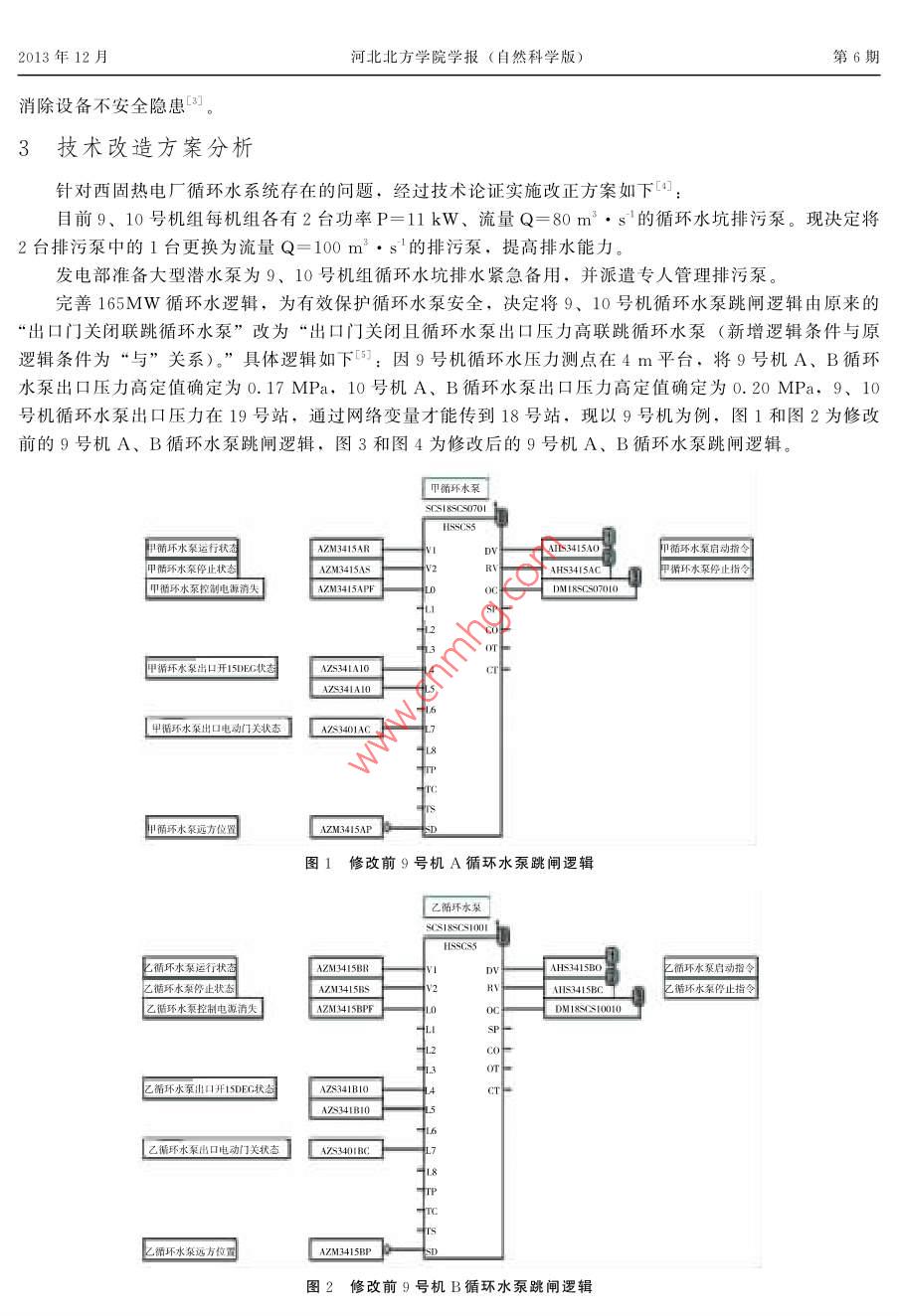 第29卷第6期何計(jì)方院(自然科學(xué)版)Vol 29 No 62013年12月Journal of Hebei North University (Natural Science Edition)Dec.2013165MW機(jī)組循環(huán)水系統(tǒng)邏輯優(yōu)化曹燕燕1,曹會會(1.河北北方學(xué)院信息科學(xué)與工程學(xué)院,河北張家口075000;2.蘭州西固熱電有限公司,甘肅蘭州730060)摘要:蘭州西固熱電廠165MW機(jī)組循環(huán)水系統(tǒng)為母管制運(yùn)行方式。其水泵出口門為低位置電動門,循環(huán)水坑水位高時(shí)有水淹危險(xiǎn),存在安全隱患。針對此問題對循環(huán)水系統(tǒng)進(jìn)行整改,并將循環(huán)水系統(tǒng)邏輯進(jìn)行優(yōu)化關(guān)鍵詞:循環(huán)水;系統(tǒng);邏輯;優(yōu)化中圖分類號:TK323文獻(xiàn)標(biāo)識碼:ADOI:10.3969/j.issn.1673-1492.2013.06.006Logic Optimization of Circulating Water System in 165 MW UnitCAO Yan-yan, CAO Hui-hui(1. School of Information Science &. Engineering, Hebei North University, Zhangjiakou, Hebei 075000, China2. Lanzhou Xigu Thermal Power Co, Ltd, Lanzhou, Gansu 730060. ChinaAbstract: The operation mode of circulating water system in 165 MW unit Lanzhou Xigu ThermalPower Plant is main-pipe scheme. The electrically operated outlet valve is in a low position, and when circulating water level rises, there is a flooding risk. To solve this problem, corrective measures andoptimization for circulating water system were proposedKey words: circulating water; system; logic; optimization1概述大唐西固熱電有限責(zé)任公司165MW機(jī)組1998年建成投產(chǎn),其鍋爐引進(jìn)俄羅斯巴爾瑙爾動力機(jī)械股份公司生產(chǎn)的E-420-13.7-560KT型超高壓鍋爐。汽輪機(jī)為俄羅斯烏拉爾汽輪機(jī)廠生產(chǎn)的ⅡT-140/165130/15-2型雙缸單軸沖動式汽輪機(jī)。循環(huán)水系統(tǒng)配有兩座雙曲線自然冷卻塔及4臺循環(huán)水泵,其間冷卻塔出水口至循環(huán)水泵人口用兩條自流暗溝連接,循環(huán)水泵出口經(jīng)凝結(jié)器后的排水用壓力水管連接至冷水塔上水豎井,形成循環(huán)水的閉式循環(huán)。循環(huán)水泵運(yùn)行臺數(shù)取決于機(jī)組凝汽負(fù)荷的大小:夏季各機(jī)循環(huán)水溫升控制在8~12℃,小于8℃應(yīng)考慮停1臺循環(huán)水泵,大于12℃應(yīng)考慮啟動1臺循環(huán)水泵;冬季循環(huán)水溫升控制在12~20℃,當(dāng)小于12℃應(yīng)考慮停1臺循環(huán)水泵,當(dāng)超過20℃應(yīng)考慮啟動1臺循環(huán)水泵。在循環(huán)水泵調(diào)整運(yùn)行臺數(shù)時(shí)還應(yīng)考慮機(jī)組真空、循環(huán)水母管壓力、工業(yè)水運(yùn)行狀況、冷水塔運(yùn)行狀況及機(jī)組的負(fù)荷等綜合因素分析2,使得循環(huán)水系統(tǒng)的正常運(yùn)行在機(jī)組安全運(yùn)行時(shí)顯得十分重要。2改造的必要性012年11月30日,運(yùn)行中的10號機(jī)組循環(huán)水膨脹節(jié)爆開,大量循環(huán)水流至循環(huán)水坑,造成循環(huán)水坑水位高,循環(huán)水泵出口電動門被水淹,循環(huán)水泵出口門關(guān)閉信號誤發(fā),導(dǎo)致165MW機(jī)組9、10號機(jī)循環(huán)水泵相繼跳閘,造成9、10號機(jī)組被迫停運(yùn)。循環(huán)水系統(tǒng)設(shè)備存在安全隱患。分析西固熱電廠循環(huán)水系統(tǒng)發(fā)生的不安全事件,吸取事故經(jīng)驗(yàn)教訓(xùn),經(jīng)廠165MW循環(huán)水系統(tǒng)專題會會議一致表明,為了保證機(jī)組的安全、經(jīng)濟(jì)運(yùn)行,必須采取相應(yīng)措施,并優(yōu)化165MW系統(tǒng)循環(huán)水邏輯來稿日期:2013-10-10基金項(xiàng)目:張家口市科學(xué)技術(shù)和地震局指導(dǎo)項(xiàng)目(1221018B);河北北方學(xué)院自然科學(xué)研究青年基金計(jì)劃項(xiàng)目(Q2013003)2013年12月河北北方學(xué)院學(xué)報(bào)(自然科學(xué)版)第6期消除設(shè)備不安全隱患③。3技術(shù)改造方案分析針對西固熱電廠循環(huán)水系統(tǒng)存在的問題,經(jīng)過技術(shù)論證實(shí)施改正方案如下4目前9、10號機(jī)組每機(jī)組各有2臺功率P=11kW、流量Q=80m3·s的循環(huán)水坑排污泵?,F(xiàn)決定將2臺排污泵中的1臺更換為流量Q=100m3·s的排污泵,提高排水能力。發(fā)電部準(zhǔn)備大型潛水泵為9、10號機(jī)組循環(huán)水坑排水緊急備用,并派遣專人管理排污泵完善165MW循環(huán)水邏輯,為有效保護(hù)循環(huán)水泵安全,決定將9、10號機(jī)循環(huán)水泵跳閘邏輯由原來的出口門關(guān)閉聯(lián)跳循環(huán)水泵”改為“出口門關(guān)閉且循環(huán)水泵出口壓力高聯(lián)跳循環(huán)水泵(新增邏輯條件與原邏輯條件為“與”關(guān)系)”具體邏輯如下:因9號機(jī)循環(huán)水壓力測點(diǎn)在4m平臺,將9號機(jī)A、B循環(huán)水泵出口壓力高定值確定為0.17MPa,10號機(jī)A、B循環(huán)水泵出口壓力高定值確定為0.20MPa,9、10號機(jī)循環(huán)水泵出口壓力在19號站,通過網(wǎng)絡(luò)變量才能傳到18號站,現(xiàn)以9號機(jī)為例,圖1和圖2為修改前的⑨號機(jī)A、B循環(huán)水泵跳閘邏輯,圖3和圖4為修改后的9號機(jī)A、B循環(huán)水泵跳閘邏輯循壞水裂SI&SCSJ70衛(wèi)斫環(huán)水泵運(yùn)行狀態(tài)A/M3415A卩環(huán)水泵啟動指令衛(wèi)環(huán)水泵停止指甲循環(huán)水泵控制電源清失A/M3415APF甲循環(huán)水出口開5E狀A(yù)1/S341A10循環(huán)水泵出口電動門關(guān)狀循環(huán)水圖1修改前9號機(jī)A循環(huán)水泵跳閘邏輯乙循環(huán)水泵IS
