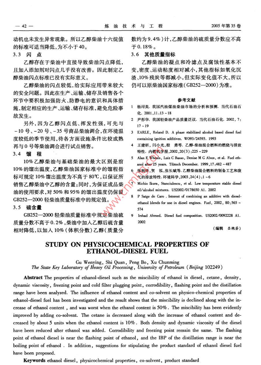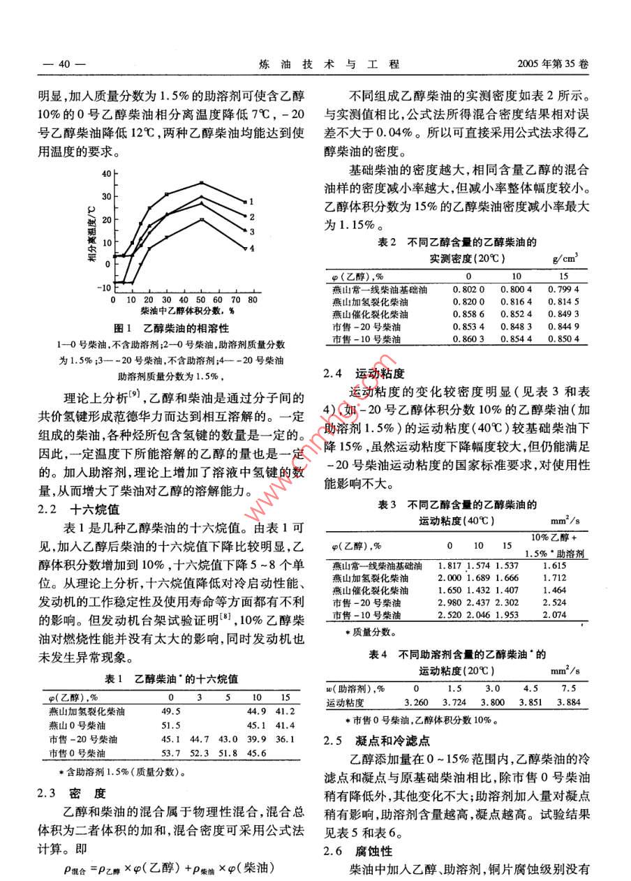 煉油技術(shù)與工程2005年5月PETROLEUM REFINERY ENGINEERING第35卷第5期乙醇柴油的物化性質(zhì)研究古文英史權(quán)彭勃徐春明石油大學(xué)(北京)重質(zhì)油國(guó)家重點(diǎn)實(shí)驗(yàn)室(北京市102249)摘要:分析了乙醇柴油的相溶性、十六烷值、密度、運(yùn)動(dòng)粘度、凝點(diǎn)和冷濾點(diǎn)、腐蝕性、閃點(diǎn)和餾程等性質(zhì)??疾炝艘掖己考爸軇?duì)乙醇柴油物化性質(zhì)的影響。結(jié)果表明,乙醇體積分?jǐn)?shù)升高相溶性變差,在50%左右相溶性最差;加人助溶劑能明顯改善乙醇和柴油的相溶性。十六烷值隨乙醇體積分?jǐn)?shù)升高而減小,乙醇體積分?jǐn)?shù)為10%時(shí)十六烷值減小約5個(gè)單位;加入乙醇后,柴油的密度、運(yùn)動(dòng)粘度都有不同程度的減小;腐蝕性和凝點(diǎn)變化不大。乙醇柴油的閃點(diǎn)接近乙醇的閃點(diǎn),初餾點(diǎn)接近乙醇的沸點(diǎn)。最后對(duì)乙醇柴油產(chǎn)品標(biāo)準(zhǔn)的制定提出了建議。關(guān)鍵詞:乙醇柴油物化性質(zhì)助溶劑產(chǎn)品標(biāo)準(zhǔn)我國(guó)是柴油消費(fèi)大國(guó),目前煉油行業(yè)的生產(chǎn)公司提供。柴汽比低于消費(fèi)柴汽比,同時(shí)我國(guó)近年消費(fèi)柴汽助溶劑:長(zhǎng)鏈烷基醇,吉林大學(xué)研制并提供比也逐年增大,預(yù)計(jì)到2010年我國(guó)消費(fèi)柴汽比將1.2試驗(yàn)方法達(dá)到2.11。另外,國(guó)內(nèi)柴油的硫含量及芳烴含量相溶性試驗(yàn):測(cè)定不同組成柴油體系的相分比較高2,顆粒物、硫化物及其他有害氣體的排放離溫度。測(cè)定方法如下:將冷浴溫度設(shè)定在預(yù)測(cè)污染較嚴(yán)重,柴油質(zhì)量亟待提高。相分離溫度,待溫度穩(wěn)定后將配制好的一定組成燃料乙醇作為可再生的生物能清潔燃料成為的油樣放入浴中開(kāi)始降溫。油樣溫度高于預(yù)測(cè)相最具有發(fā)展前景的汽車代用燃料之一,研究結(jié)果分離溫度10℃時(shí)開(kāi)始取出觀察現(xiàn)象,每1℃觀察表明3“,含乙醇20%的乙醇柴油CO,NO,及碳次至高于預(yù)測(cè)相分離溫度5℃。若未有任何相煙排放分別降低了62%,24%和60%。乙醇柴油分離現(xiàn)象出現(xiàn),則以0.5℃/mn的速度降溫,每的研究在一些國(guó)家受到廣泛的重視,巴西已經(jīng)將0.5℃觀察一次直至出現(xiàn)相分離。出現(xiàn)以下任何乙醇柴油作為城市車用油推廣使用。國(guó)內(nèi)僅對(duì)一種現(xiàn)象即被視為到達(dá)冷卻終點(diǎn)即相分離溫度:乙醇柴油的燃燒及排放性能進(jìn)行了初步的探①有明顯固體物出現(xiàn);②油樣出現(xiàn)霧狀渾濁;③油討6),對(duì)物化性質(zhì)方面的研究幾乎為空白。因樣中有明顯小液珠出現(xiàn)。此,國(guó)家經(jīng)貿(mào)委“燃料乙醇”考察團(tuán)在赴美考察報(bào)告中指出針對(duì)我國(guó)現(xiàn)階段柴油市場(chǎng)消費(fèi)及使用情2試驗(yàn)結(jié)果與討論況應(yīng)該開(kāi)展乙醇柴油的研究工作。同時(shí),由于乙2.1乙醇柴油體系的相溶性醇和柴油的十六烷值、粘度、閃點(diǎn)和凝點(diǎn)等性質(zhì)差圖1是兩種不同成品柴油與不同乙醇含量的別較大需要加人添加劑改善乙醇柴油混合體系乙醇柴油的相分離溫度。加助溶劑與不加助溶劑的物性9,因此對(duì)乙醇柴油物性的研究可為其相分離溫度隨乙醇含量的變化規(guī)律相同,在乙醇推廣應(yīng)用、制定合理的產(chǎn)品標(biāo)準(zhǔn)提供重要依據(jù)。體積分?jǐn)?shù)為50%左右均達(dá)到最大值;乙醇體積分?jǐn)?shù)小于10%時(shí),分離溫度受乙醇含量的影響較小。1試驗(yàn)部分同時(shí),加人助溶劑對(duì)改善乙醇柴油的相溶性比較1.1試驗(yàn)原料油樣:燕山石化分公司(簡(jiǎn)稱燕山)生產(chǎn)的加收稿日期:2004-11-09。作者簡(jiǎn)介:古文英,碩士研究生,從事乙醇柴油特性方面的研氫裂化、催化裂化、常一線柴油基礎(chǔ)油及0號(hào)柴究。聯(lián)系電話:010-89733738油;市售0號(hào)、-10號(hào)、-20號(hào)柴油。*基金項(xiàng)目:中國(guó)石油天然氣集團(tuán)公司資助項(xiàng)目(編號(hào):2002無(wú)水乙醇:分析純,北京益利精細(xì)化學(xué)品有限16-3)。煉油技術(shù)與工程2005年第35卷明顯,加入質(zhì)量分?jǐn)?shù)為1.5%的助溶劑可使含乙醇不同組成乙醇柴油的實(shí)測(cè)密度如表2所示。10%的0號(hào)乙醇柴油相分離溫度降低7℃,-20與實(shí)測(cè)值相比,公式法所得混合密度結(jié)果相對(duì)誤號(hào)乙醇柴油降低12℃,兩種乙醇柴油均能達(dá)到使差不大于0.04%。所以可直接采用公式法求得乙用溫度的要求。醇柴油的密度?;A(chǔ)柴油的密度越大,相同含量乙醇的混合油樣的密度減小率越大,但減小率整體幅度較小。乙醇體積分?jǐn)?shù)為15%的乙醇柴油密度減小率最大為1.15%表2乙醇含量的乙醇柴油的實(shí)測(cè)密度(20℃)φ(乙醇),%燕山常一線柴油基礎(chǔ)油0.80200.80040.799401020304050607080燕山加氫裂化柴油0.82000.81640.8145油中乙醇體積分?jǐn)?shù),%燕山催化裂化柴油0.85860.85240.8493圖1乙醇柴油的相溶性市售-20號(hào)柴油0.85340.84830.84491-0號(hào)柴油,不含助溶劑;2-0號(hào)柴油,助溶劑質(zhì)量分?jǐn)?shù)市售-10號(hào)柴油0.86030.85440.8504為1.5%;3—-20號(hào)柴油,不含助溶劑;4--20號(hào)柴油助溶劑質(zhì)量分?jǐn)?shù)為1,5%2.4運(yùn)動(dòng)粘度理論上分析9,乙醇和